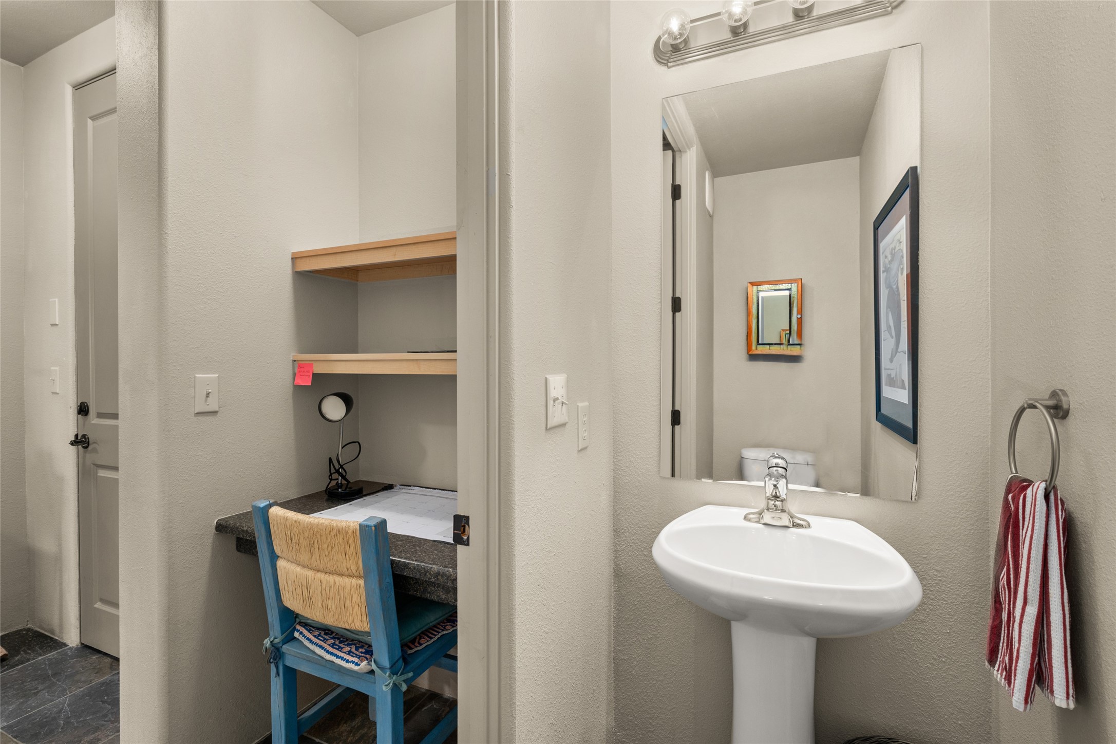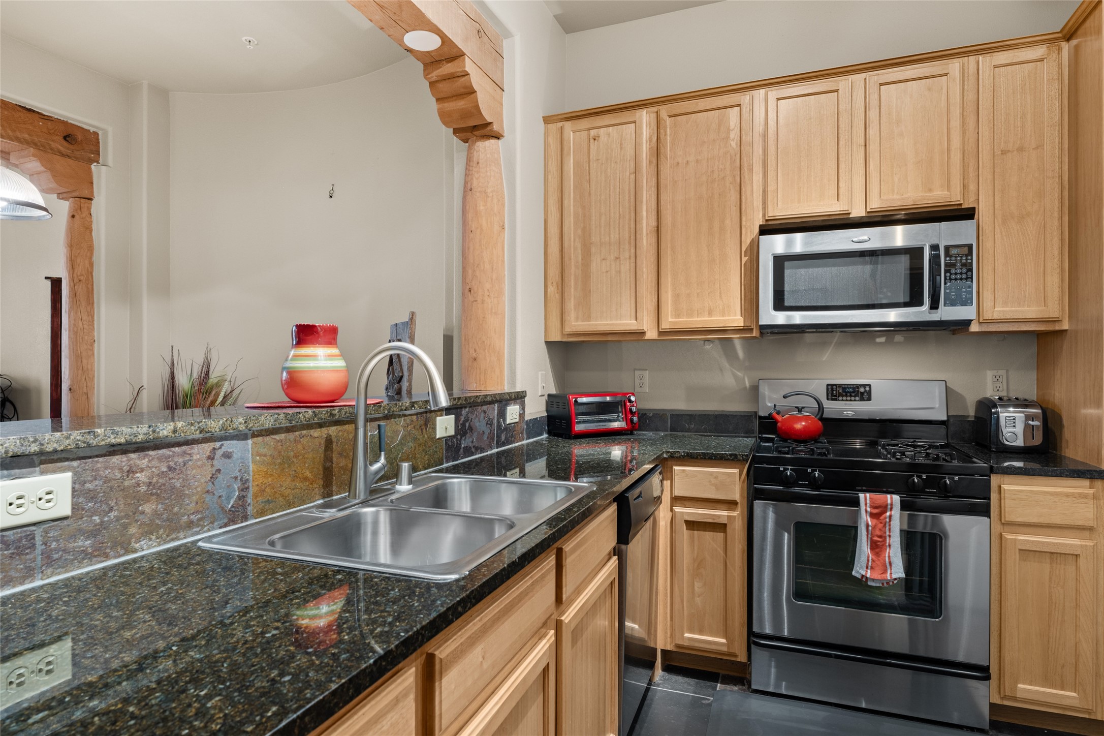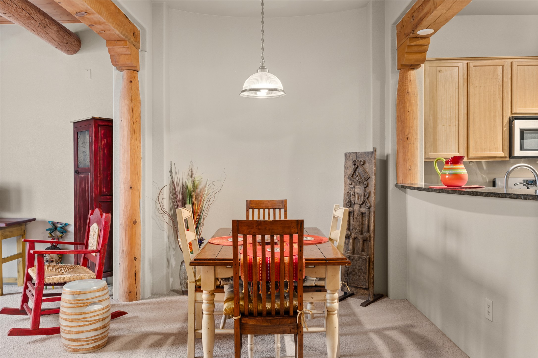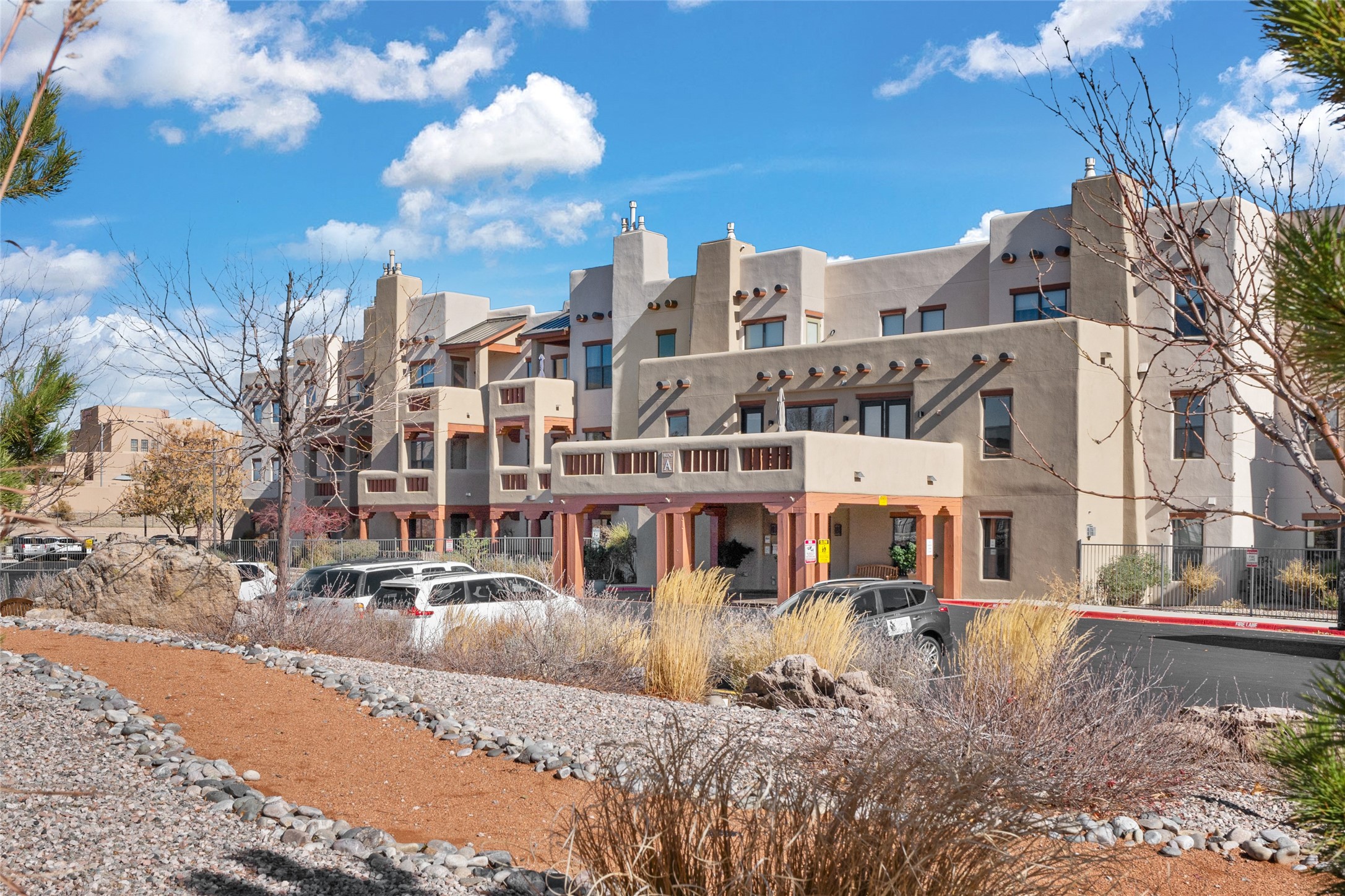 Sangre de Cristo mountain views and a good-sized, deeded storage closet add to the appeal of this fully-furnished, one bedroom, 1.5 bath condo with generous balcony. A sophisticated blend of traditional and contemporary style, this handsome residence has high ceilings, lovely wood vigas and corbels, granite counters and slate tile flooring in the kitchen and baths, plus an iconic corner kiva fireplace. The well-designed Alameda complex, with its beautiful outdoor pool, fitness center, handsome library, gated parking and onsite management, offers a level of quality and comfort uncommon at this price point. Located at the rear of the complex, for greater tranquility, this charming property is convenient to restaurants, shopping, and major thoroughfares.