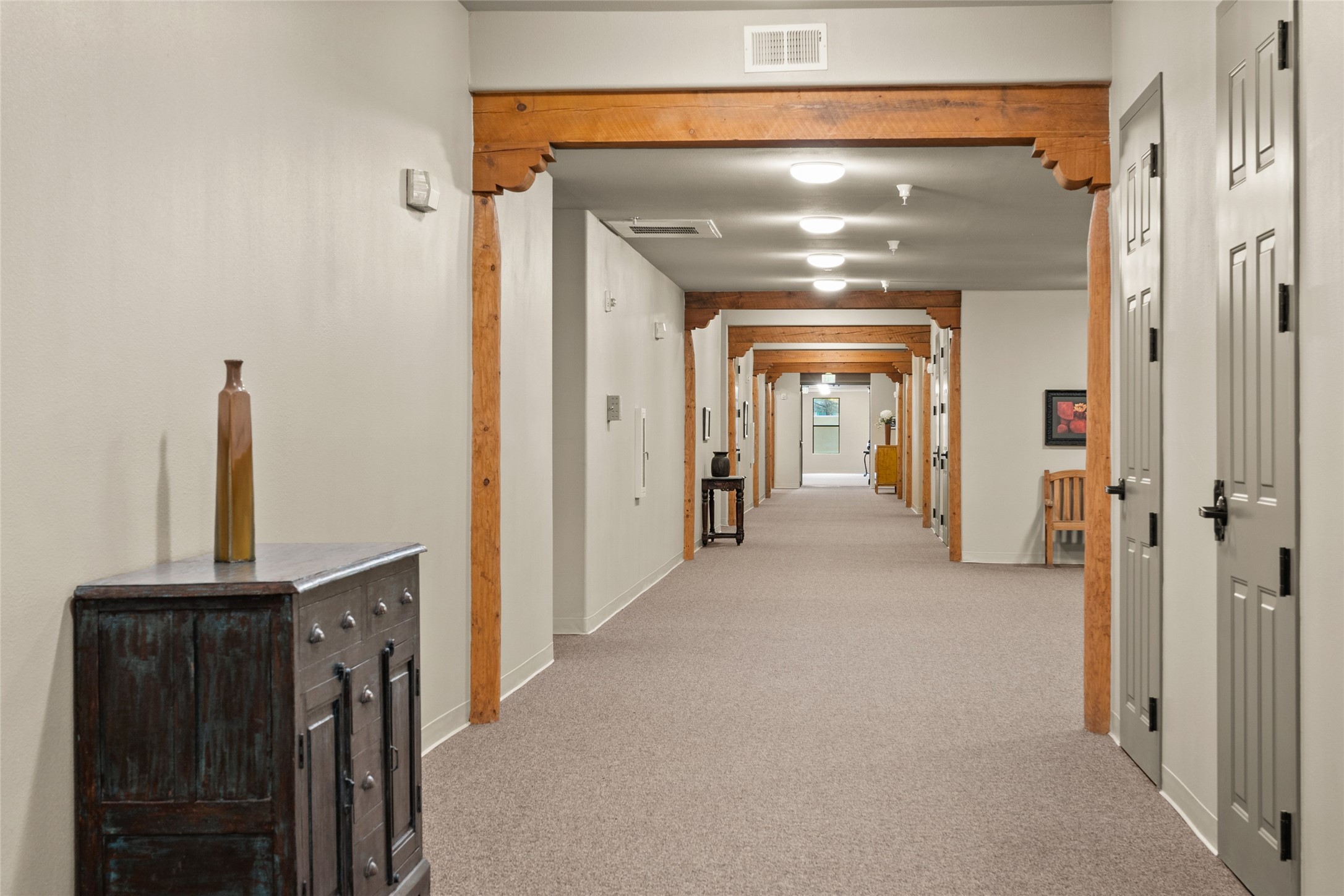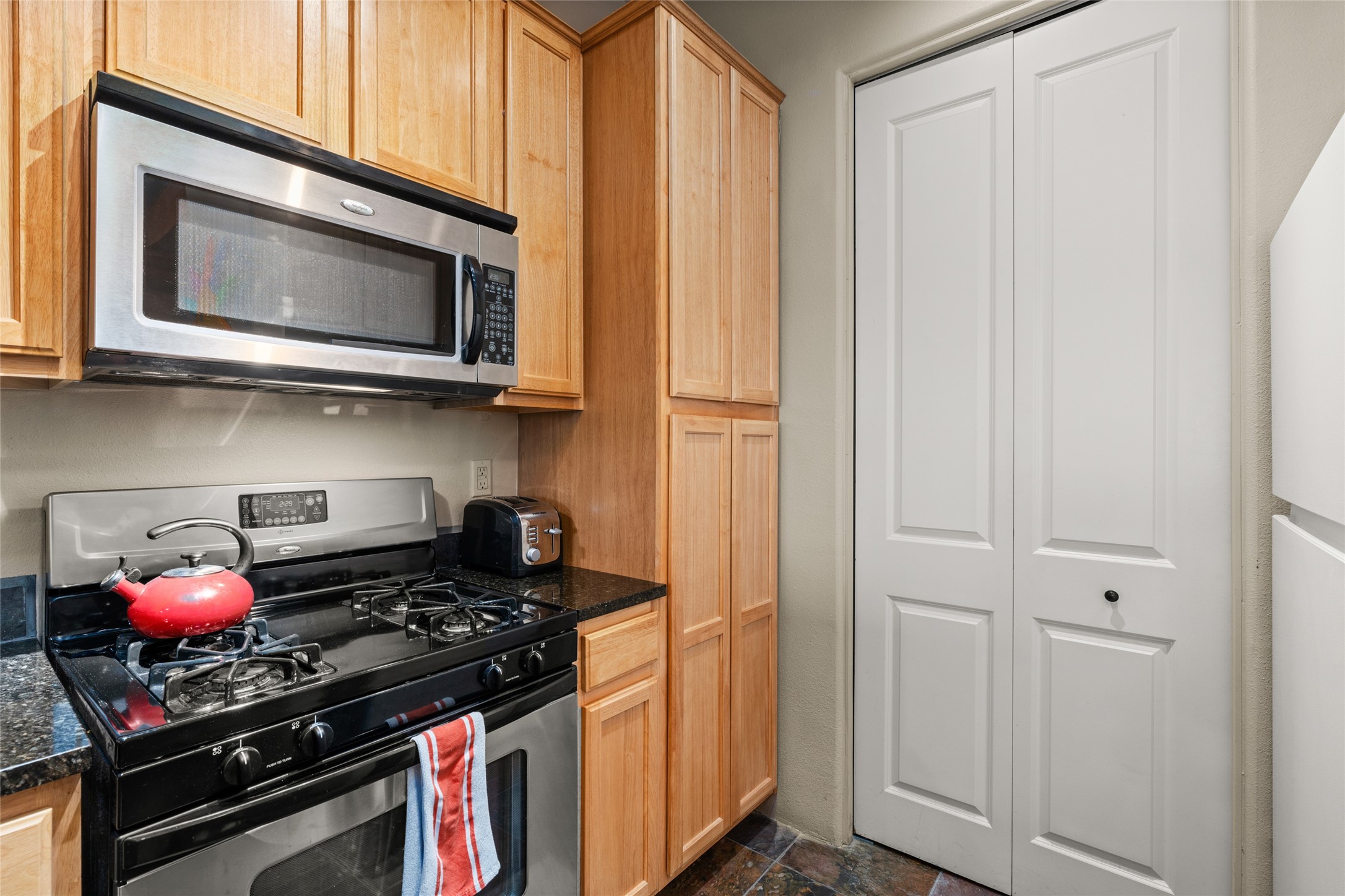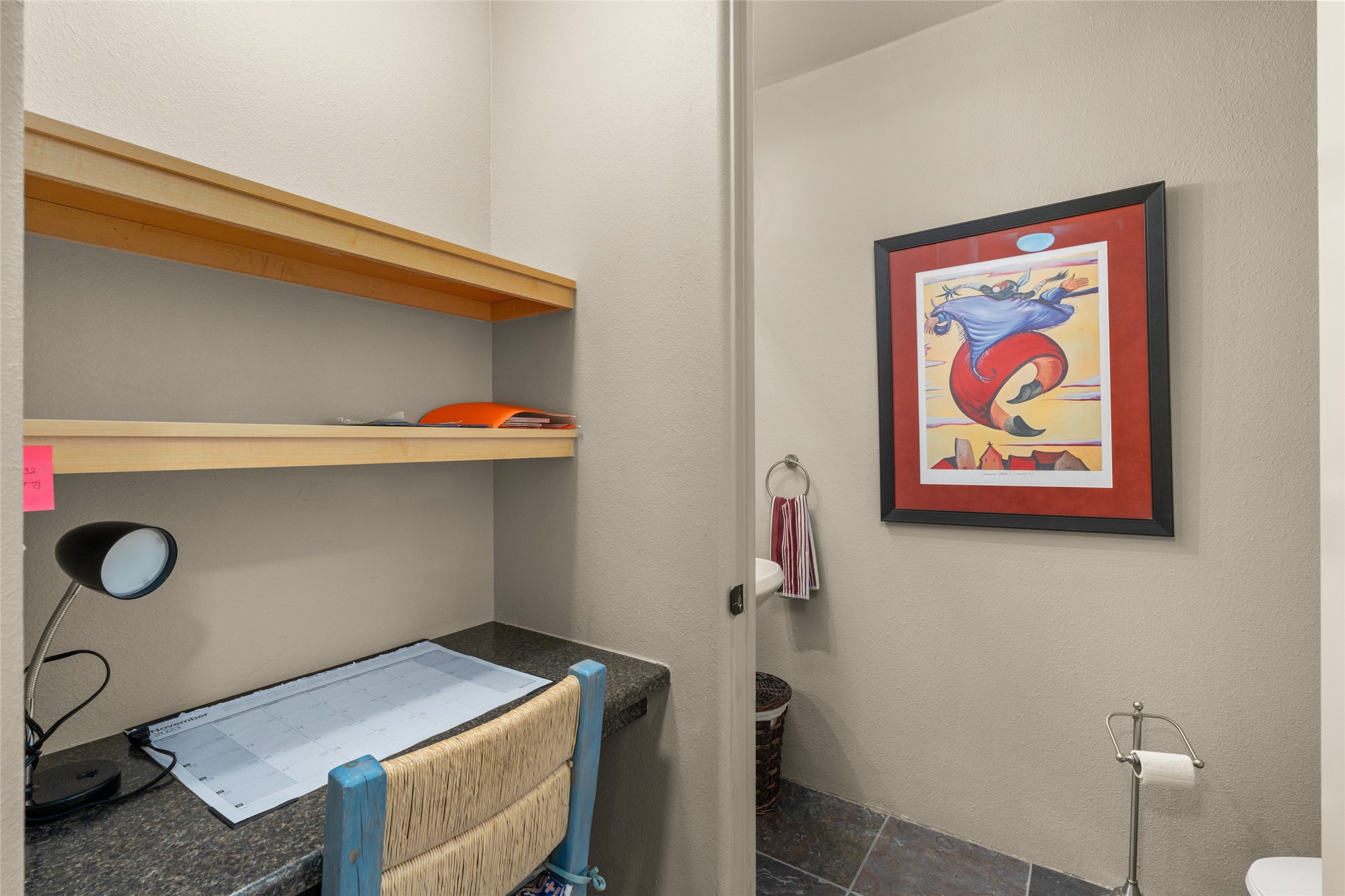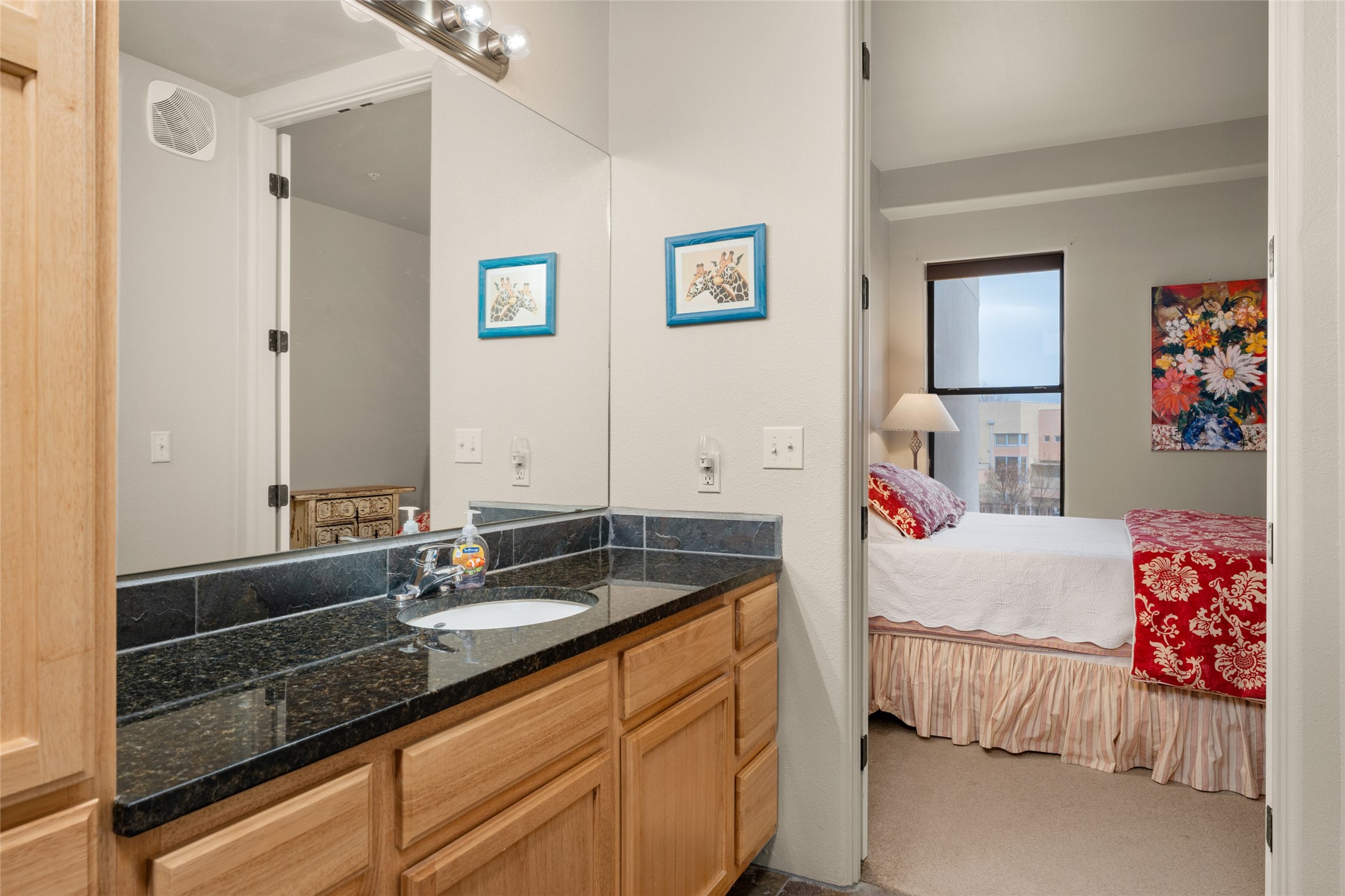 Sangre de Cristo mountain views and a good-sized, deeded storage closet add to the appeal of this fully-furnished, one bedroom, 1.5 bath condo with generous balcony. A sophisticated blend of traditional and contemporary style, this handsome residence has high ceilings, lovely wood vigas and corbels, granite counters and slate tile flooring in the kitchen and baths, plus an iconic corner kiva fireplace. The well-designed Alameda complex, with its beautiful outdoor pool, fitness center, handsome library, gated parking and onsite management, offers a level of quality and comfort uncommon at this price point. Located at the rear of the complex, for greater tranquility, this charming property is convenient to restaurants, shopping, and major thoroughfares.