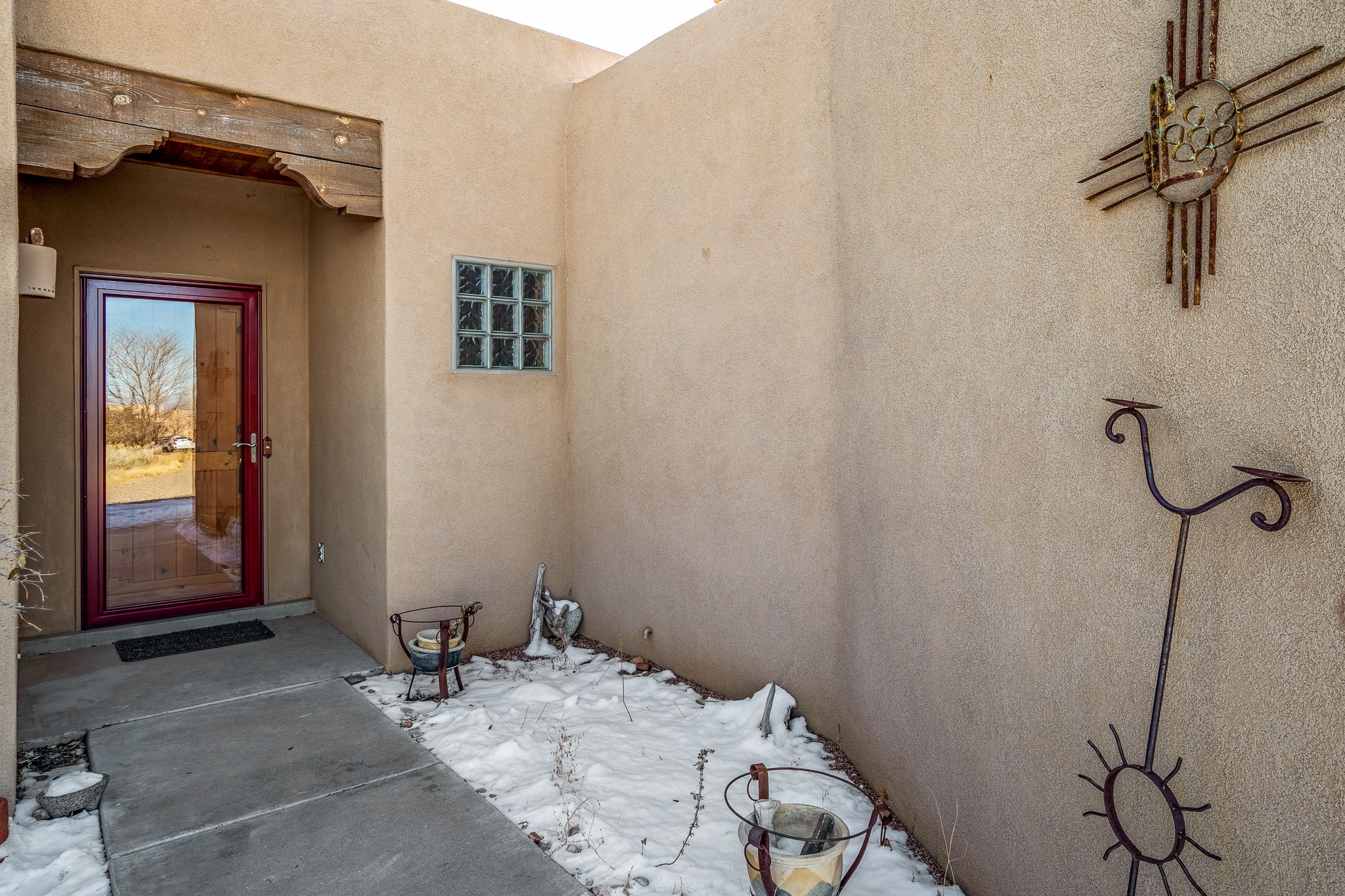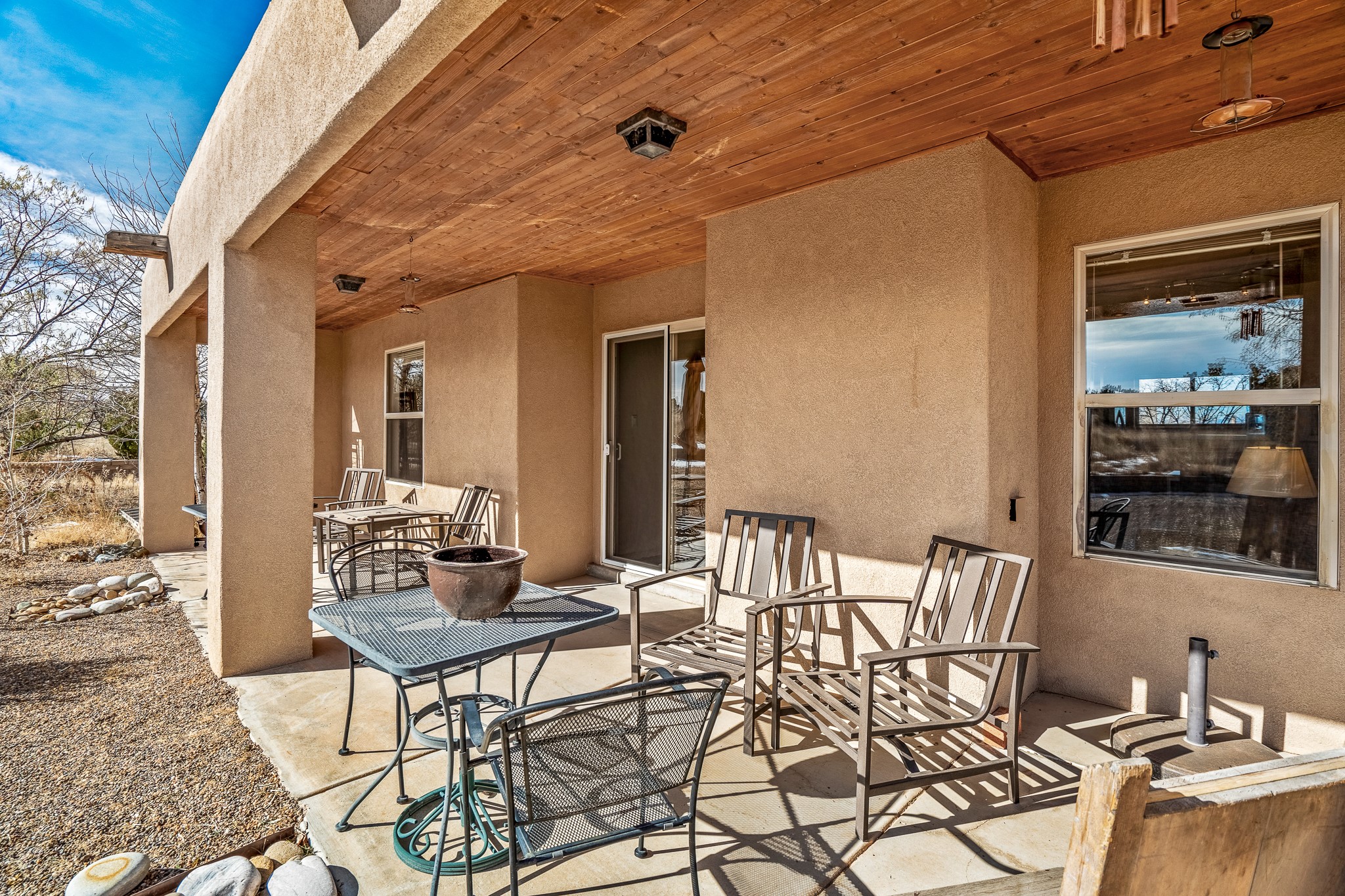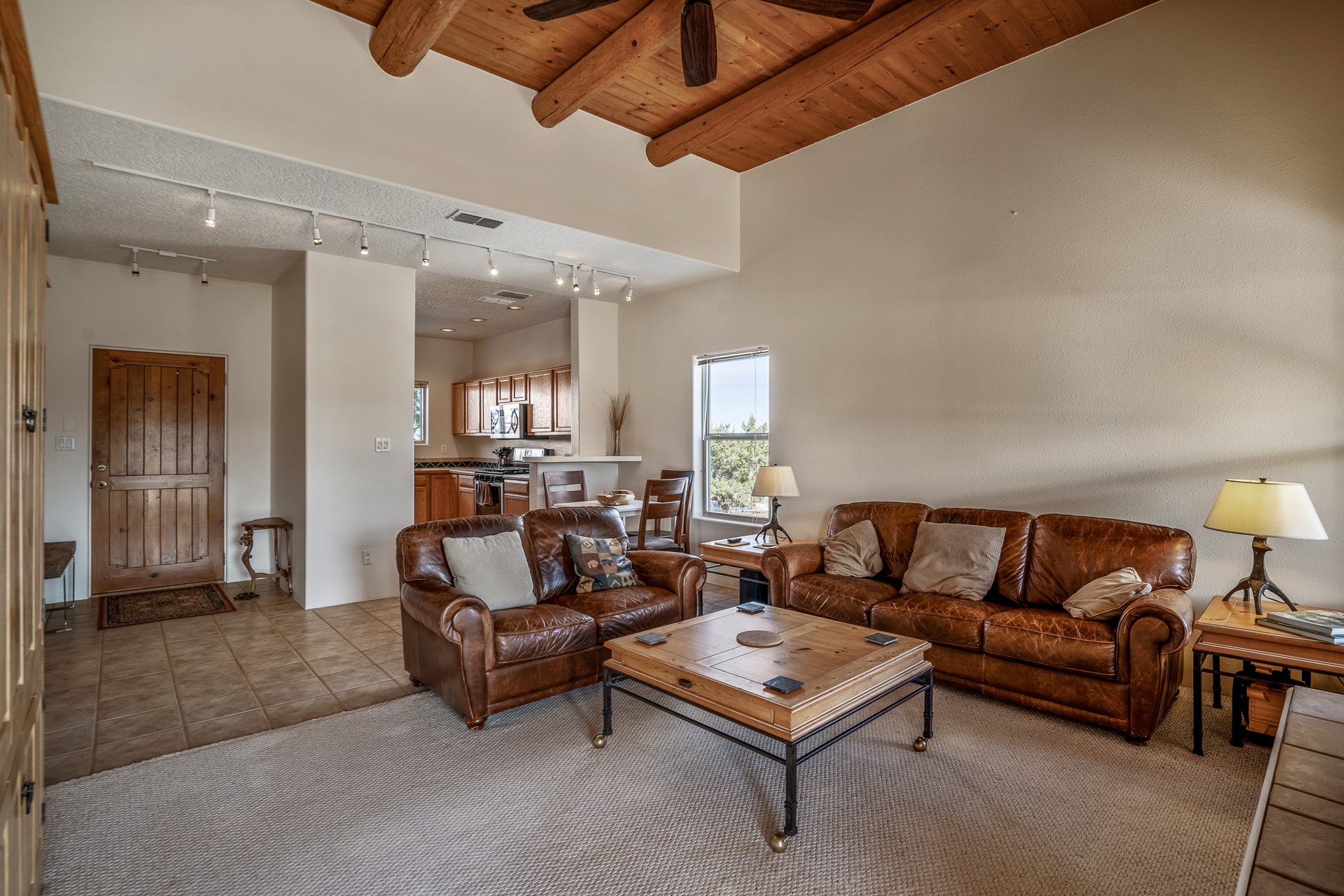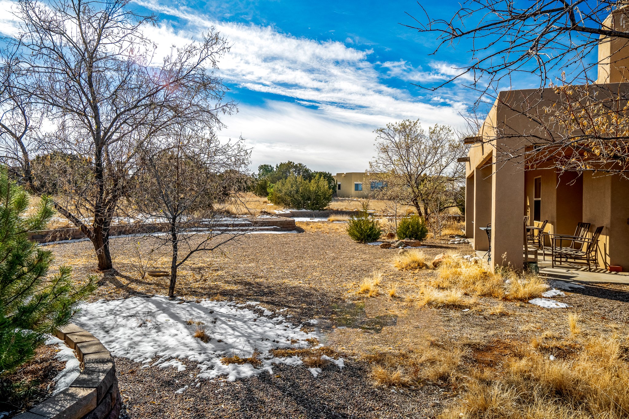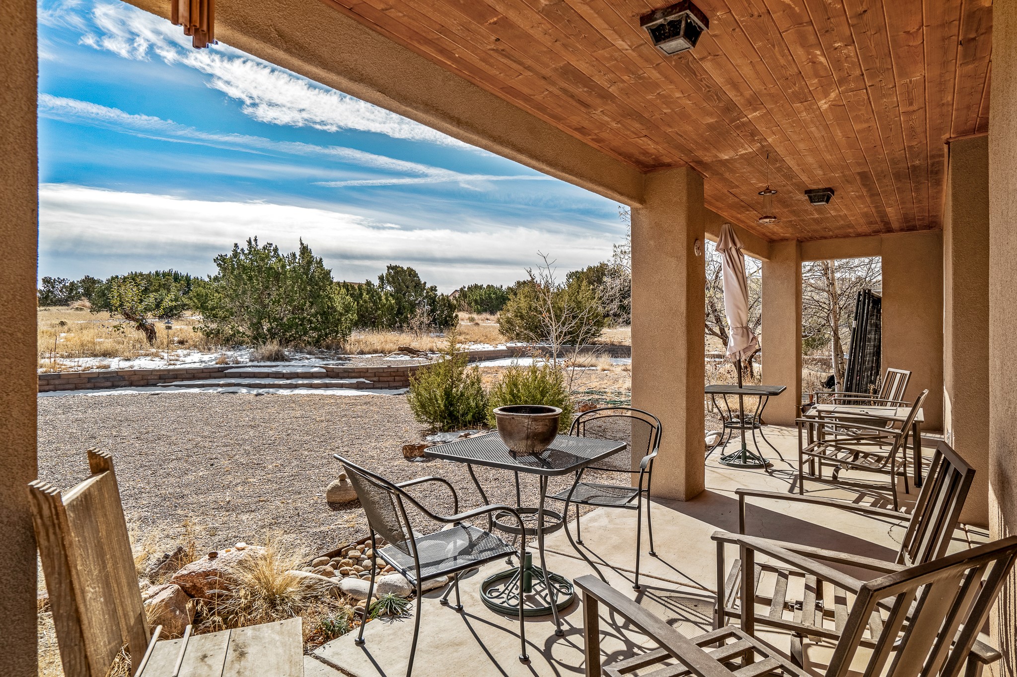 Lovely home on a view lot in desirable Eldorado. This 3 bedroom and 2 full bath home has been freshly painted and is ready for it's new owner. Features include: vigas in the living room, wood burning fire place with gas starter, open floor plan, stainless steel kitchen appliances, good sized pantry, nice separation of the bedrooms from the main living space, lots of natural light, wonderful back portal, designated laundry room, refrigerated whole house air-conditioning, HOA approved trailer or RV screen in place and a fantastic oversized two car garage. The Eldorado community offers many amenities which include tennis and pickle ball courts, hiking trails, a seasonal outdoor community pool and much more. Additionally Eldorado is home to a full purpose grocery store, hardware store, dining options, public library and a wonderful senior center.