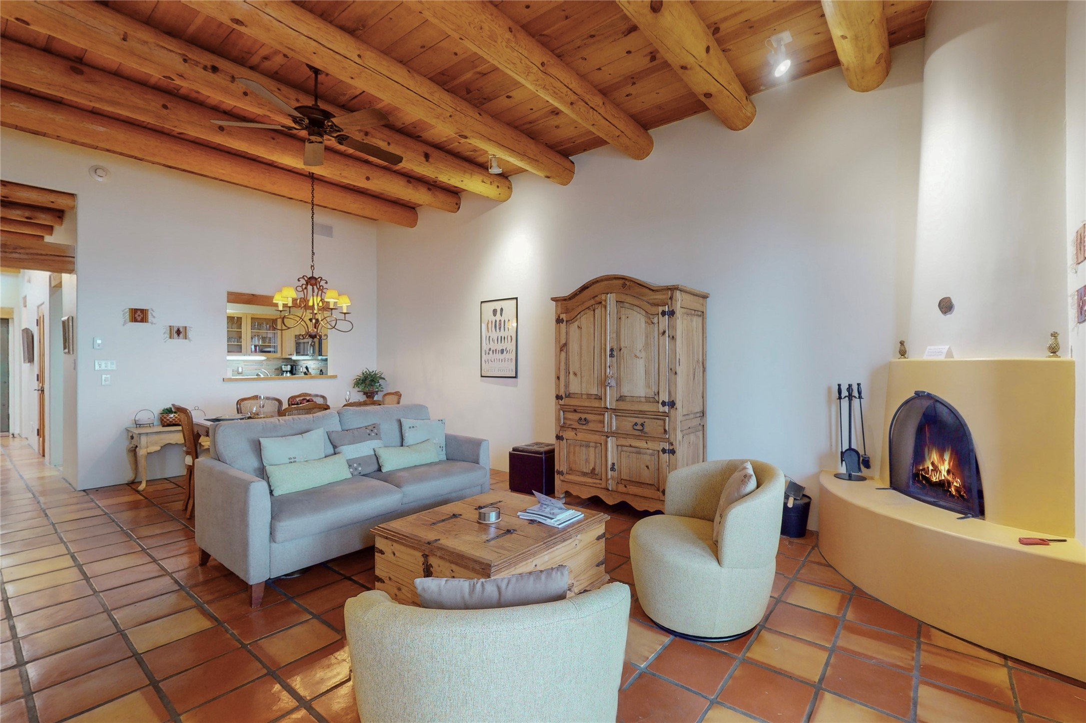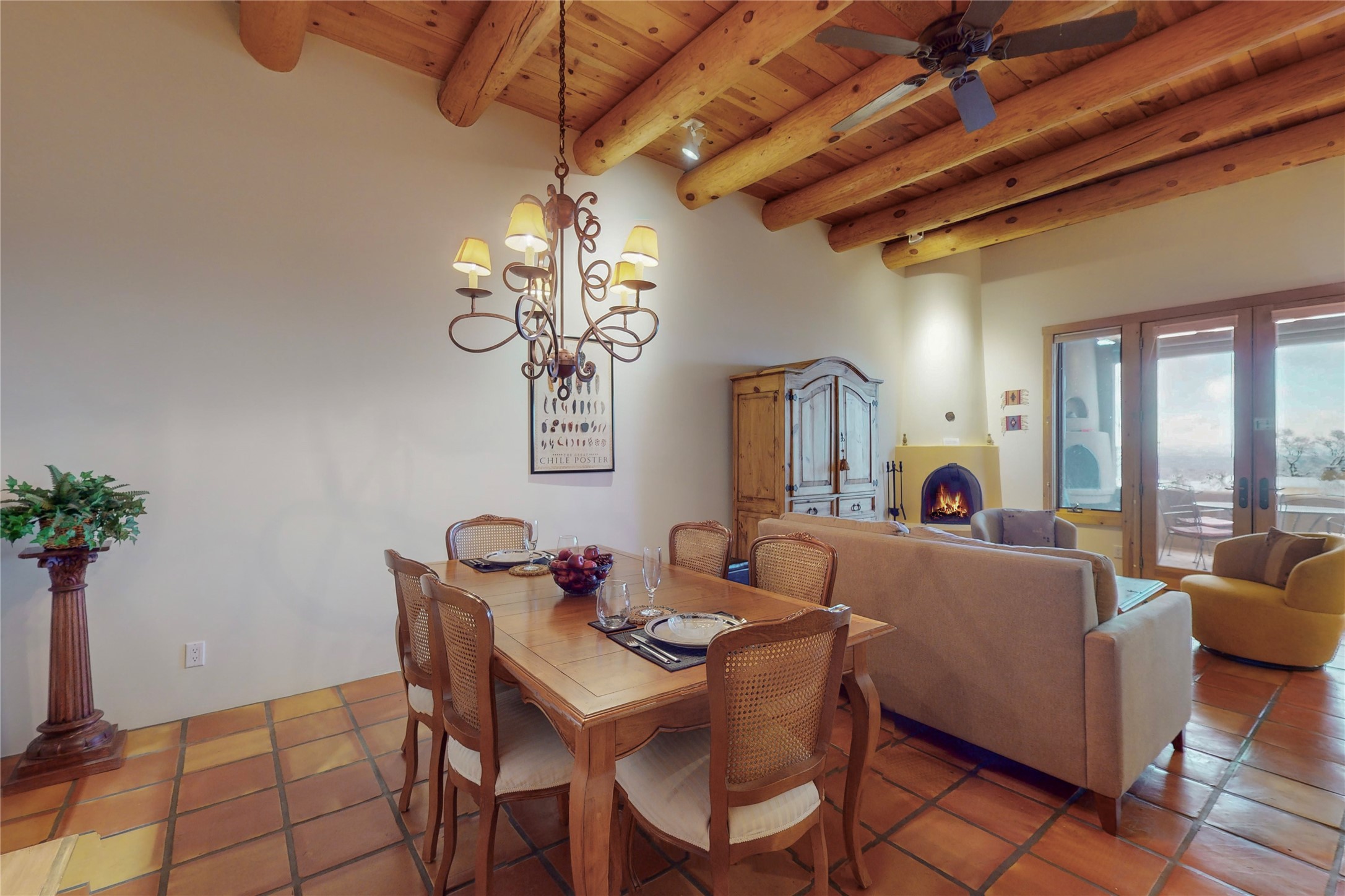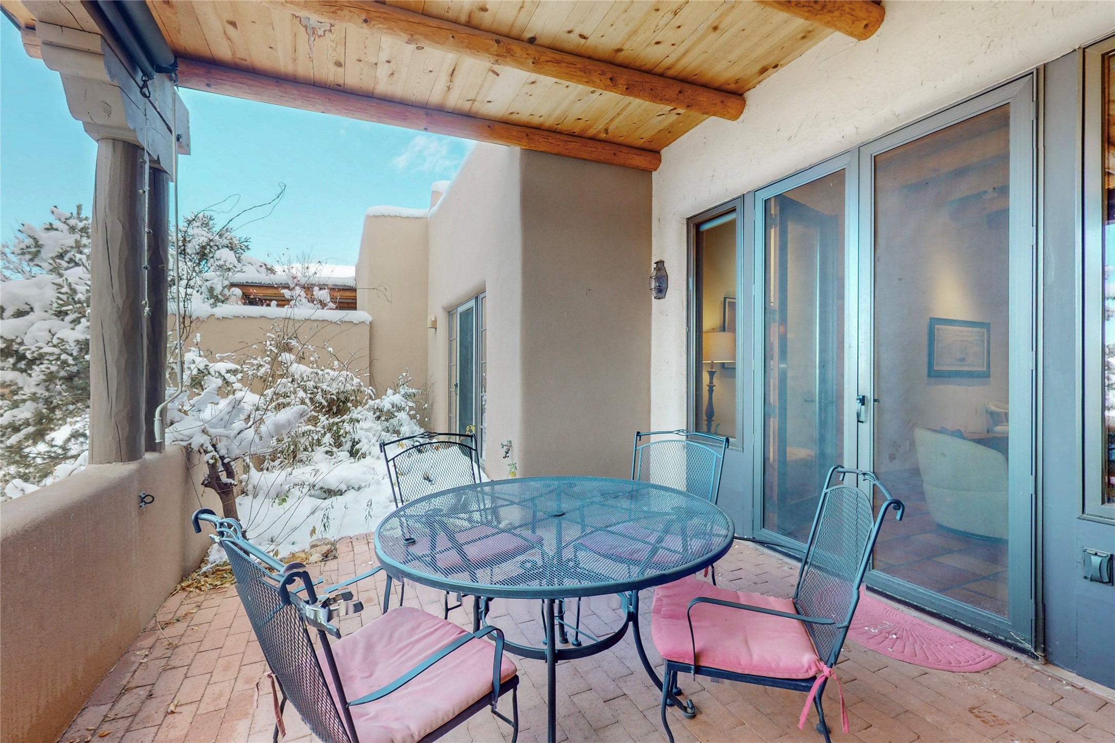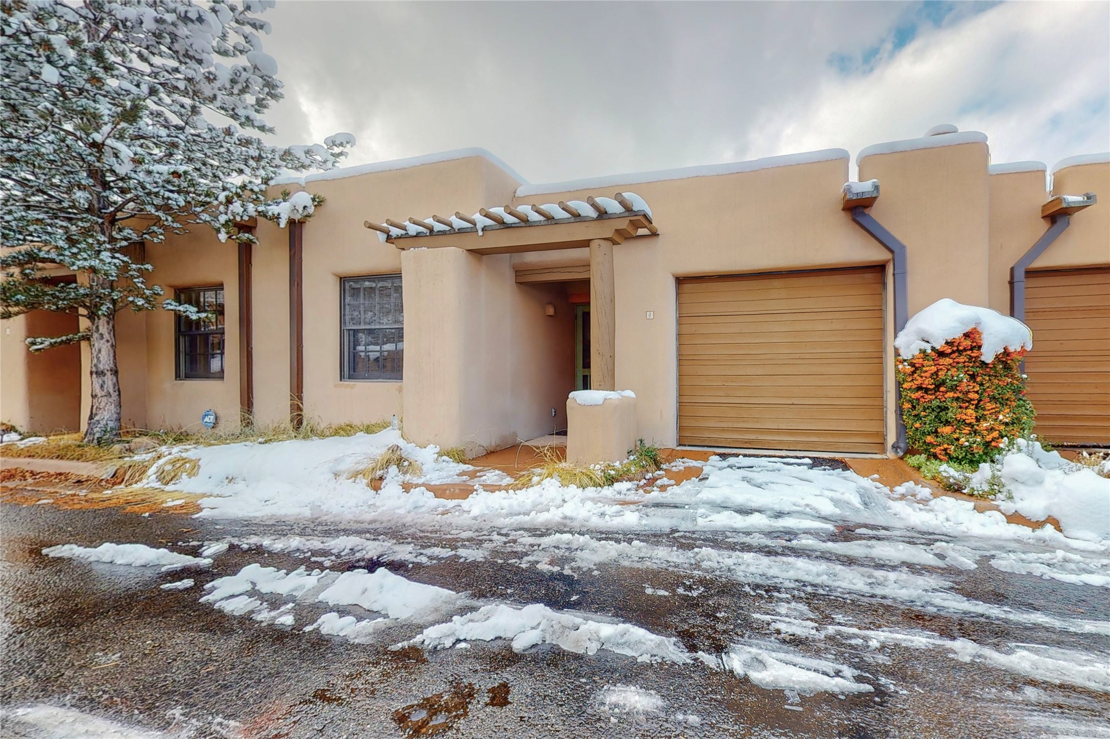A very rare and exquisite Philip Combs design in the highly desirable Portales Vistas condominium compound. ONE LEVEL condominium floorplan that is just a few minutes to the Plaza and Canyon Road amenities. Easy drive to ski areas, opera and dining attractions. Dazzling sunset views of the Jemez Mountain Range by day and sparkling Santa Fe and Los Alamos city lights by night are absolutely incredible. 2 bedrooms, 2 baths plus a separate office with built-in desk and cabinets. 2 cozy charming Kiva fireplaces, beautiful Saltillo tile floors, high ceilings, gorgeous kitchen with granite counters and stainless appliances! The attached direct entry garage is a wonderful convenience-just drive in and park out of the weather. One additional outside parking space at the unit. Very well-maintained roof, stucco, and driveways. This condo is excellent for full or part time living. Short term rental history and professionally managed for current owner. Meticulously maintained. Seller offers all furnishing and provisions for separate purchase! This is as effortlessly turn-key as you could wish. Come see and you will want to move in!
