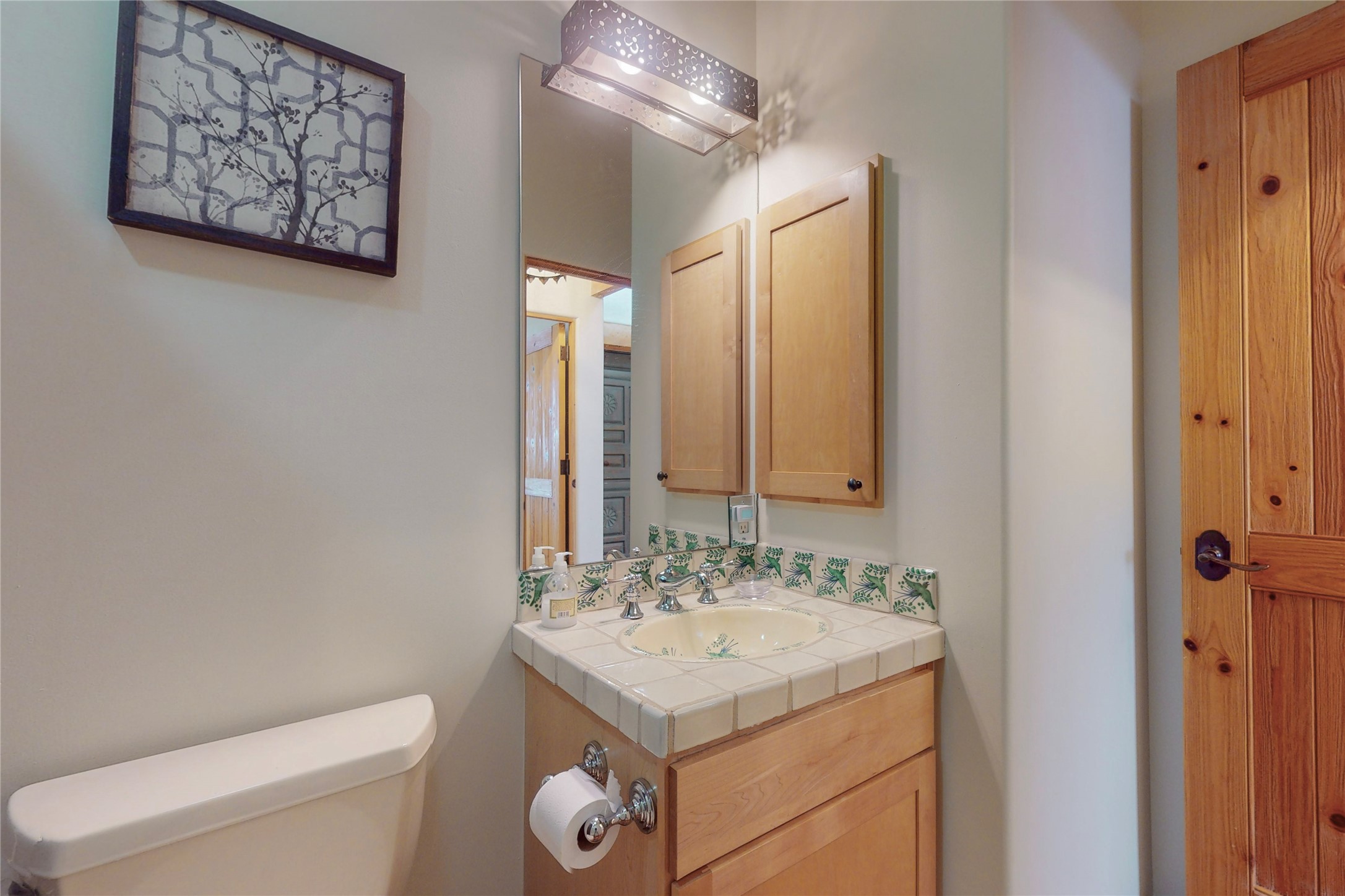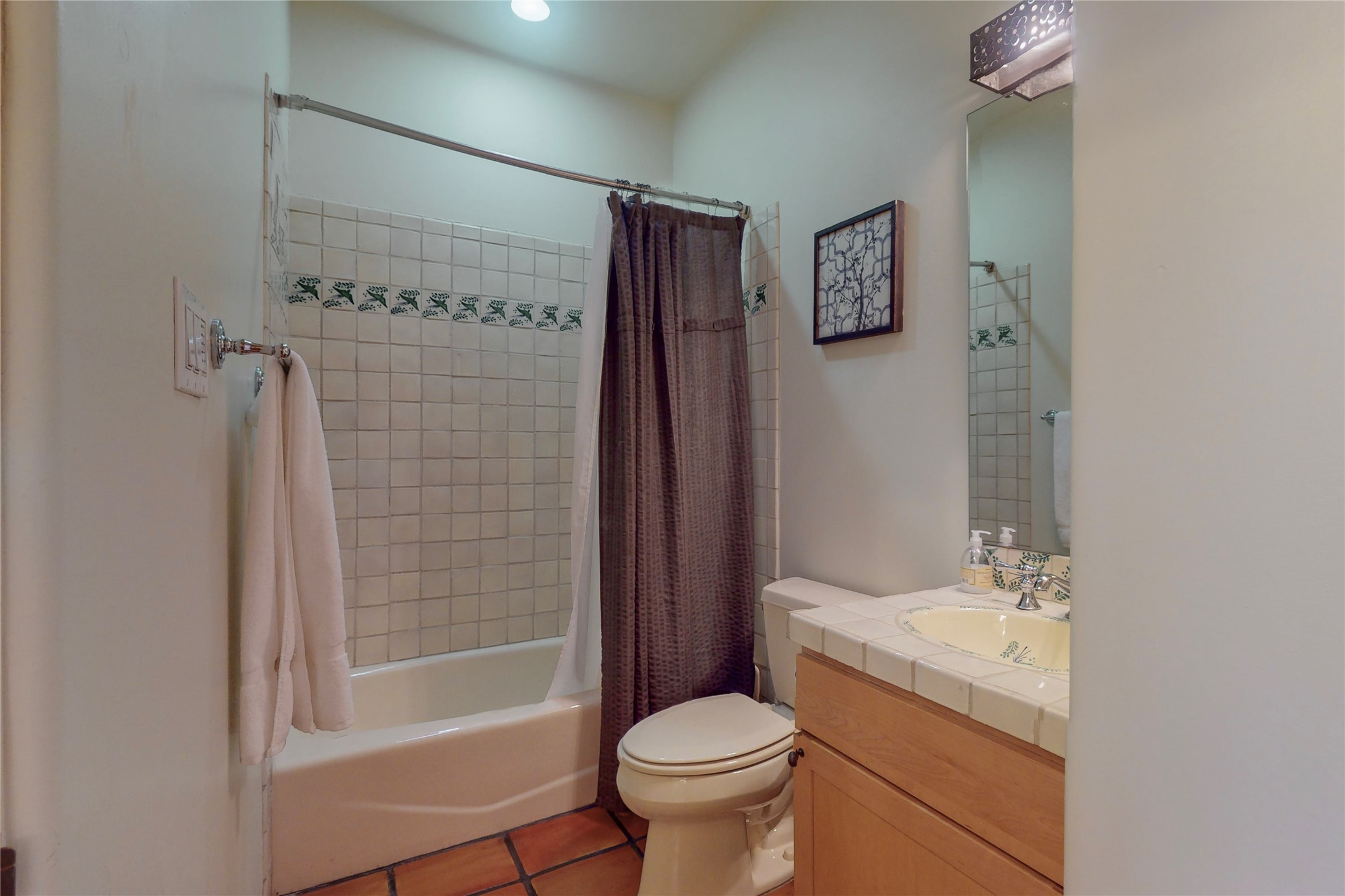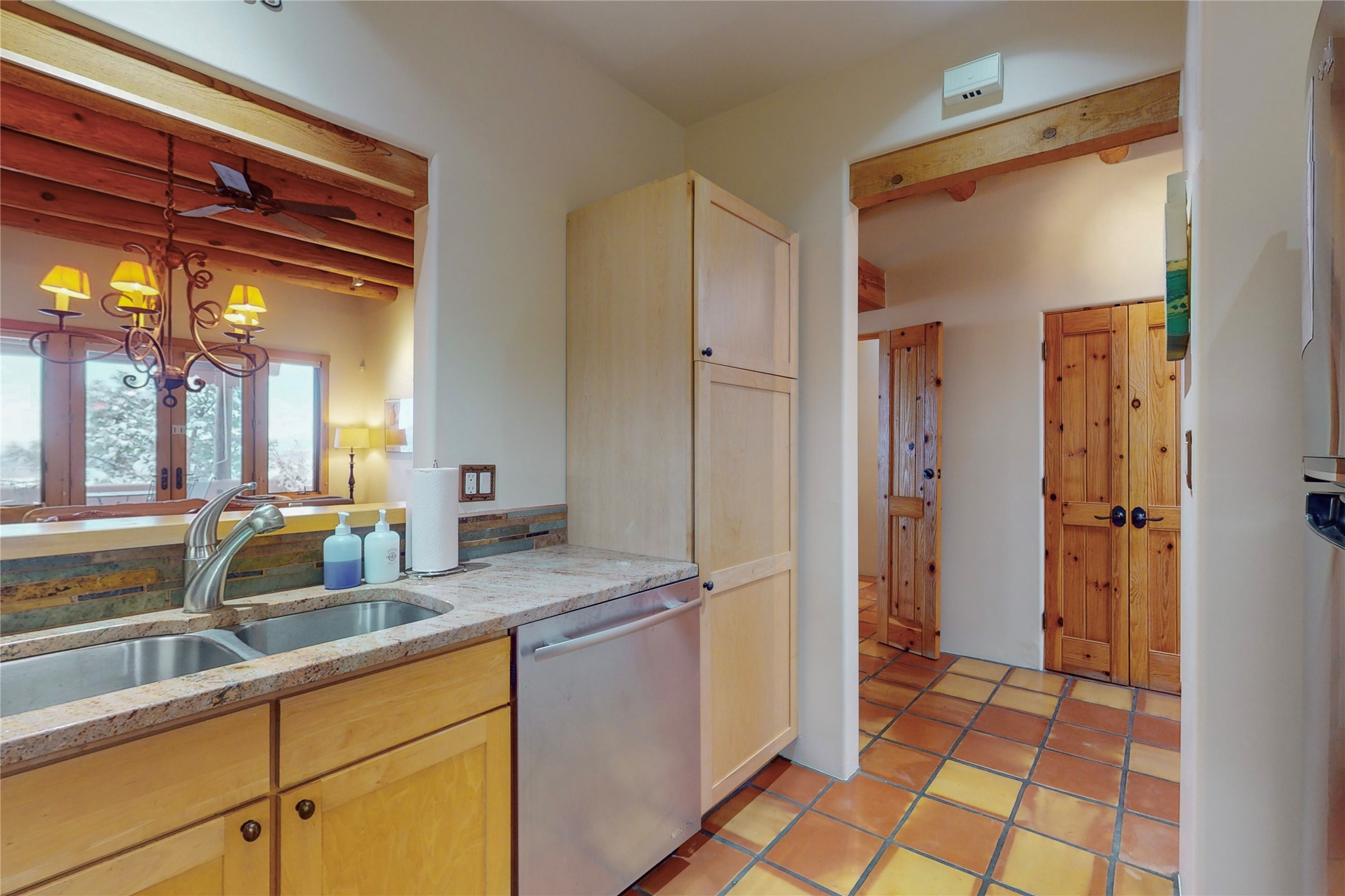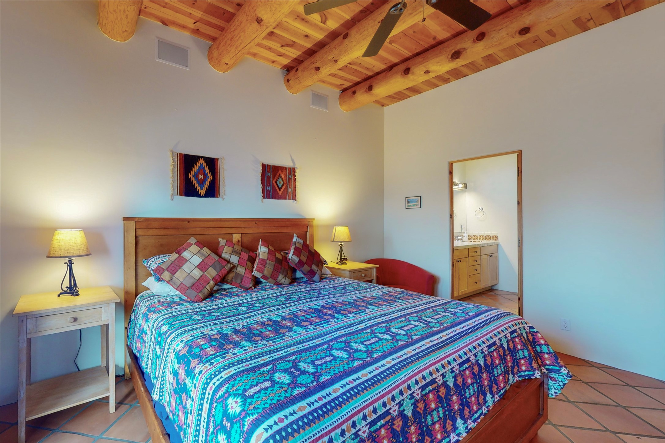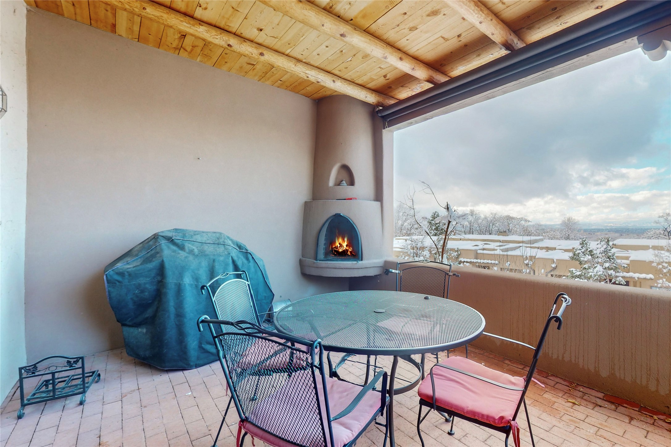A very rare and exquisite Philip Combs design in the highly desirable Portales Vistas condominium compound. ONE LEVEL condominium floorplan that is just a few minutes to the Plaza and Canyon Road amenities. Easy drive to ski areas, opera and dining attractions. Dazzling sunset views of the Jemez Mountain Range by day and sparkling Santa Fe and Los Alamos city lights by night are absolutely incredible. 2 bedrooms, 2 baths plus a separate office with built-in desk and cabinets. 2 cozy charming Kiva fireplaces, beautiful Saltillo tile floors, high ceilings, gorgeous kitchen with granite counters and stainless appliances! The attached direct entry garage is a wonderful convenience-just drive in and park out of the weather. One additional outside parking space at the unit. Very well-maintained roof, stucco, and driveways. This condo is excellent for full or part time living. Short term rental history and professionally managed for current owner. Meticulously maintained. Seller offers all furnishing and provisions for separate purchase! This is as effortlessly turn-key as you could wish. Come see and you will want to move in!