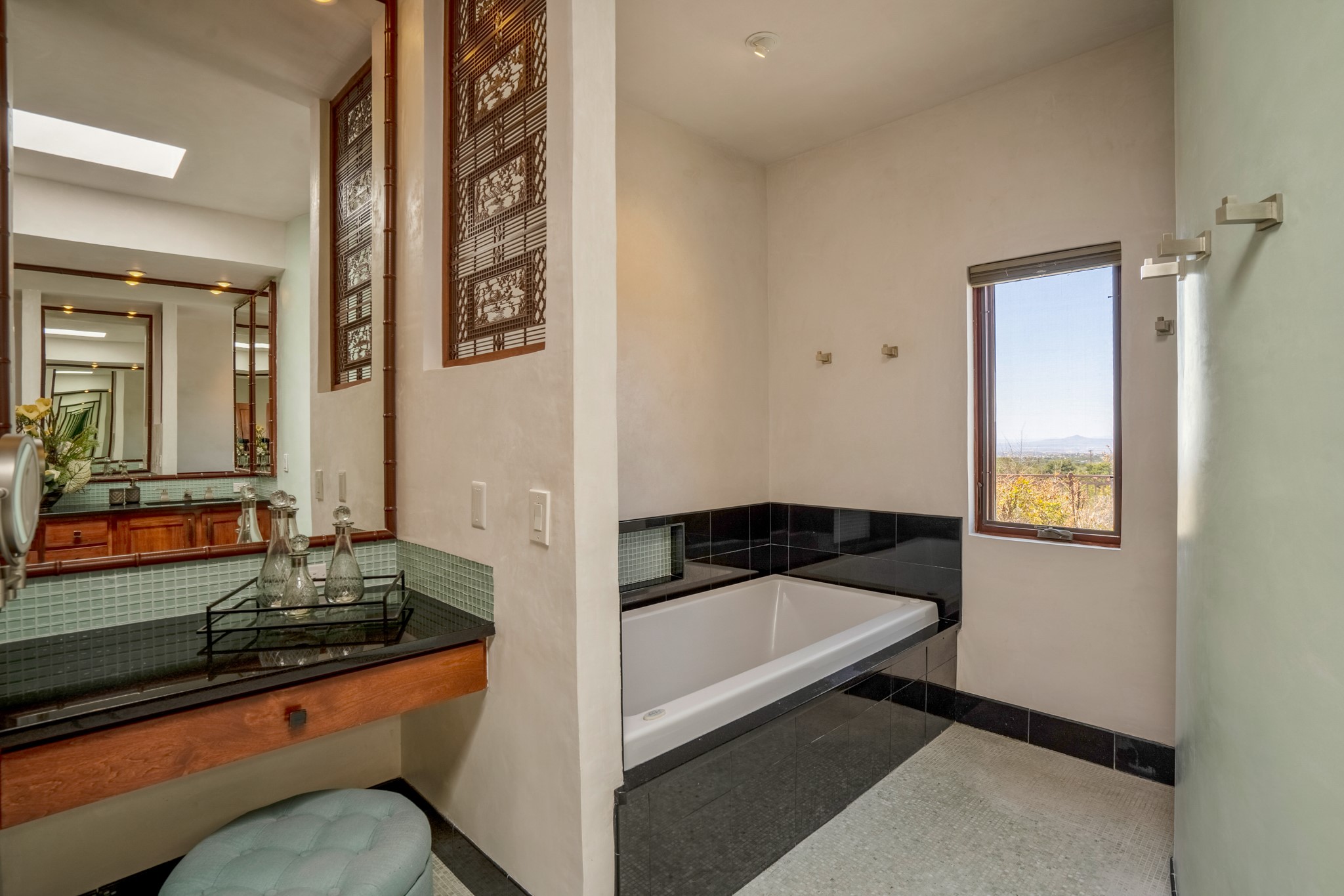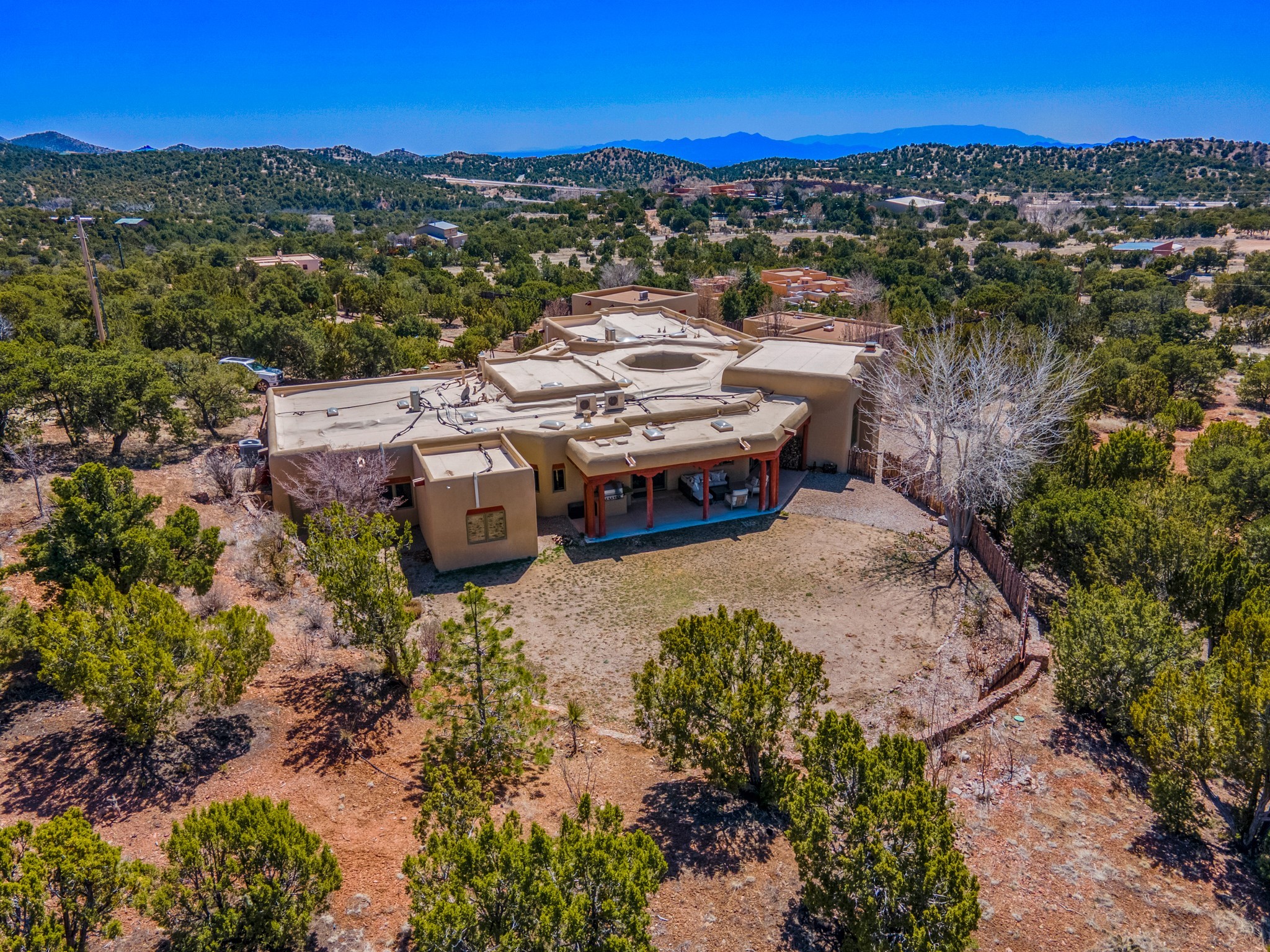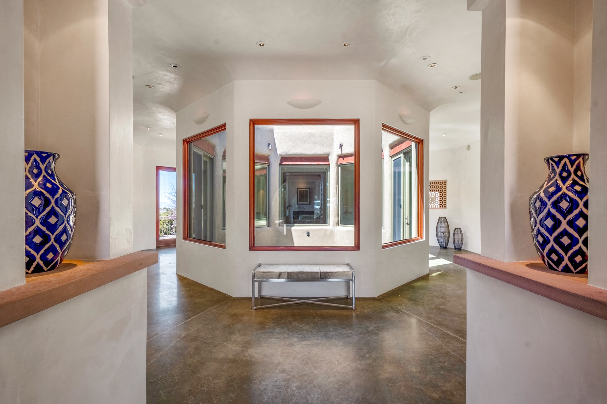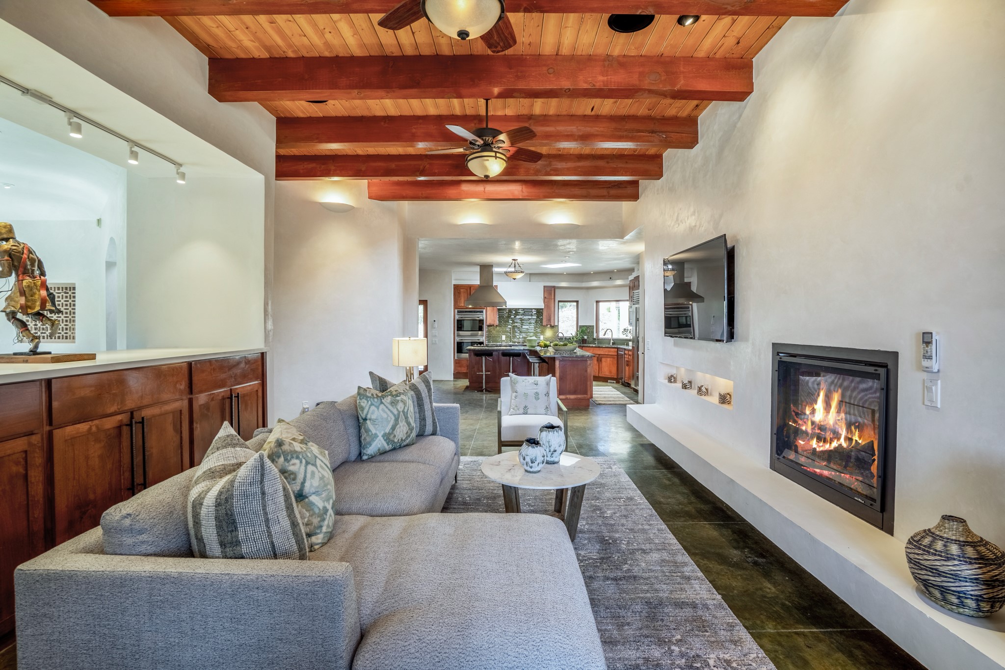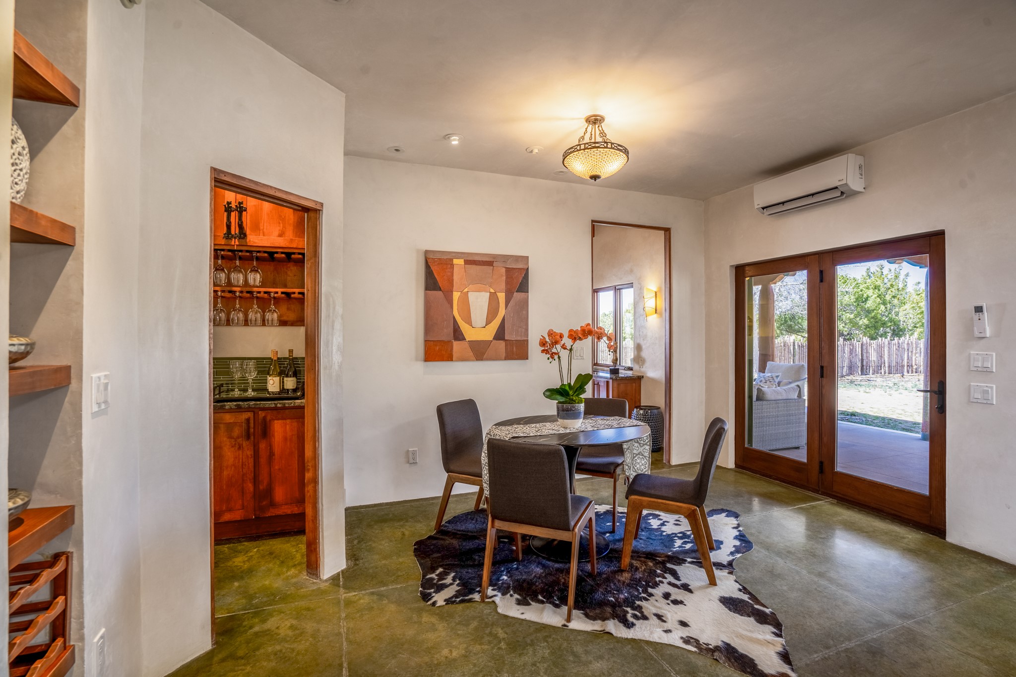 Introducing a truly unique property off Old Santa Fe Trail with distinct Asian design influences that boasts a dedicated 1,059 sf guest house, 576 sf separate studio plus an office and bonus room off the primary suite (think gym, study, nursery, or second office), 4-car garage and 2 living rooms! For those looking to work from home or pursue creative endeavors, the private detached studio provides the perfect space to do so. This sprawling home is situated on a generous lot with breathtaking Jemez sunset views. The chef's kitchen features top-of-the-line appliances, wet bar and ample counter space, making it the perfect space for preparing gourmet meals and entertaining guests. Minutes to the Plaza!