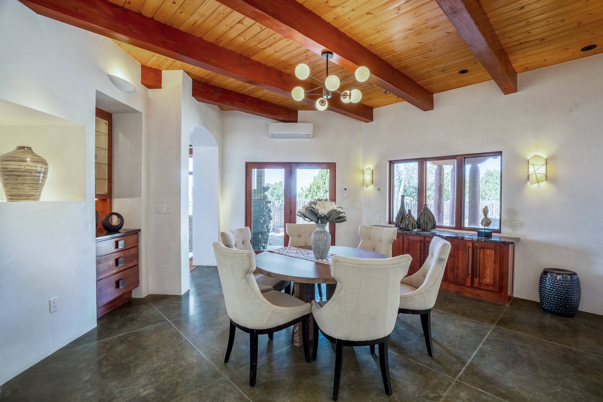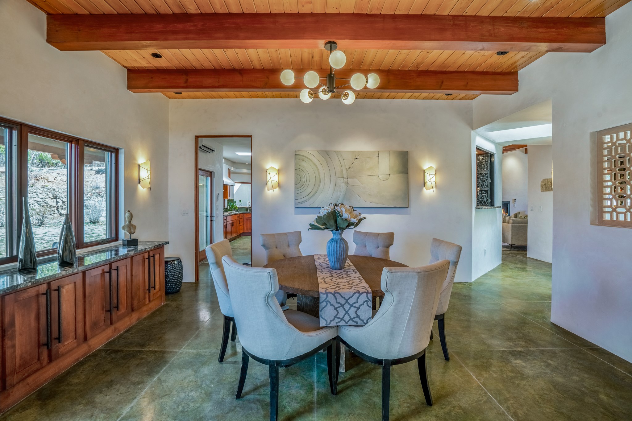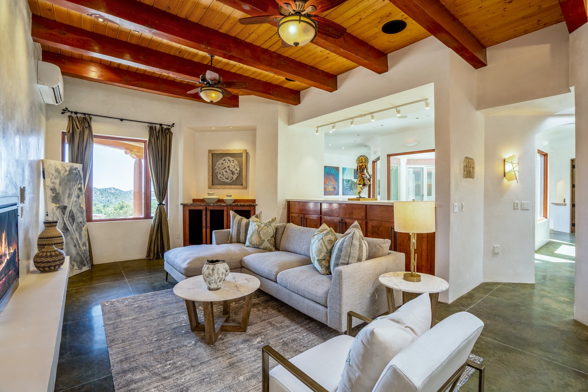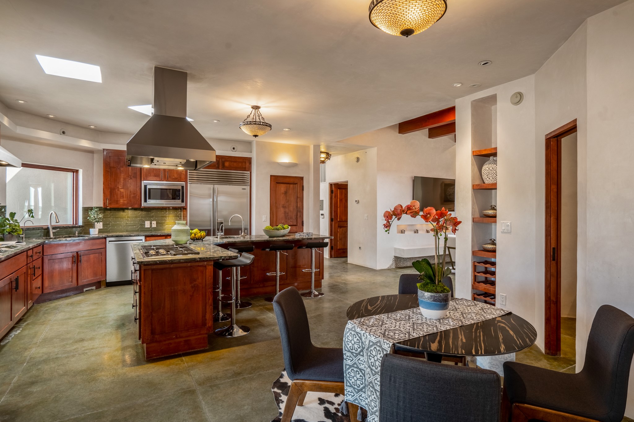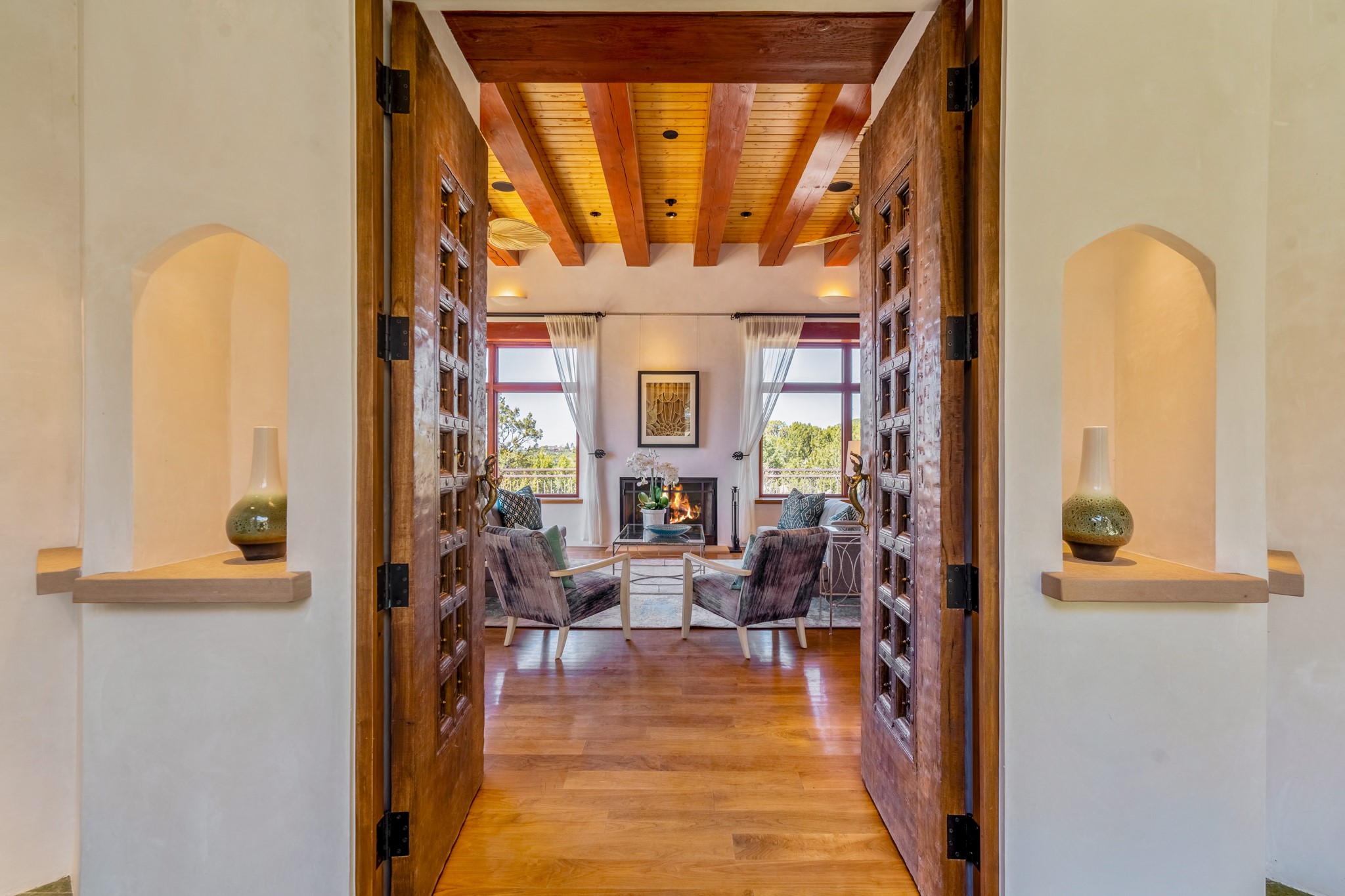 Introducing a truly unique property off Old Santa Fe Trail with distinct Asian design influences that boasts a dedicated 1,059 sf guest house, 576 sf separate studio plus an office and bonus room off the primary suite (think gym, study, nursery, or second office), 4-car garage and 2 living rooms! For those looking to work from home or pursue creative endeavors, the private detached studio provides the perfect space to do so. This sprawling home is situated on a generous lot with breathtaking Jemez sunset views. The chef's kitchen features top-of-the-line appliances, wet bar and ample counter space, making it the perfect space for preparing gourmet meals and entertaining guests. Minutes to the Plaza!