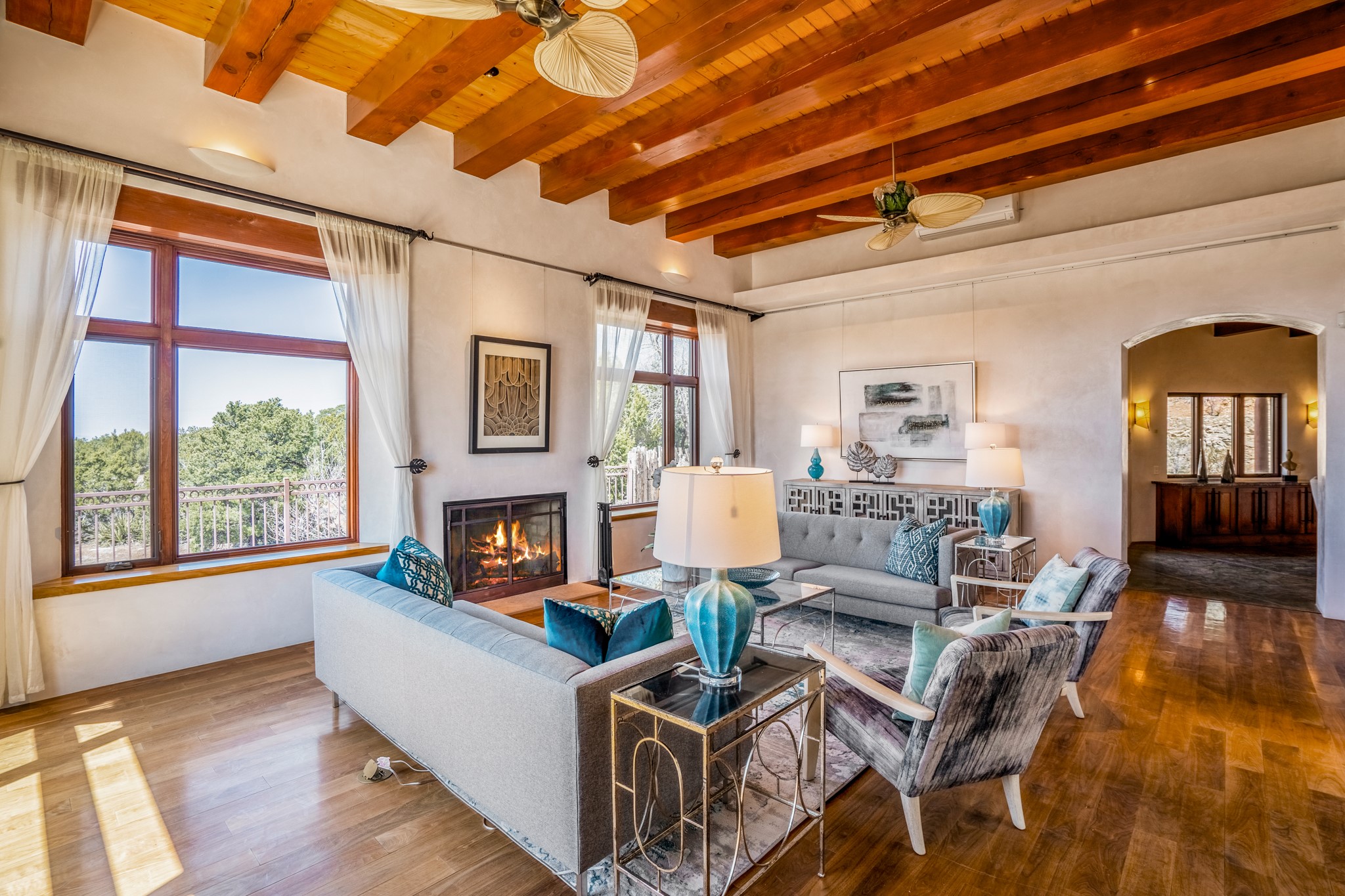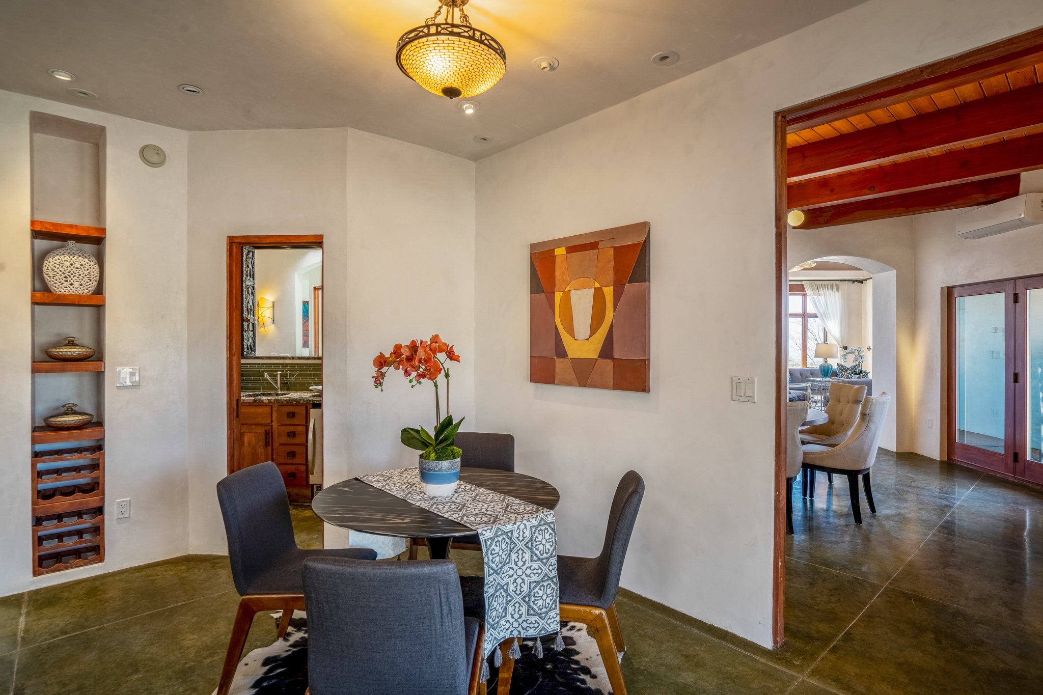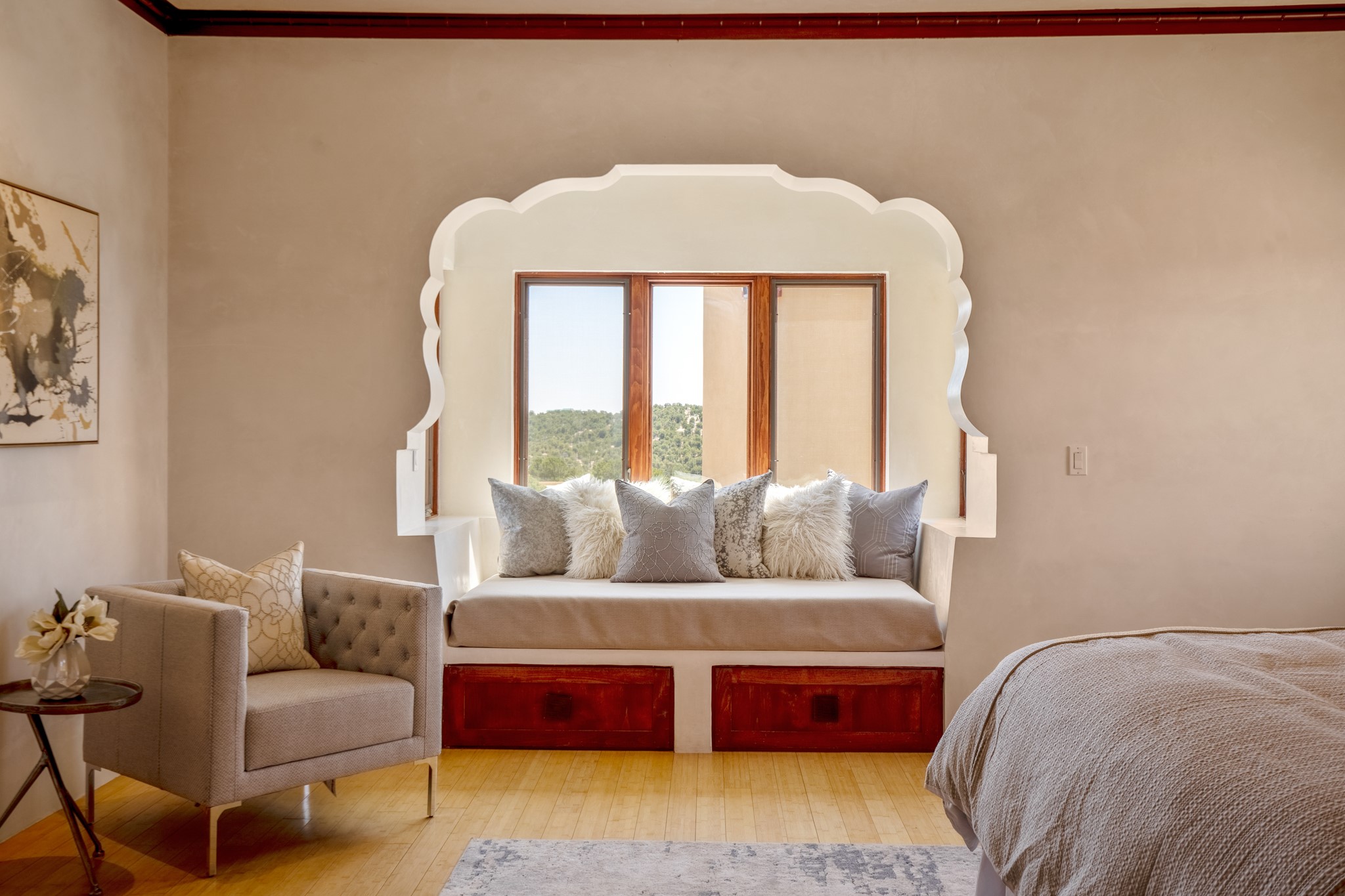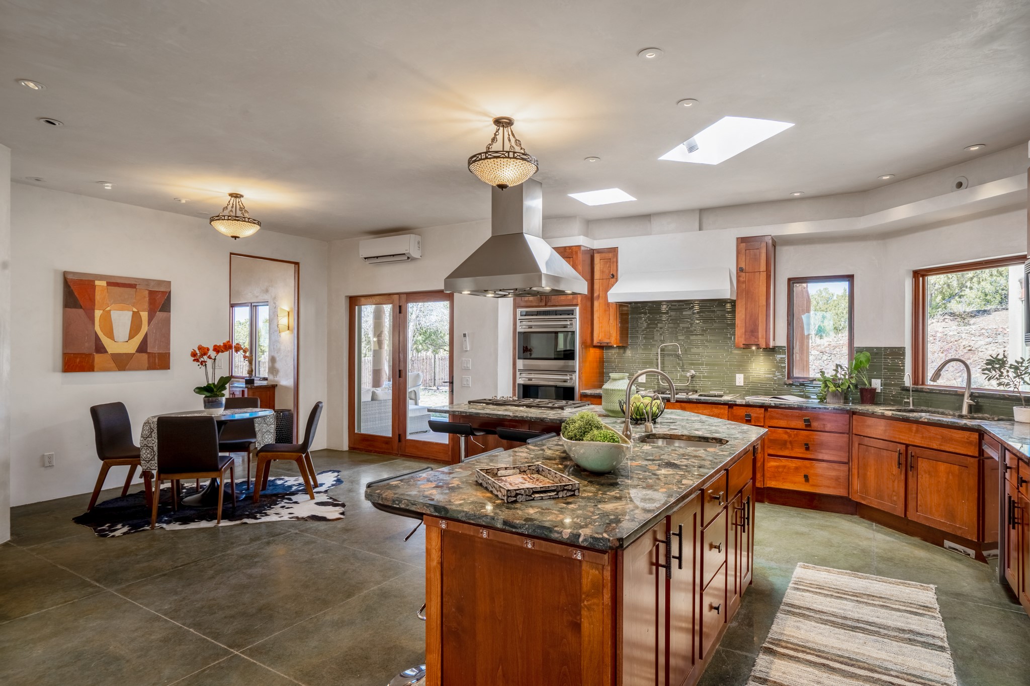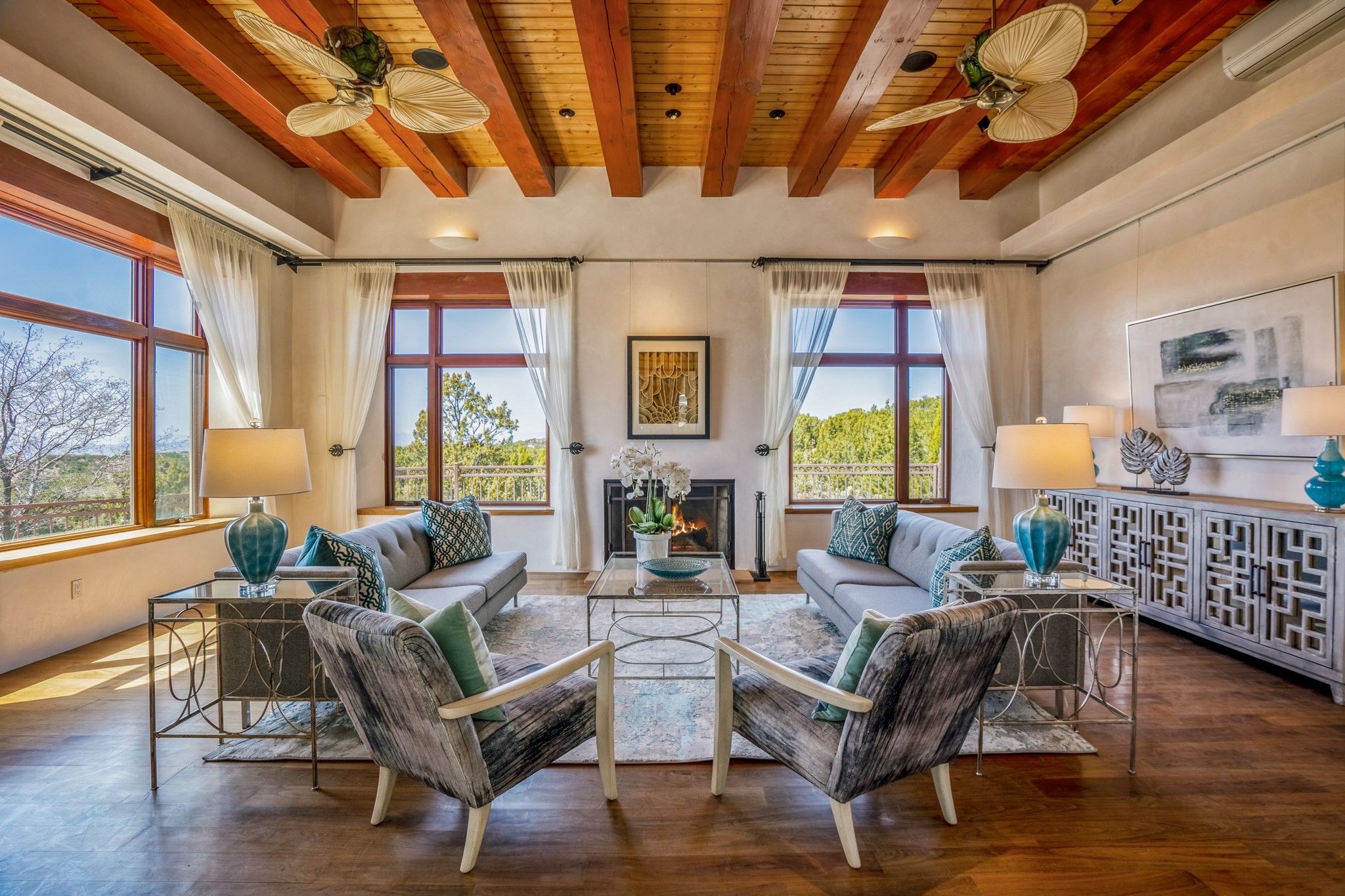Introducing a truly unique property off Old Santa Fe Trail with distinct Asian design influences that boasts a dedicated 1,059 sf guest house, 576 sf separate studio plus an office and bonus room off the primary suite (think gym, study, nursery, or second office), 4-car garage and 2 living rooms! For those looking to work from home or pursue creative endeavors, the private detached studio provides the perfect space to do so. This sprawling home is situated on a generous lot with breathtaking Jemez sunset views. The chef's kitchen features top-of-the-line appliances, wet bar and ample counter space, making it the perfect space for preparing gourmet meals and entertaining guests. Minutes to the Plaza!