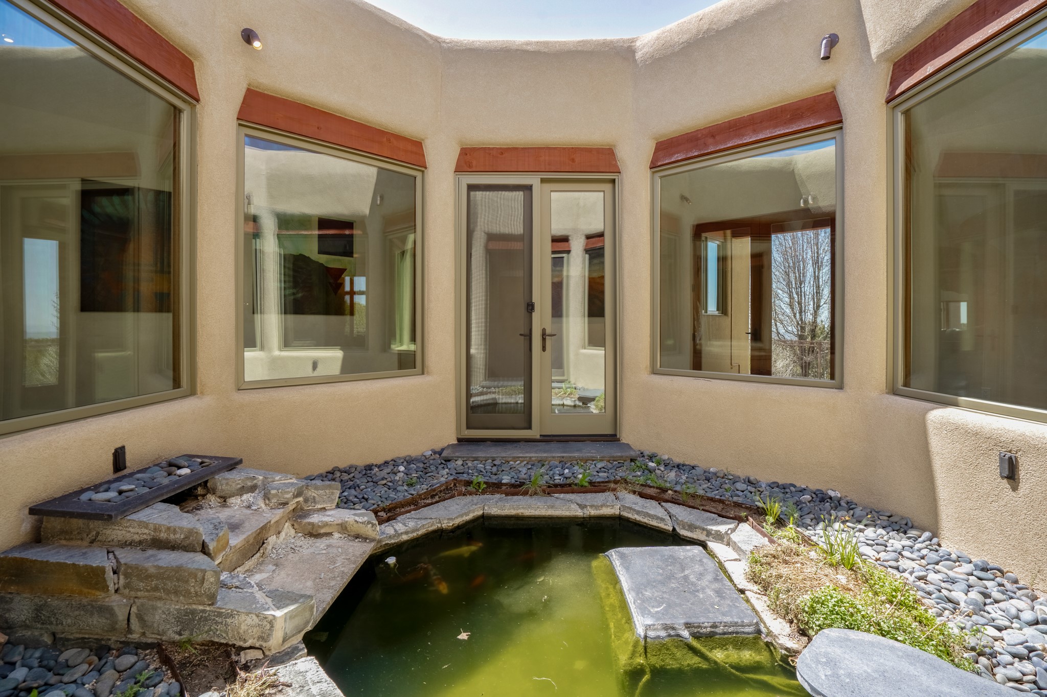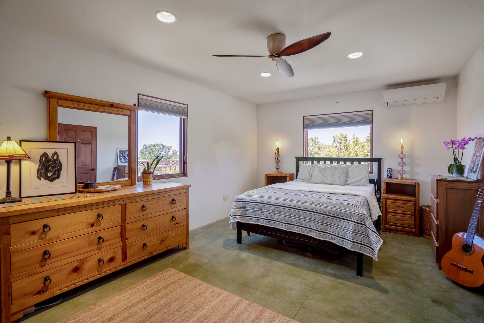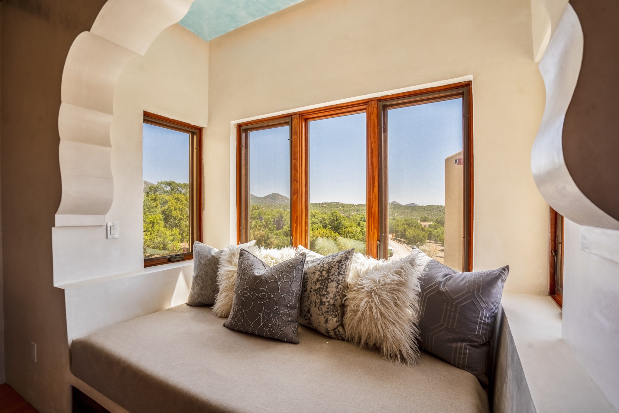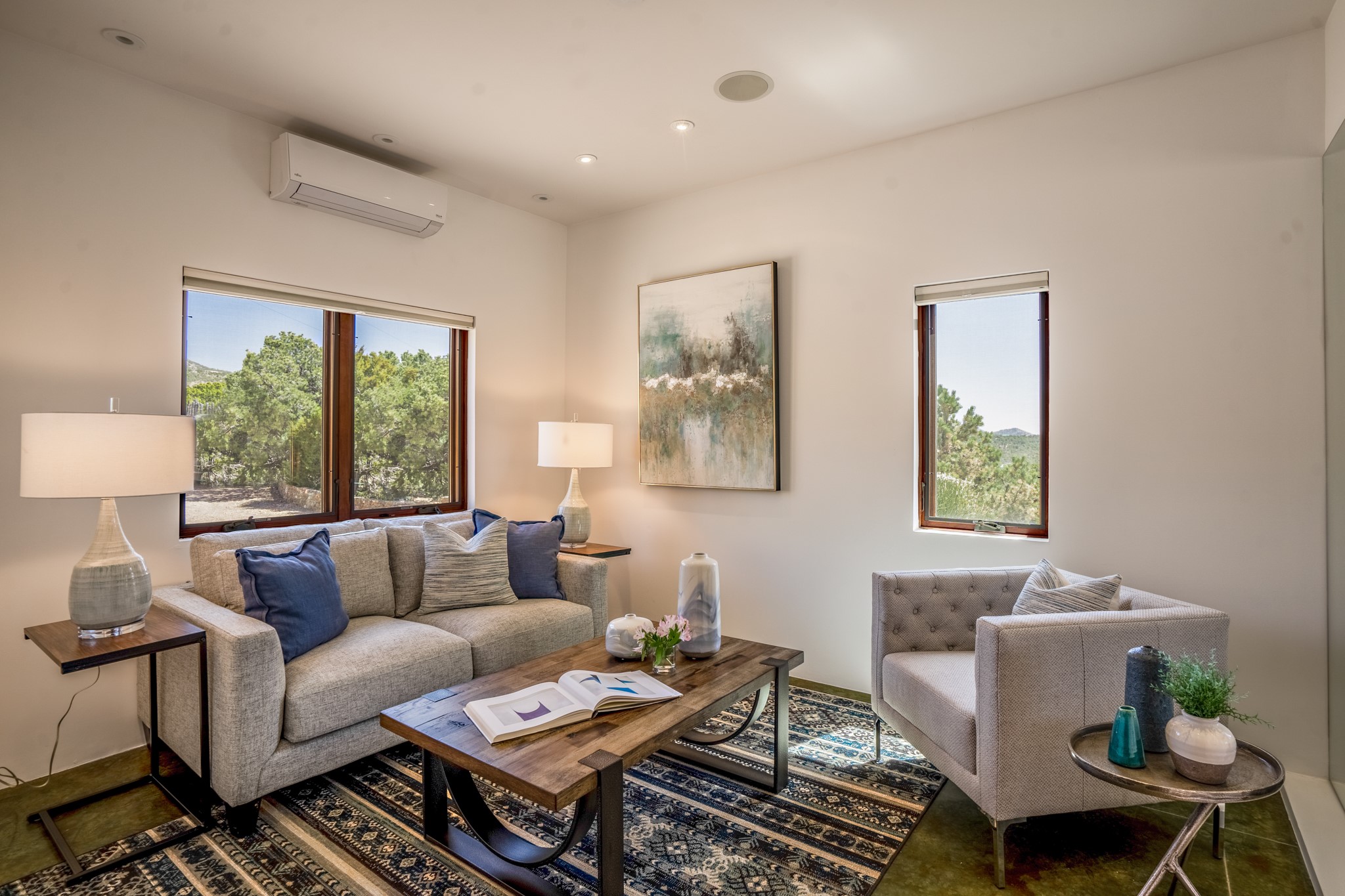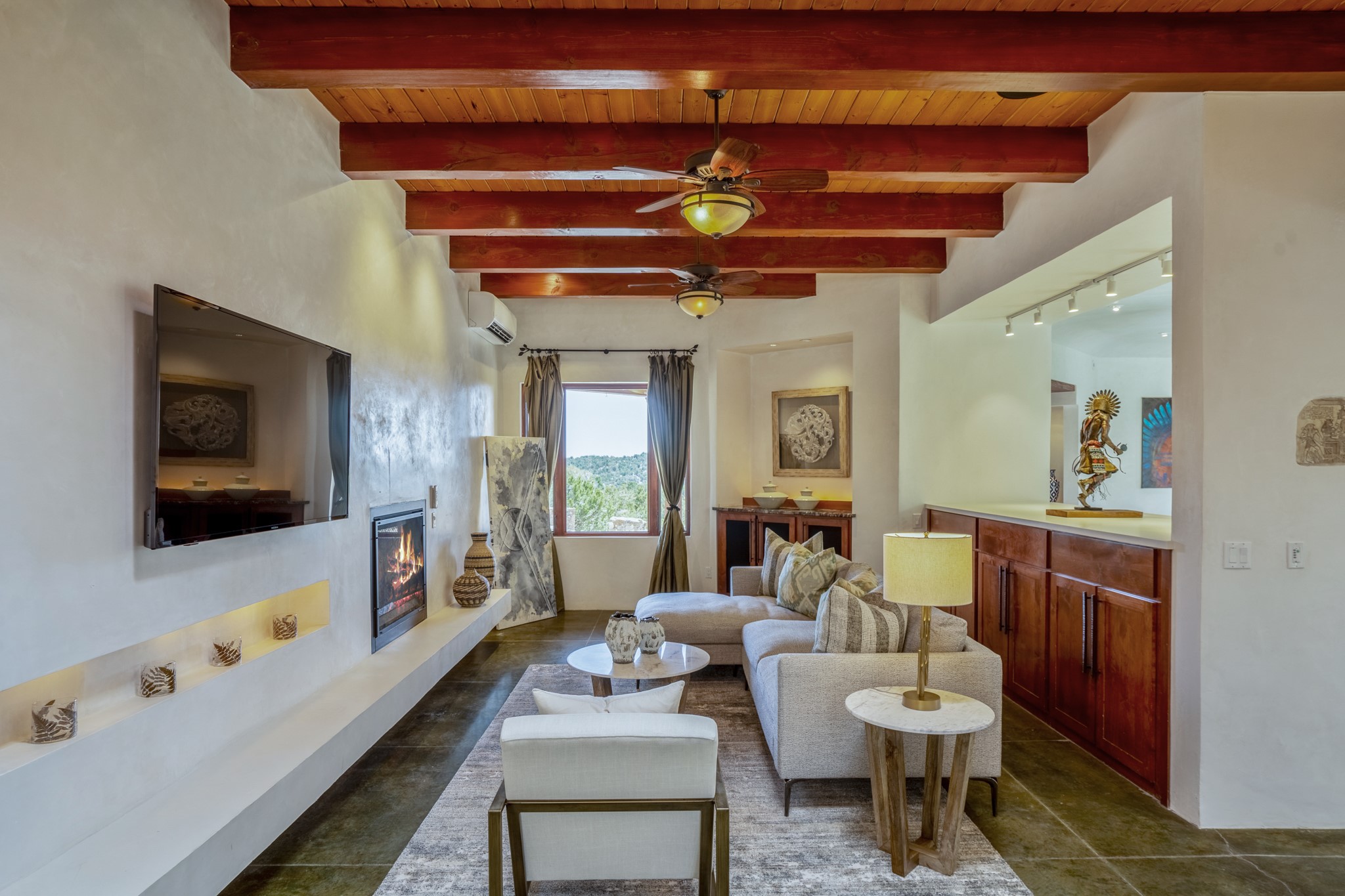 Introducing a truly unique property off Old Santa Fe Trail with distinct Asian design influences that boasts a dedicated 1,059 sf guest house, 576 sf separate studio plus an office and bonus room off the primary suite (think gym, study, nursery, or second office), 4-car garage and 2 living rooms! For those looking to work from home or pursue creative endeavors, the private detached studio provides the perfect space to do so. This sprawling home is situated on a generous lot with breathtaking Jemez sunset views. The chef's kitchen features top-of-the-line appliances, wet bar and ample counter space, making it the perfect space for preparing gourmet meals and entertaining guests. Minutes to the Plaza!