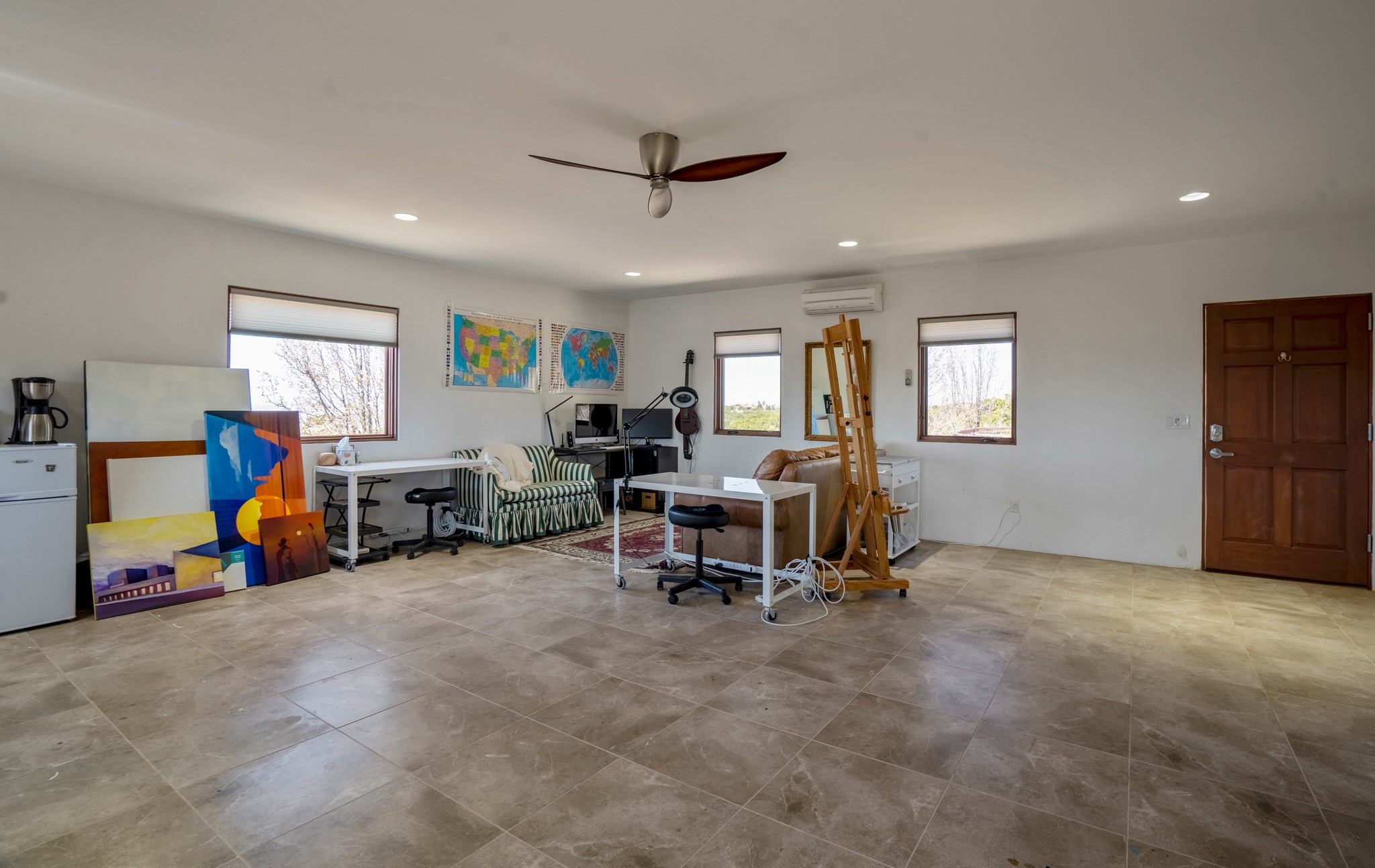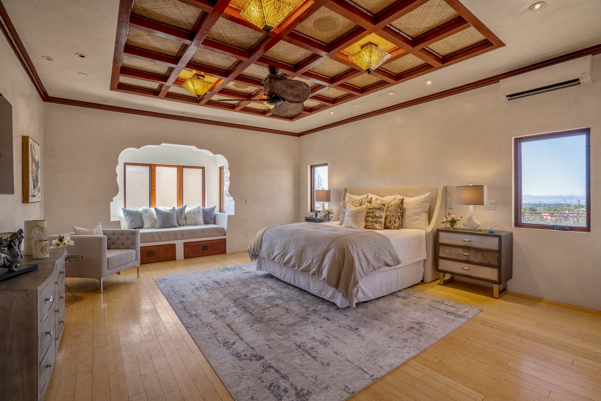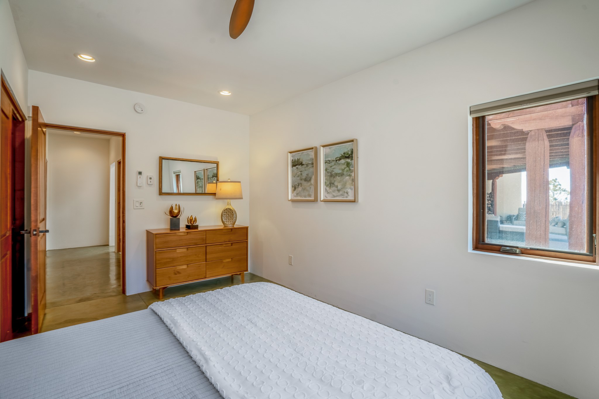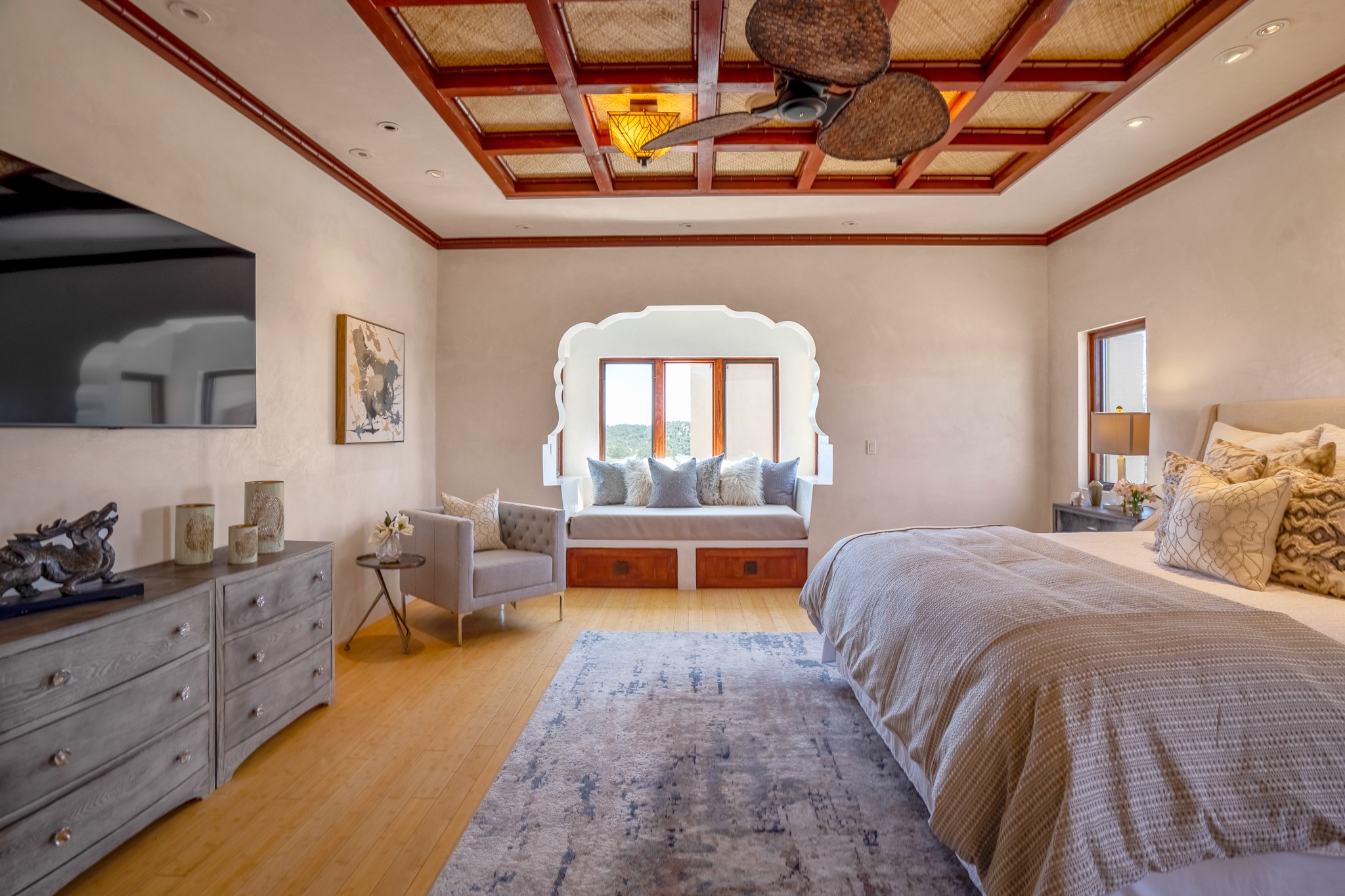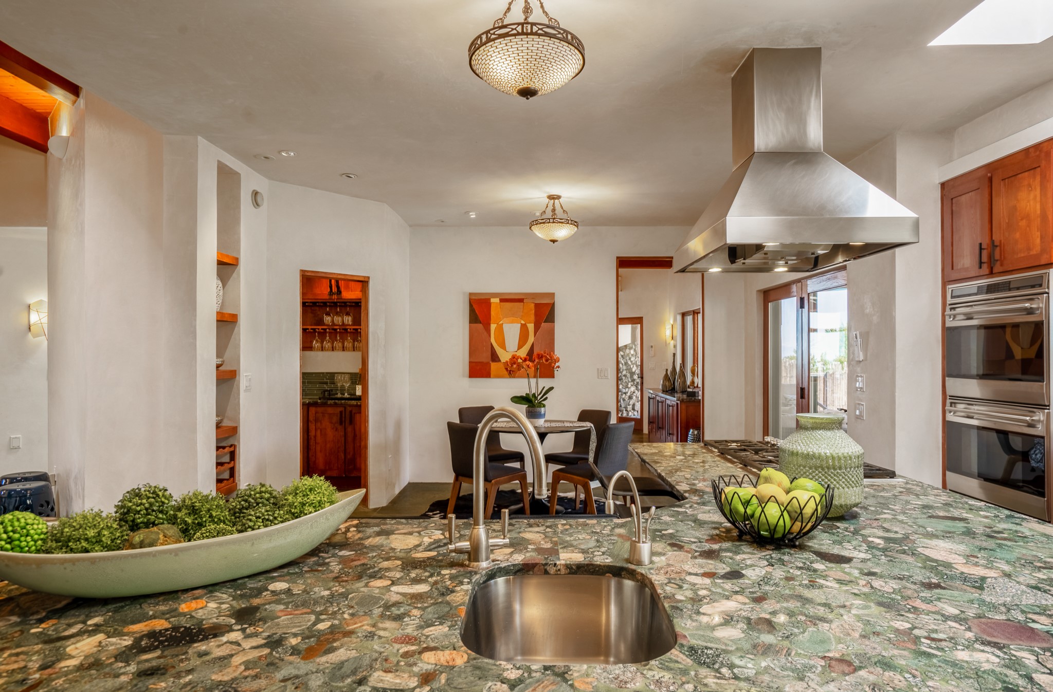 Introducing a truly unique property off Old Santa Fe Trail with distinct Asian design influences that boasts a dedicated 1,059 sf guest house, 576 sf separate studio plus an office and bonus room off the primary suite (think gym, study, nursery, or second office), 4-car garage and 2 living rooms! For those looking to work from home or pursue creative endeavors, the private detached studio provides the perfect space to do so. This sprawling home is situated on a generous lot with breathtaking Jemez sunset views. The chef's kitchen features top-of-the-line appliances, wet bar and ample counter space, making it the perfect space for preparing gourmet meals and entertaining guests. Minutes to the Plaza!