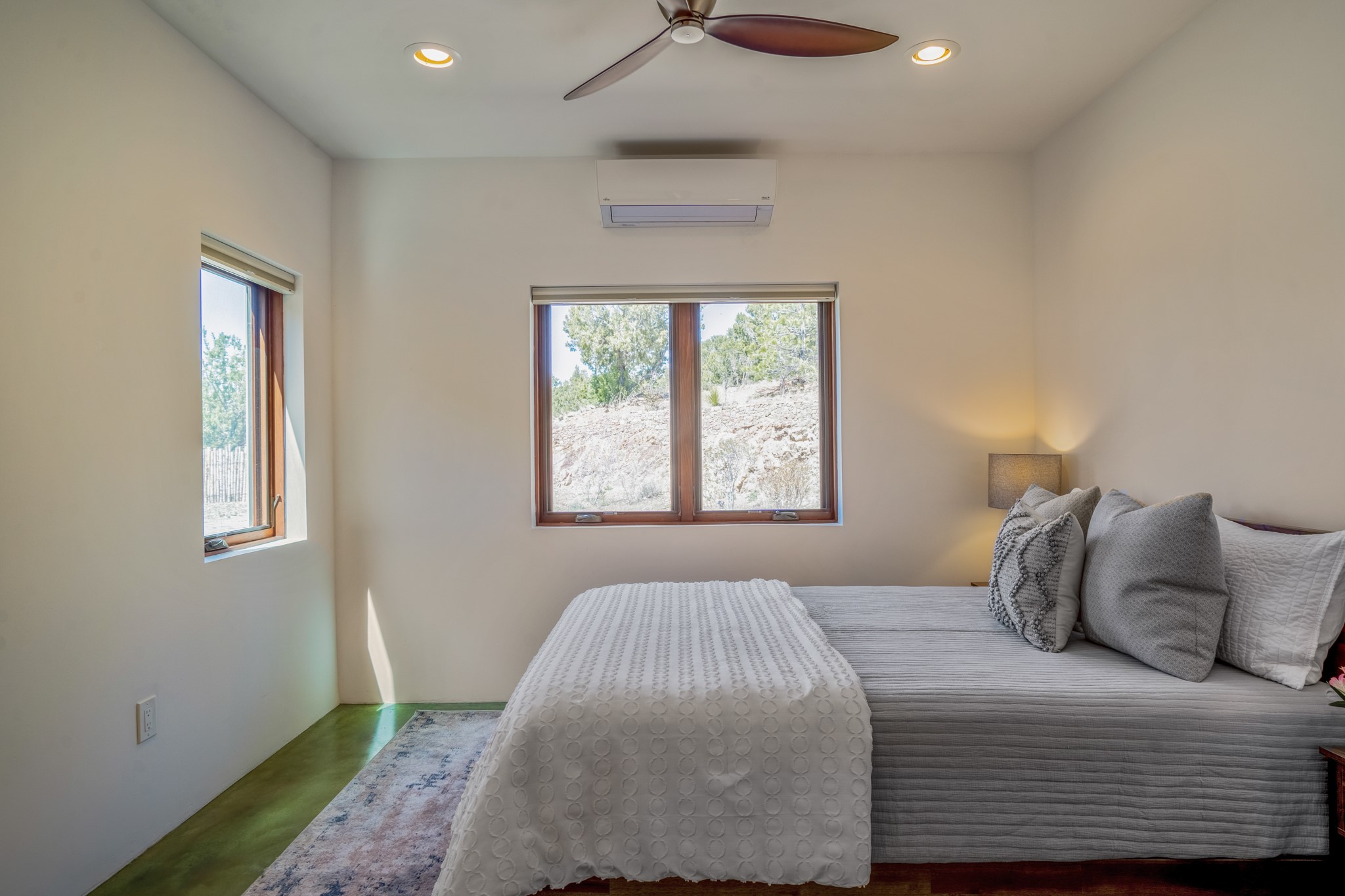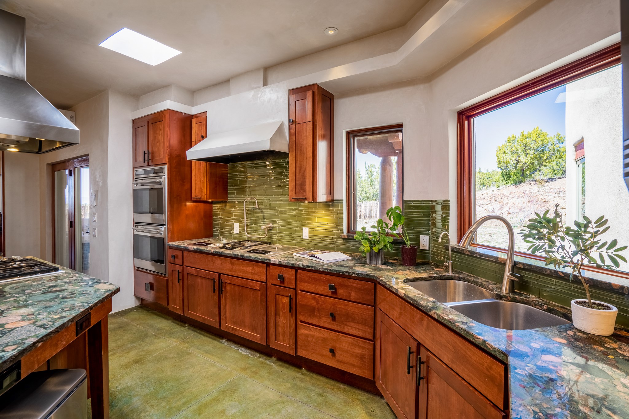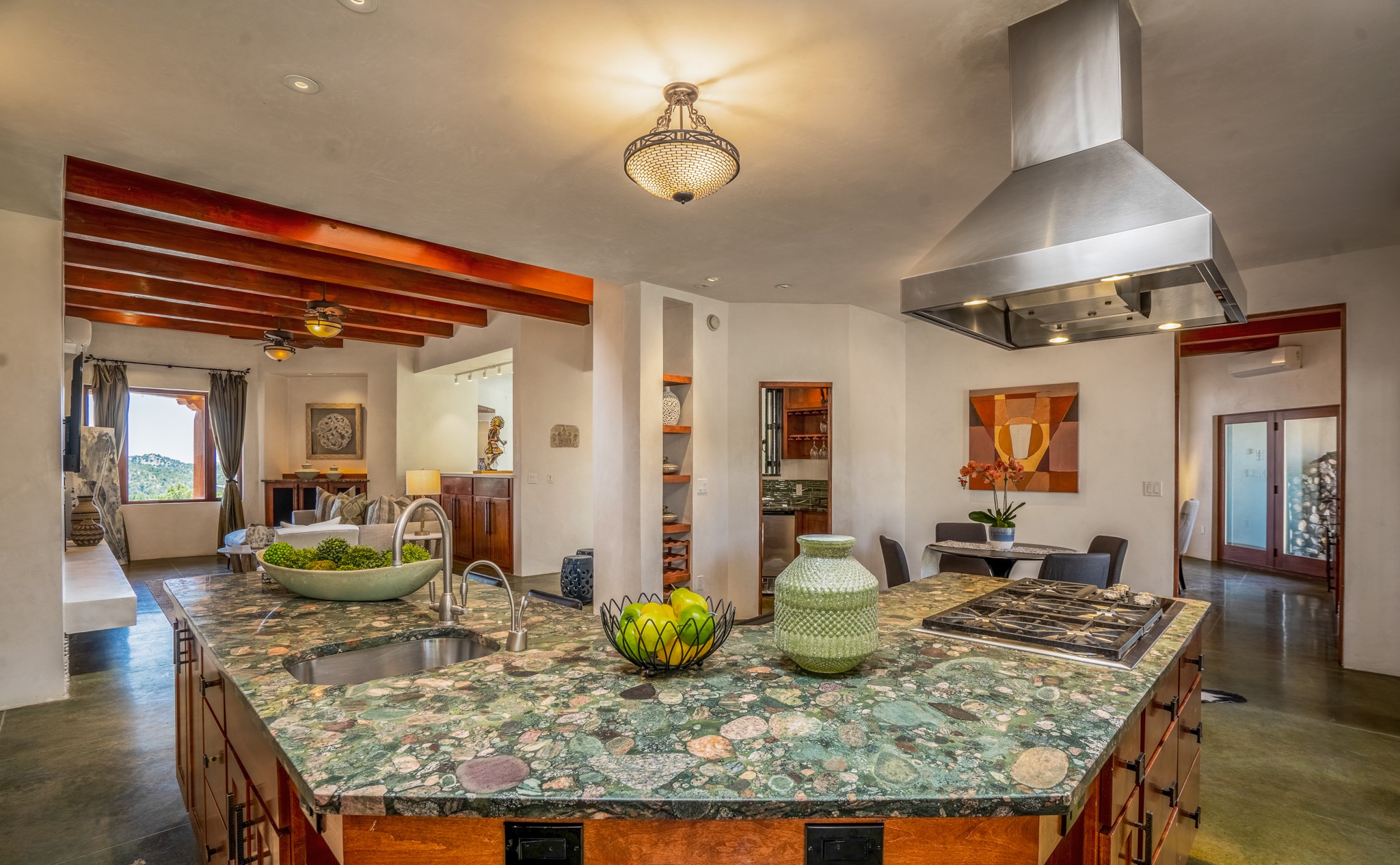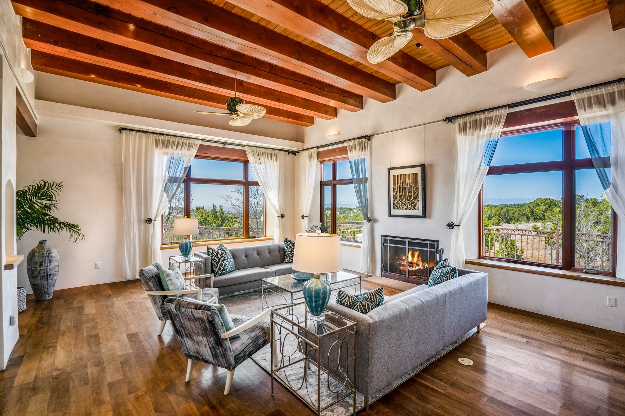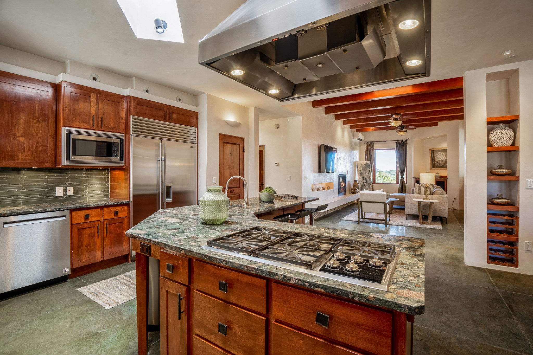 Introducing a truly unique property off Old Santa Fe Trail with distinct Asian design influences that boasts a dedicated 1,059 sf guest house, 576 sf separate studio plus an office and bonus room off the primary suite (think gym, study, nursery, or second office), 4-car garage and 2 living rooms! For those looking to work from home or pursue creative endeavors, the private detached studio provides the perfect space to do so. This sprawling home is situated on a generous lot with breathtaking Jemez sunset views. The chef's kitchen features top-of-the-line appliances, wet bar and ample counter space, making it the perfect space for preparing gourmet meals and entertaining guests. Minutes to the Plaza!