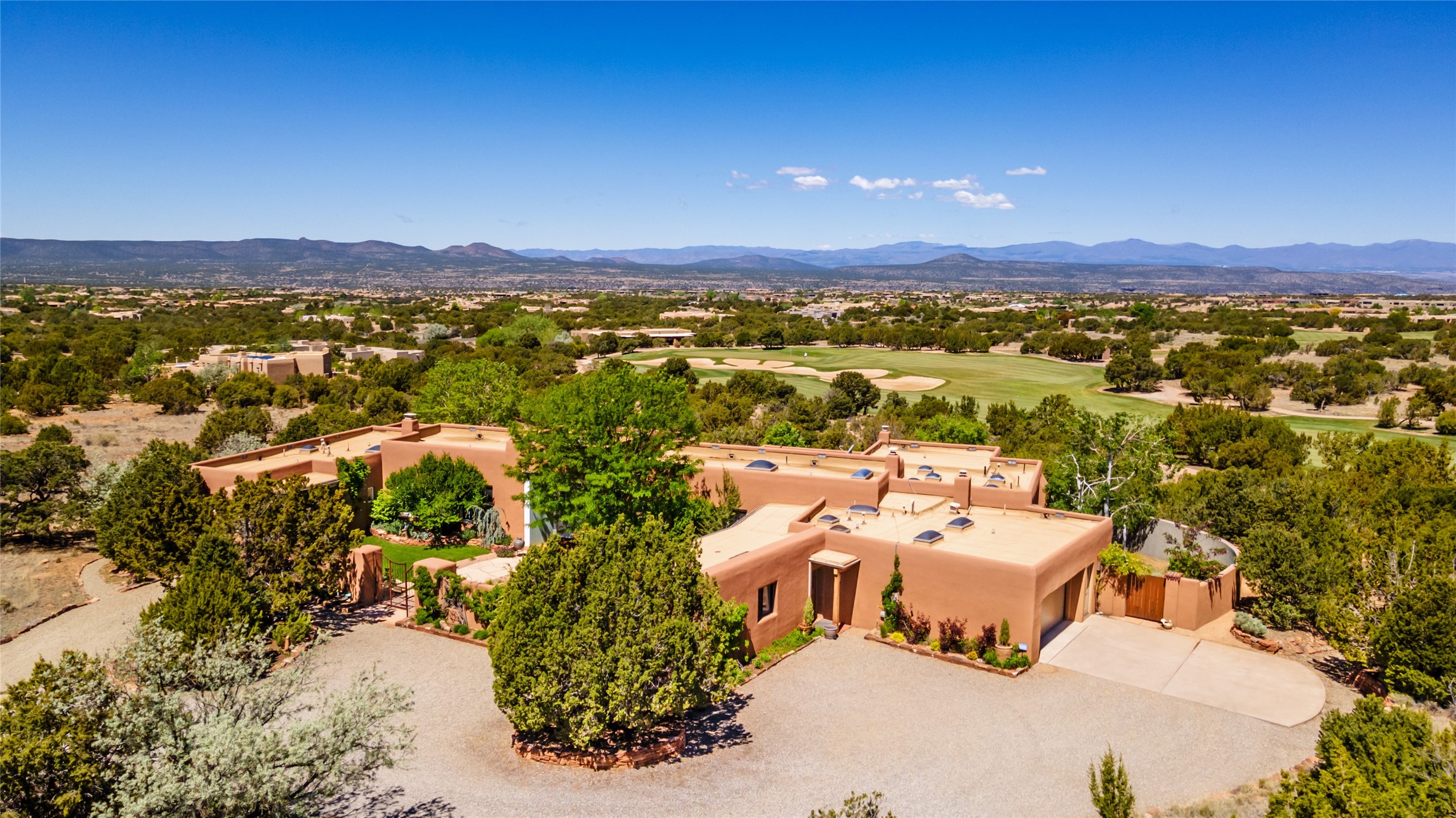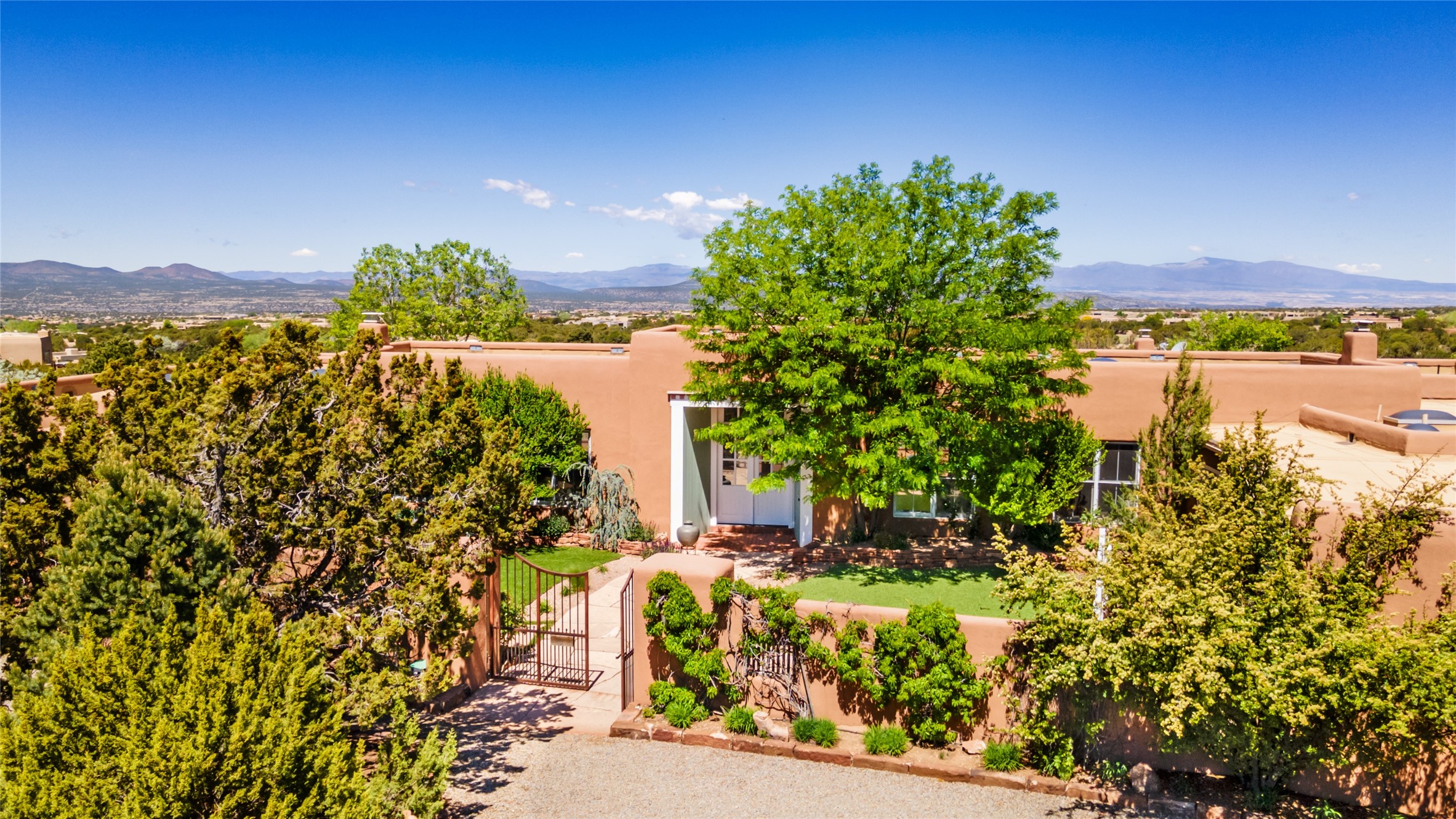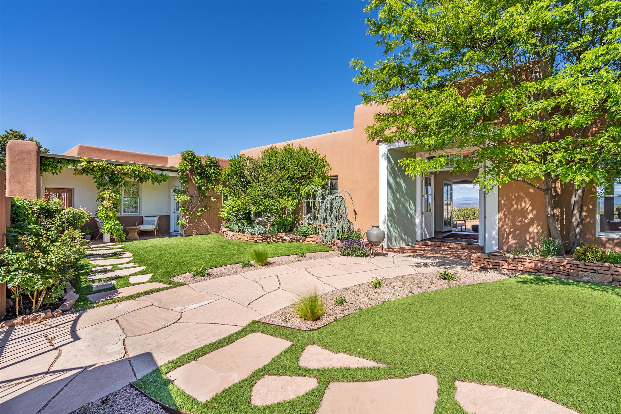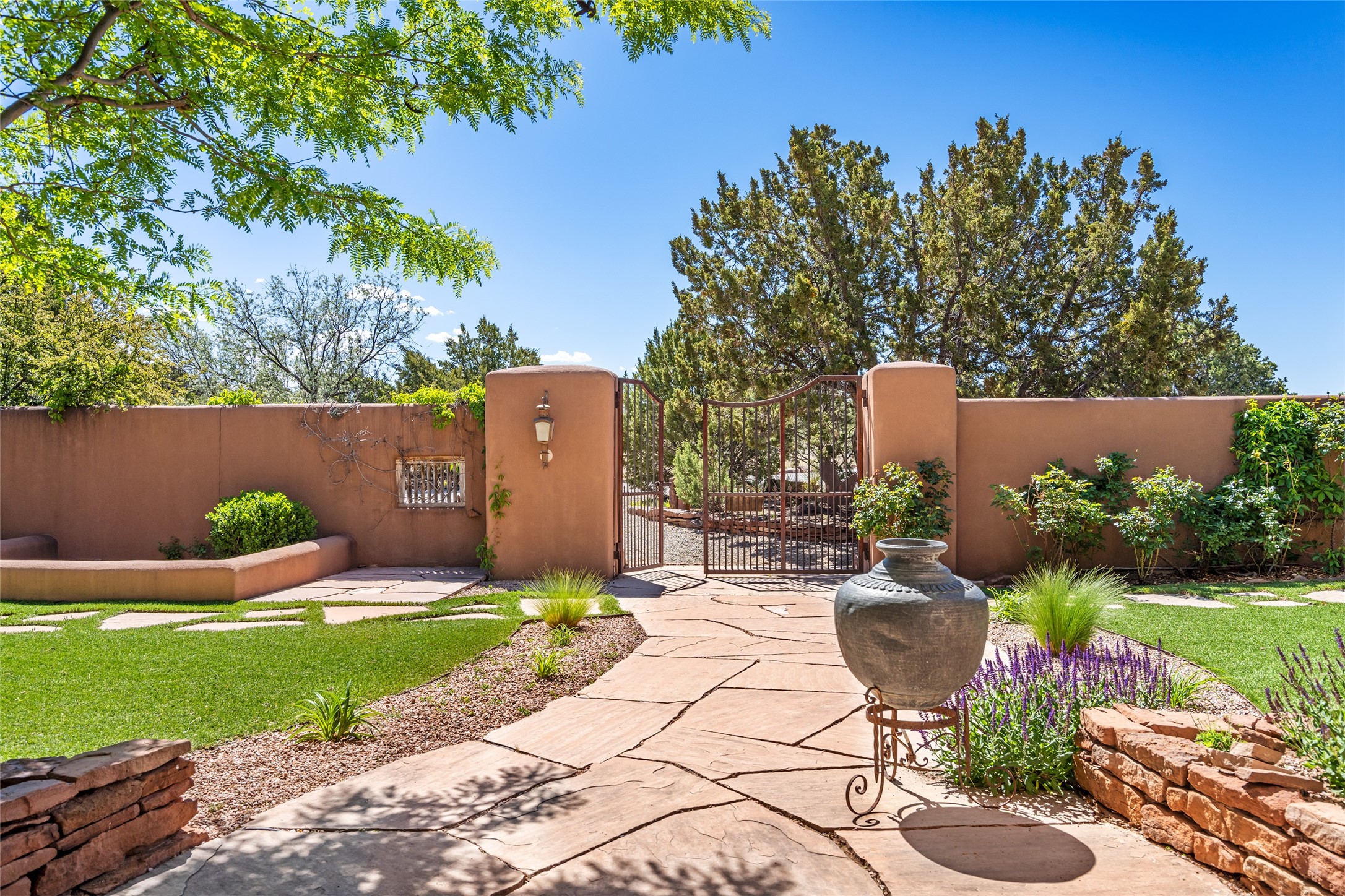EXPERIENCE THE EPITOME OF LUXURY LIVING IN THIS RARE SPANISH TERRITORIAL-STYLE HOME WITH ASTONISHING VIEWS, NESTLED BY THE 6TH HOLE OF THE SUNRISE GOLF COURSE WITHIN THE PRESTIGIOUS GATED COMMUNITY OF LAS CAMPANAS. This exquisite single-level residence was designed by Trey Jordan and built by Will Prull. The home is washed with natural light and offers 3 bedrooms, 3 bathrooms, 2 powder rooms, and a 2-car garage with storage, all meticulously designed for comfort and elegance. Gated and walled, this property is set back on the lot offering security and privacy. The impressive entry consists of large gates with a mature garden and tall doors that open to and through the house leading to huge views and the expansive covered portal ideal for entertaining or simply savoring sunsets to the West. Mountain and garden views are maximized throughout the home with dazzling effect. The residence is thoughtfully divided into two wings, providing both privacy and a seamless flow. The south wing boasts spacious guest bedrooms and a large living room, perfect for relaxation or entertaining. The north wing features a gourmet kitchen, dining area, informal living space, and the luxurious primary suite. The conservatory with banks of windows that face the enclosed front garden is heated for year-round enjoyment, and makes for an ideal garden room, crafts room, or large office. The owner's suite has been impeccably remodeled, featuring a spa-like bathroom with a soaking tub, a separate walk-in shower, two oversized walk-in closets, and a private "secret garden" patio. Conveniently located near the clubhouse and perched above the golf course, this home provides the perfect balance of luxury and privacy. A tree-lined buffer ensures tranquility, making this property a true sanctuary. With its enchanting gardens, seamless indoor/outdoor living, and unmatched views, this home is a rare gem in Las Campanas, offering a lifestyle of unparalleled elegance and comfort.