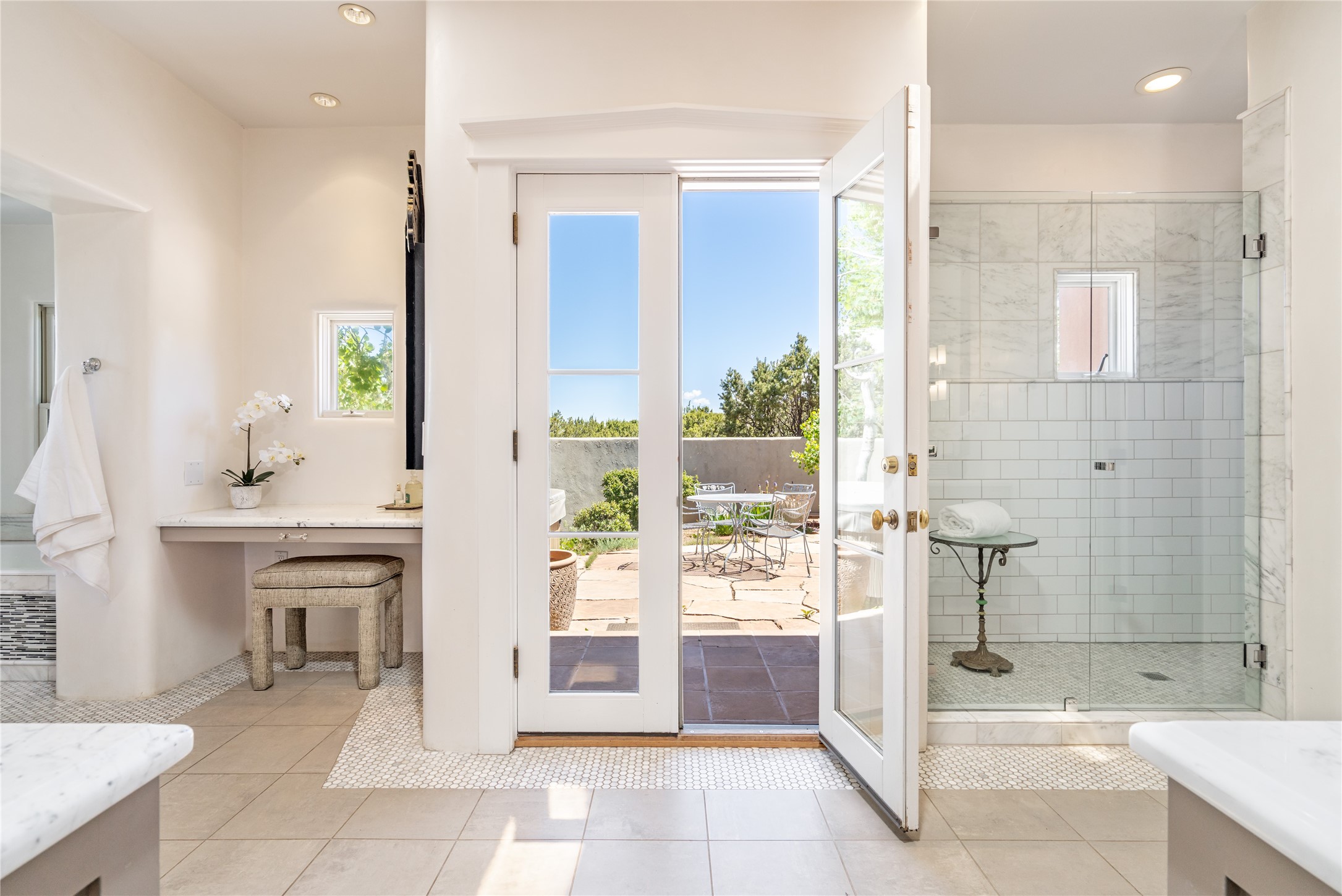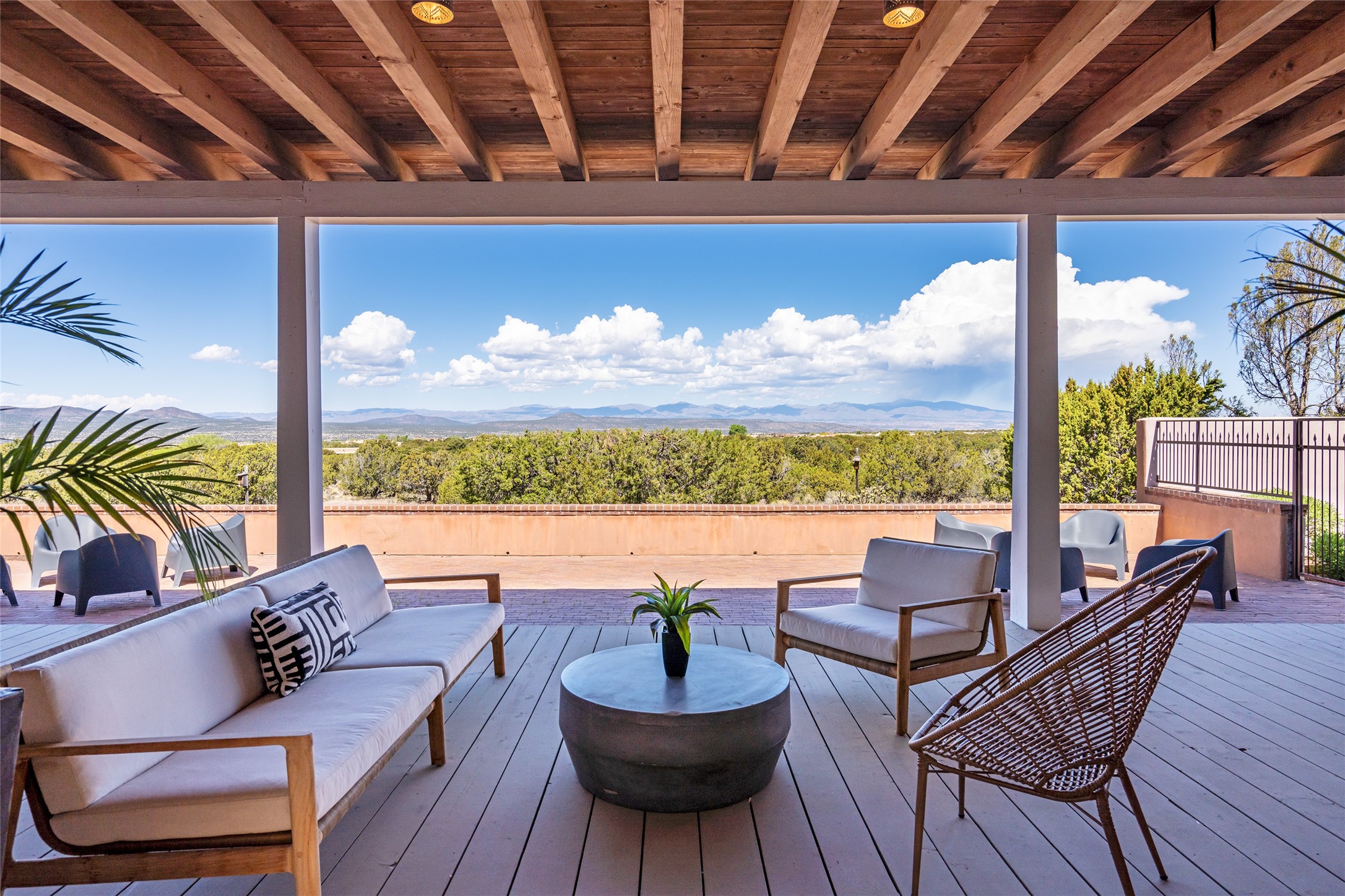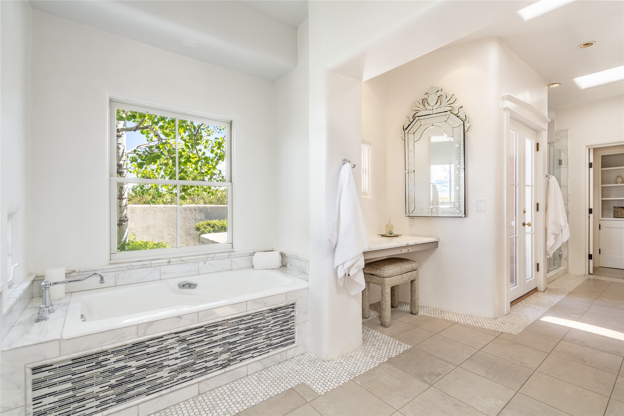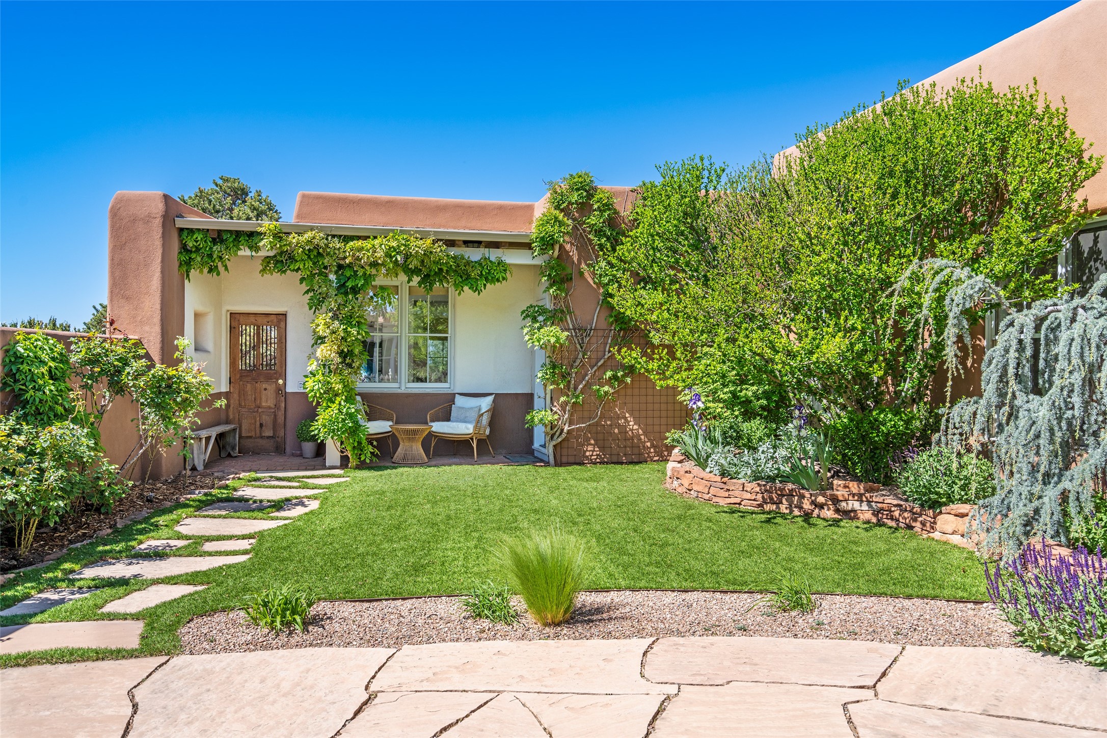EXPERIENCE THE EPITOME OF LUXURY LIVING IN THIS RARE SPANISH TERRITORIAL-STYLE HOME WITH ASTONISHING VIEWS, NESTLED BY THE 6TH HOLE OF THE SUNRISE GOLF COURSE WITHIN THE PRESTIGIOUS GATED COMMUNITY OF LAS CAMPANAS. This exquisite single-level residence was designed by Trey Jordan and built by Will Prull. The home is washed with natural light and offers 3 bedrooms, 3 bathrooms, 2 powder rooms, and a 2-car garage with storage, all meticulously designed for comfort and elegance. Gated and walled, this property is set back on the lot offering security and privacy. The impressive entry consists of large gates with a mature garden and tall doors that open to and through the house leading to huge views and the expansive covered portal ideal for entertaining or simply savoring sunsets to the West. Mountain and garden views are maximized throughout the home with dazzling effect. The residence is thoughtfully divided into two wings, providing both privacy and a seamless flow. The south wing boasts spacious guest bedrooms and a large living room, perfect for relaxation or entertaining. The north wing features a gourmet kitchen, dining area, informal living space, and the luxurious primary suite. The conservatory with banks of windows that face the enclosed front garden is heated for year-round enjoyment, and makes for an ideal garden room, crafts room, or large office. The owner's suite has been impeccably remodeled, featuring a spa-like bathroom with a soaking tub, a separate walk-in shower, two oversized walk-in closets, and a private "secret garden" patio. Conveniently located near the clubhouse and perched above the golf course, this home provides the perfect balance of luxury and privacy. A tree-lined buffer ensures tranquility, making this property a true sanctuary. With its enchanting gardens, seamless indoor/outdoor living, and unmatched views, this home is a rare gem in Las Campanas, offering a lifestyle of unparalleled elegance and comfort.