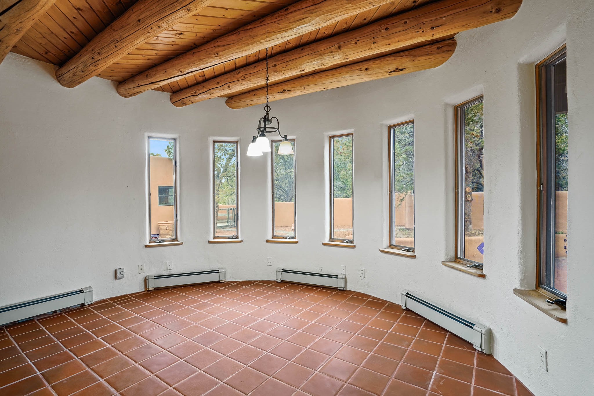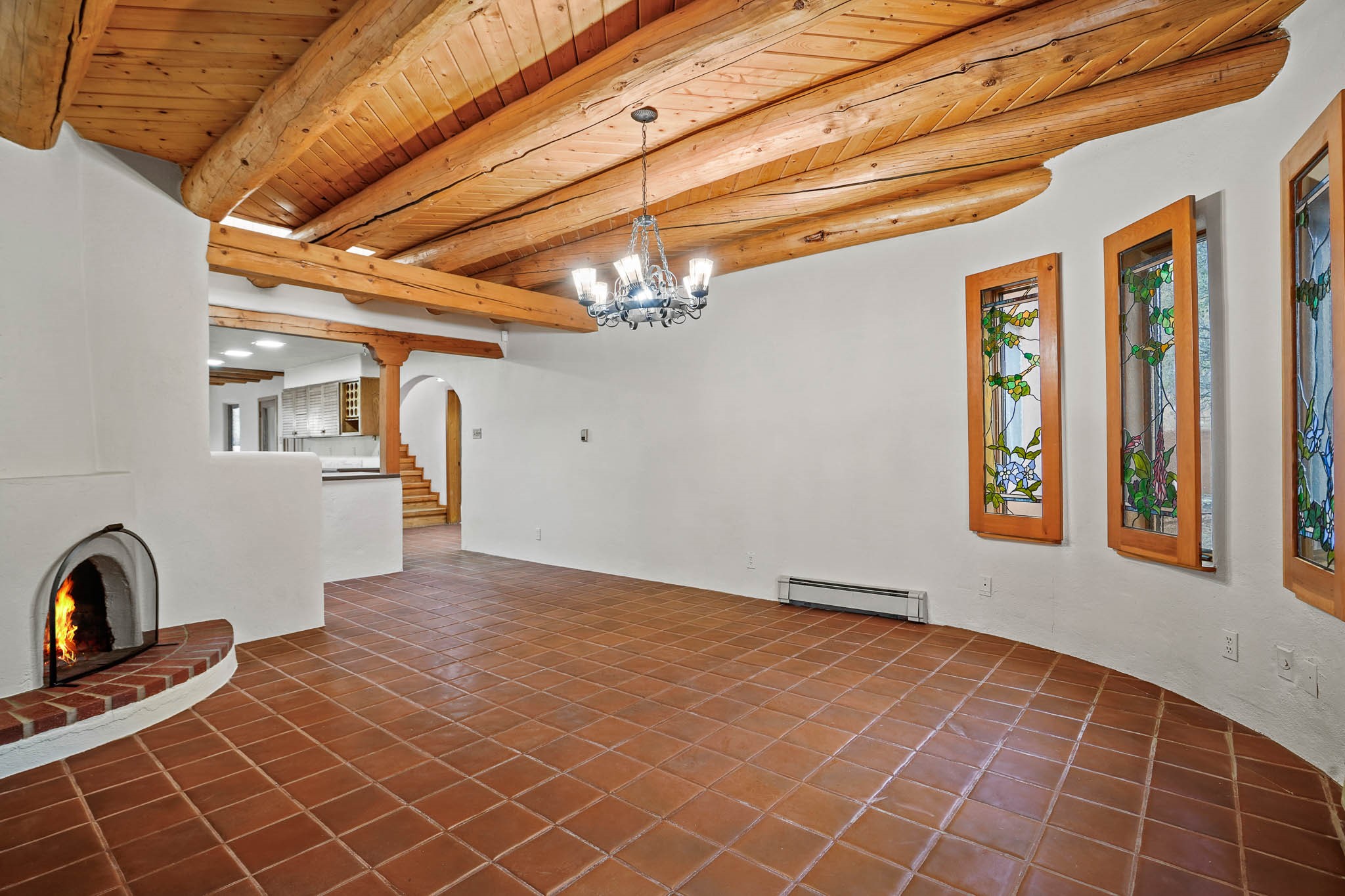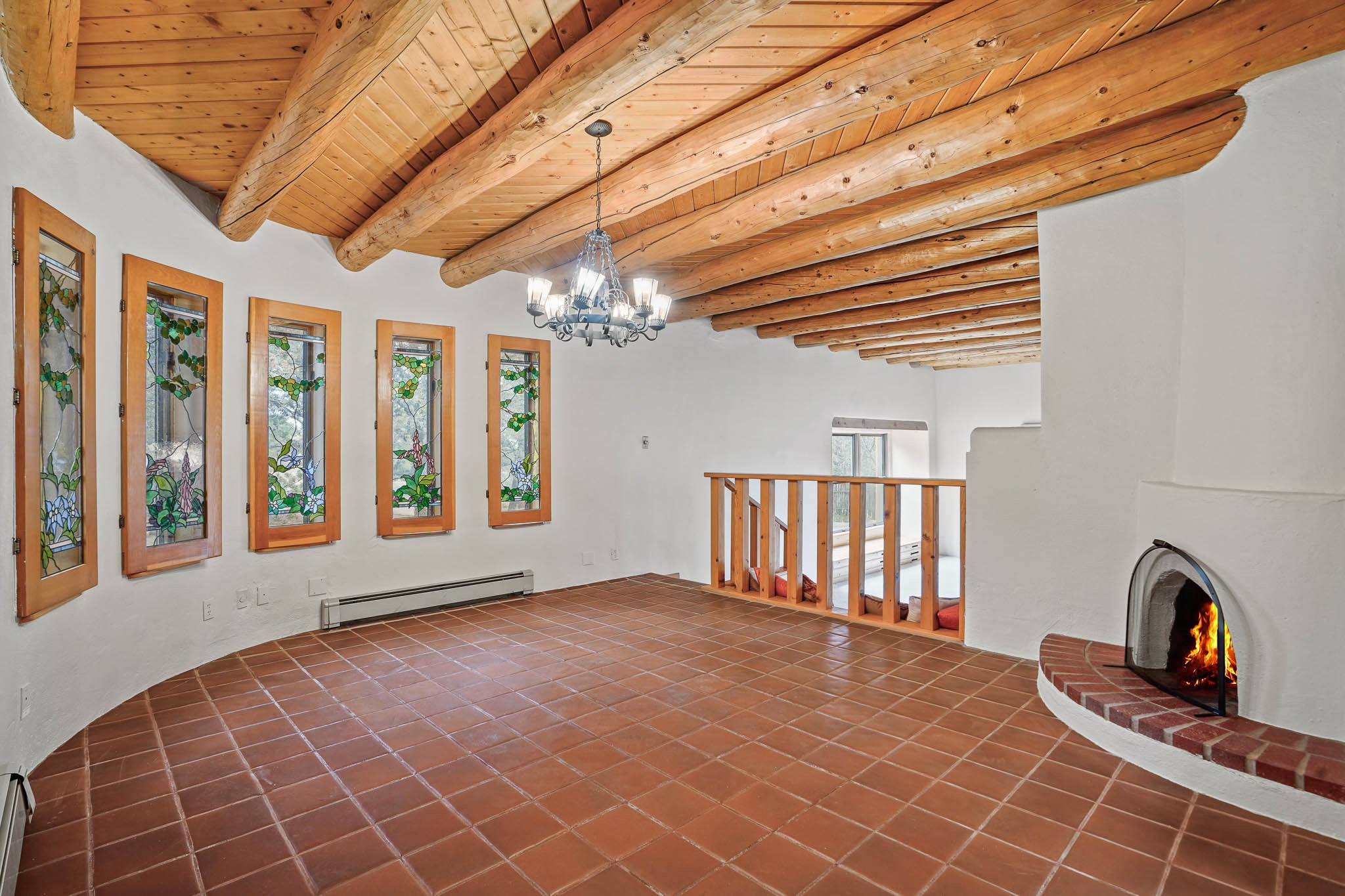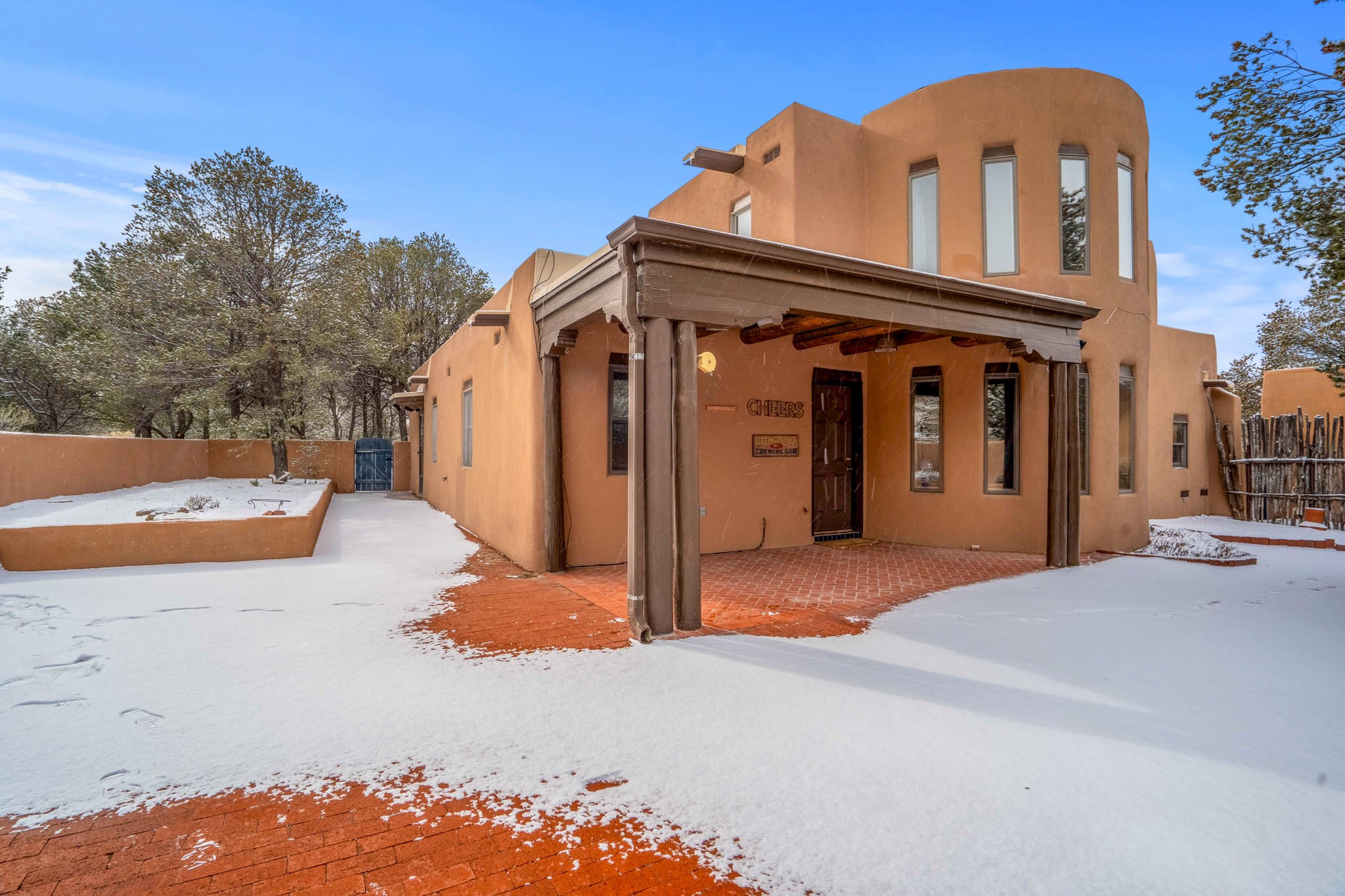 Nestled in a serene eastside neighborhood, this charming home sits on a generous 0.5-acre parcel, offering the perfect blend of tranquility and convenience. Ideally located just minutes from downtown Santa Fe and steps away from the Sun Mountain hiking trails, this property is a haven for nature enthusiasts and city dwellers alike. Situated within the highly sought-after Wood Gormley school district, this 2,094-square-foot home features 3 bedrooms and 3 full bathrooms. Inside, you'll find a beautifully open kitchen with Saltillo tile flooring and warmed by radiant baseboard heating. The living room steals the show with its elevated ceiling, striking vigas, and a fireplace creating an inviting ambiance. Adding a touch of elegance, the dining room features custom stained-glass window shades that enhance the home's unique charm. Upstairs, the spacious primary bedroom includes access to a private rooftop deck, where you can unwind and take in Santa Fe's iconic sunsets. Outside, the secluded backyard is ideal for entertaining or simply enjoying the peace and quiet. For those with creative passions or remote work needs, the property includes a two-car attached garage and two detached art studios/offices, providing ample space for hobbies or a home office. Additionally, the entire roof was replaced with TPO in March of 2022.Don't miss the opportunity to make this one-of-a-kind property your own. Schedule your showing today!