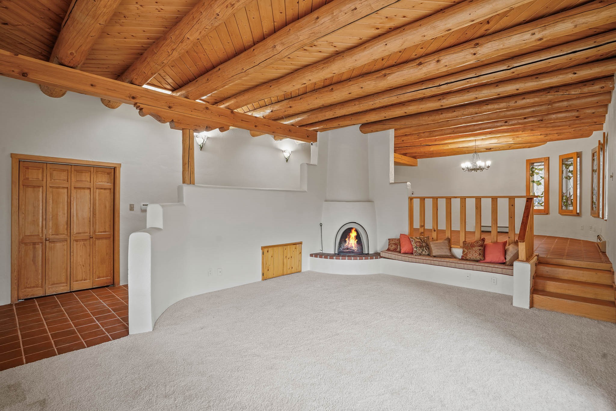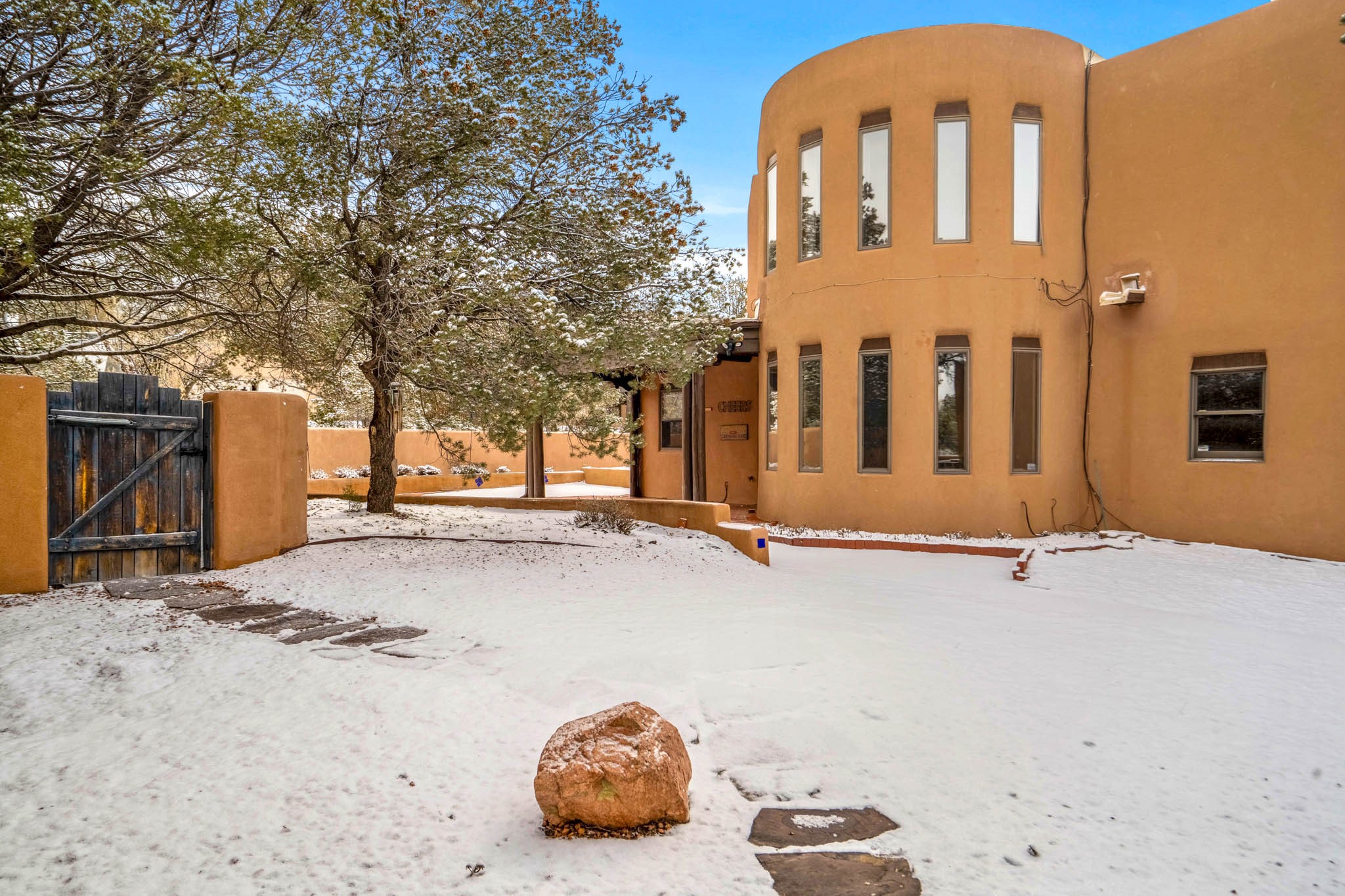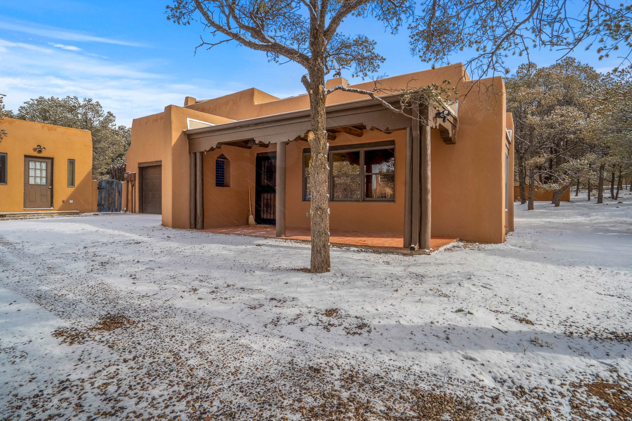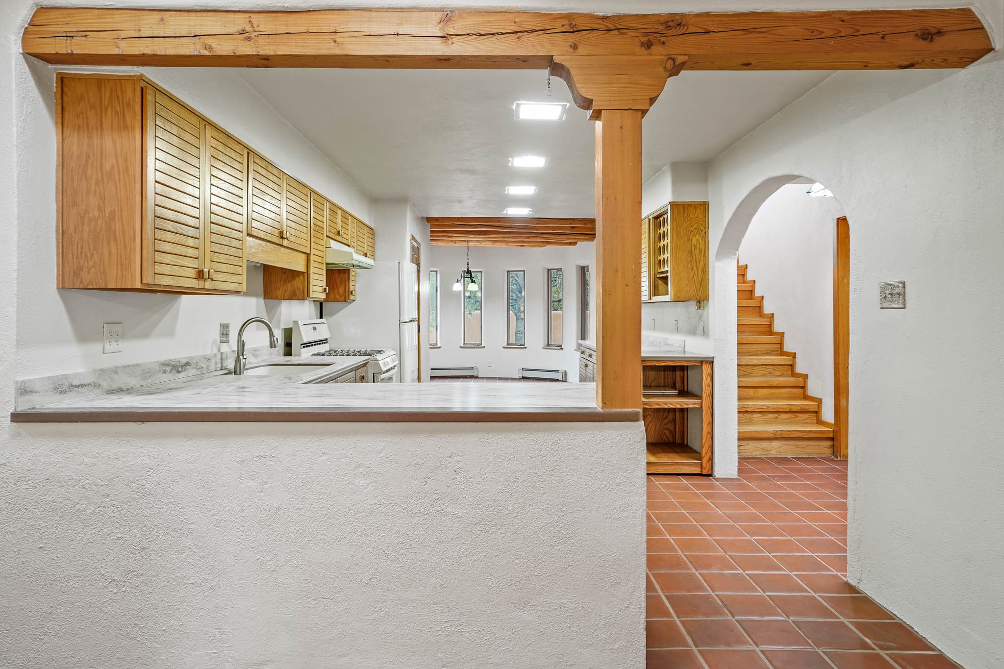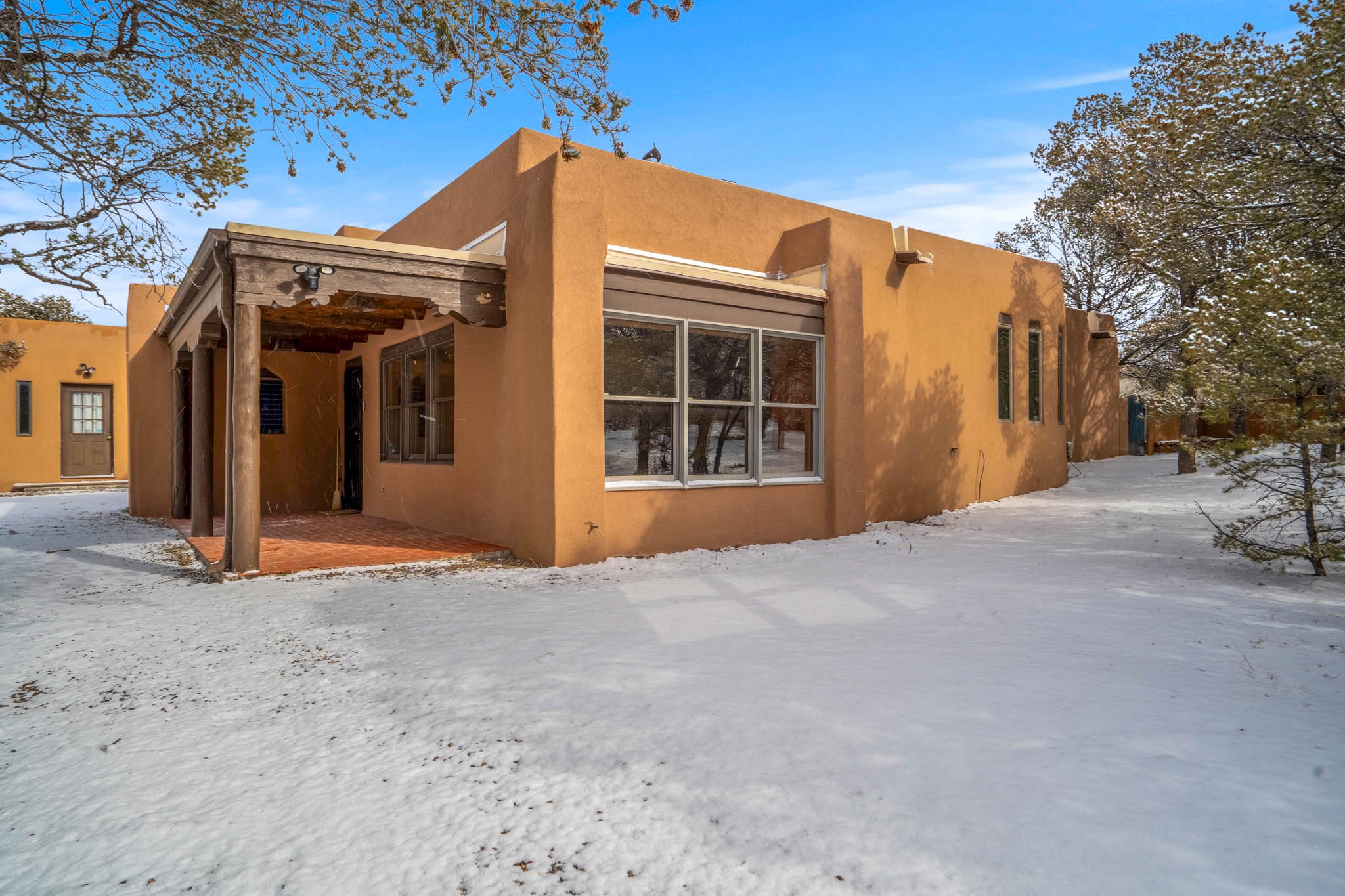 Nestled in a serene eastside neighborhood, this charming home sits on a generous 0.5-acre parcel, offering the perfect blend of tranquility and convenience. Ideally located just minutes from downtown Santa Fe and steps away from the Sun Mountain hiking trails, this property is a haven for nature enthusiasts and city dwellers alike. Situated within the highly sought-after Wood Gormley school district, this 2,094-square-foot home features 3 bedrooms and 3 full bathrooms. Inside, you'll find a beautifully open kitchen with Saltillo tile flooring and warmed by radiant baseboard heating. The living room steals the show with its elevated ceiling, striking vigas, and a fireplace creating an inviting ambiance. Adding a touch of elegance, the dining room features custom stained-glass window shades that enhance the home's unique charm. Upstairs, the spacious primary bedroom includes access to a private rooftop deck, where you can unwind and take in Santa Fe's iconic sunsets. Outside, the secluded backyard is ideal for entertaining or simply enjoying the peace and quiet. For those with creative passions or remote work needs, the property includes a two-car attached garage and two detached art studios/offices, providing ample space for hobbies or a home office. Additionally, the entire roof was replaced with TPO in March of 2022.Don't miss the opportunity to make this one-of-a-kind property your own. Schedule your showing today!