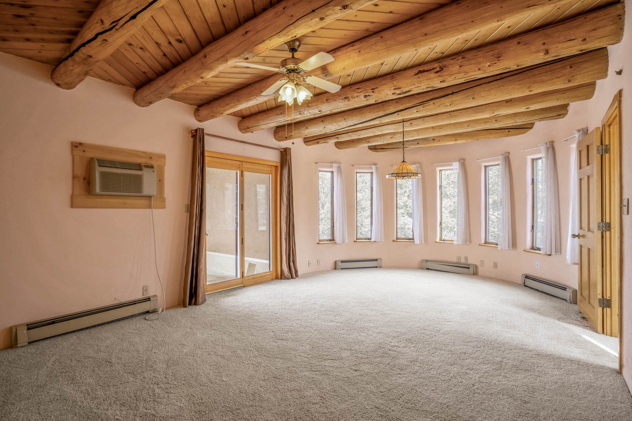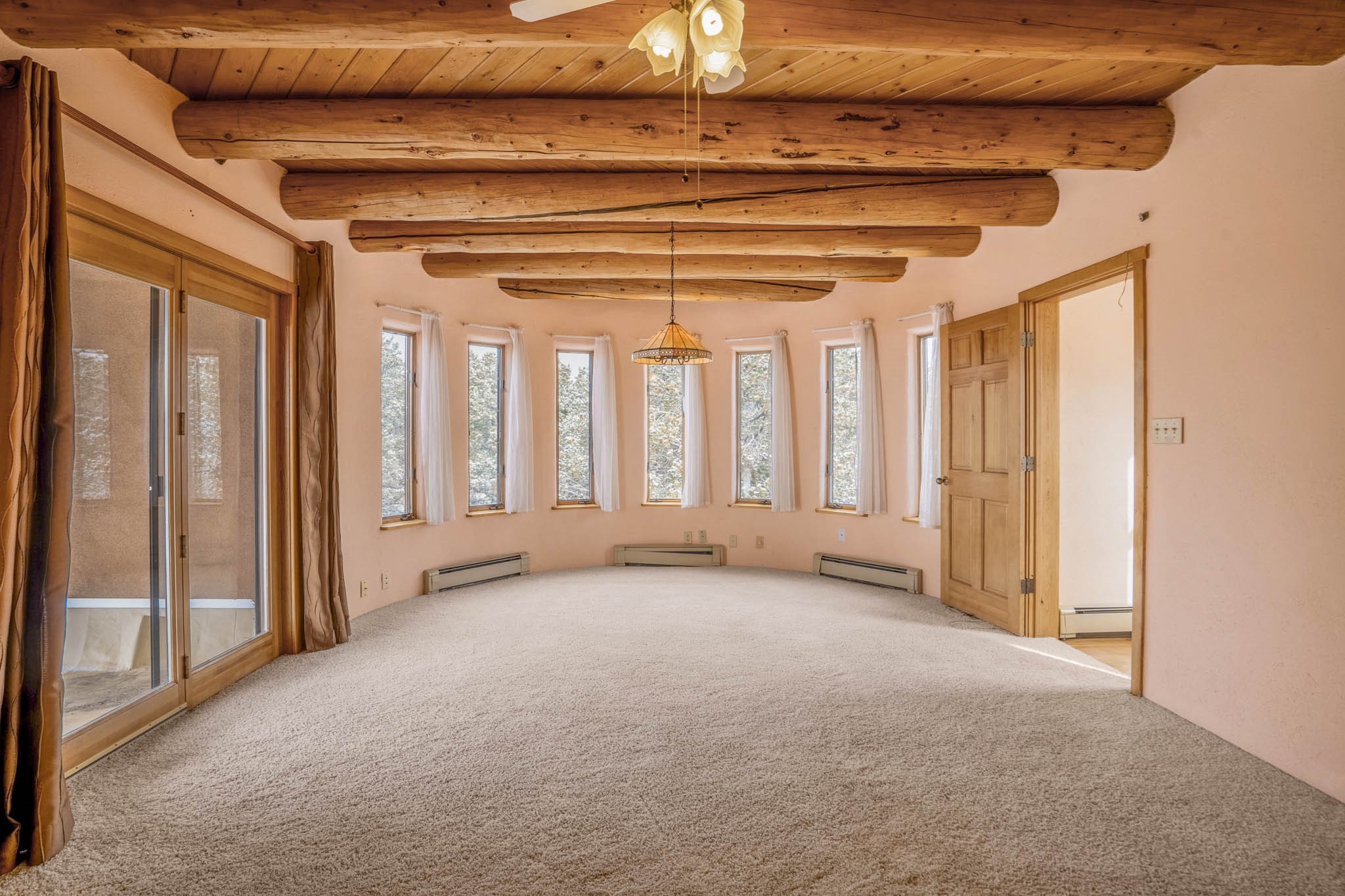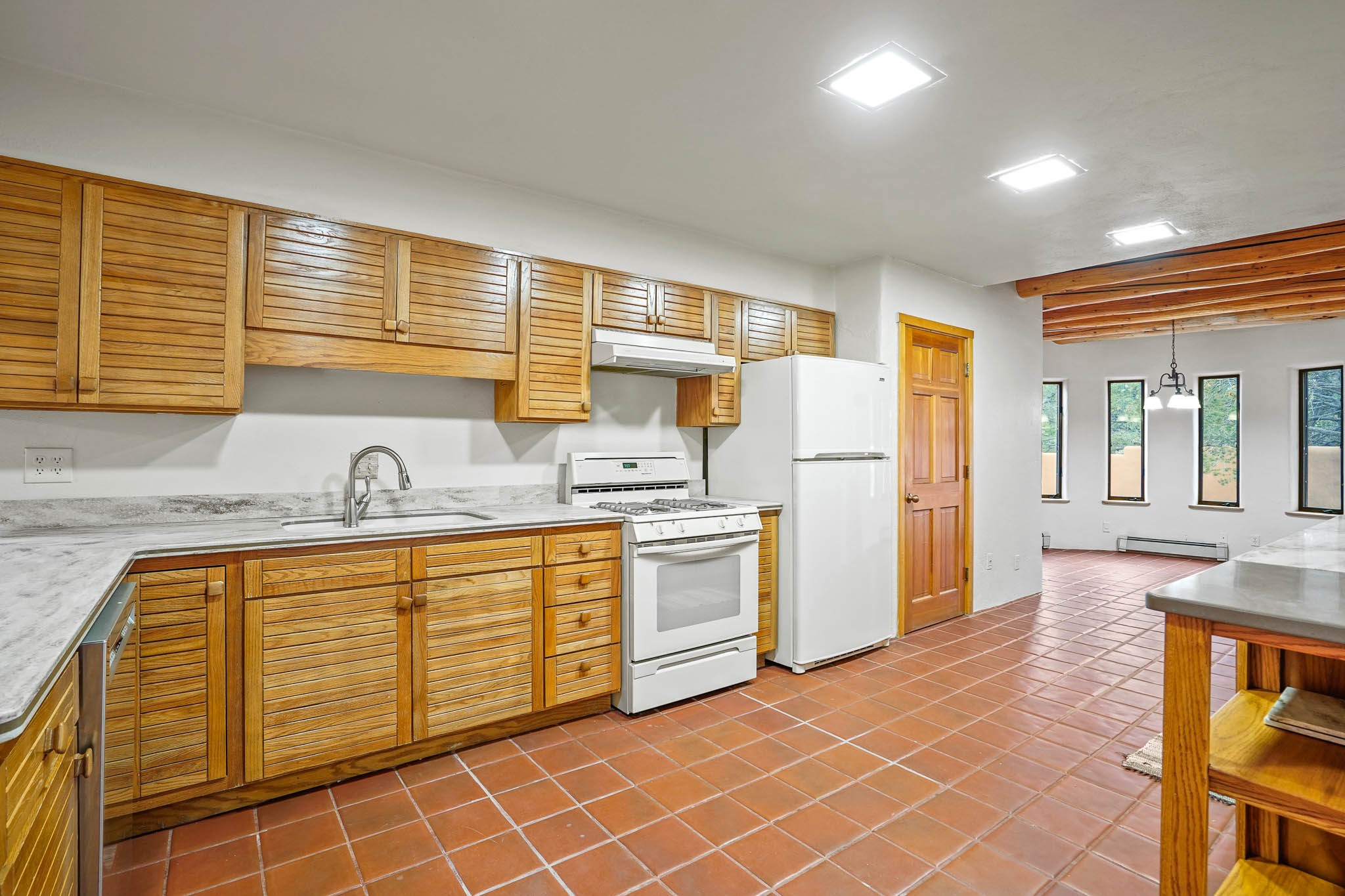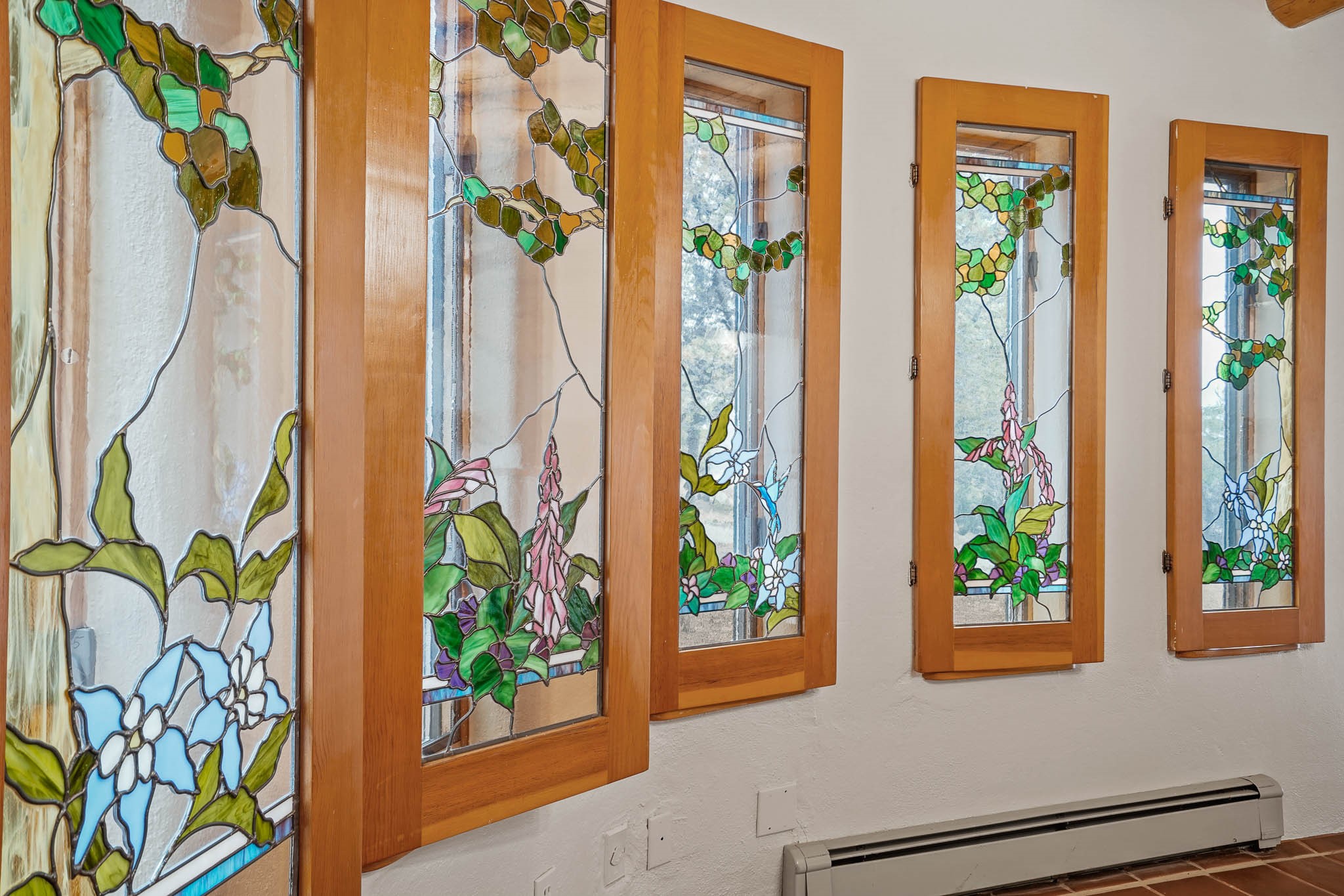 Nestled in a serene eastside neighborhood, this charming home sits on a generous 0.5-acre parcel, offering the perfect blend of tranquility and convenience. Ideally located just minutes from downtown Santa Fe and steps away from the Sun Mountain hiking trails, this property is a haven for nature enthusiasts and city dwellers alike. Situated within the highly sought-after Wood Gormley school district, this 2,094-square-foot home features 3 bedrooms and 3 full bathrooms. Inside, you'll find a beautifully open kitchen with Saltillo tile flooring and warmed by radiant baseboard heating. The living room steals the show with its elevated ceiling, striking vigas, and a fireplace creating an inviting ambiance. Adding a touch of elegance, the dining room features custom stained-glass window shades that enhance the home's unique charm. Upstairs, the spacious primary bedroom includes access to a private rooftop deck, where you can unwind and take in Santa Fe's iconic sunsets. Outside, the secluded backyard is ideal for entertaining or simply enjoying the peace and quiet. For those with creative passions or remote work needs, the property includes a two-car attached garage and two detached art studios/offices, providing ample space for hobbies or a home office. Additionally, the entire roof was replaced with TPO in March of 2022.Don't miss the opportunity to make this one-of-a-kind property your own. Schedule your showing today!