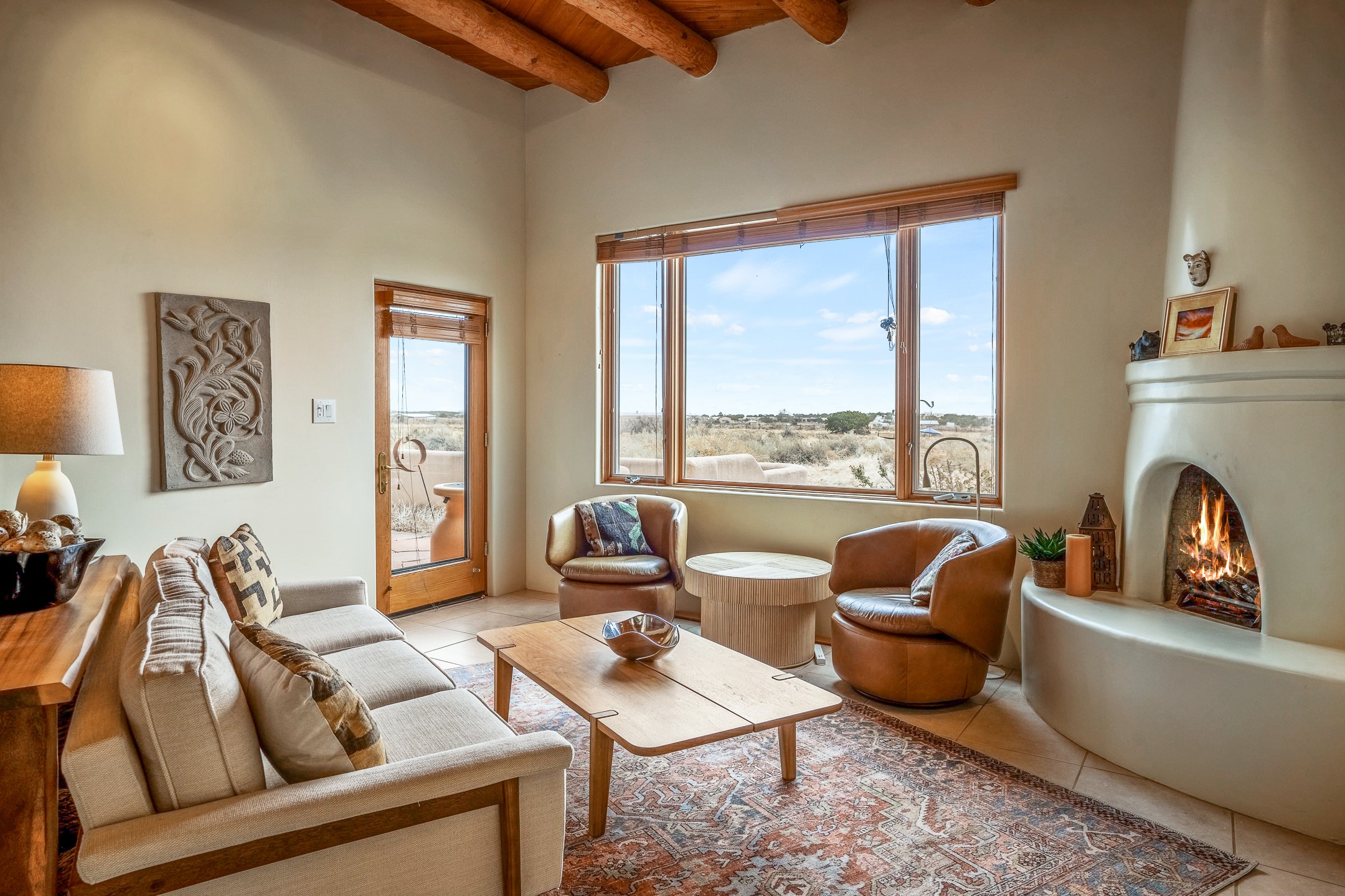 Experience the perfect blend of elegance, comfort, and breathtaking views in this stunning 4 bedroom, 2 bath home, set on a premier 6.85 acre lot in the sought after La Paz at Eldorado. Overlooking the Ortiz and Sandia mountains, this residence offers a peaceful retreat with unparalleled New Mexico sunrises and sunsets. Step inside to a light-filled living area featuring high ceilings, vigas, and a charming kiva fireplace. The well-appointed kitchen boasts stainless steel appliances, granite countertops, and an inviting dining area. The spacious primary suite is a private sanctuary, complete with its own kiva fireplace, a luxurious bath with a soaking tub and walk-in shower, a California closet system, and French doors leading to the serene rear courtyard. The three additional bedrooms provide versatility and ample space, with one currently serving as the Seller's inspiring art studio. Outdoor, a covered patio, pergola, and walled courtyard create an intimate setting for relaxation or entertaining, seamlessly extending your living space into the natural beauty of Northern New Mexico. This exceptional home offers the best of Santa Fe living. https://38-carissa-road.robyntyra.com
