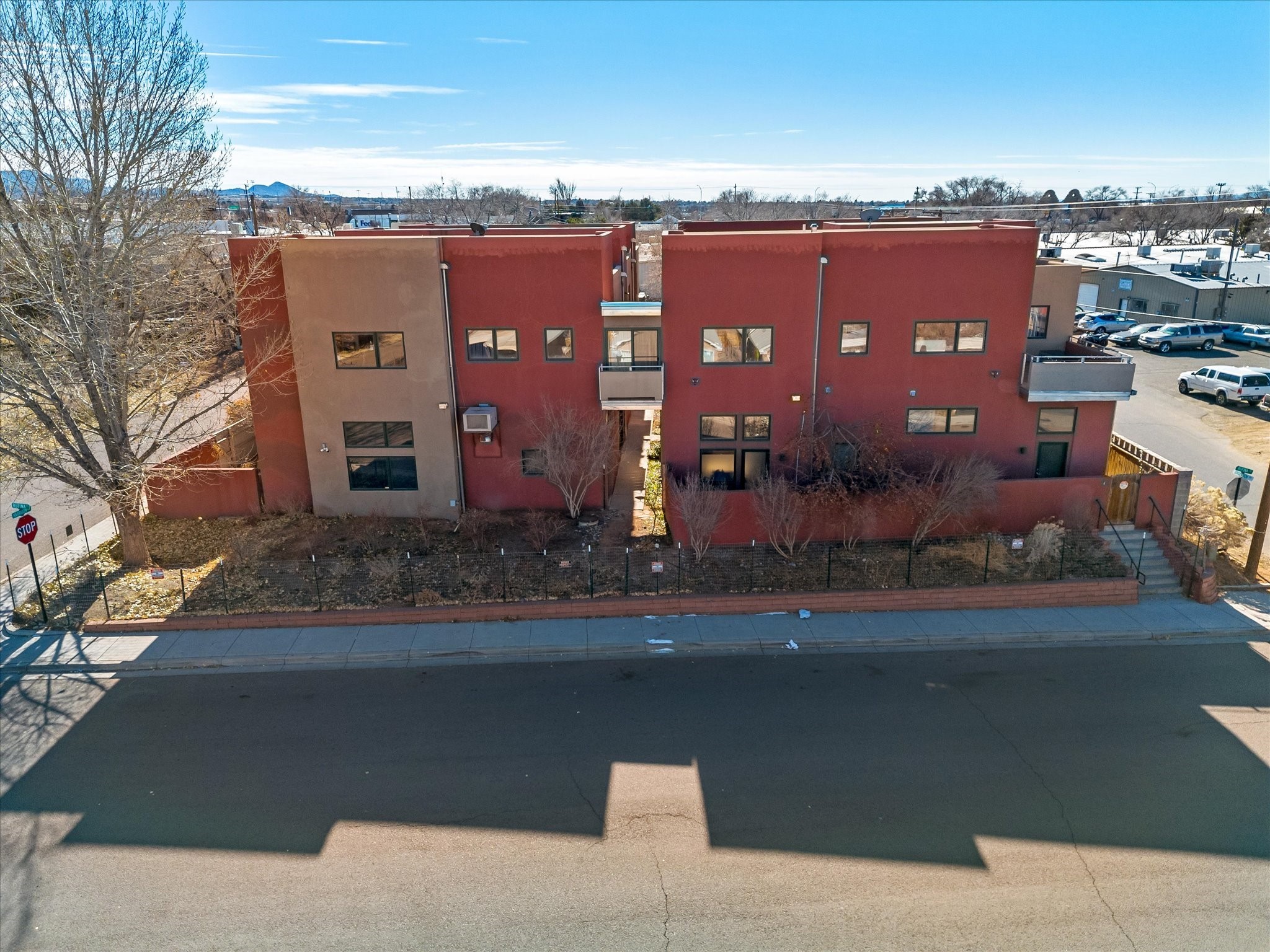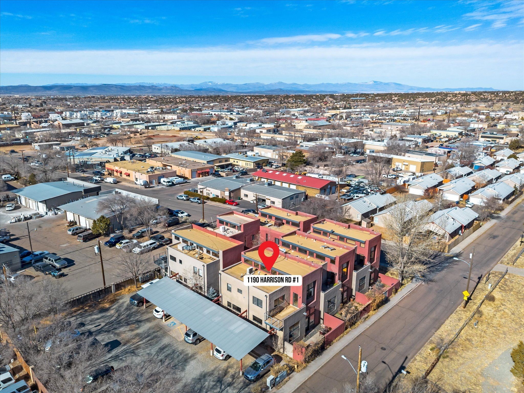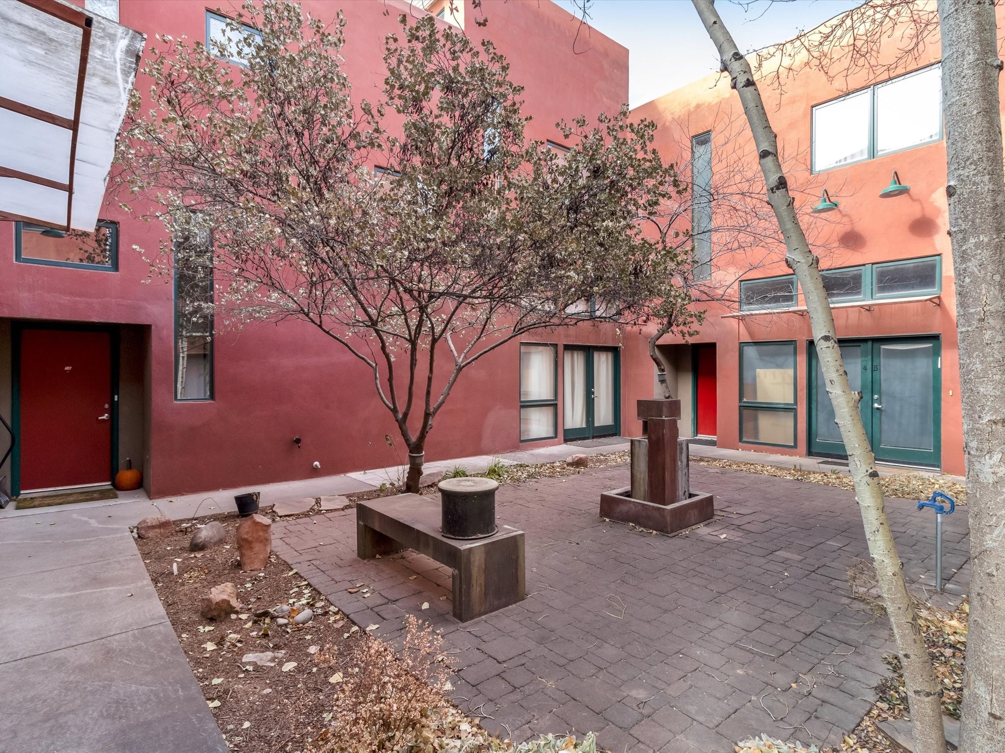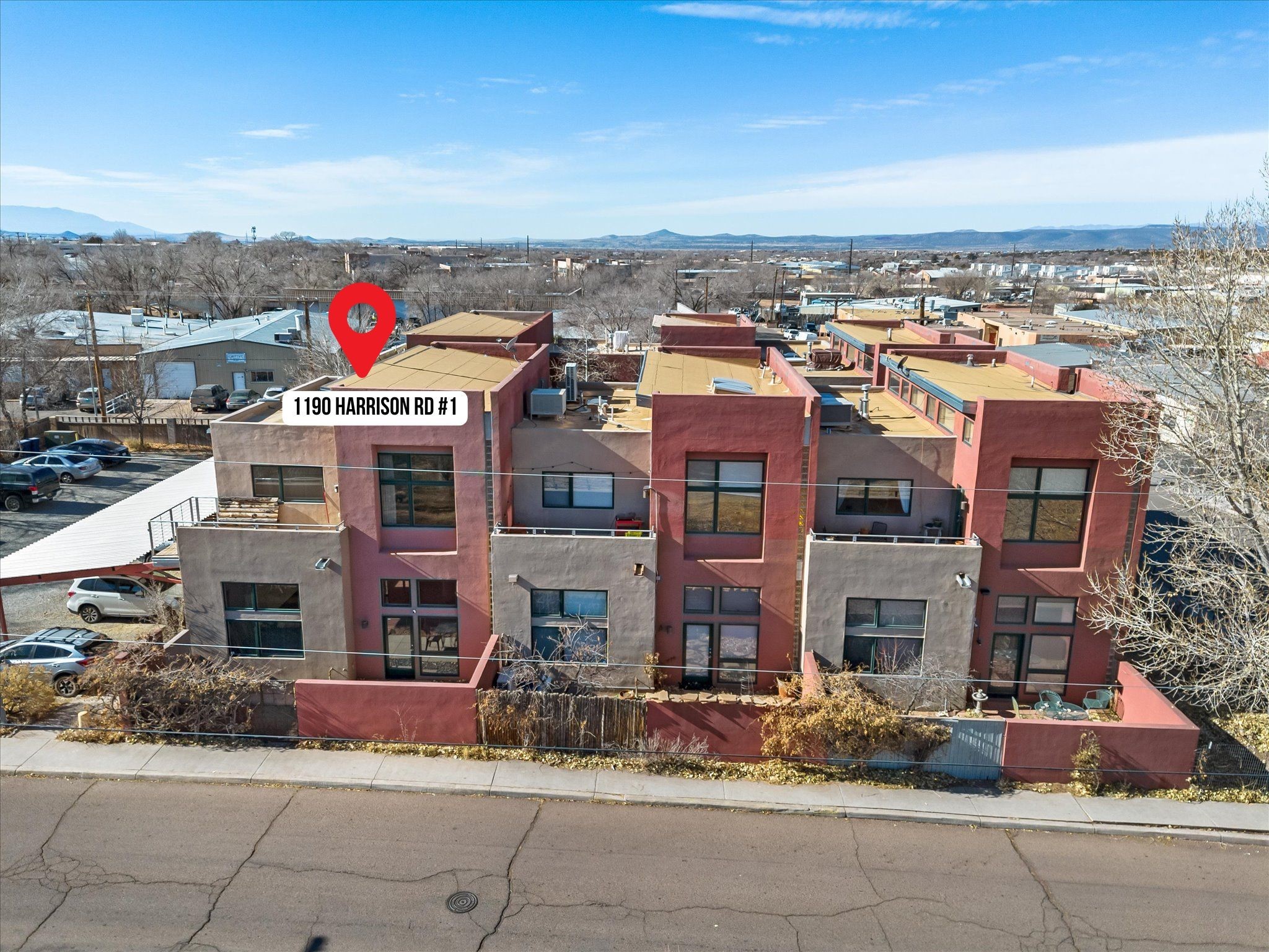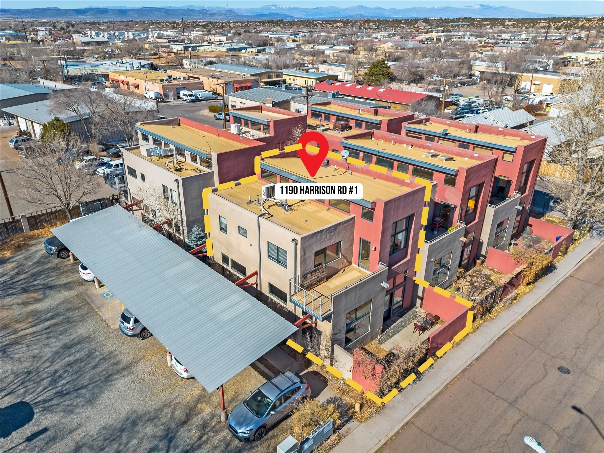 A perfect opportunity to take for this stunning, light-filled two-level studio condo in Santa Fe's vibrant Siler Rufina District, designed by award-winning architects Dent/Nordhaus. Zoned C-2 for live/work flexibility, this 2,241 sq. ft. space allows for residential, office, or commercial use, featuring separate public and private entrances to accommodate various lifestyle and business needs. The first level (1,092 sq. ft.) has a showroom-quality entrance, 12-foot ceilings, and access to a private, walled/gated yard, while the second level (1,149 sq. ft.) offers breathtaking Sangre de Cristo Mountain views, 12-16 foot vaulted ceilings, a full kitchen, Two bedrooms, a full bath + laundry, and a private deck. Part of Harrison Road Studios, a boutique community of six studio condos centered around a landscaped courtyard, this unit includes one reserved covered parking space, one reserved uncovered space, and ample guest parking. Whether you choose to live above and work below, use both levels as a residence, operate a full office or commercial space, or rent for investment income, this meticulously maintained condo is a rare find that won't last long--schedule your private showing today!