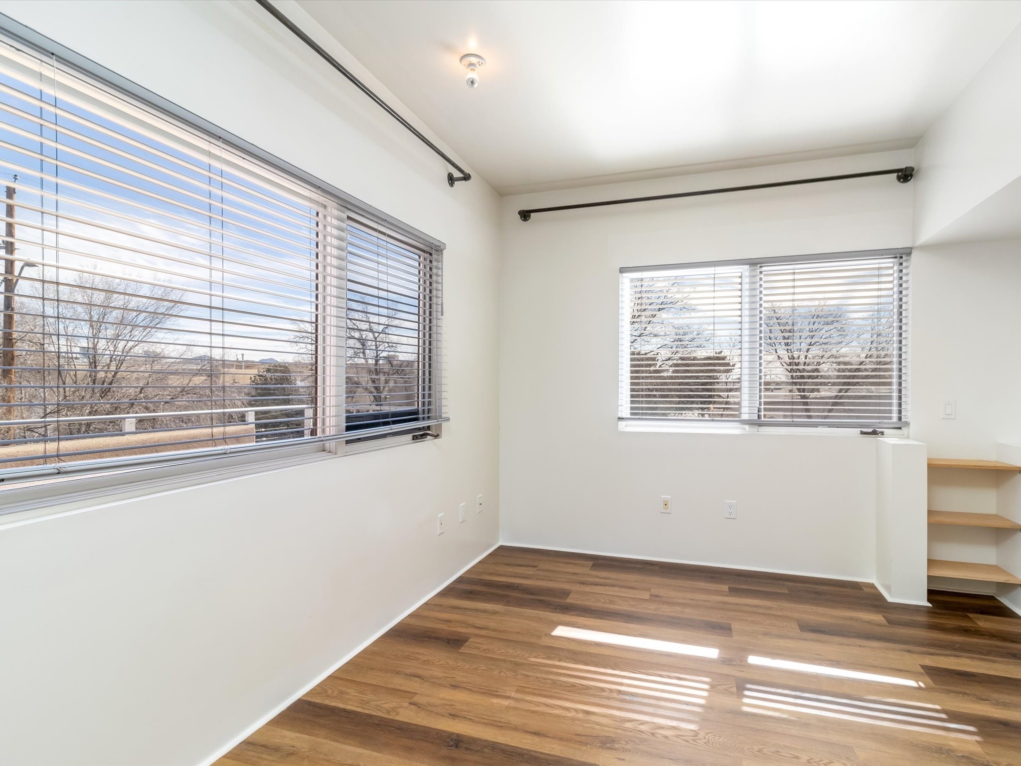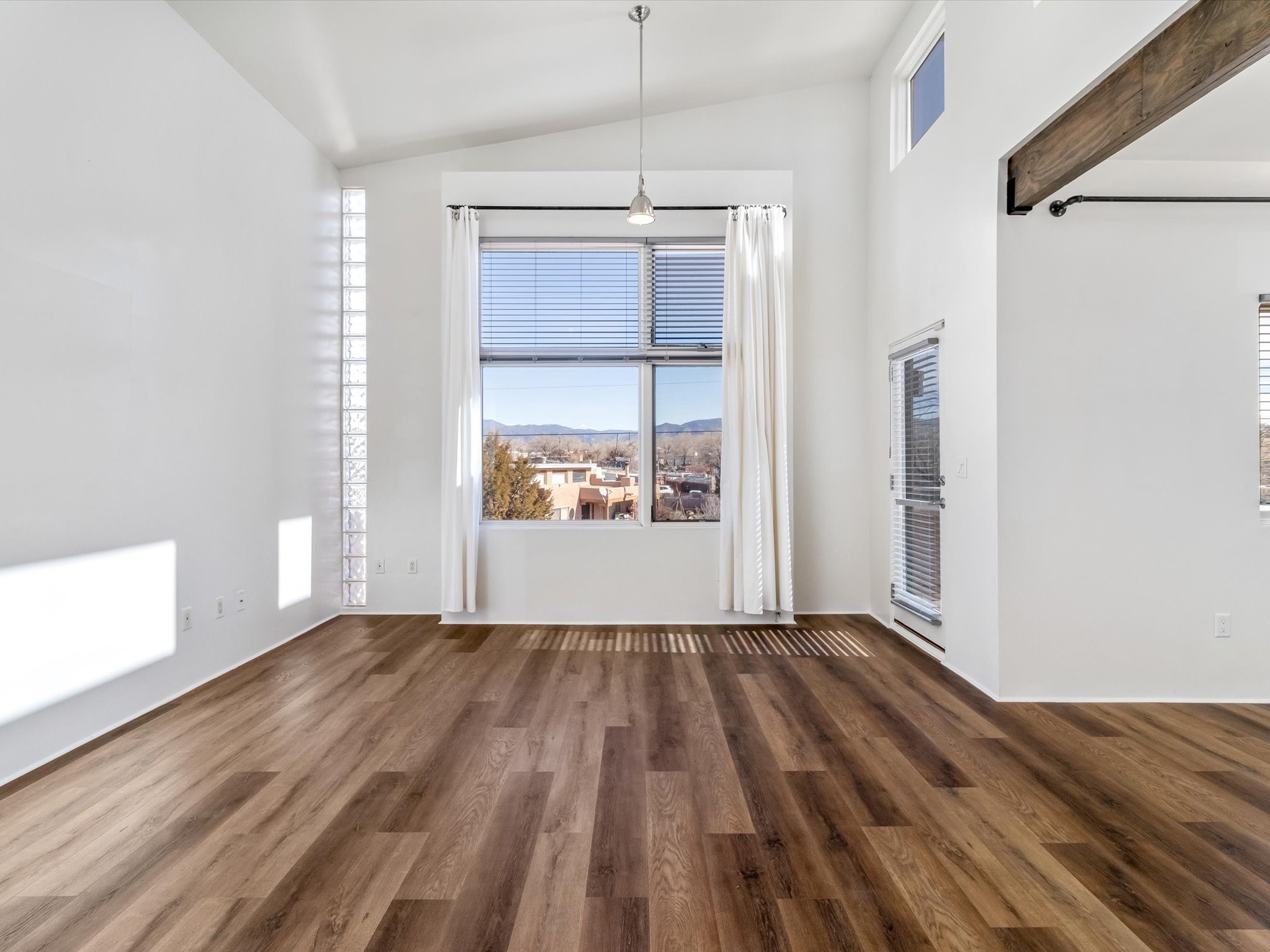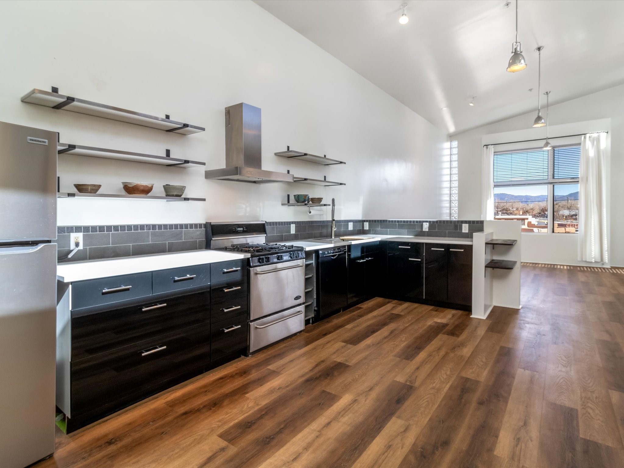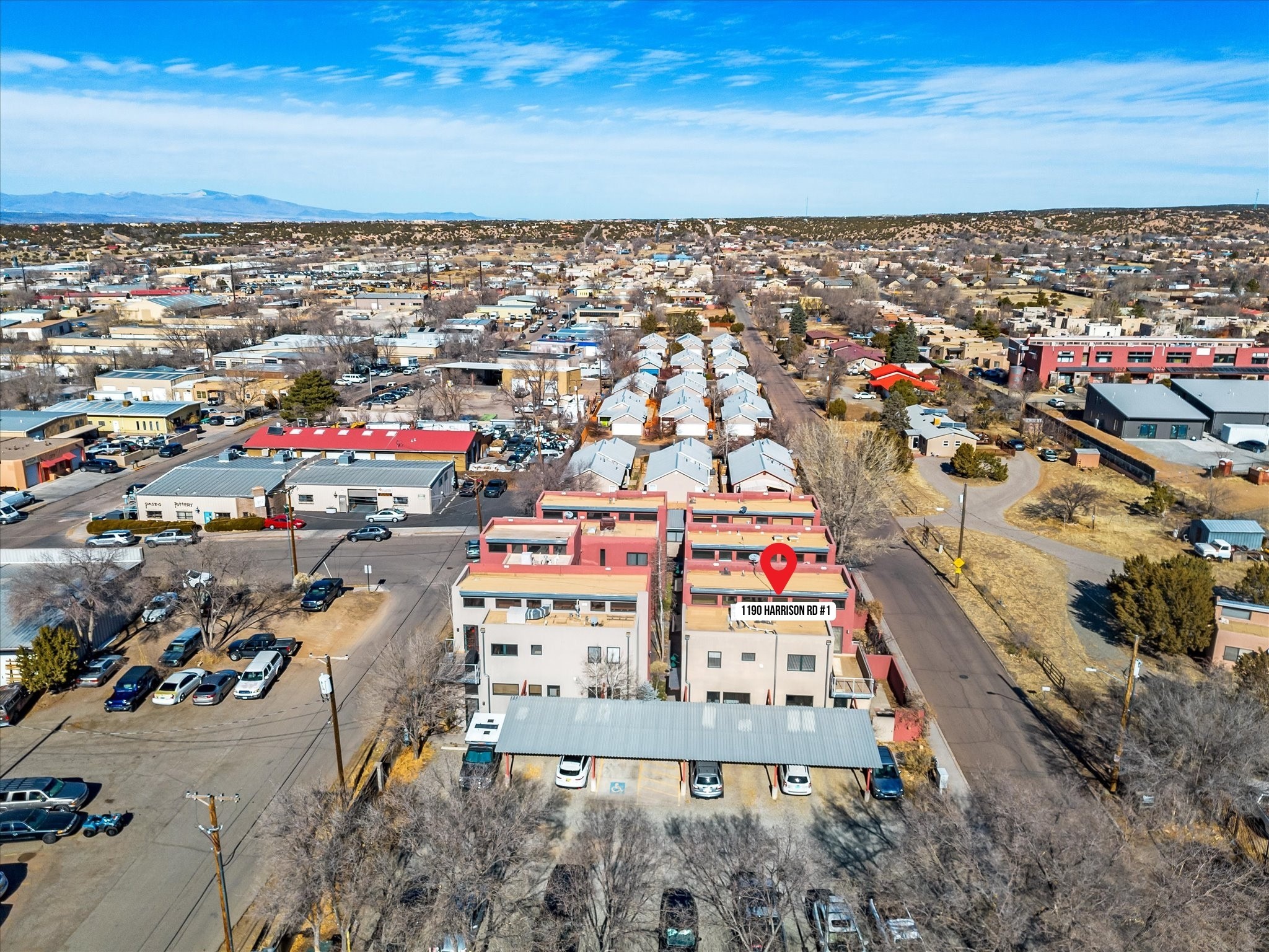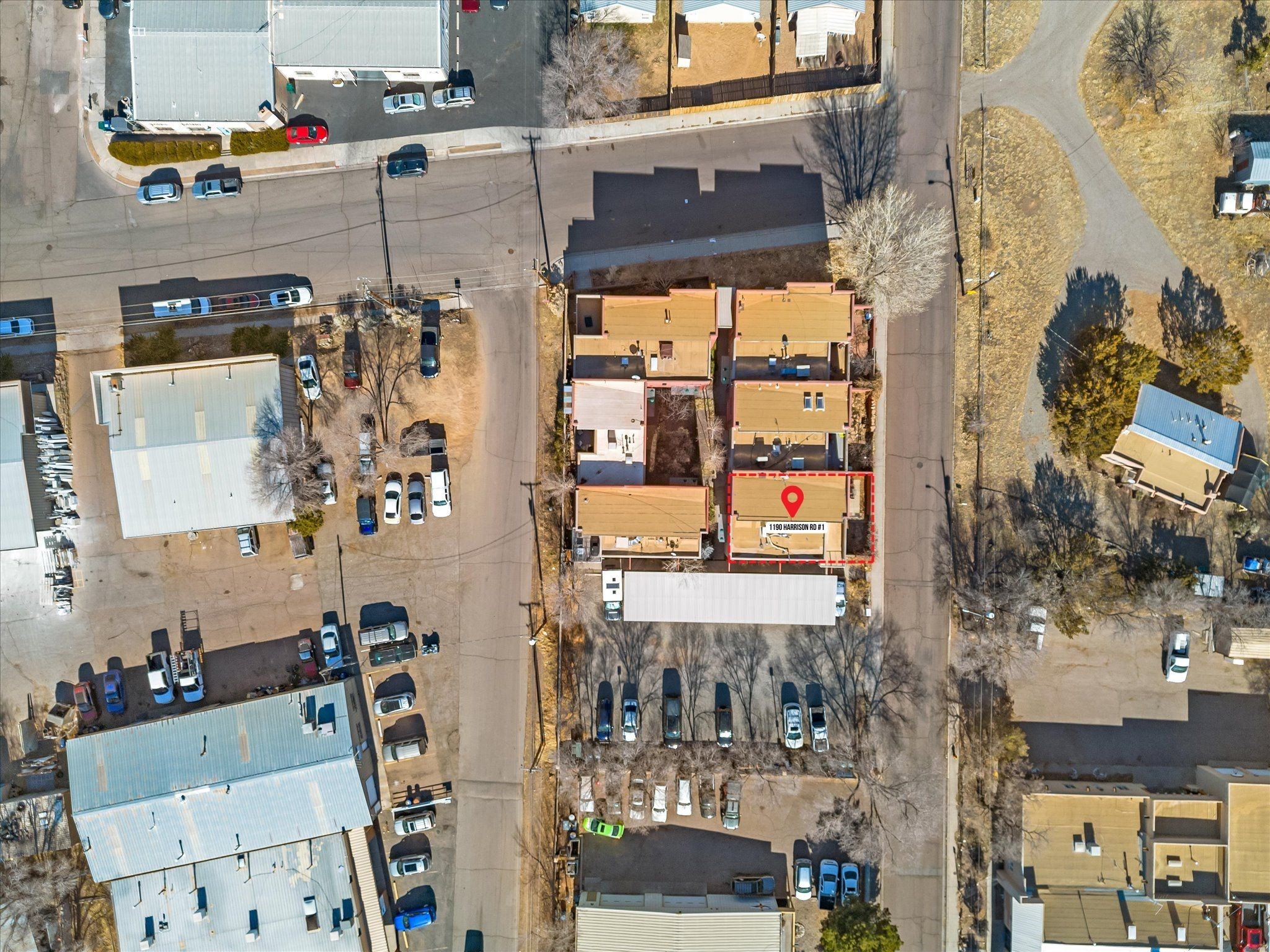 A perfect opportunity to take for this stunning, light-filled two-level studio condo in Santa Fe's vibrant Siler Rufina District, designed by award-winning architects Dent/Nordhaus. Zoned C-2 for live/work flexibility, this 2,241 sq. ft. space allows for residential, office, or commercial use, featuring separate public and private entrances to accommodate various lifestyle and business needs. The first level (1,092 sq. ft.) has a showroom-quality entrance, 12-foot ceilings, and access to a private, walled/gated yard, while the second level (1,149 sq. ft.) offers breathtaking Sangre de Cristo Mountain views, 12-16 foot vaulted ceilings, a full kitchen, Two bedrooms, a full bath + laundry, and a private deck. Part of Harrison Road Studios, a boutique community of six studio condos centered around a landscaped courtyard, this unit includes one reserved covered parking space, one reserved uncovered space, and ample guest parking. Whether you choose to live above and work below, use both levels as a residence, operate a full office or commercial space, or rent for investment income, this meticulously maintained condo is a rare find that won't last long--schedule your private showing today!