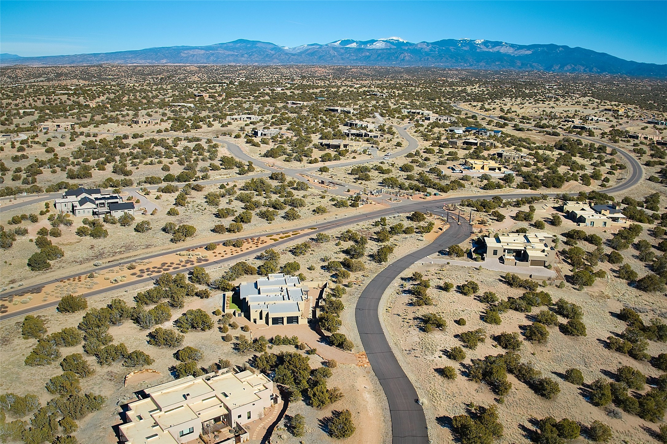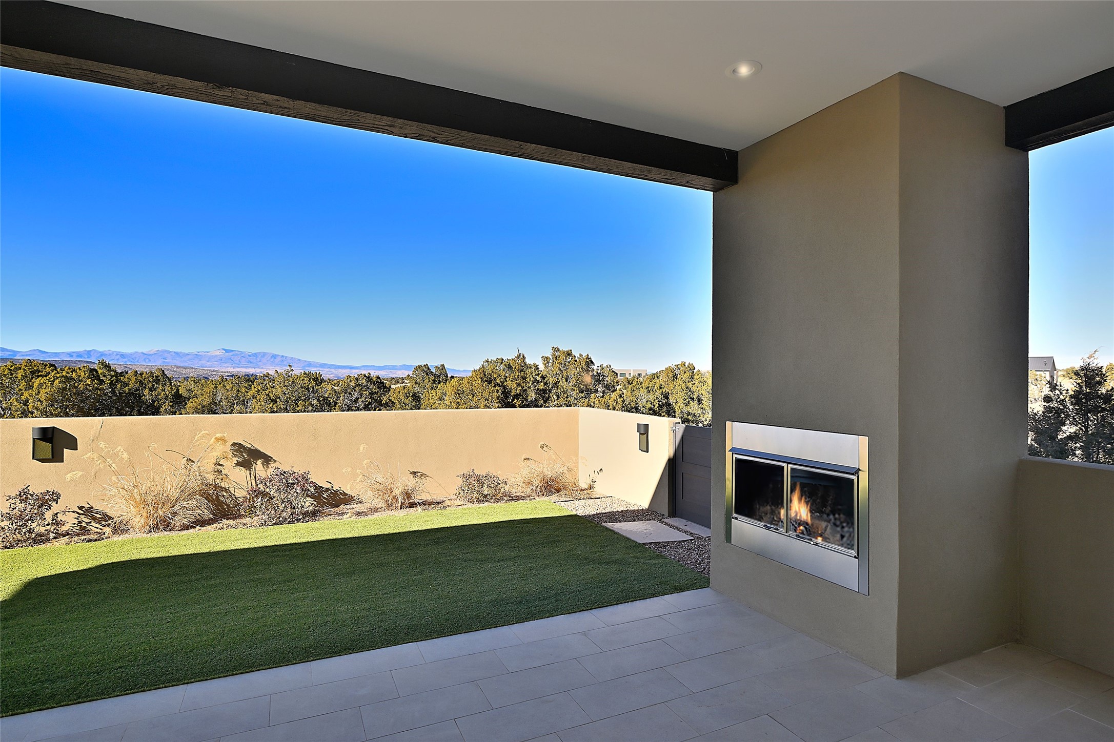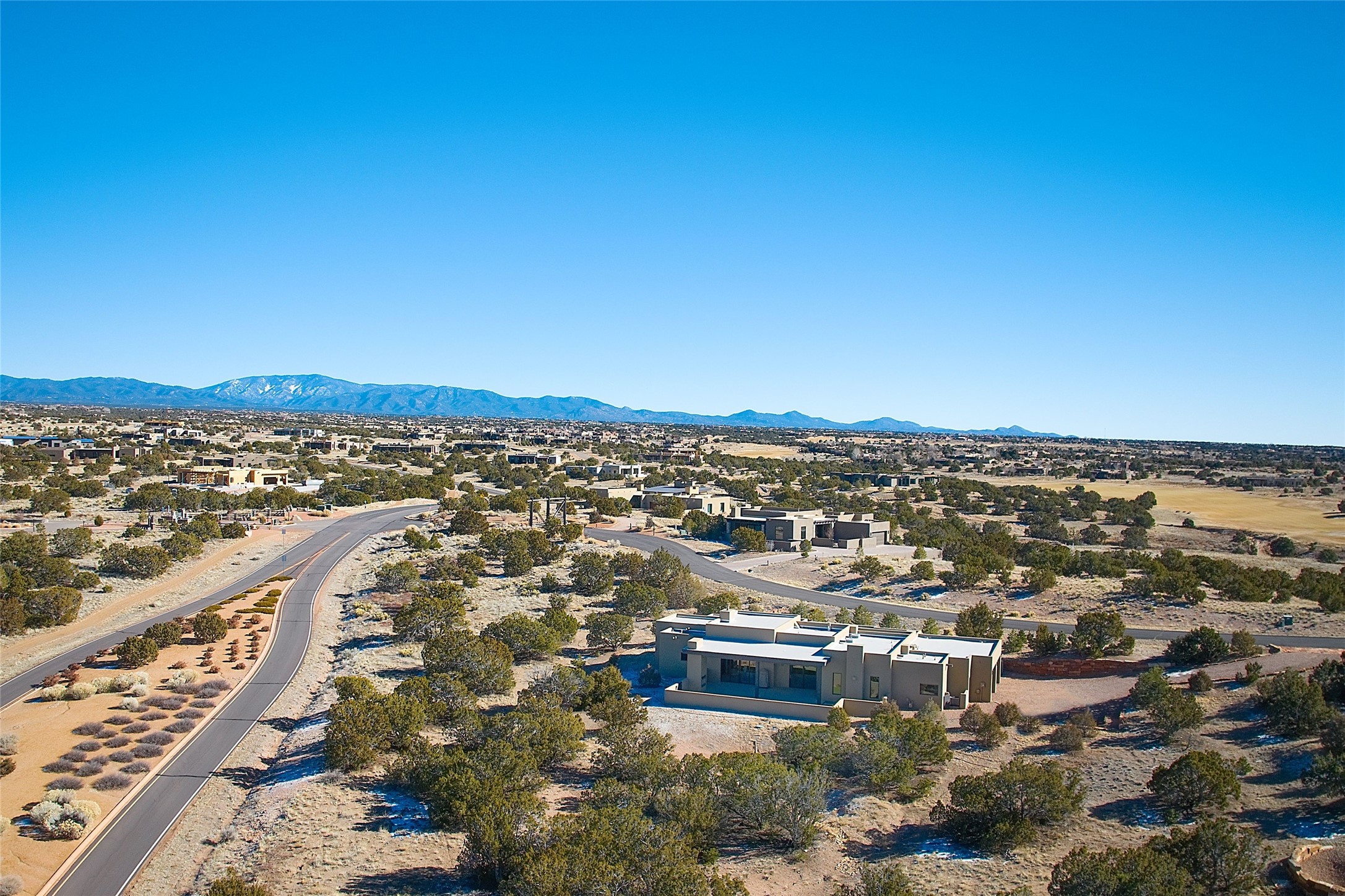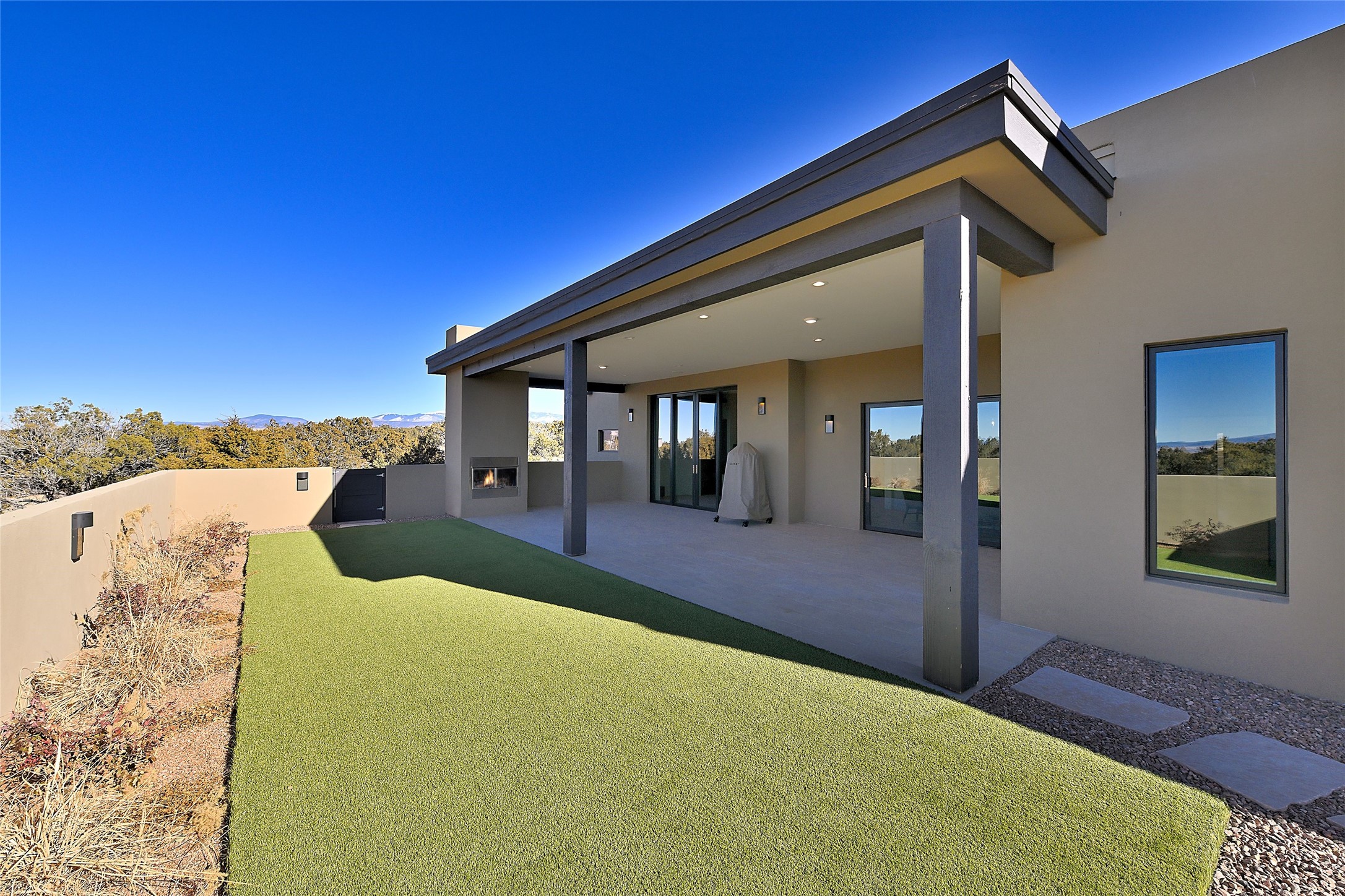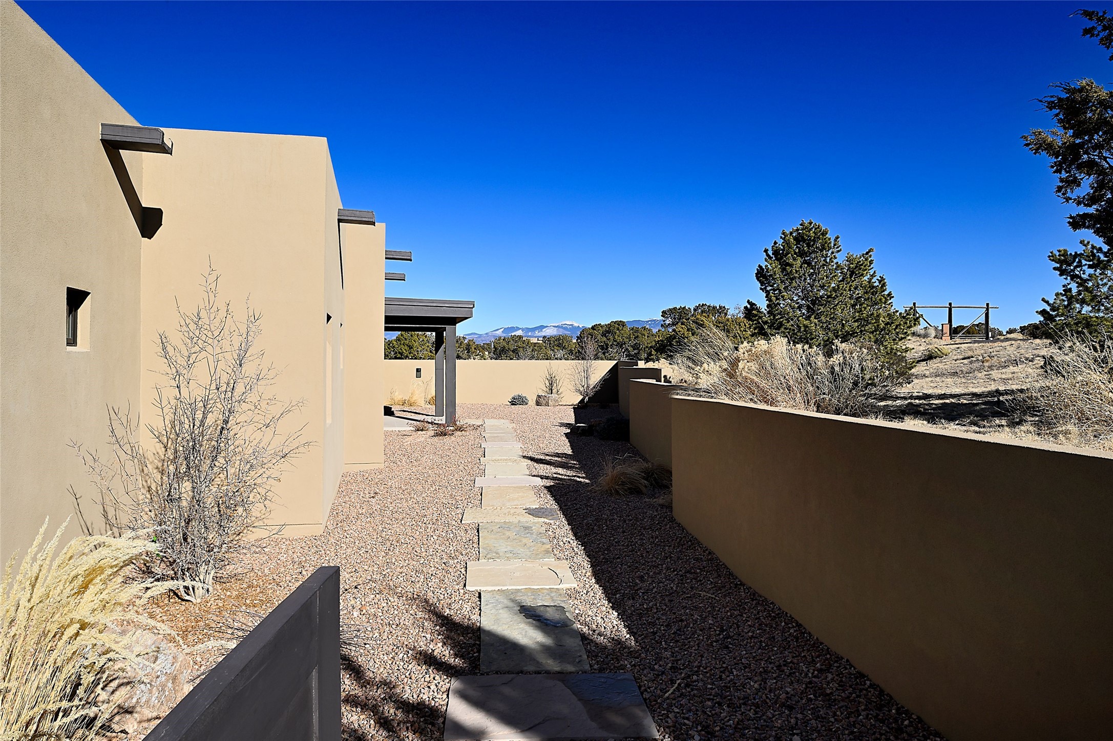 Exemplifying sleek, chic contemporary design in one of the most desirable locations in Santa Fe, this light-filled three-bedroom, 3,394-square-foot residence affords sweeping vistas from its ideal location in the western reaches of the exclusive Las Campanas community. Sophisticated living and entertaining are effortless indoors and out thanks to an easy open floor plan that encompasses a living room with a soaring beamed ceiling, a modern gas fireplace, handsome built-ins, and 10-foot glass doors; a dining area with sliding glass doors; an impeccably appointed chef's kitchen with quartz counters, handcrafted cabinets, and top-caliber appliances; and a Jemez-facing portal and courtyard-all linked in an effortless flow and basking in mountain and sunset views. Two generous guest bedrooms with spacious closets and en suite baths enjoy the seclusion of their own wing, while a quiet home office-which could easily serve as a fourth bedroom-is located down the hall and steps from a full bath. A serene, solitary oasis, the primary bedroom suite is tucked in a peaceful private spot and features a contemporary gas fireplace, a lavish bath with two vanities and both a soaking tub and a shower, and an impressively outfitted room-sized walk-in closet of nearly 200 square feet. Other welcome elements include a walk-in pantry or storage room; a bright, discreet laundry room; and a two-door, two-car garage with additional storage space. Some photos are virtually staged.