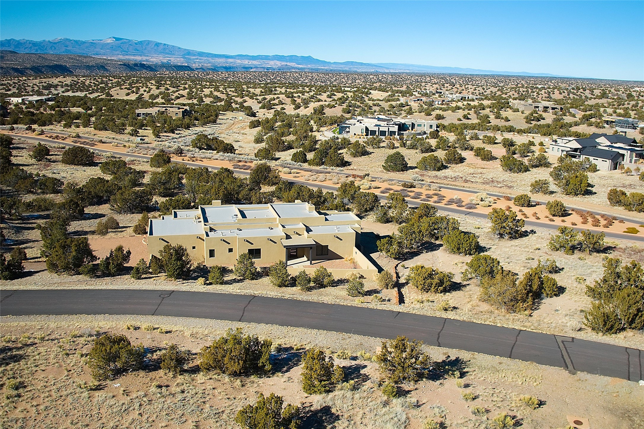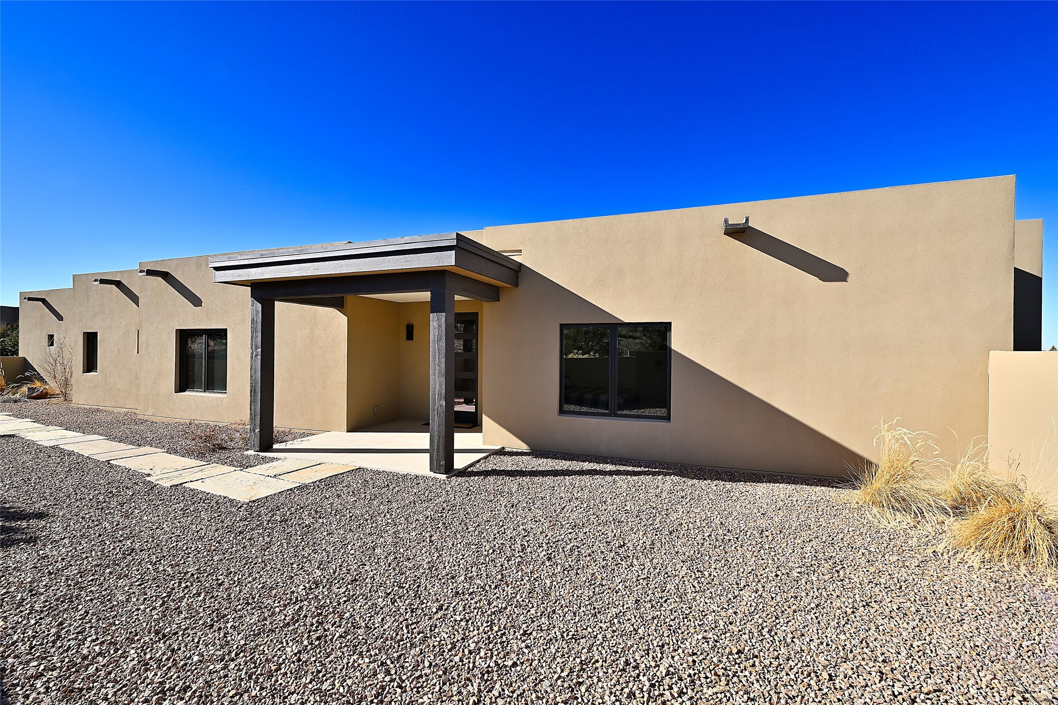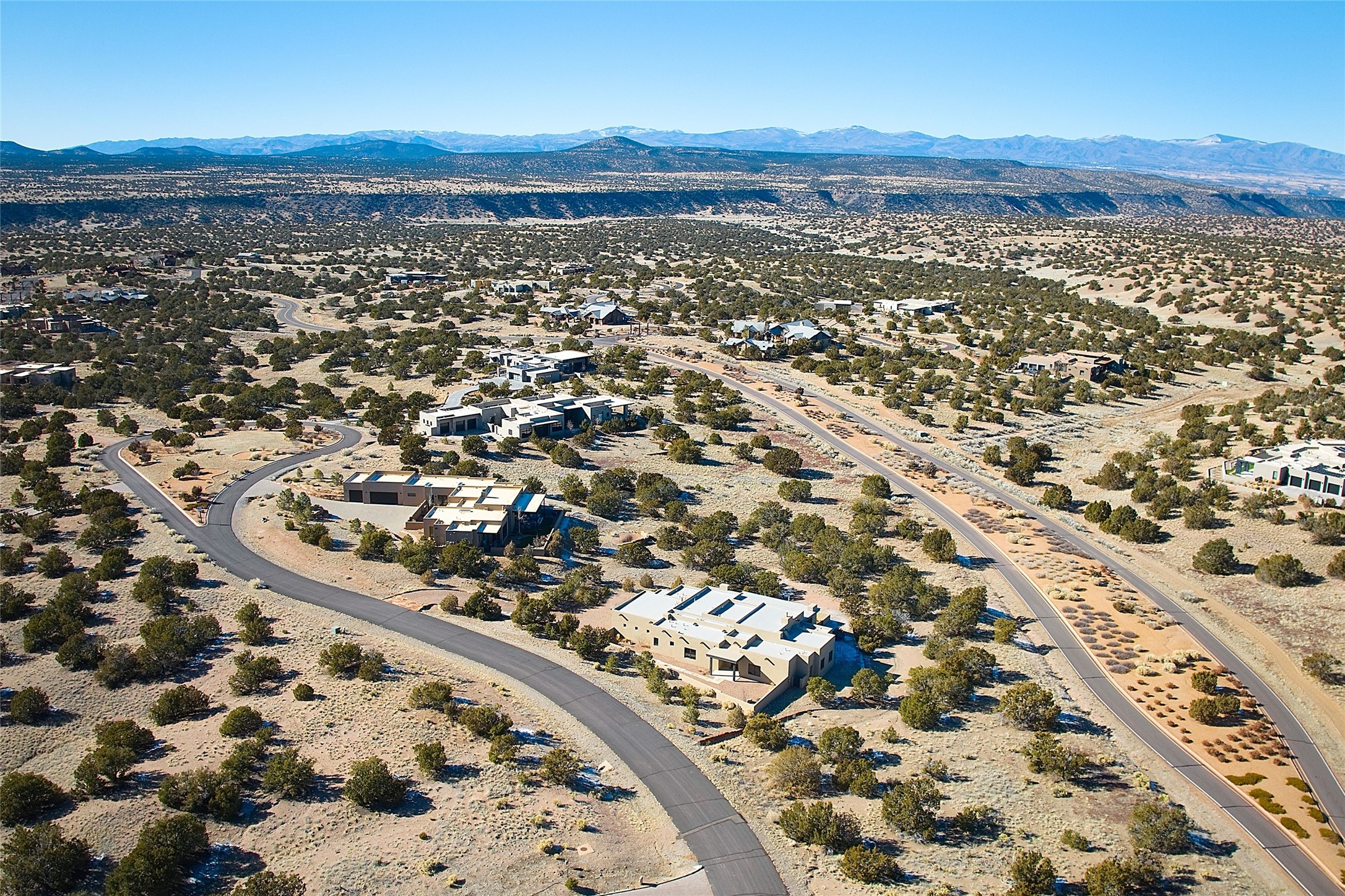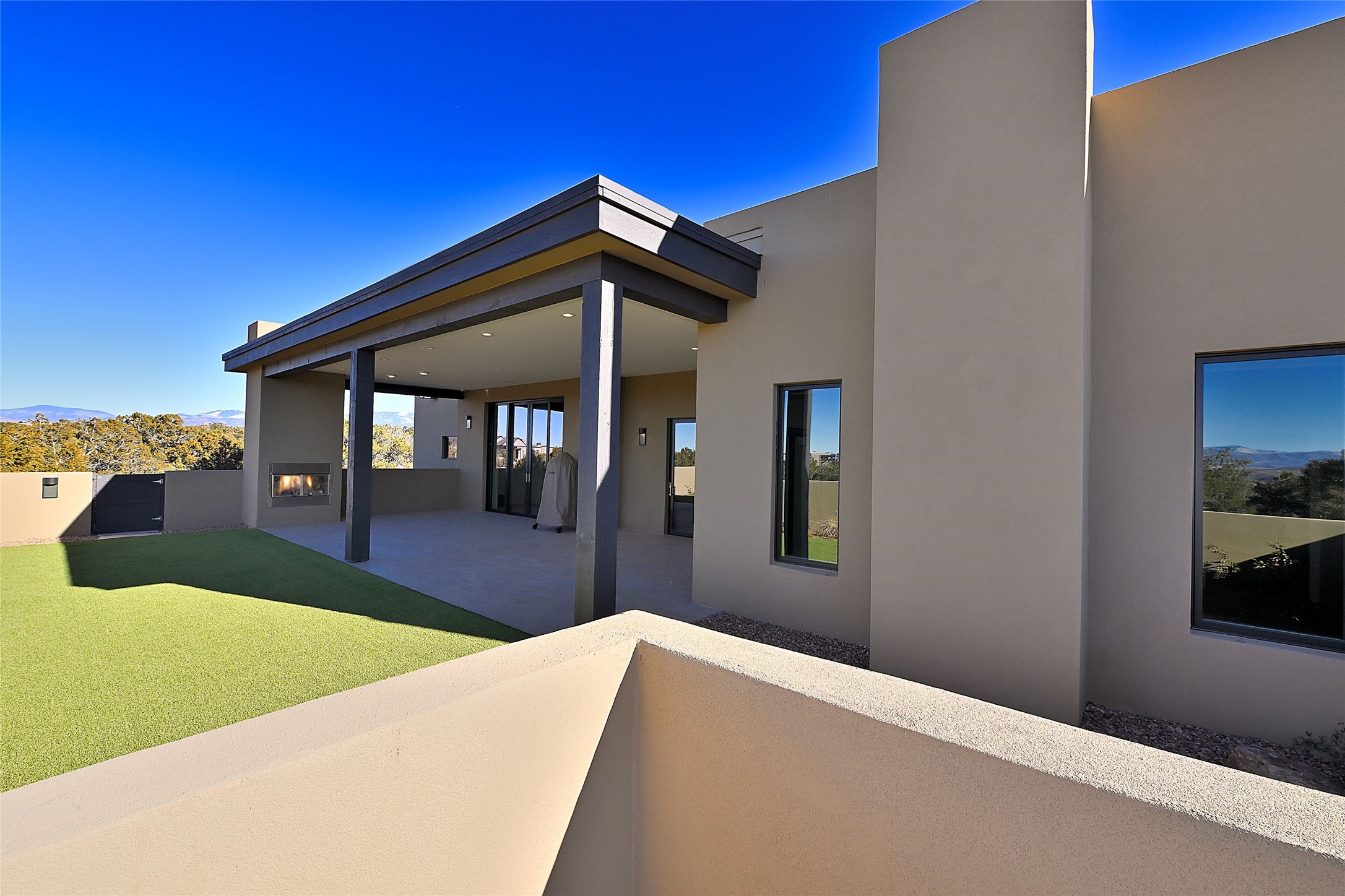 Exemplifying sleek, chic contemporary design in one of the most desirable locations in Santa Fe, this light-filled three-bedroom, 3,394-square-foot residence affords sweeping vistas from its ideal location in the western reaches of the exclusive Las Campanas community. Sophisticated living and entertaining are effortless indoors and out thanks to an easy open floor plan that encompasses a living room with a soaring beamed ceiling, a modern gas fireplace, handsome built-ins, and 10-foot glass doors; a dining area with sliding glass doors; an impeccably appointed chef's kitchen with quartz counters, handcrafted cabinets, and top-caliber appliances; and a Jemez-facing portal and courtyard-all linked in an effortless flow and basking in mountain and sunset views. Two generous guest bedrooms with spacious closets and en suite baths enjoy the seclusion of their own wing, while a quiet home office-which could easily serve as a fourth bedroom-is located down the hall and steps from a full bath. A serene, solitary oasis, the primary bedroom suite is tucked in a peaceful private spot and features a contemporary gas fireplace, a lavish bath with two vanities and both a soaking tub and a shower, and an impressively outfitted room-sized walk-in closet of nearly 200 square feet. Other welcome elements include a walk-in pantry or storage room; a bright, discreet laundry room; and a two-door, two-car garage with additional storage space. Some photos are virtually staged.