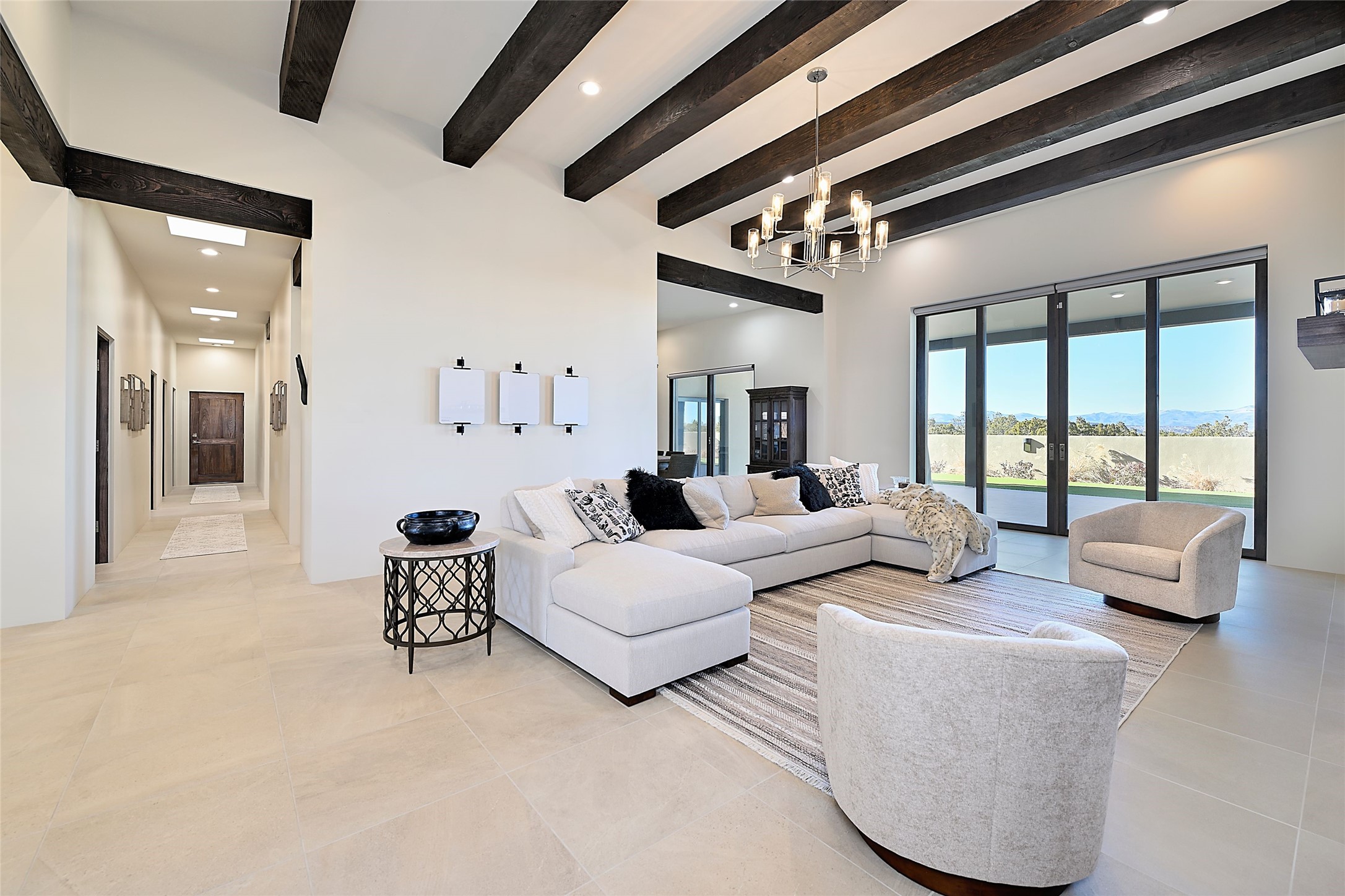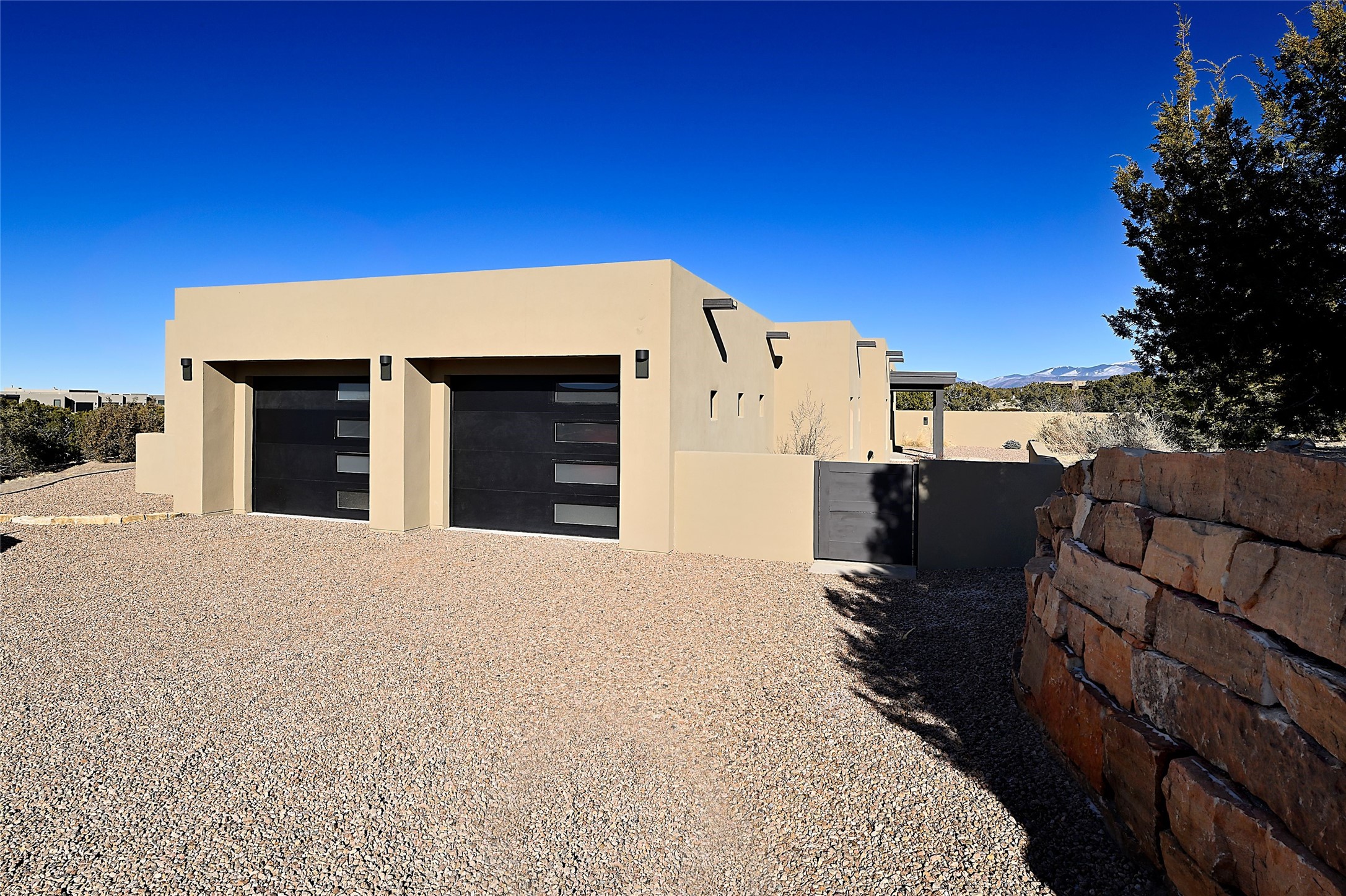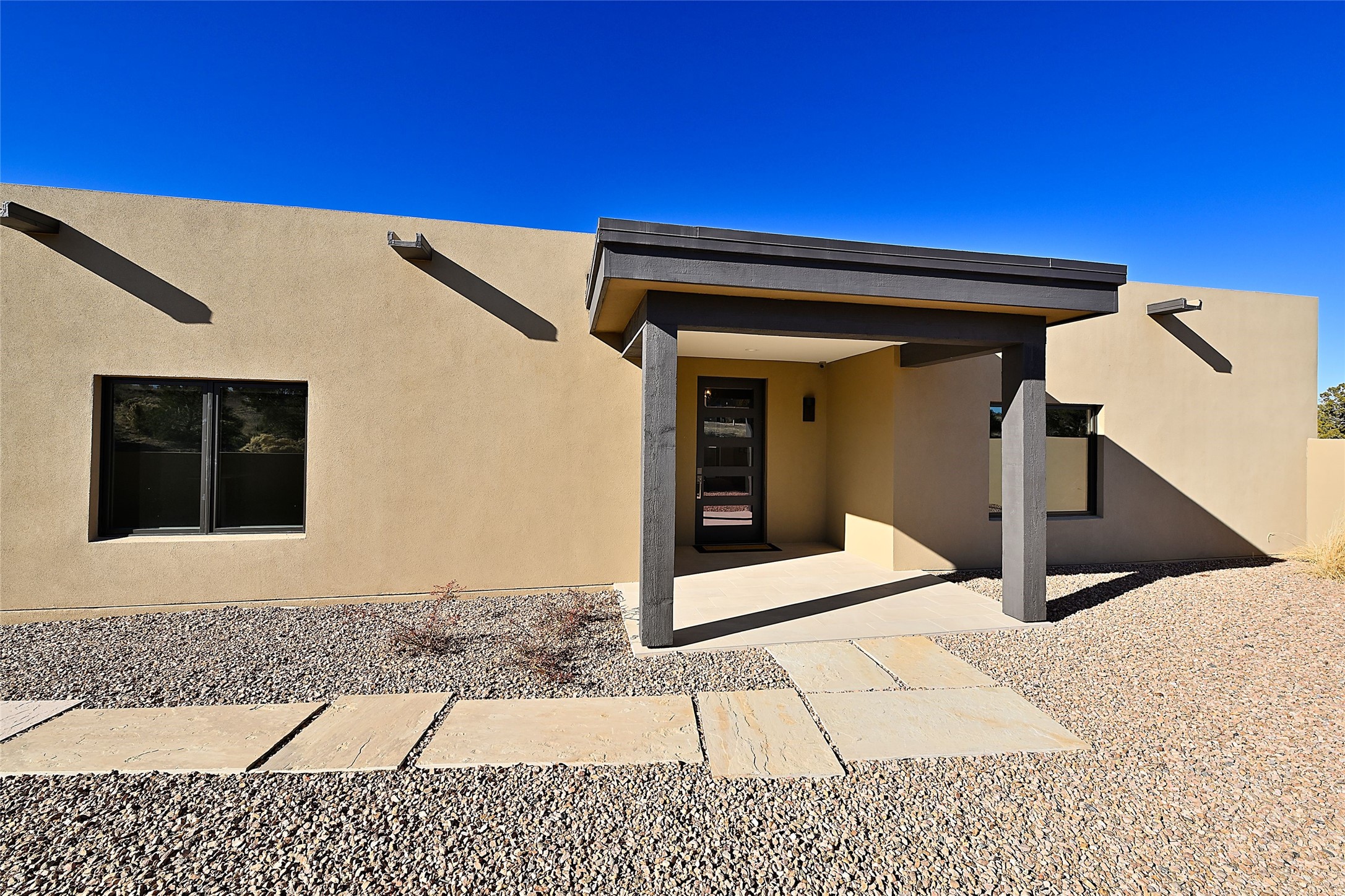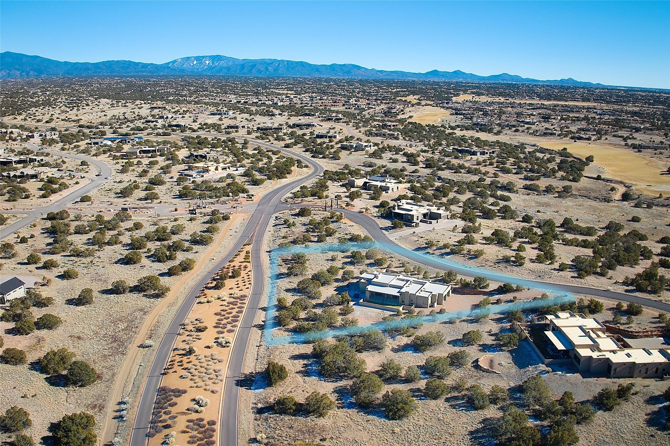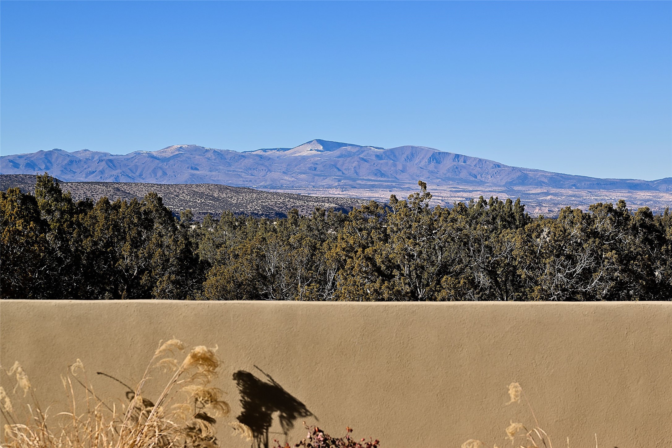 Exemplifying sleek, chic contemporary design in one of the most desirable locations in Santa Fe, this light-filled three-bedroom, 3,394-square-foot residence affords sweeping vistas from its ideal location in the western reaches of the exclusive Las Campanas community. Sophisticated living and entertaining are effortless indoors and out thanks to an easy open floor plan that encompasses a living room with a soaring beamed ceiling, a modern gas fireplace, handsome built-ins, and 10-foot glass doors; a dining area with sliding glass doors; an impeccably appointed chef's kitchen with quartz counters, handcrafted cabinets, and top-caliber appliances; and a Jemez-facing portal and courtyard-all linked in an effortless flow and basking in mountain and sunset views. Two generous guest bedrooms with spacious closets and en suite baths enjoy the seclusion of their own wing, while a quiet home office-which could easily serve as a fourth bedroom-is located down the hall and steps from a full bath. A serene, solitary oasis, the primary bedroom suite is tucked in a peaceful private spot and features a contemporary gas fireplace, a lavish bath with two vanities and both a soaking tub and a shower, and an impressively outfitted room-sized walk-in closet of nearly 200 square feet. Other welcome elements include a walk-in pantry or storage room; a bright, discreet laundry room; and a two-door, two-car garage with additional storage space. Some photos are virtually staged.