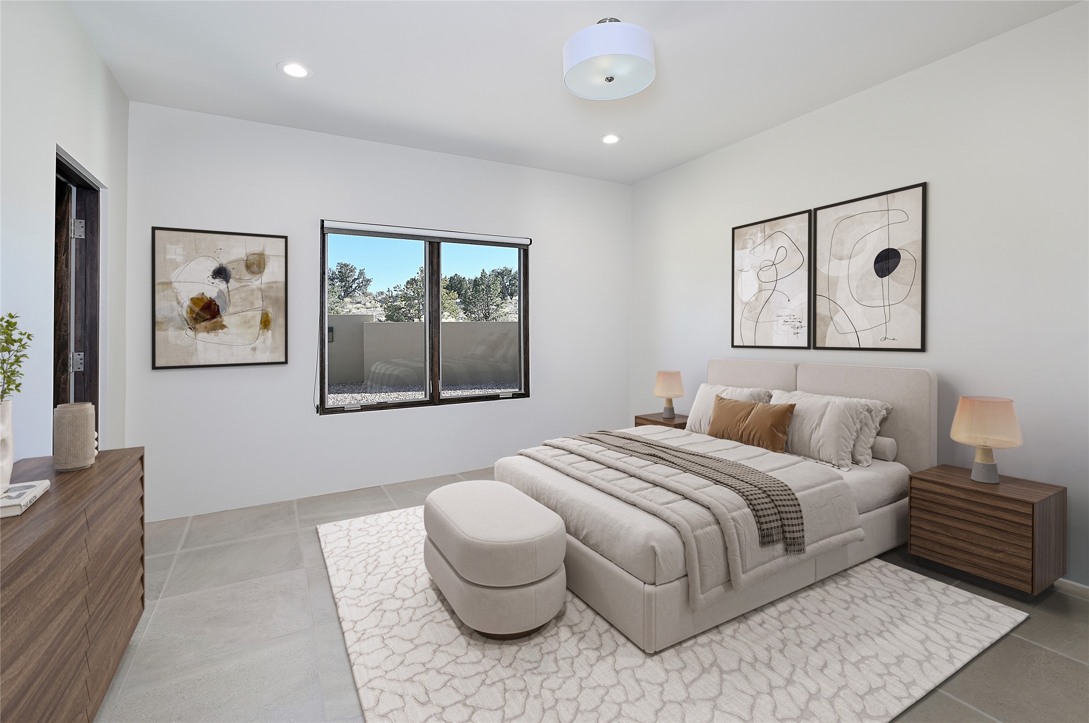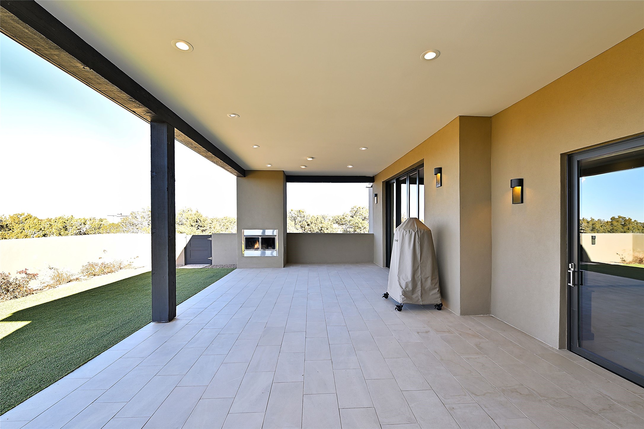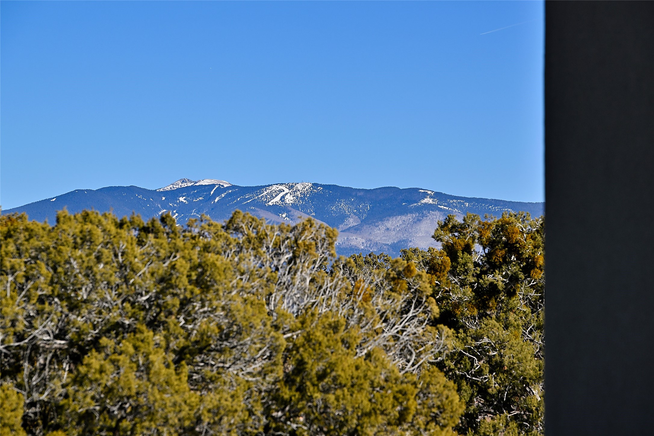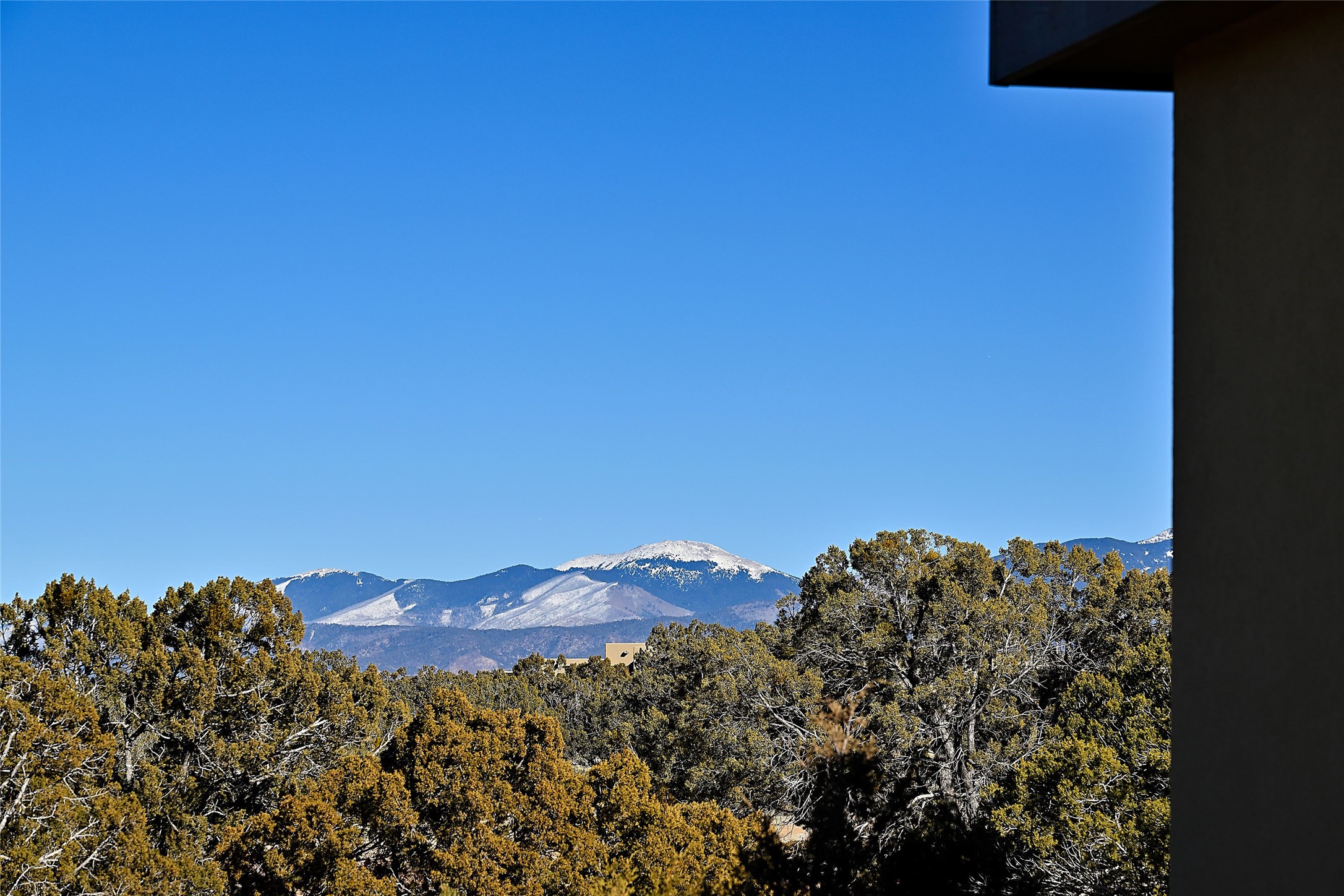 Exemplifying sleek, chic contemporary design in one of the most desirable locations in Santa Fe, this light-filled three-bedroom, 3,394-square-foot residence affords sweeping vistas from its ideal location in the western reaches of the exclusive Las Campanas community. Sophisticated living and entertaining are effortless indoors and out thanks to an easy open floor plan that encompasses a living room with a soaring beamed ceiling, a modern gas fireplace, handsome built-ins, and 10-foot glass doors; a dining area with sliding glass doors; an impeccably appointed chef's kitchen with quartz counters, handcrafted cabinets, and top-caliber appliances; and a Jemez-facing portal and courtyard-all linked in an effortless flow and basking in mountain and sunset views. Two generous guest bedrooms with spacious closets and en suite baths enjoy the seclusion of their own wing, while a quiet home office-which could easily serve as a fourth bedroom-is located down the hall and steps from a full bath. A serene, solitary oasis, the primary bedroom suite is tucked in a peaceful private spot and features a contemporary gas fireplace, a lavish bath with two vanities and both a soaking tub and a shower, and an impressively outfitted room-sized walk-in closet of nearly 200 square feet. Other welcome elements include a walk-in pantry or storage room; a bright, discreet laundry room; and a two-door, two-car garage with additional storage space. Some photos are virtually staged.