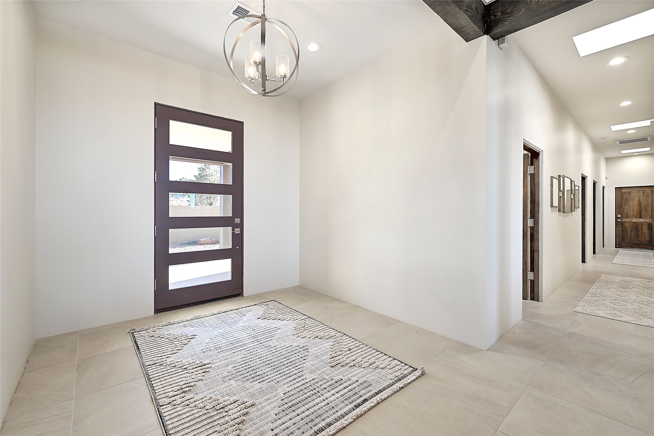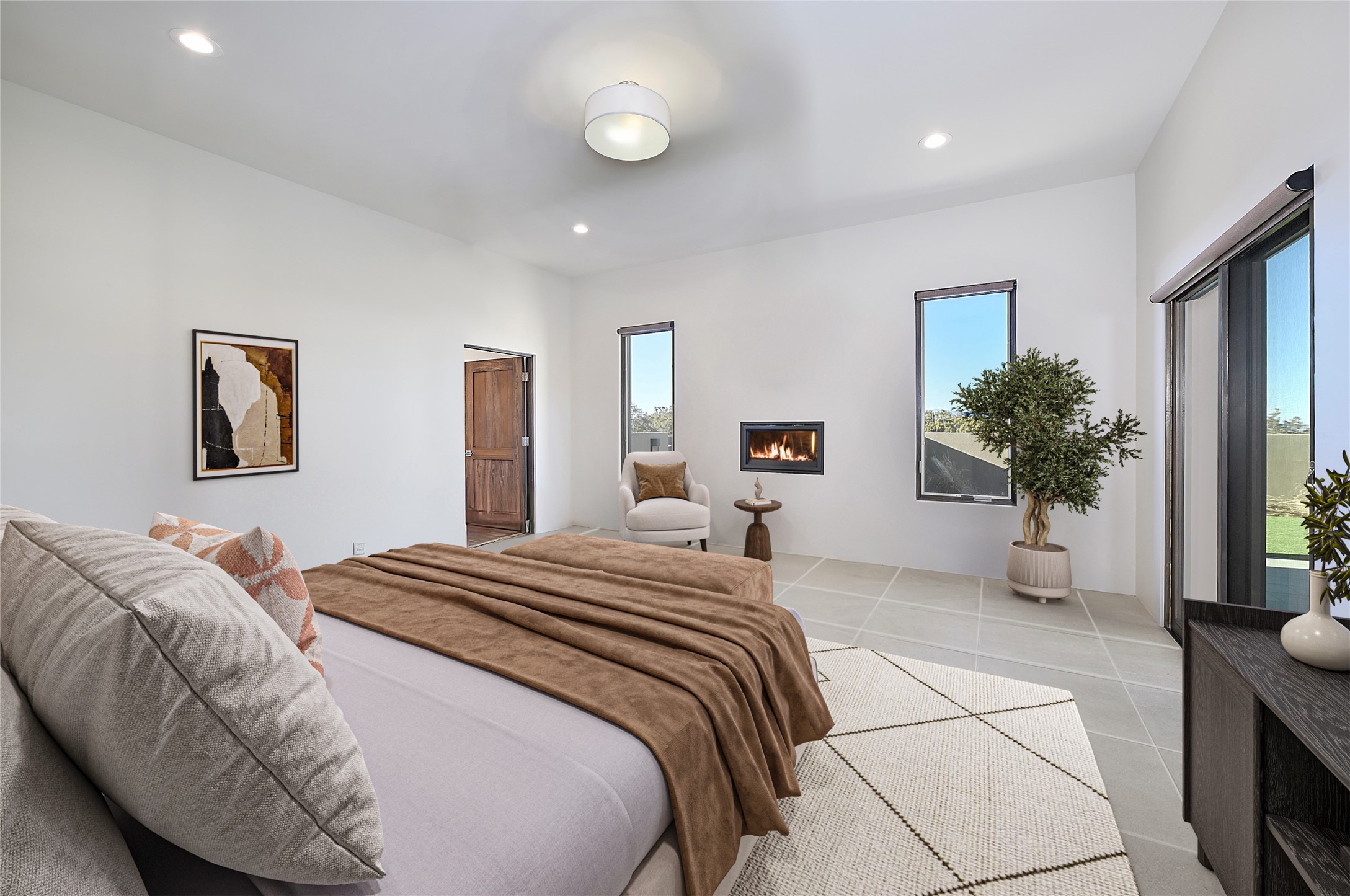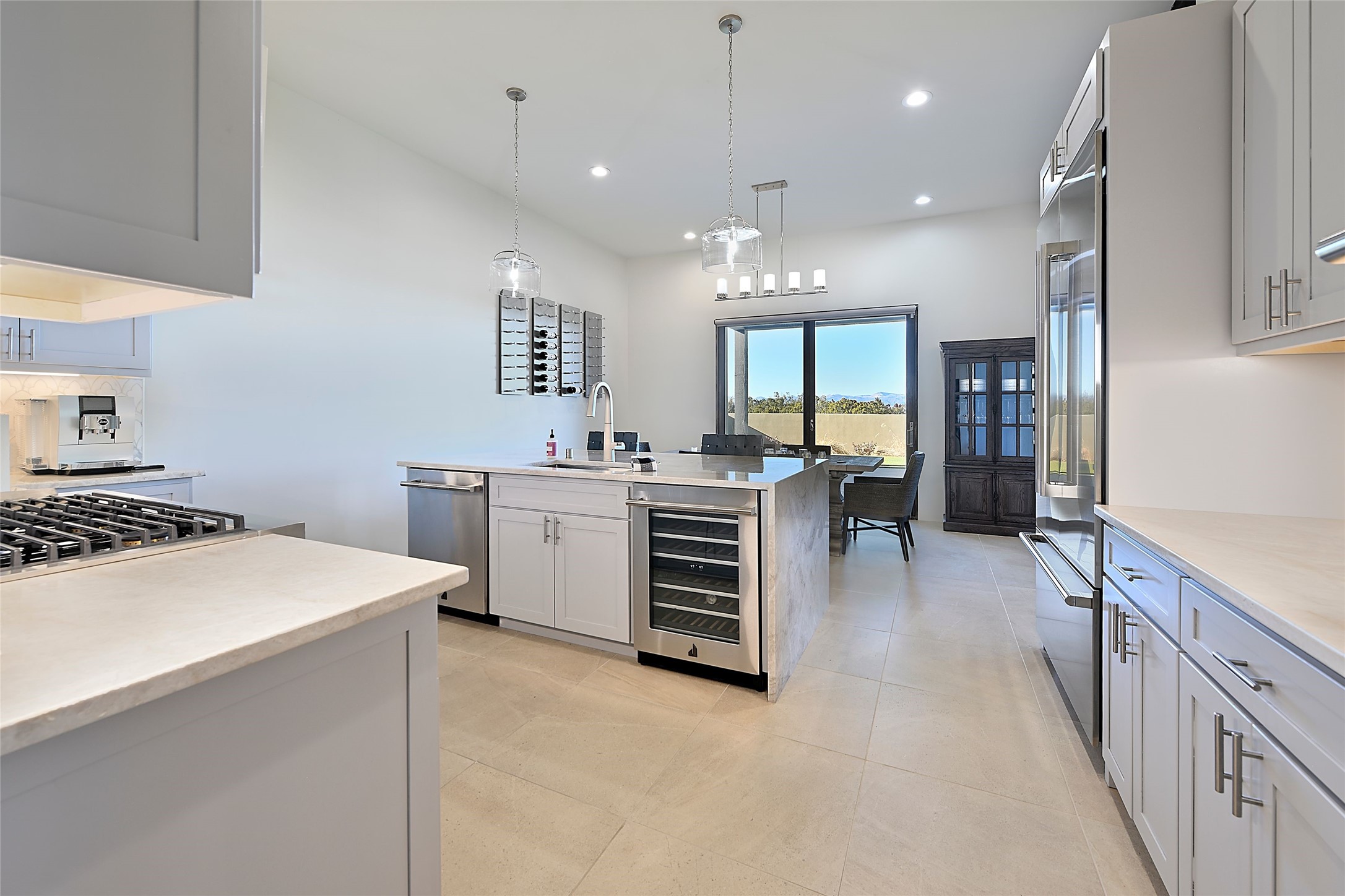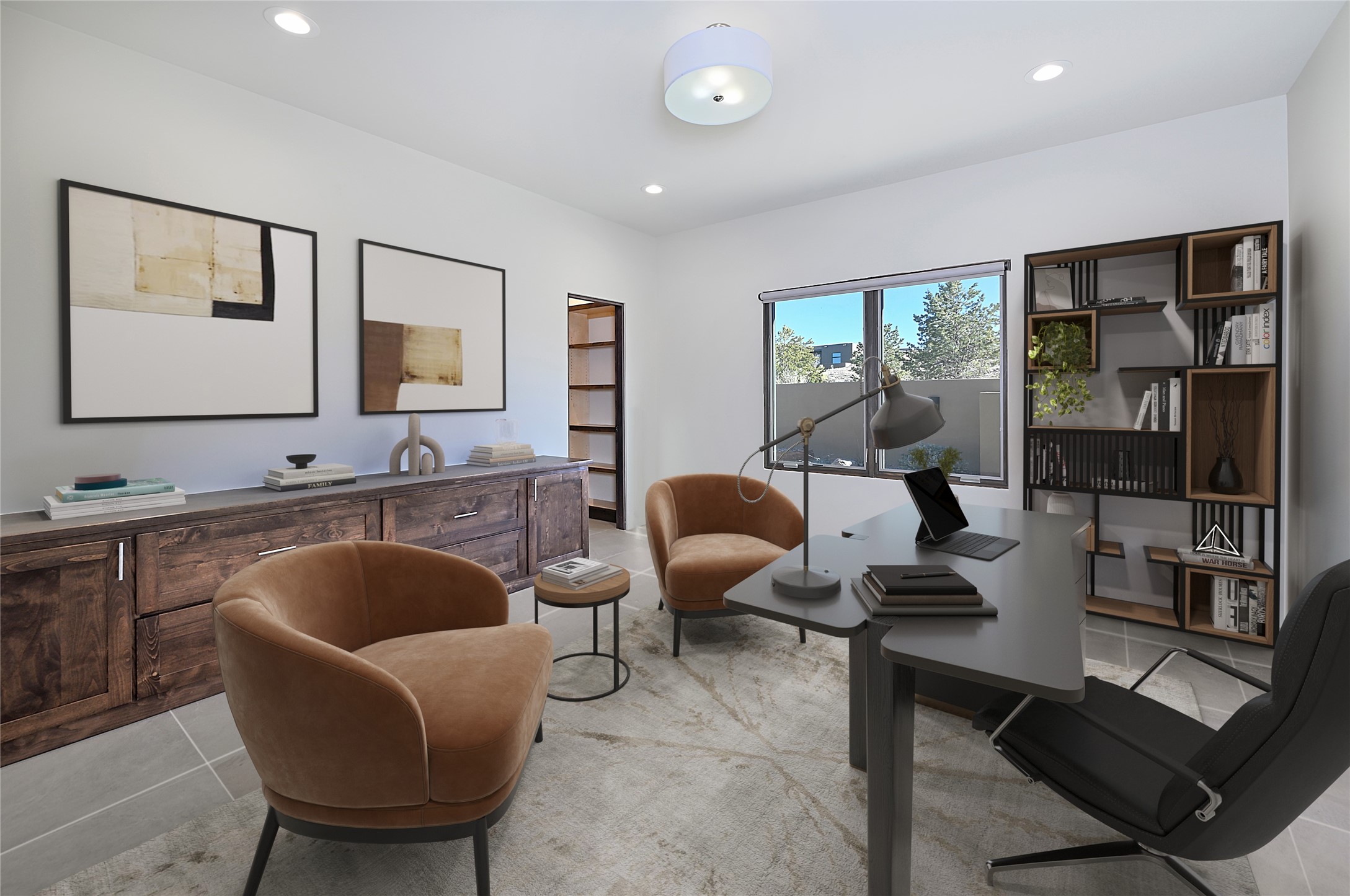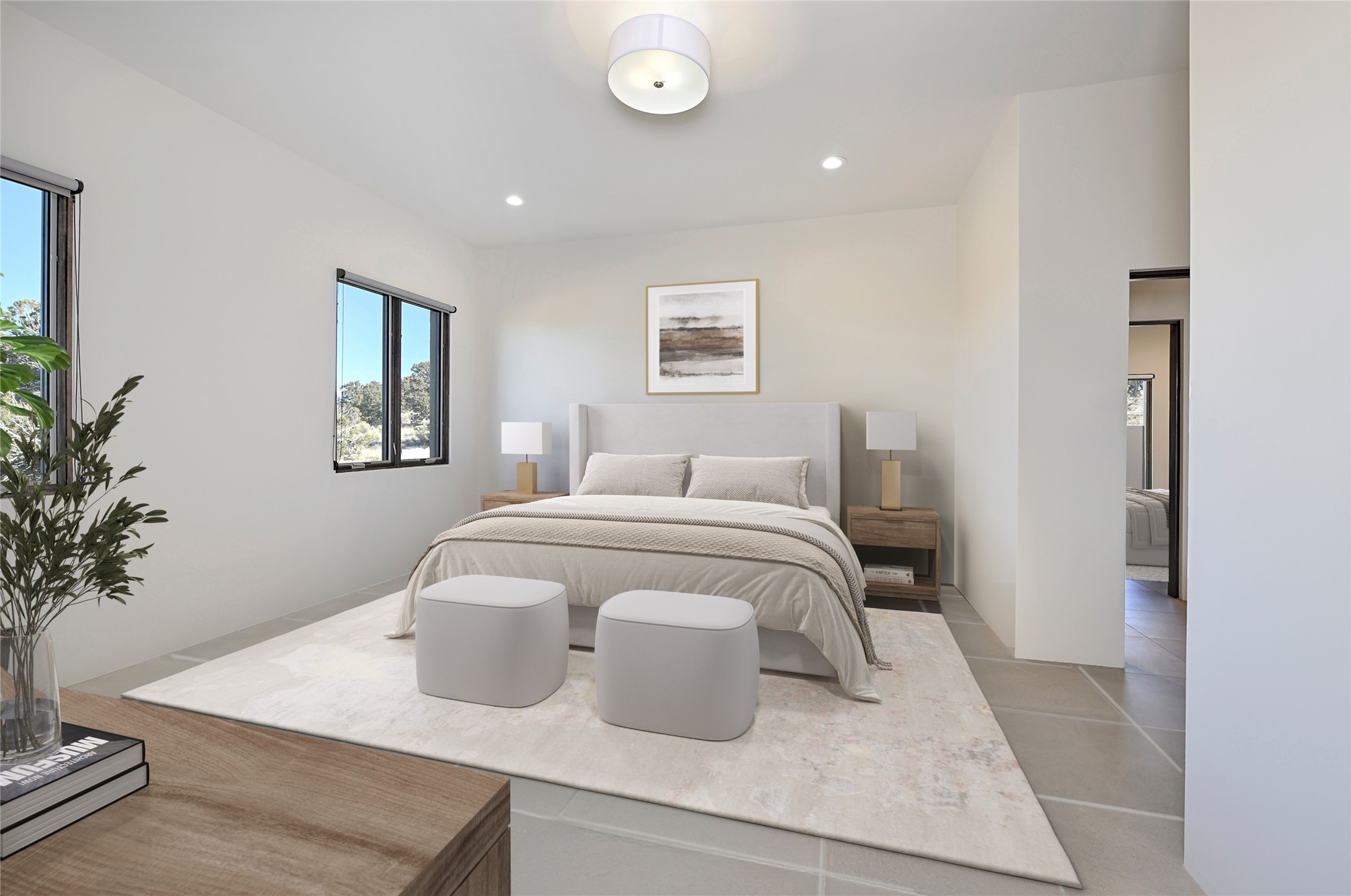 Exemplifying sleek, chic contemporary design in one of the most desirable locations in Santa Fe, this light-filled three-bedroom, 3,394-square-foot residence affords sweeping vistas from its ideal location in the western reaches of the exclusive Las Campanas community. Sophisticated living and entertaining are effortless indoors and out thanks to an easy open floor plan that encompasses a living room with a soaring beamed ceiling, a modern gas fireplace, handsome built-ins, and 10-foot glass doors; a dining area with sliding glass doors; an impeccably appointed chef's kitchen with quartz counters, handcrafted cabinets, and top-caliber appliances; and a Jemez-facing portal and courtyard-all linked in an effortless flow and basking in mountain and sunset views. Two generous guest bedrooms with spacious closets and en suite baths enjoy the seclusion of their own wing, while a quiet home office-which could easily serve as a fourth bedroom-is located down the hall and steps from a full bath. A serene, solitary oasis, the primary bedroom suite is tucked in a peaceful private spot and features a contemporary gas fireplace, a lavish bath with two vanities and both a soaking tub and a shower, and an impressively outfitted room-sized walk-in closet of nearly 200 square feet. Other welcome elements include a walk-in pantry or storage room; a bright, discreet laundry room; and a two-door, two-car garage with additional storage space. Some photos are virtually staged.