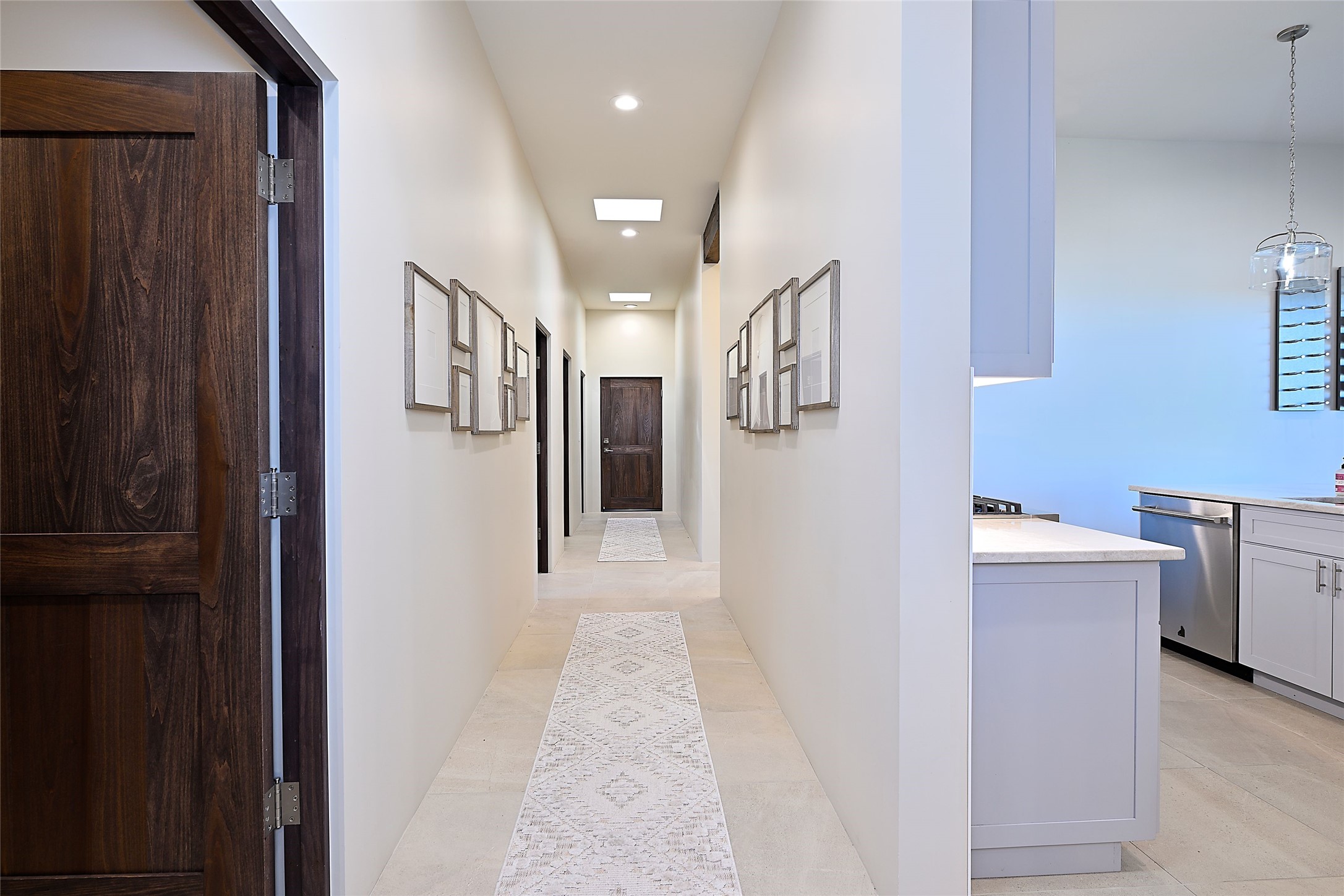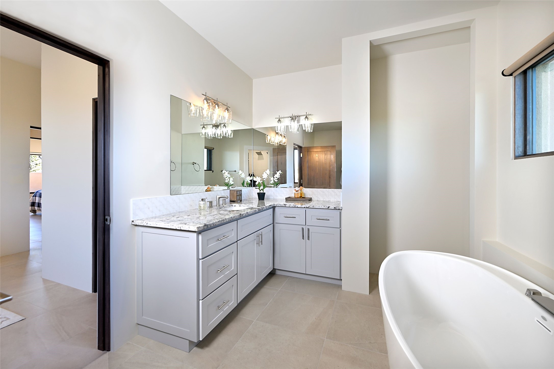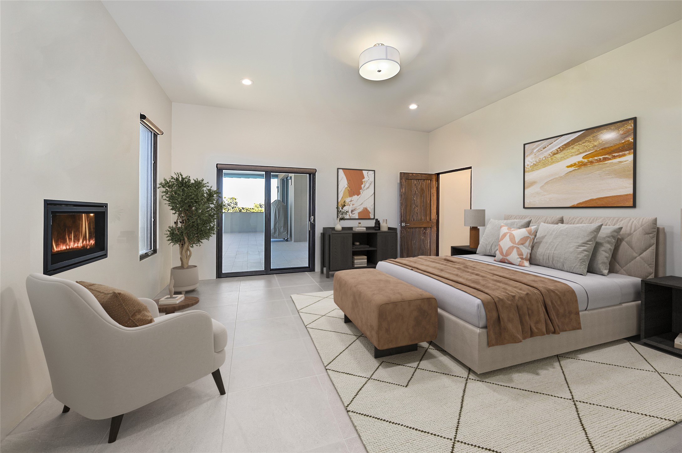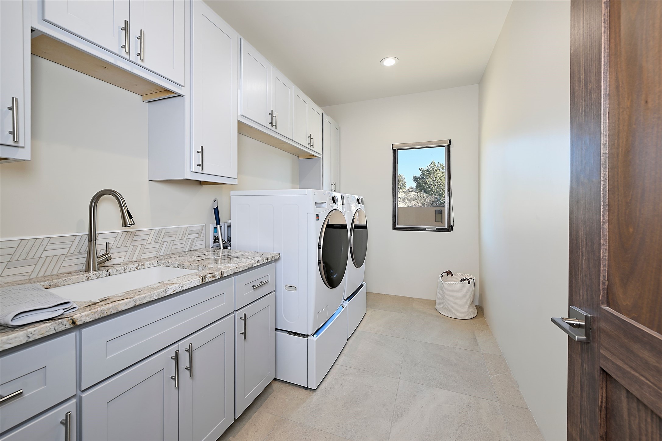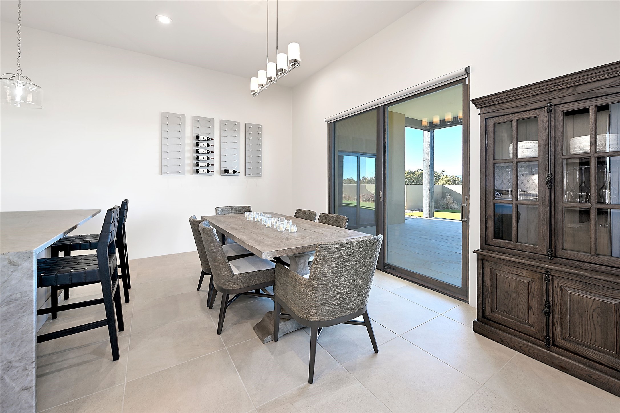 Exemplifying sleek, chic contemporary design in one of the most desirable locations in Santa Fe, this light-filled three-bedroom, 3,394-square-foot residence affords sweeping vistas from its ideal location in the western reaches of the exclusive Las Campanas community. Sophisticated living and entertaining are effortless indoors and out thanks to an easy open floor plan that encompasses a living room with a soaring beamed ceiling, a modern gas fireplace, handsome built-ins, and 10-foot glass doors; a dining area with sliding glass doors; an impeccably appointed chef's kitchen with quartz counters, handcrafted cabinets, and top-caliber appliances; and a Jemez-facing portal and courtyard-all linked in an effortless flow and basking in mountain and sunset views. Two generous guest bedrooms with spacious closets and en suite baths enjoy the seclusion of their own wing, while a quiet home office-which could easily serve as a fourth bedroom-is located down the hall and steps from a full bath. A serene, solitary oasis, the primary bedroom suite is tucked in a peaceful private spot and features a contemporary gas fireplace, a lavish bath with two vanities and both a soaking tub and a shower, and an impressively outfitted room-sized walk-in closet of nearly 200 square feet. Other welcome elements include a walk-in pantry or storage room; a bright, discreet laundry room; and a two-door, two-car garage with additional storage space. Some photos are virtually staged.