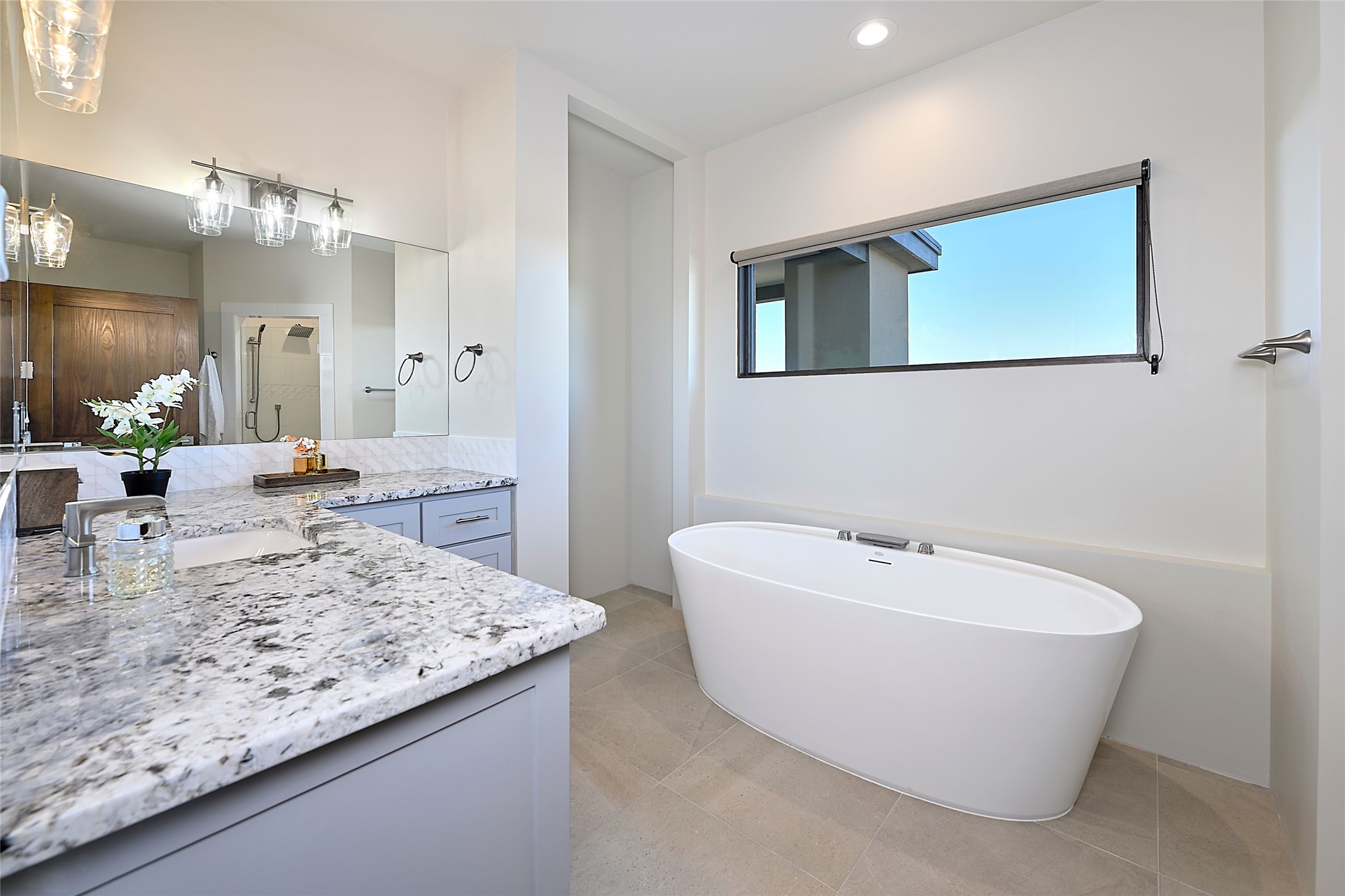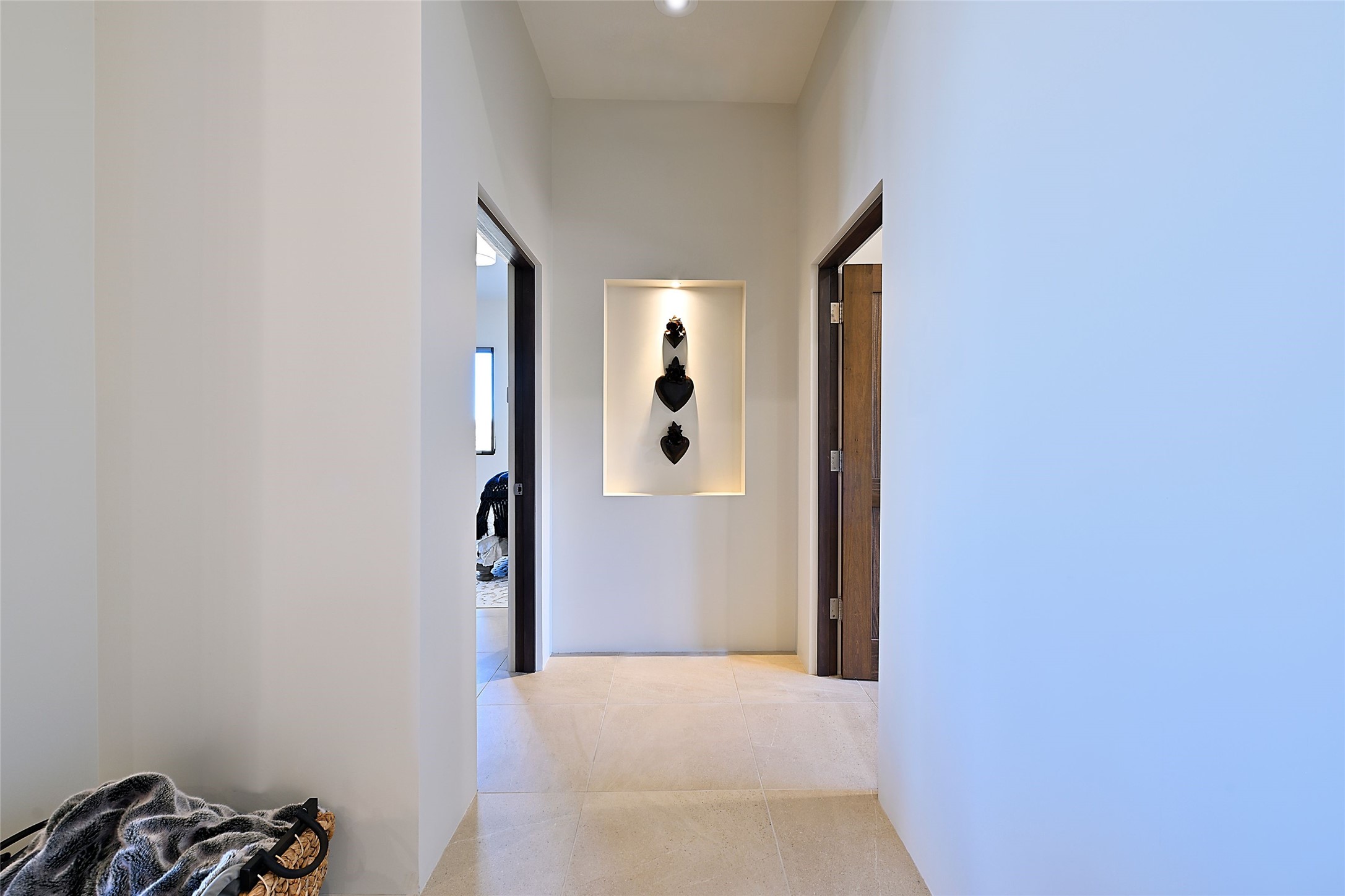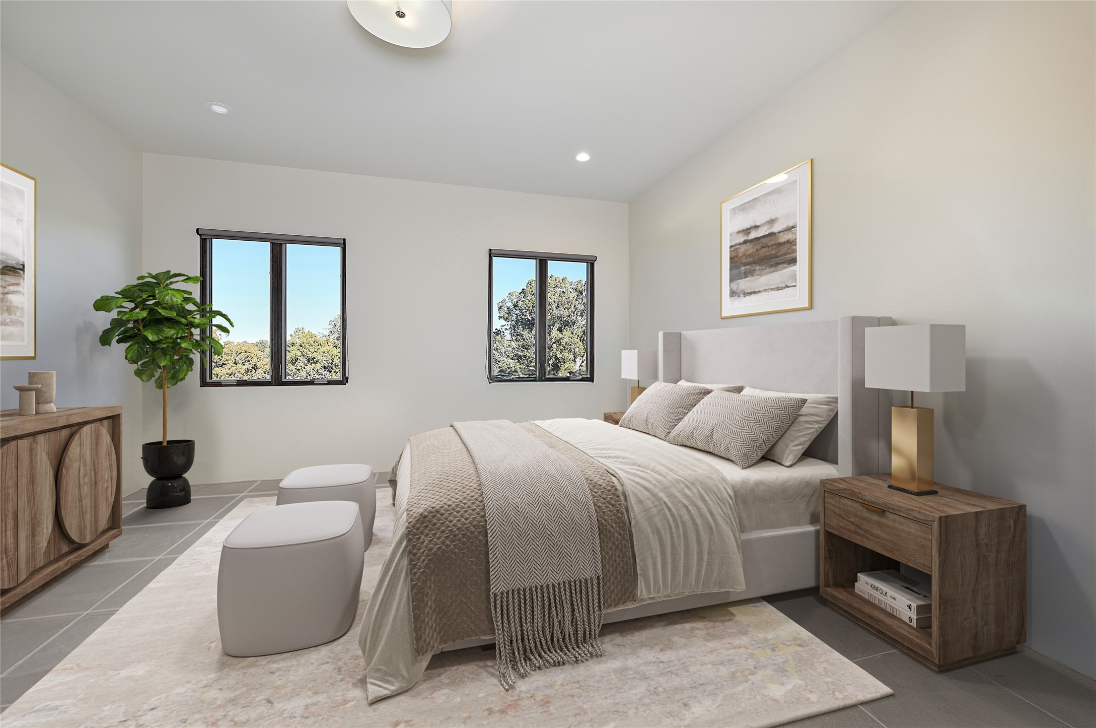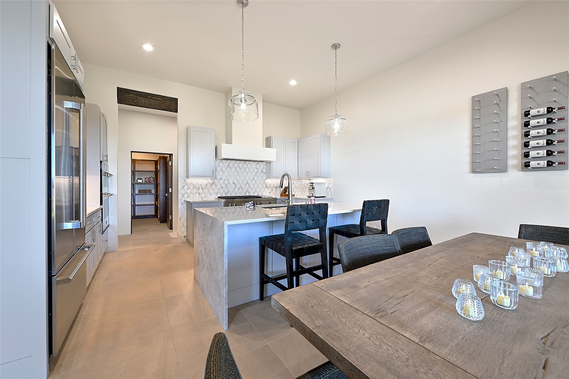 Exemplifying sleek, chic contemporary design in one of the most desirable locations in Santa Fe, this light-filled three-bedroom, 3,394-square-foot residence affords sweeping vistas from its ideal location in the western reaches of the exclusive Las Campanas community. Sophisticated living and entertaining are effortless indoors and out thanks to an easy open floor plan that encompasses a living room with a soaring beamed ceiling, a modern gas fireplace, handsome built-ins, and 10-foot glass doors; a dining area with sliding glass doors; an impeccably appointed chef's kitchen with quartz counters, handcrafted cabinets, and top-caliber appliances; and a Jemez-facing portal and courtyard-all linked in an effortless flow and basking in mountain and sunset views. Two generous guest bedrooms with spacious closets and en suite baths enjoy the seclusion of their own wing, while a quiet home office-which could easily serve as a fourth bedroom-is located down the hall and steps from a full bath. A serene, solitary oasis, the primary bedroom suite is tucked in a peaceful private spot and features a contemporary gas fireplace, a lavish bath with two vanities and both a soaking tub and a shower, and an impressively outfitted room-sized walk-in closet of nearly 200 square feet. Other welcome elements include a walk-in pantry or storage room; a bright, discreet laundry room; and a two-door, two-car garage with additional storage space. Some photos are virtually staged.