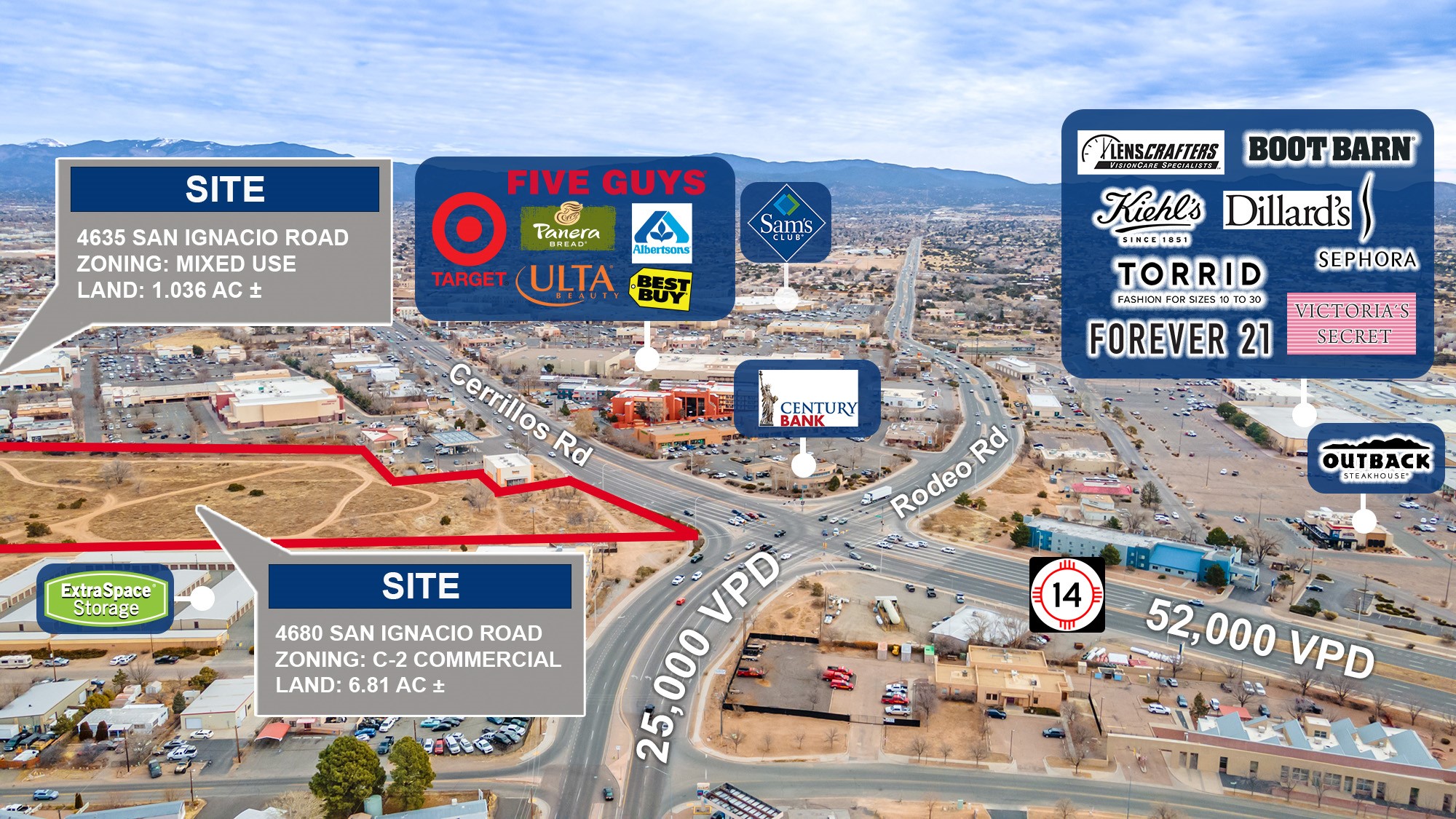 Two prime infill sites ripe for commercial development next to San Isidro Plaza. 4860 San Ignacio Rd Lot A-2: 6.811 acres ($4,125,000). 4635 San Ignacio Rd Lot B: 1.036 acres ($625,000). $4,750,000 ($13.90/sf) for both lots (7.847 ac). Located across the street from regional shopping center Santa Fe Place. Nearby businesses include Lowe's, Sprouts, Best Buy, Albertsons, Target, Starbucks, Panera Bread, Ulta, Barnes & Noble, World Market, Dillards and more. 4680 San Ignacio Rd has C-2 commercial zoning which allows for retail, restaurants, multifamily, hospitality, office, religious, educational and more. 4635 San Ignacio Rd has Mixed Use zoning, which allows for residential, retail, restaurants, office, personal services, studios, wellness, educational, community facilities, and live/work units with the condition that MU zoned land can be developed for residential use with up to 50% commercial space. Access available via San Ignacio Road. Close to the busy intersection of Cerrillos Rd (52,000 VPD) and Airport Road (25,000 VPD). City water and sewer in place near the lot line. Public utilities available. Located in an Opportunity Zone. If developed for multifamily housing, this property might qualify for the next round of $30,000,000 of financing from the NMFA Opportunity Enterprise Housing Development Fund - applications are open on a revolving basis - more info at https://www.nmfinance.com/opportunity-enterprise-housing-development-revolving-fund/