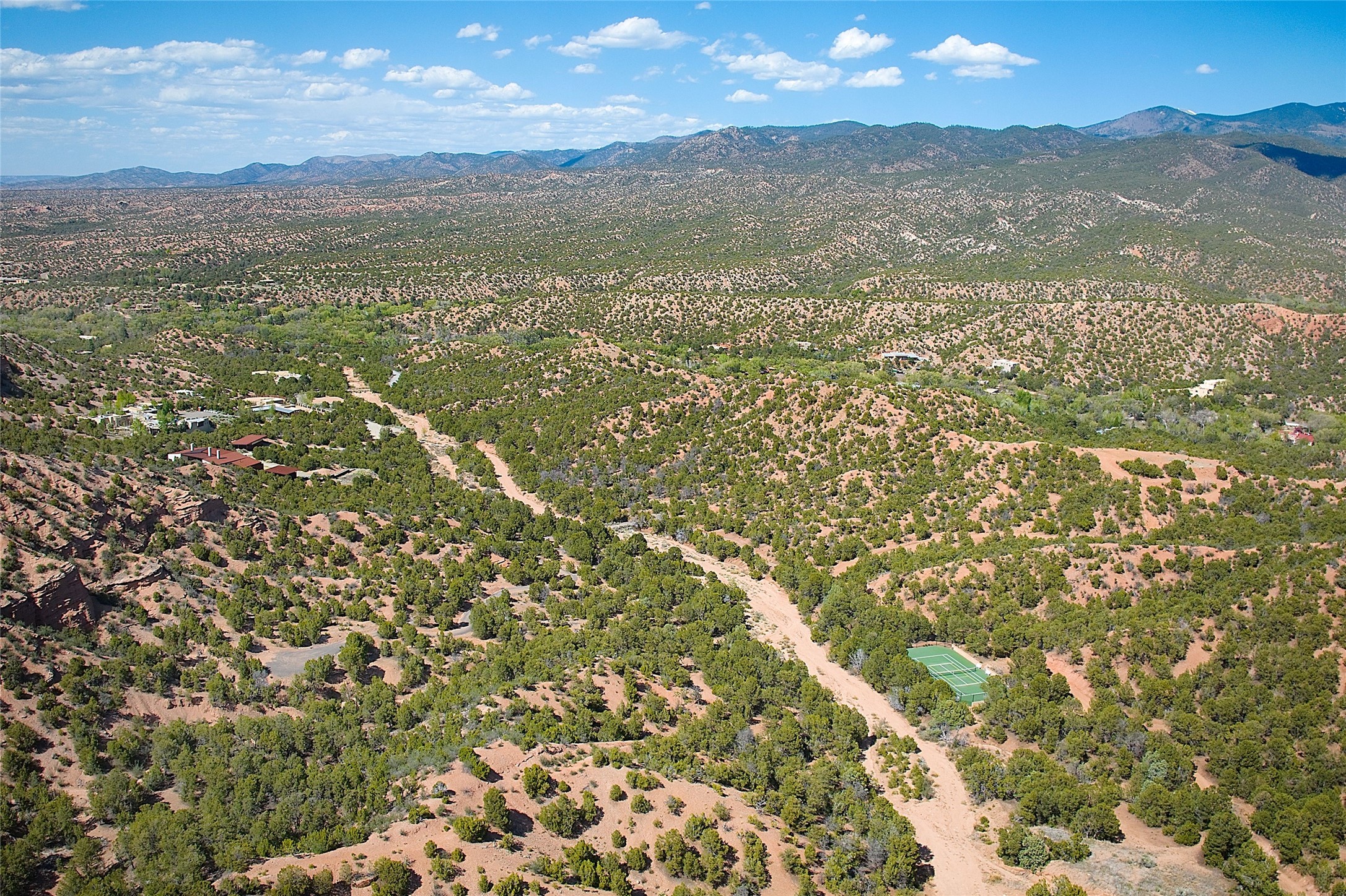Rare opportunity to own 23.01-acres of residential land offering spectacular panoramic views of the Sangre de Cristo Mountains and the tranquil Tesuque Valley. This unique parcel consists of two separately deeded contiguous lots. Accessed through the prestigious gated Circle Drive Compound, this property ensures a sense of privacy and exclusivity while remaining connected to a vibrant community. With several designated building envelopes, you have the creative freedom to design a residence that perfectly complements the stunning surroundings. One of the deeded lots features a finished tennis court, a luxurious amenity that enhances your outdoor lifestyle while allowing for community access. Imagine enjoying sunny afternoons on the court or hosting gatherings with friends and family, all set against the backdrop of breathtaking natural beauty. Full plans for 4,738 sq. ft. 3 bedroom, 4 bath main house (with an approved permit for pool) and 1608 sq. ft. 2 bedroom, 2 bath casita from Craig Hoopes Architects could be included with sale. Underground utilities, and one shared well permitted for multiple domestic households. Zoning is Residential Fringe; District Density: RES-F; 1 dwelling per 5 acres. This prime location combines the best of both worlds: the serenity of rural living and the convenience of nearby amenities. Experience the rich culture and outdoor adventures that New Mexico has to offer, all while enjoying the comfort of your own private retreat.