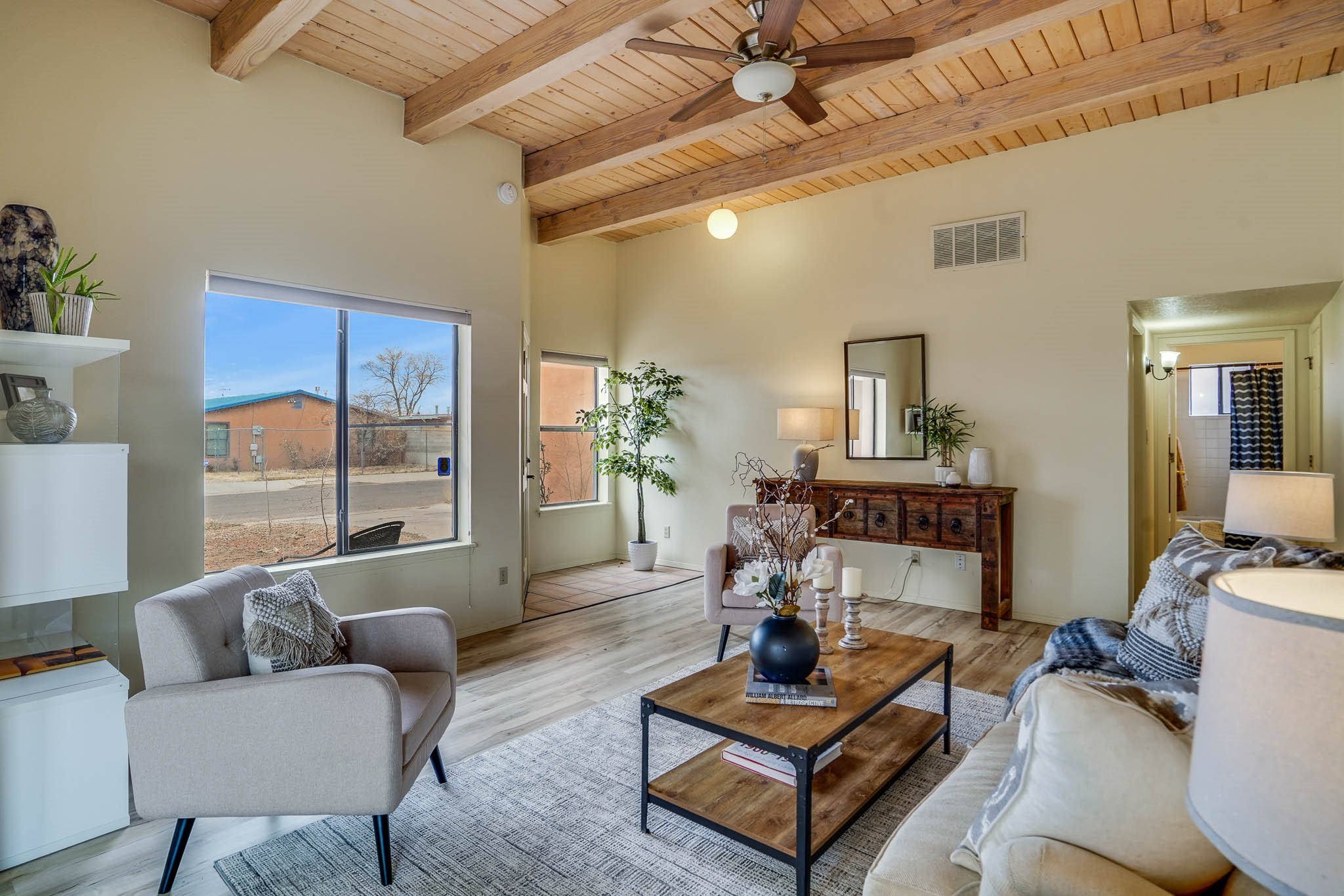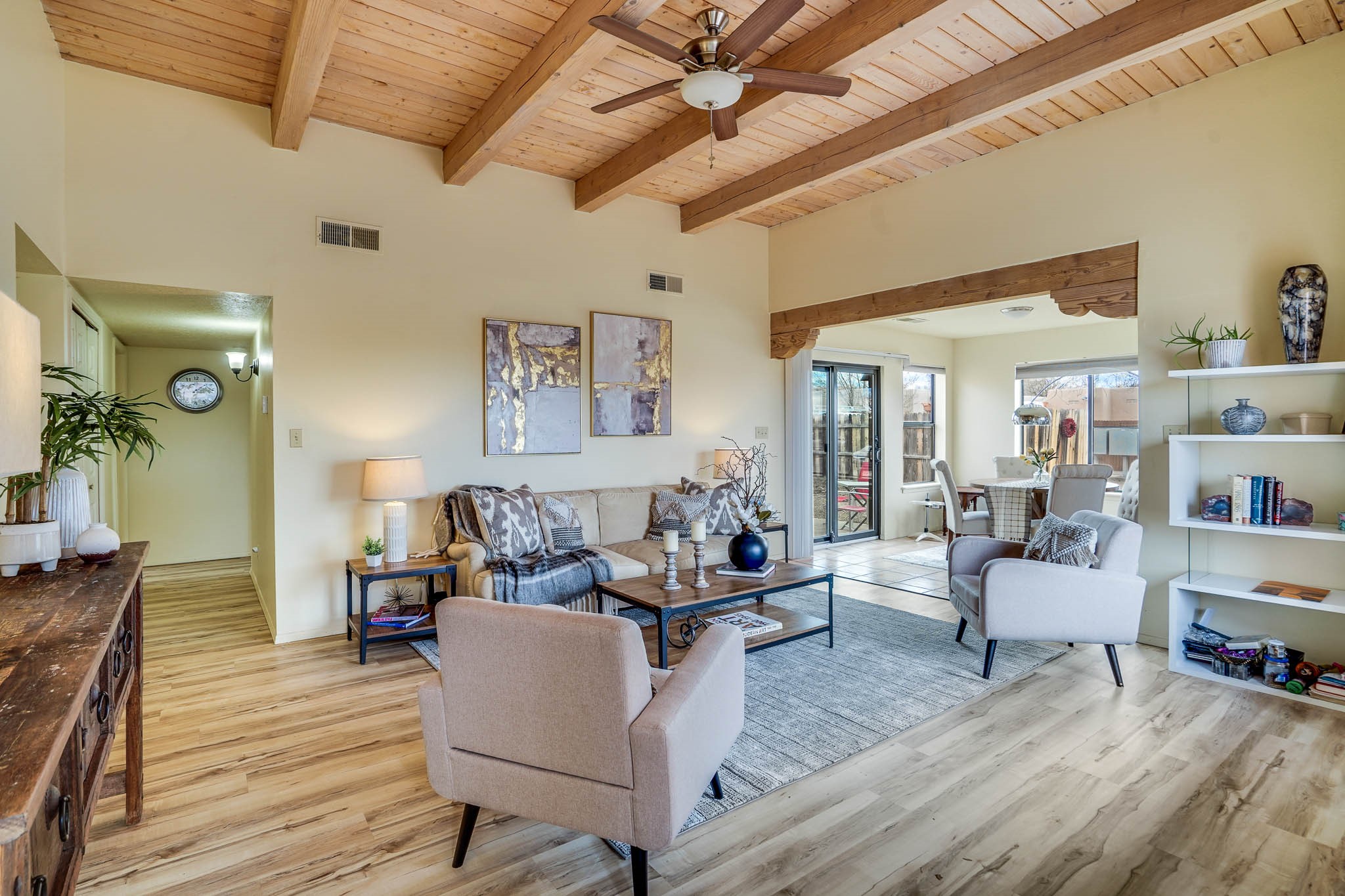Experience the perfect balance of comfort and efficiency in this charming 3 bedroom, 2 bathroom home. Nestled on a generous corner lot, the residence features an inviting open floorplan with high beam ceilings and abundant natural light streaming through large, bright windows. The spacious layout seamlessly connects living, dining, and kitchen areas, ideal for both entertaining and daily life. Enjoy the convenience of a finished single-car garage, a fully fenced yard perfect for pets and play, and dedicated RV parking.Recent enhancements includea 2024 photovoltaic solar panel system for sustainableliving, an upgraded electrical panel ready for EV charging and AC installation, a 2023 roof with a transferable warranty, a new 2024 sliding glass door, and a new furnace installed in March 2025.