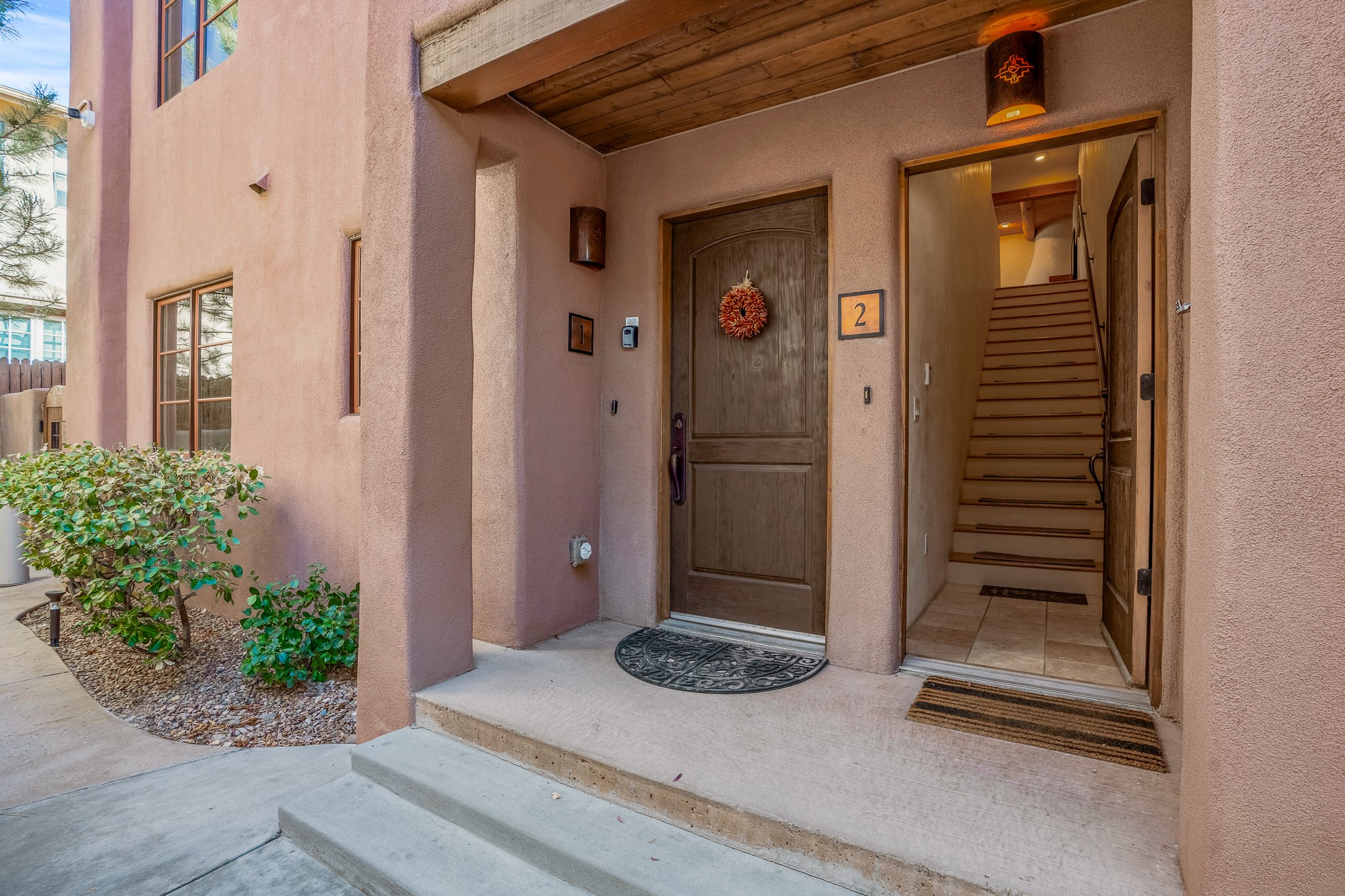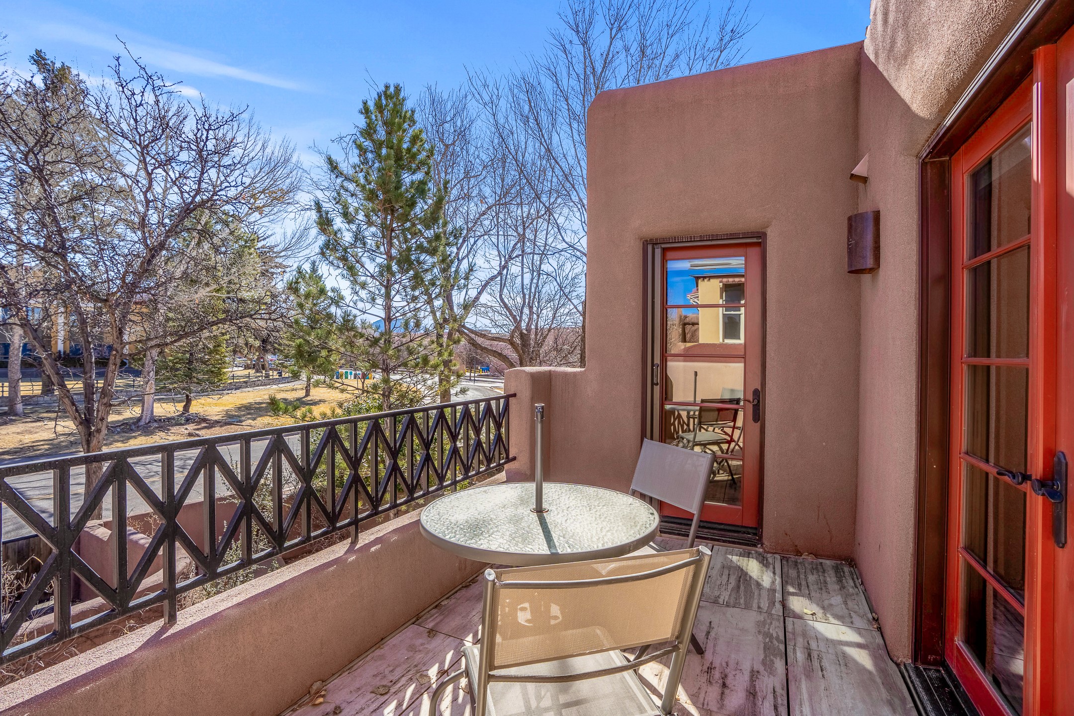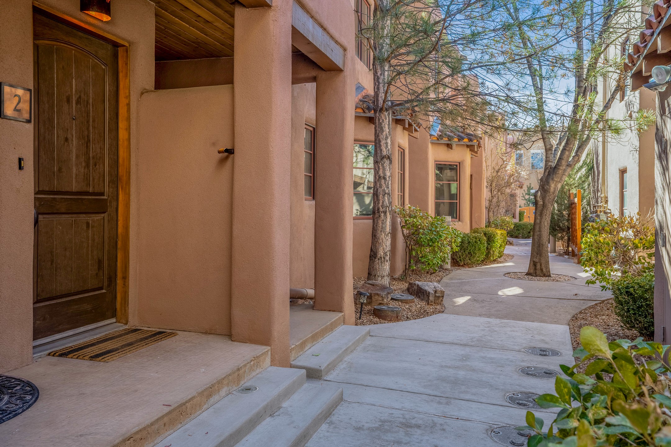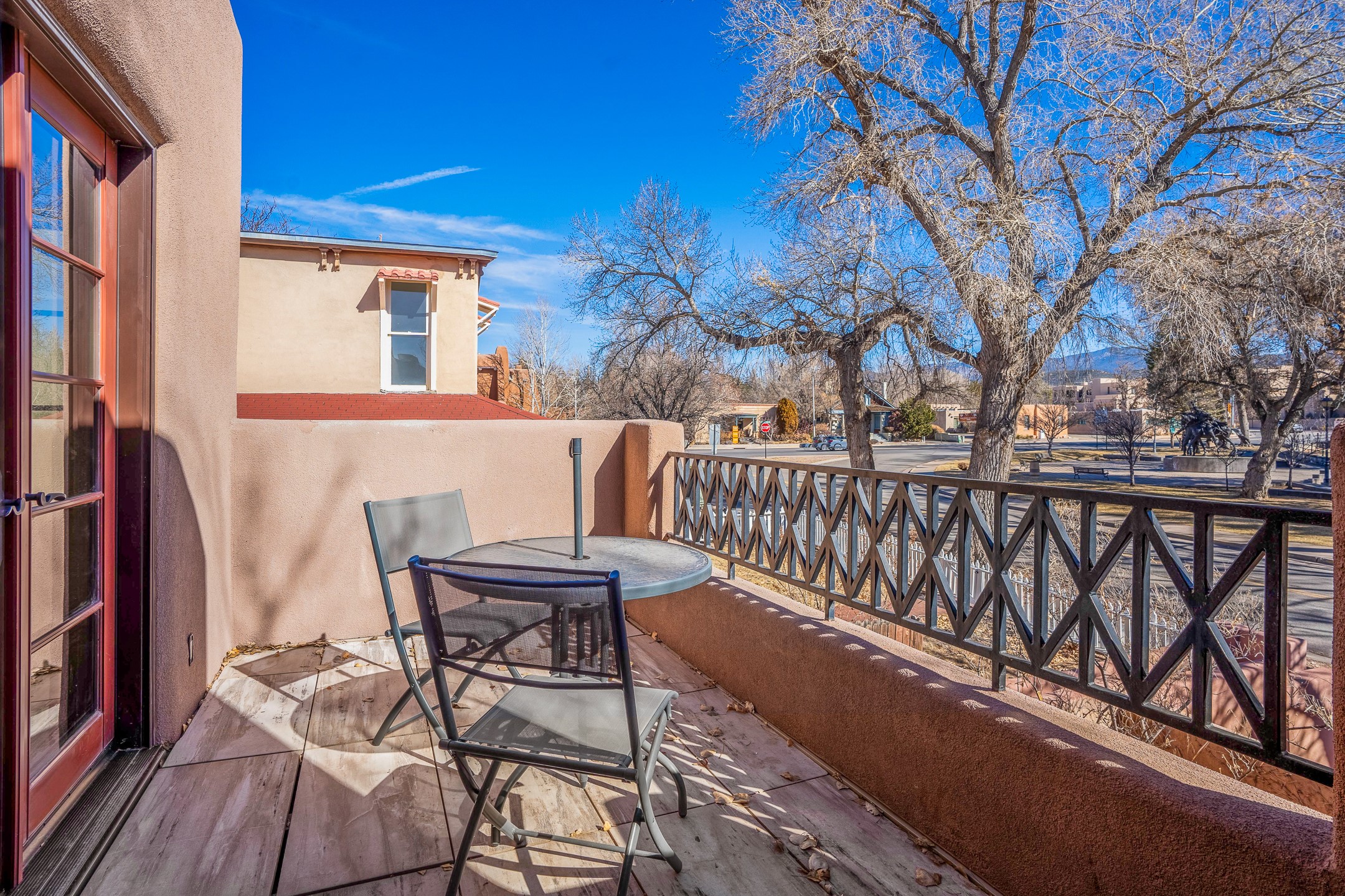 This light-filled, 2nd-floor upscale corner condo is professionally decorated and appointed, only two blocks from the famous Santa Fe Plaza. Plaster walls, a tankless water heater, stainless kitchen appliances, and granite countertops complement the carefully decorated home. New roofs and gas lines were installed by HOA in 2022. There is also a state-of-the-art workout facility and temperature-controlled underground parking on site. There are also incredible seasonal mountain views from the East windows and patio. An excellent investment opportunity as Short-term rentals are allowable with this HOA; buyers are to conduct due diligence with the City and HOA regarding STR rentals. The rental property is currently professionally managed by Adobe Star Properties.All Furnishings are included.
