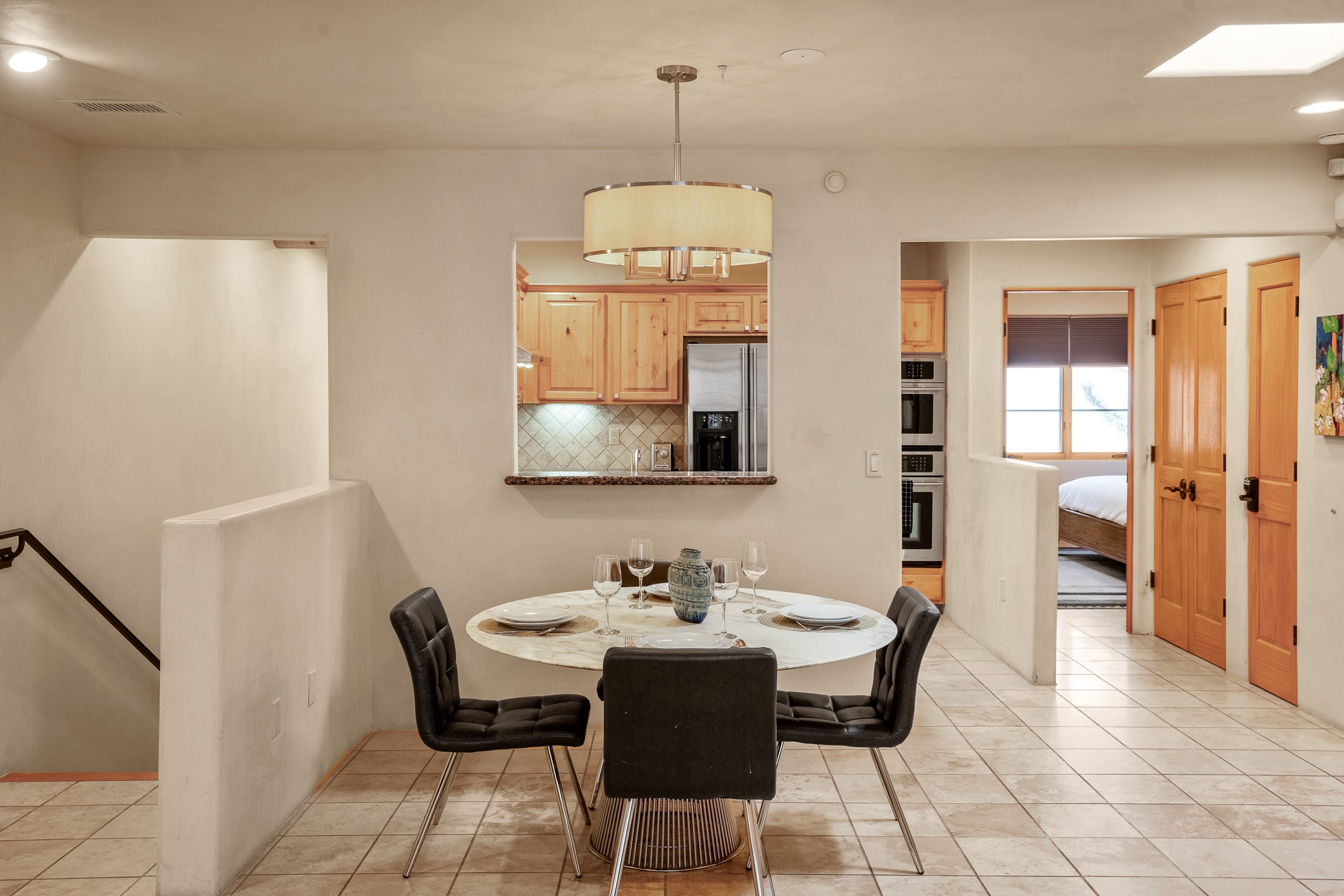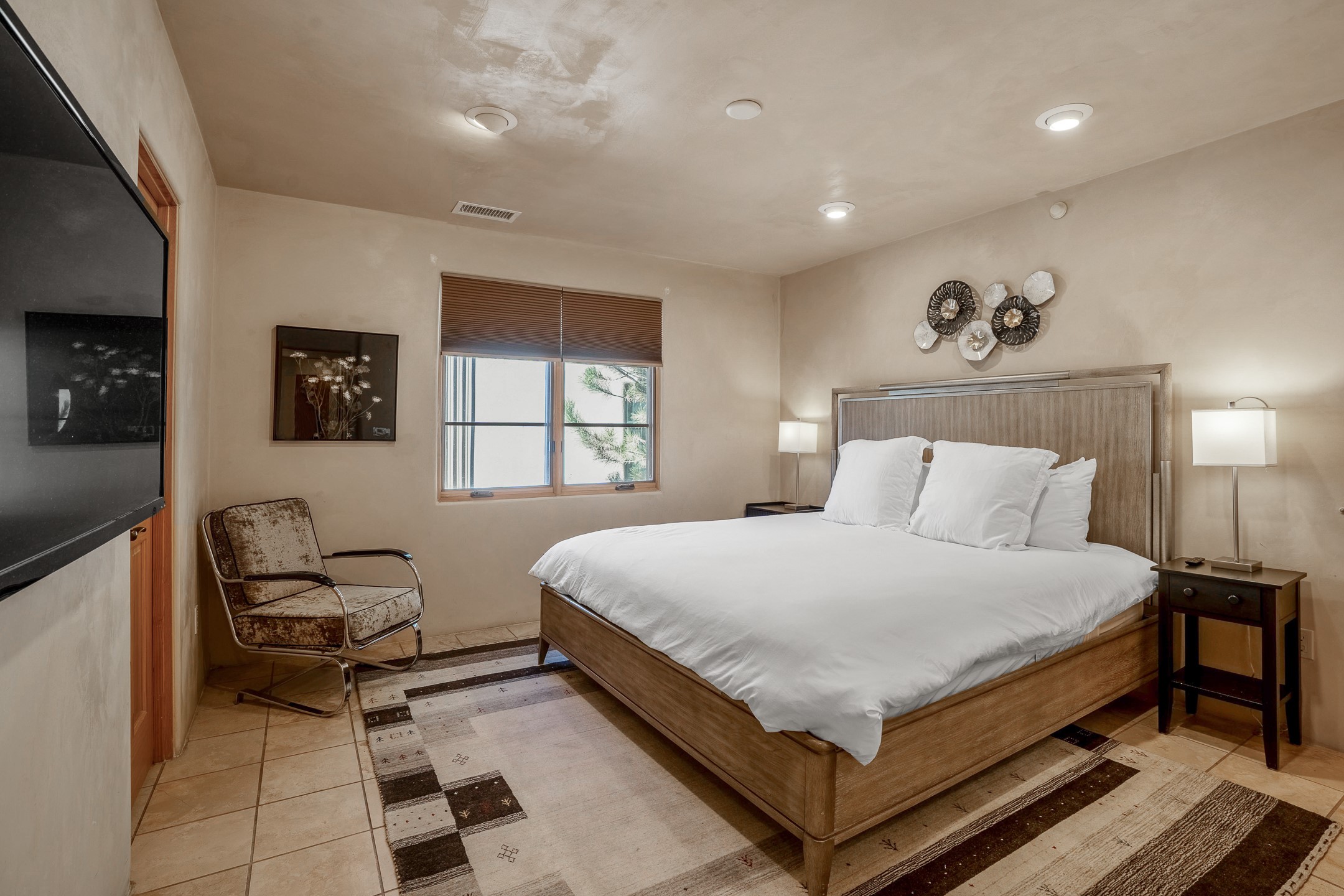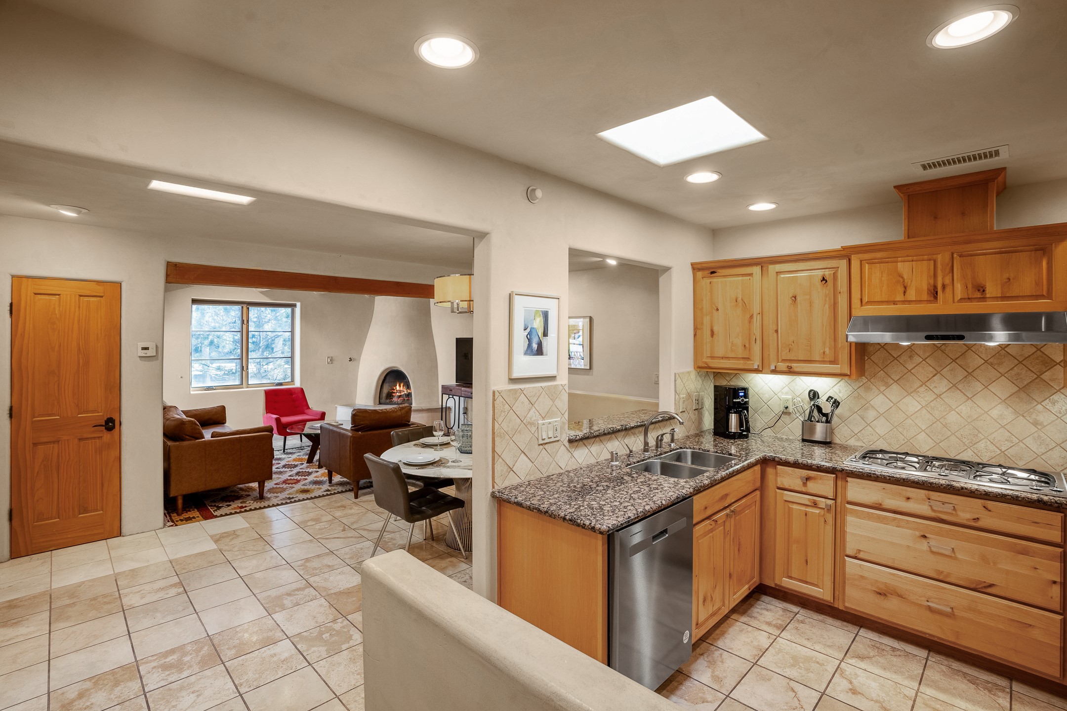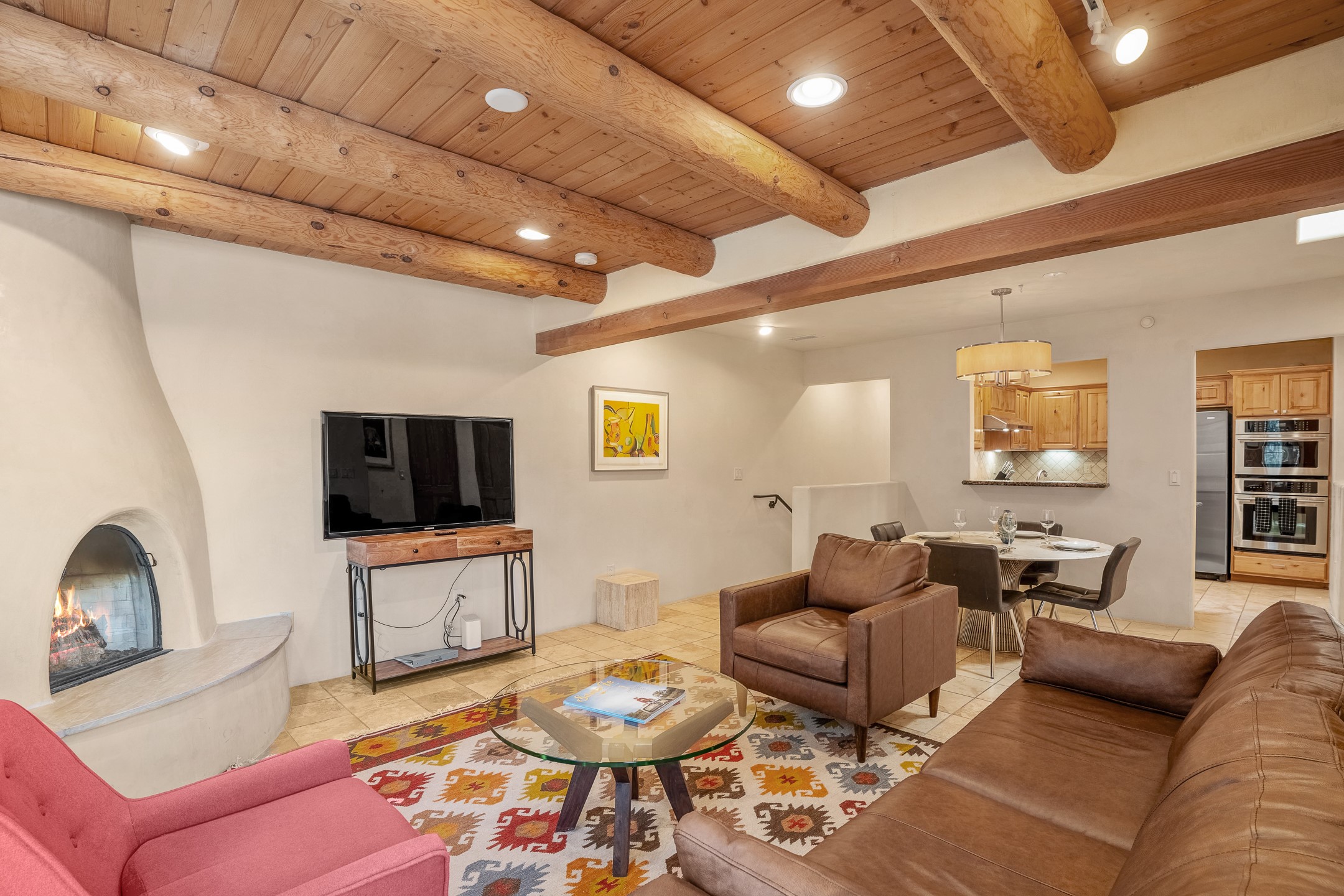 This light-filled, 2nd-floor upscale corner condo is professionally decorated and appointed, only two blocks from the famous Santa Fe Plaza. Plaster walls, a tankless water heater, stainless kitchen appliances, and granite countertops complement the carefully decorated home. New roofs and gas lines were installed by HOA in 2022. There is also a state-of-the-art workout facility and temperature-controlled underground parking on site. There are also incredible seasonal mountain views from the East windows and patio. An excellent investment opportunity as Short-term rentals are allowable with this HOA; buyers are to conduct due diligence with the City and HOA regarding STR rentals. The rental property is currently professionally managed by Adobe Star Properties.All Furnishings are included.