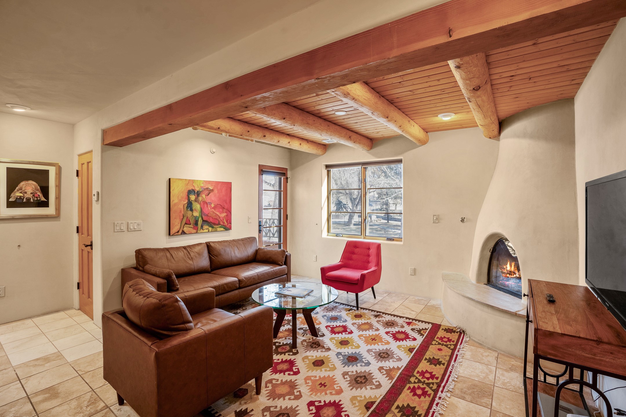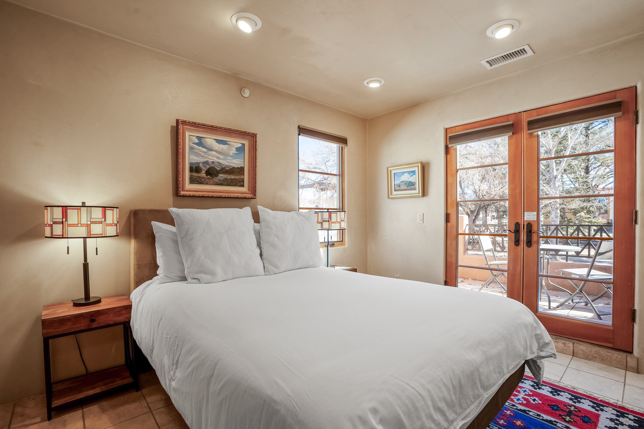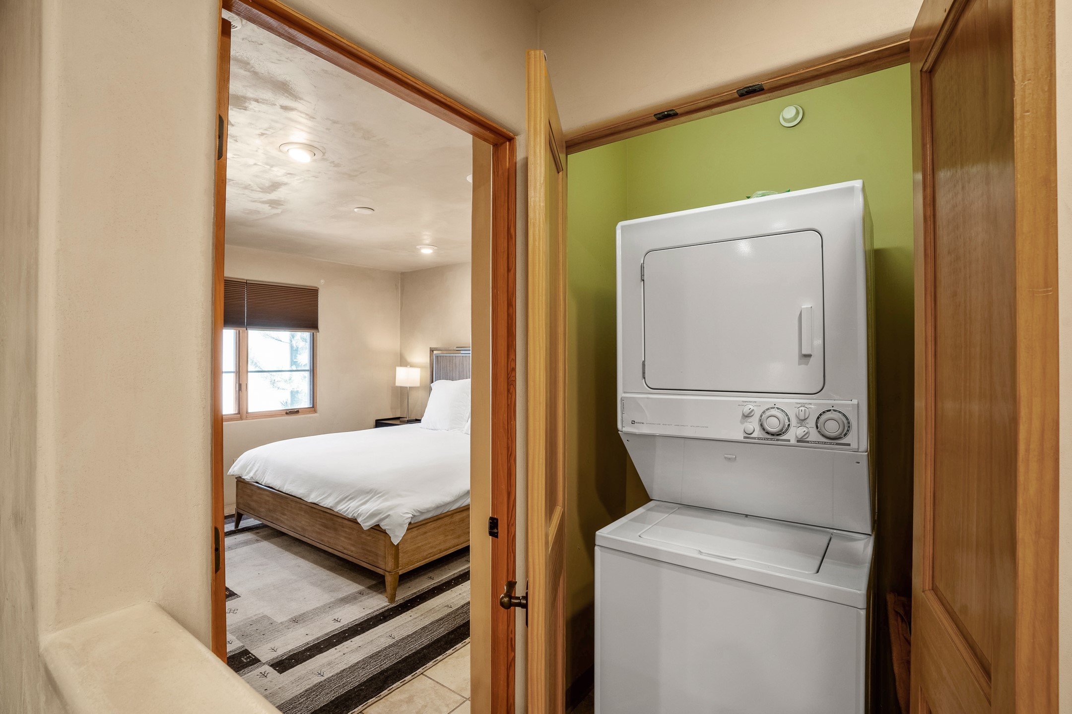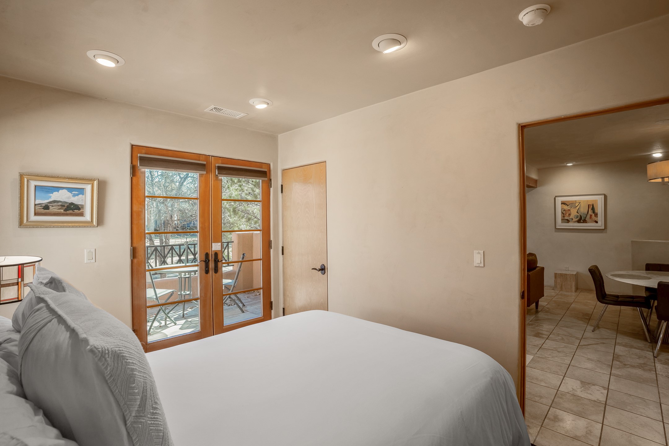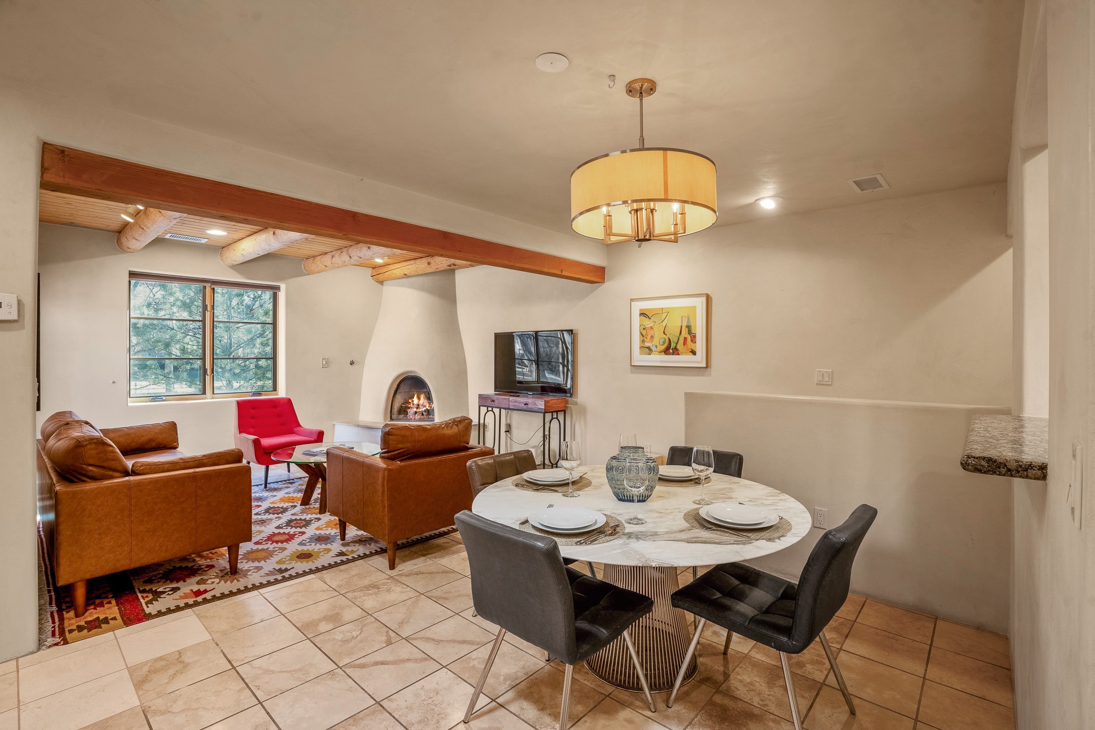 This light-filled, 2nd-floor upscale corner condo is professionally decorated and appointed, only two blocks from the famous Santa Fe Plaza. Plaster walls, a tankless water heater, stainless kitchen appliances, and granite countertops complement the carefully decorated home. New roofs and gas lines were installed by HOA in 2022. There is also a state-of-the-art workout facility and temperature-controlled underground parking on site. There are also incredible seasonal mountain views from the East windows and patio. An excellent investment opportunity as Short-term rentals are allowable with this HOA; buyers are to conduct due diligence with the City and HOA regarding STR rentals. The rental property is currently professionally managed by Adobe Star Properties.All Furnishings are included.