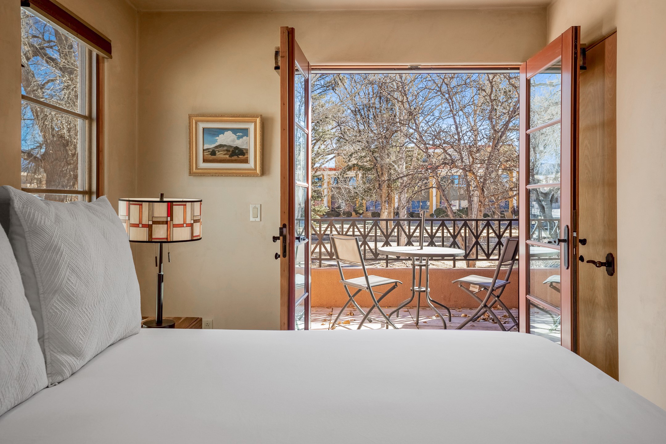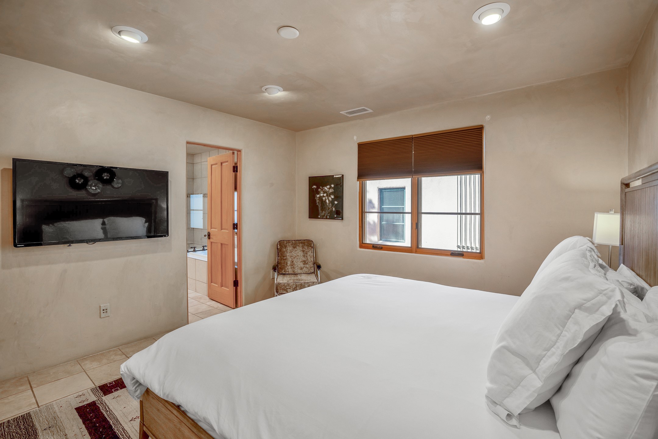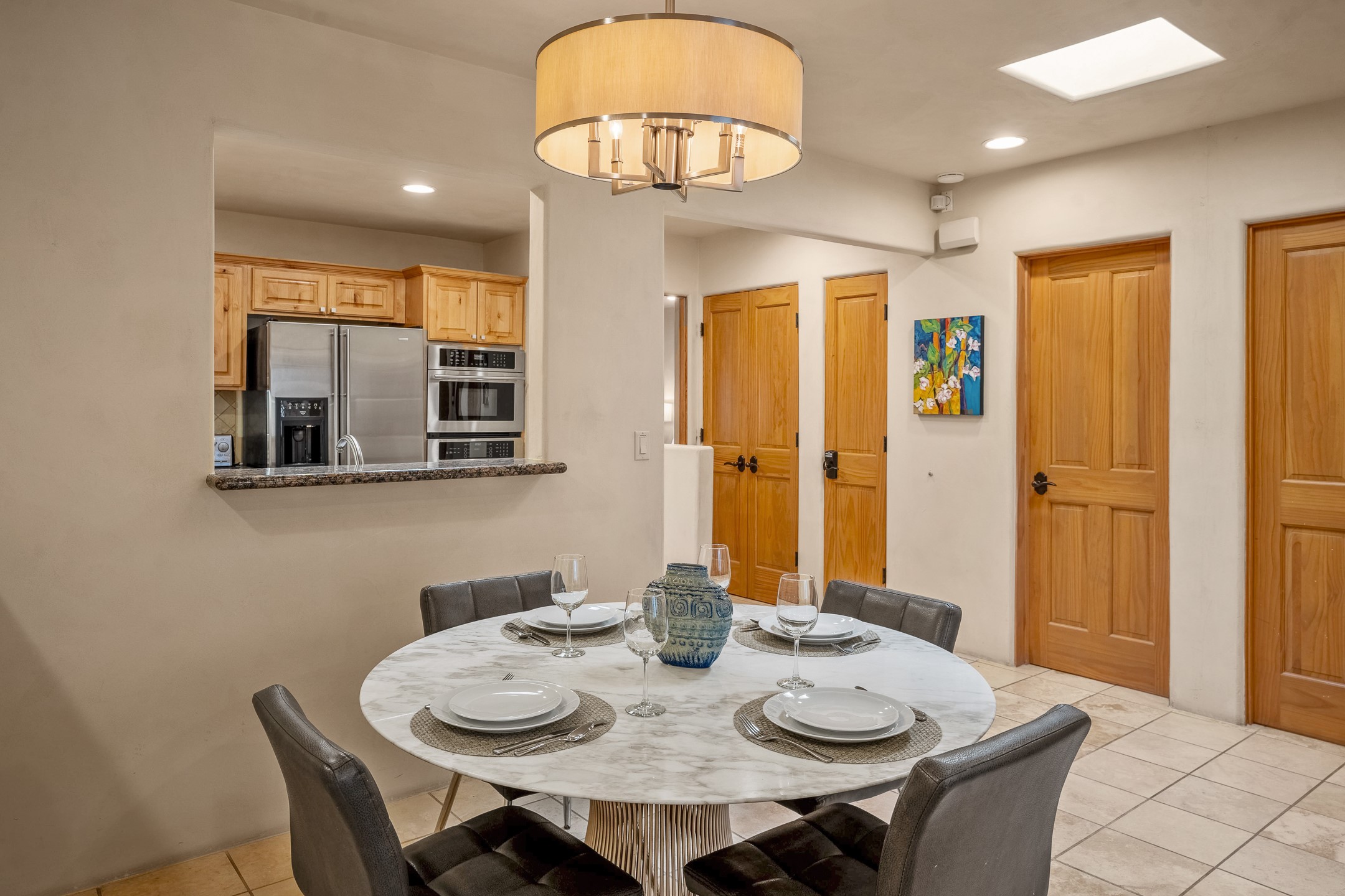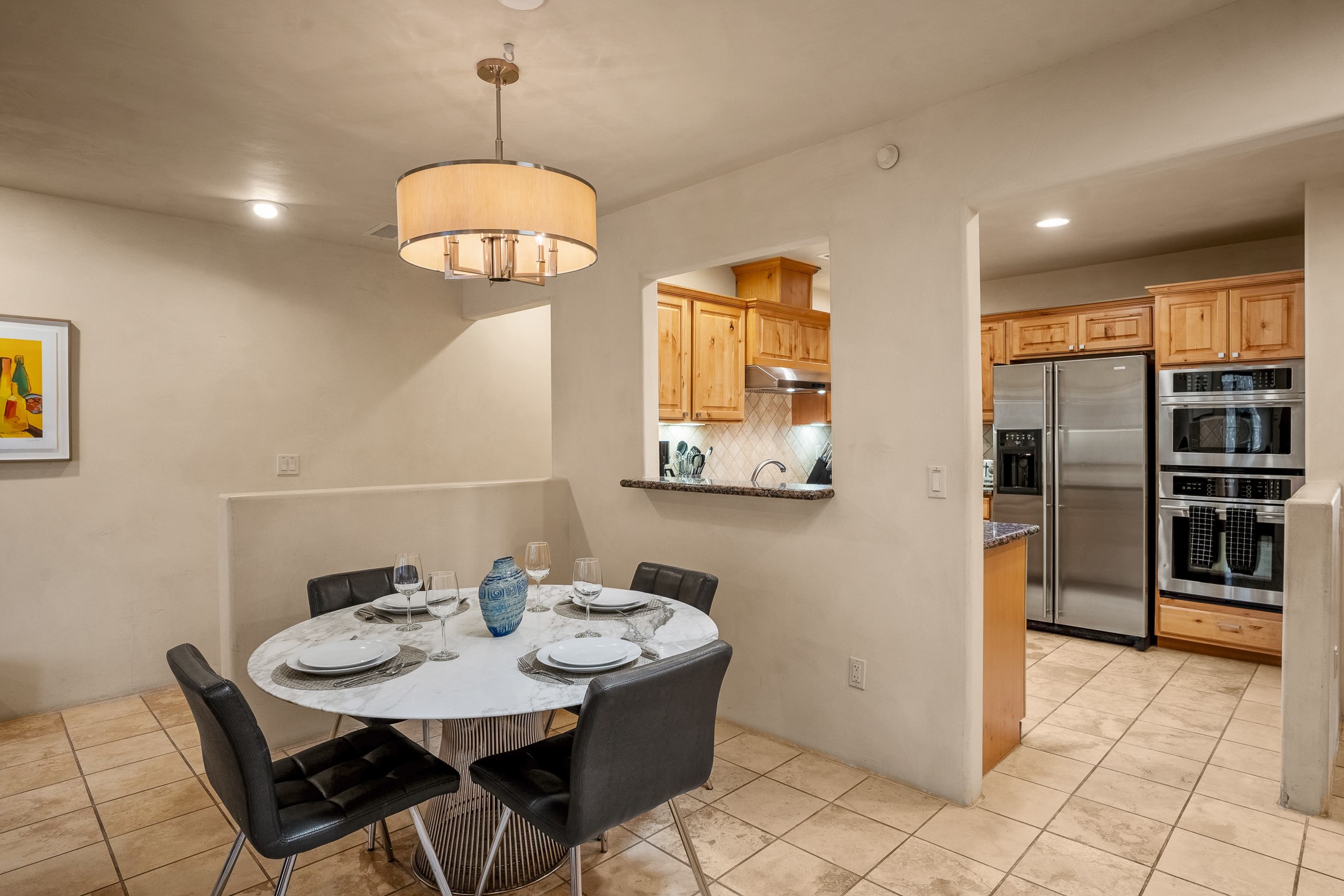 This light-filled, 2nd-floor upscale corner condo is professionally decorated and appointed, only two blocks from the famous Santa Fe Plaza. Plaster walls, a tankless water heater, stainless kitchen appliances, and granite countertops complement the carefully decorated home. New roofs and gas lines were installed by HOA in 2022. There is also a state-of-the-art workout facility and temperature-controlled underground parking on site. There are also incredible seasonal mountain views from the East windows and patio. An excellent investment opportunity as Short-term rentals are allowable with this HOA; buyers are to conduct due diligence with the City and HOA regarding STR rentals. The rental property is currently professionally managed by Adobe Star Properties.All Furnishings are included.