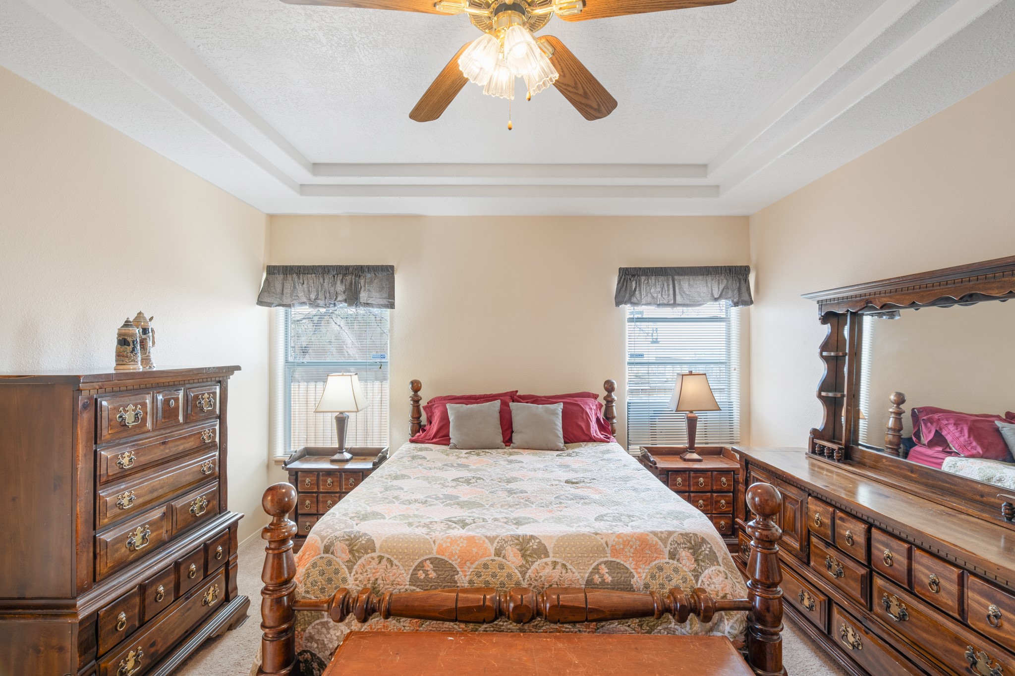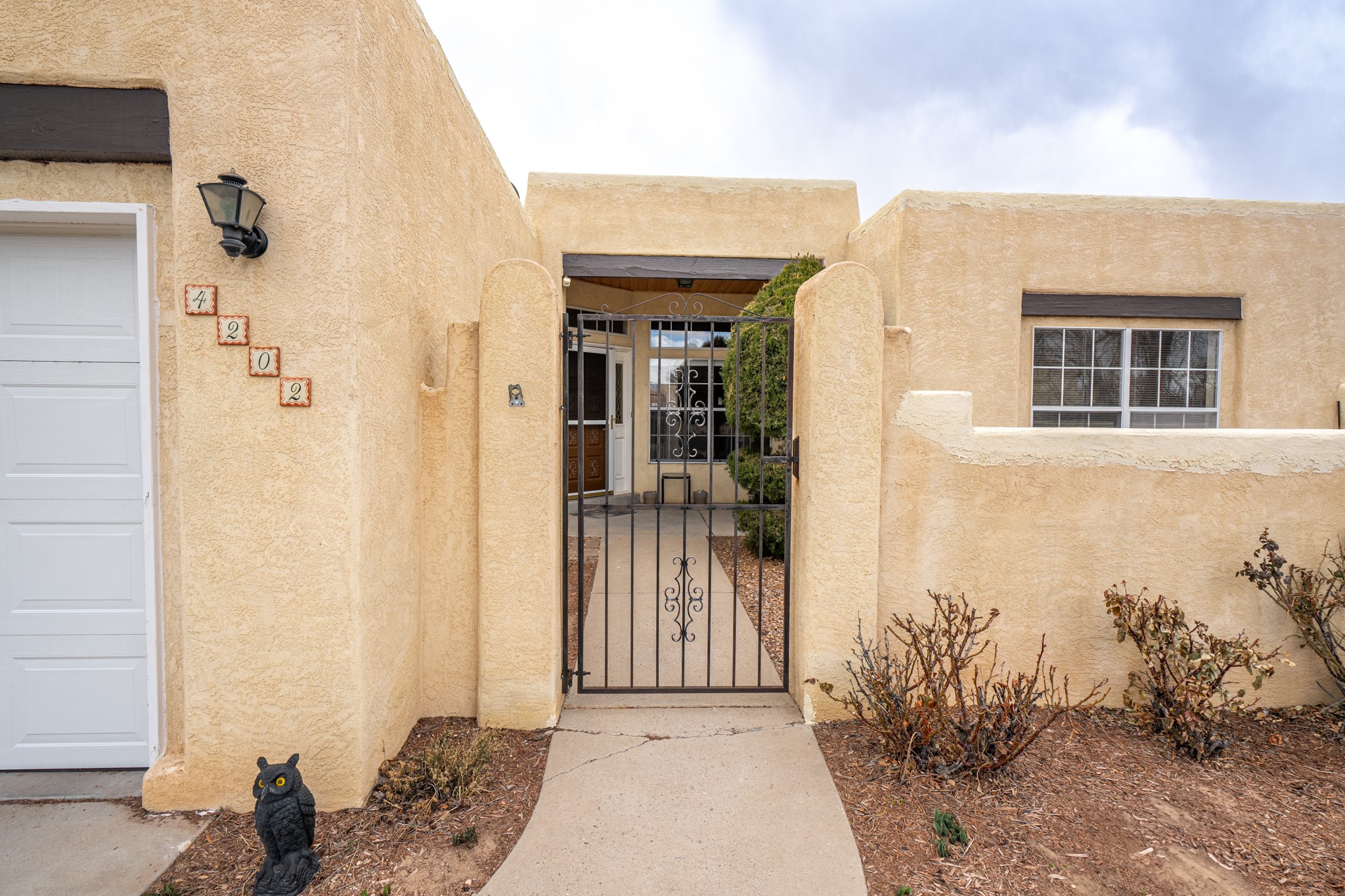 Tucked away in a peaceful cul-de-sac within a desirable gated community, this beautiful 3-bedroom, 2-bathroom home offers the perfect blend of comfort, tranquility, convenience, and modern living. Designed with an open floor plan and abundant natural light, this home feels bright and welcoming.The spacious kitchen is a standout feature, boasting newer appliances, ample counter space, and generous storage--ideal for cooking enthusiasts and entertainers alike. The airy living and dining areas flow seamlessly, creating a welcoming atmosphere for gatherings or quiet evenings at home.Step outside and enjoy the xeriscaped front and back yards, designed for low maintenance and water efficiency. The large backyard is a dream for pet owners, especially dogs, offering plenty of space to run and play. Established fruit trees bring natural beauty and seasonal harvests to your private outdoor retreat. Located in a family-friendly neighborhood, this home offers exclusive access to a private park, perfect for outdoor activities and community events. With easy access to NM 599, commuting and daily errands are a breeze.Additional features include a roof warranty for peace of mind, new dining and family room blinds, a new sliding glass door, a new evaporative cooling system, fresh interior paint, and stucco maintenance.Don't miss this rare opportunity to own a beautiful home in a serene, secure, and welcoming community!