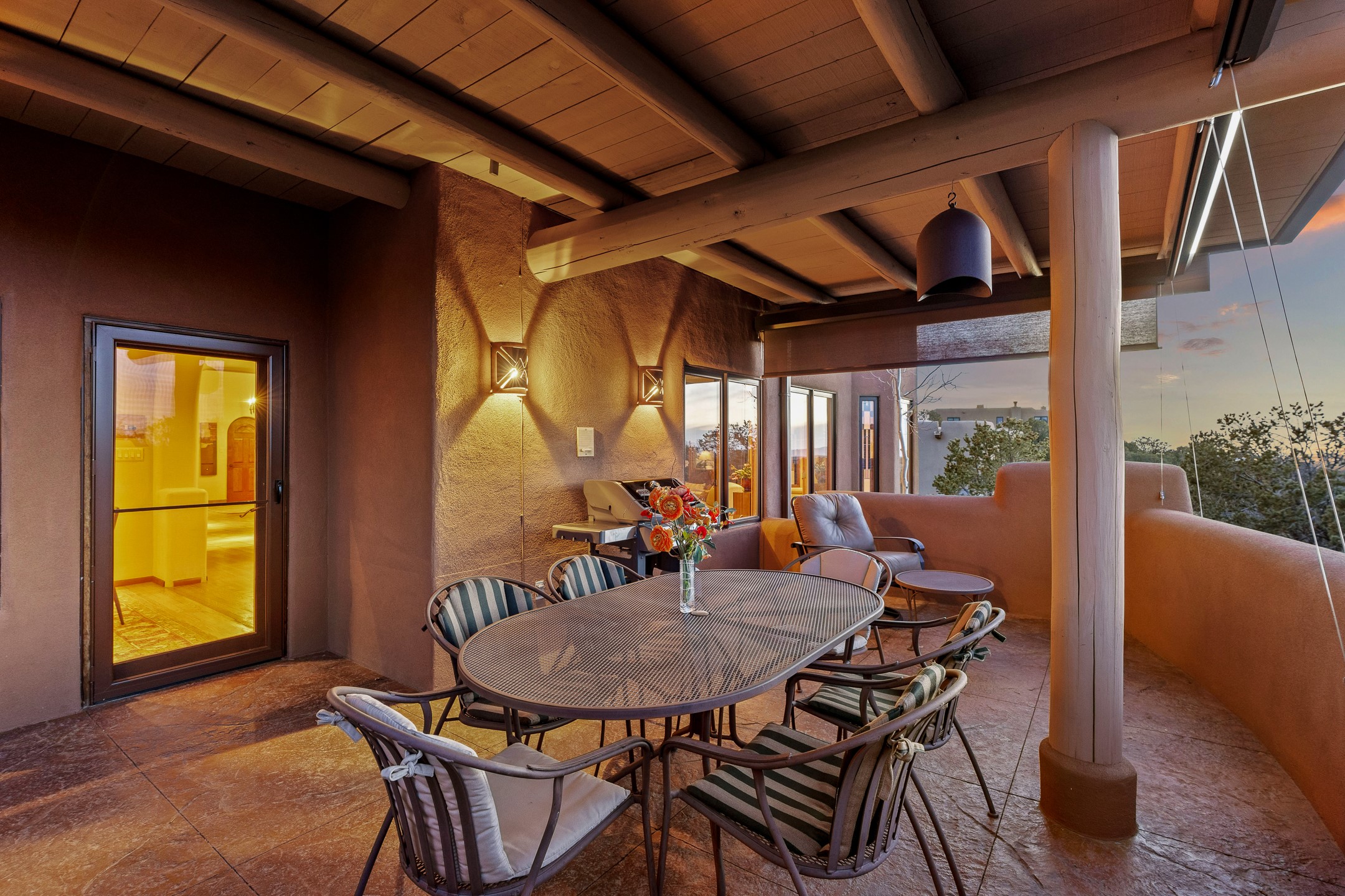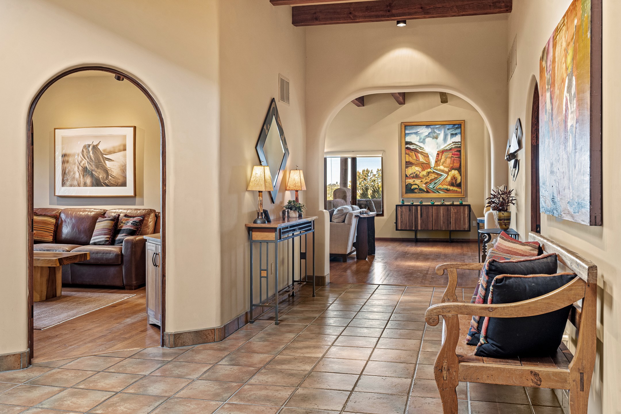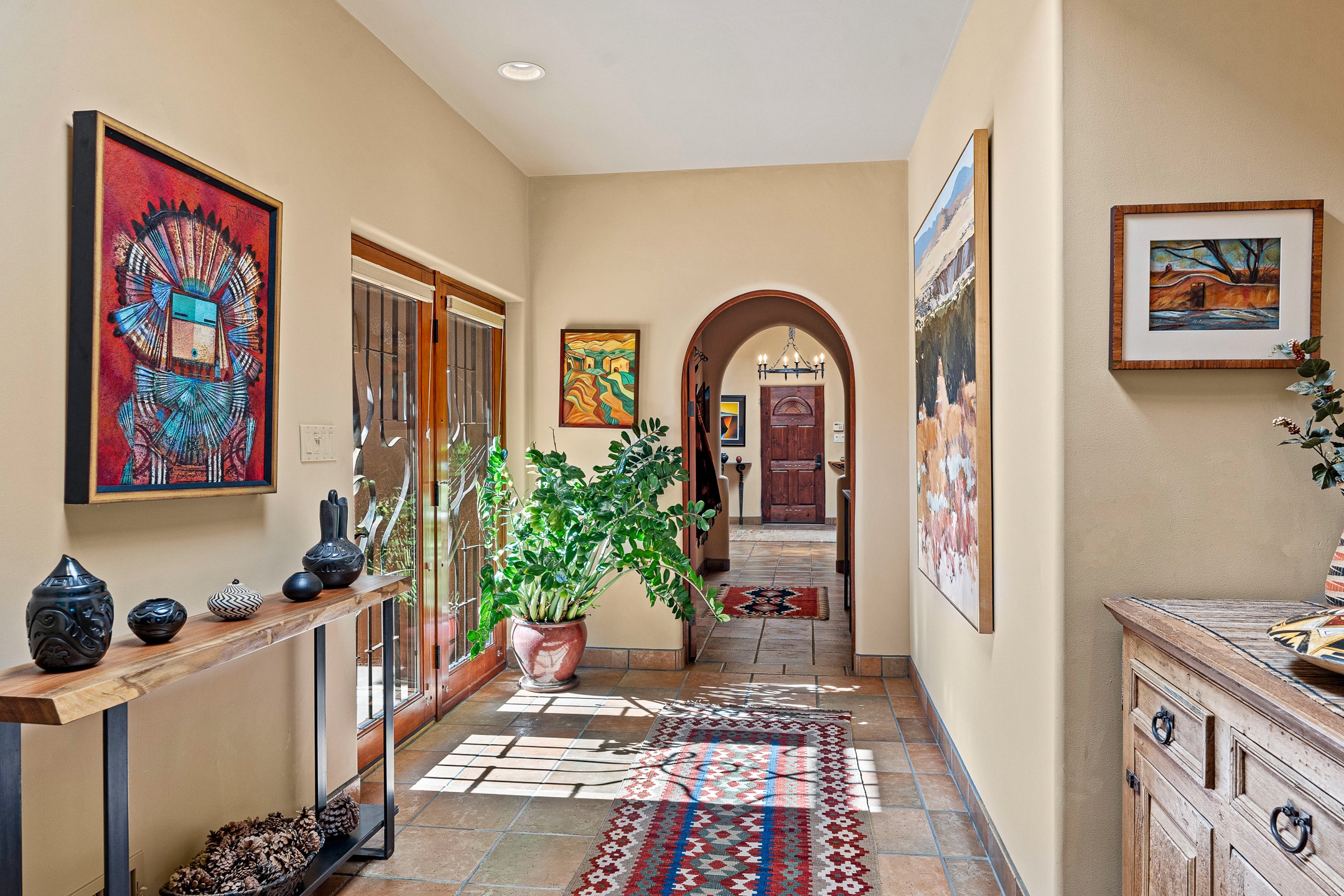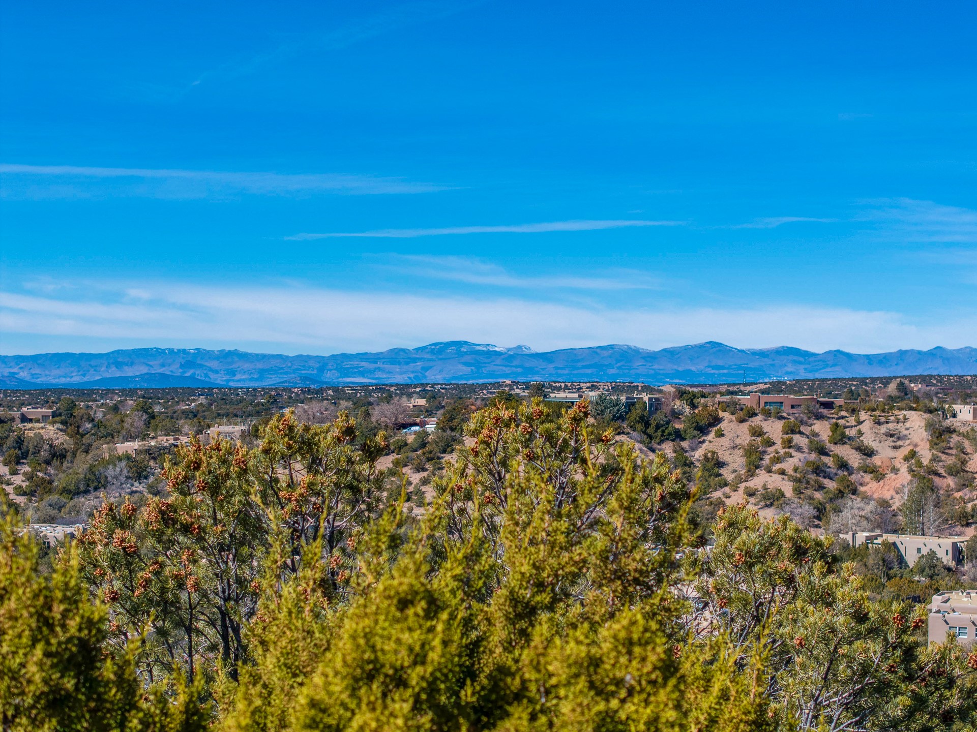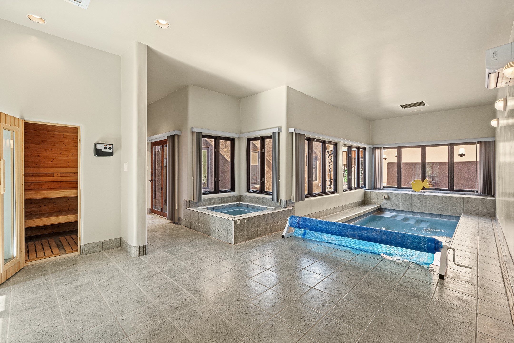 A view-filled Southwestern home on 1.2 acres in the desirable Northeast city limits and just minutes from The Plaza! This warm, single level residence offers four bedrooms, five bathrooms and is a view-filled downtown retreat. Upon arrival, an inviting entry arch, with a traditional bell, ushers you into a world of Southwestern sophistication. The foyer, adorned with high ceilings and wonderful natural light, sets the tone for a home that artfully blends timeless design with modern amenities. The heart of the home is an open-concept living/dining area that is enveloped by the panoramic views of the Jemez mountains. The formal living room features a beautiful gas fireplace and a charming banco designed for sunset views. The adjacent formal dining area seamlessly extends to a west-facing patio, perfect for dining under the Santa Fe skies. The kitchen boasts custom cherry cabinets, an eat-in island, and a cozy breakfast nook for casual family meals. A den provides additional space for a home office or flex room to suit your lifestyle needs. The thoughtfully designed layout includes two expansive bedroom suites--one of which is situated off a private hallway, offering a serene guest casita experience. The main bedroom hallway, with high ceilings and skylights, leads to the primary suite. This private retreat features dual walk-in closets, double vanities, a walk-in shower, and an indulgent soaking tub, creating a spa-like sanctuary. An additional guest bedroom, currently used as an office, includes an ensuite bathroom, while a third room--originally intended as a studio with a water stub-out--offers limitless potential as a creative space or guest room. The surprise of this property is the indoor aquatics room with a heated resistance pool, jacuzzi, sauna, and three-quarter bath. Lovingly maintained, 972 Indian Ridge Rd combines unparalleled views, a wonderful floor plan, and an unbeatable location--perfect for those seeking the ultimate Santa Fe luxury lifestyle.