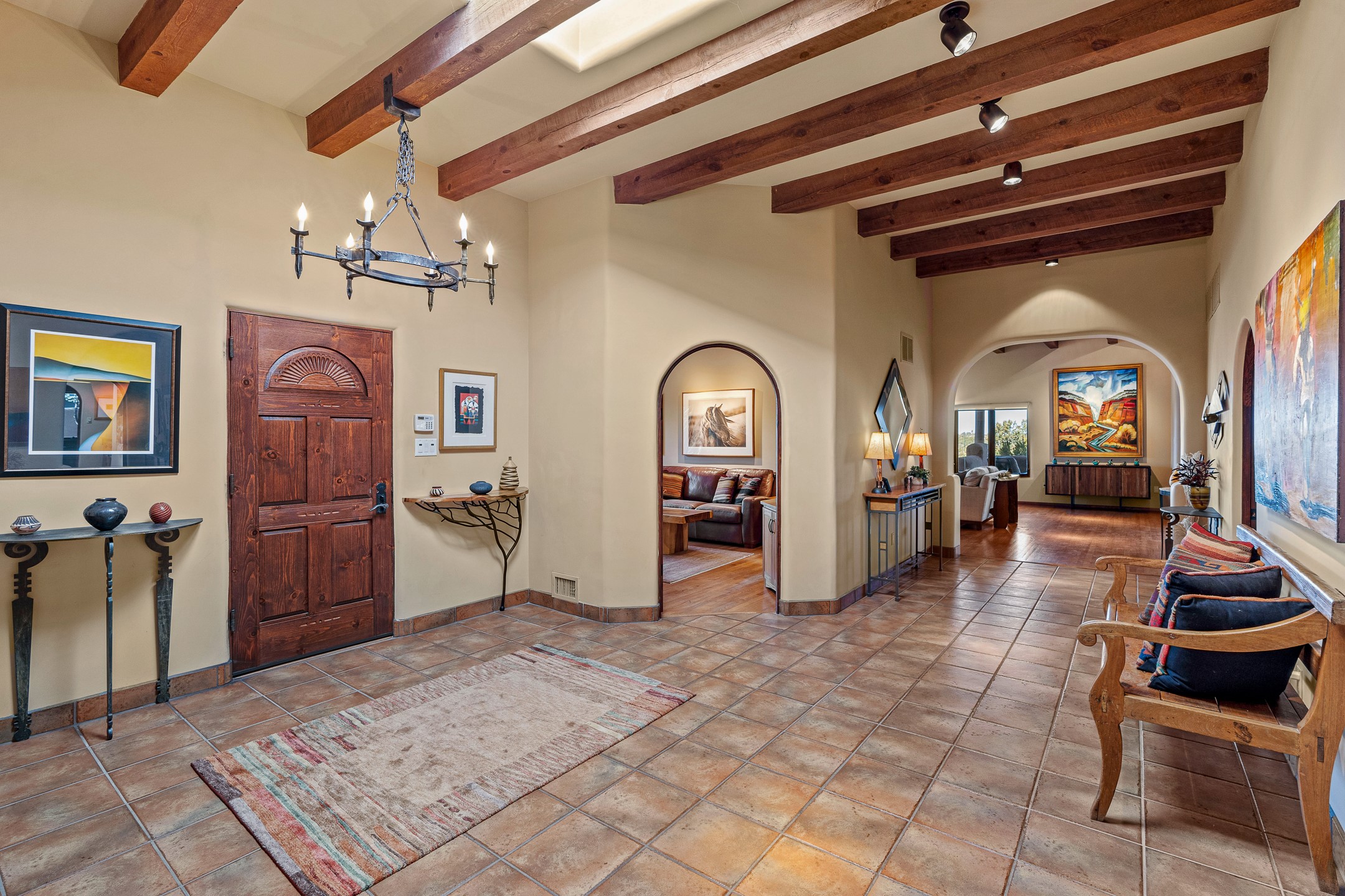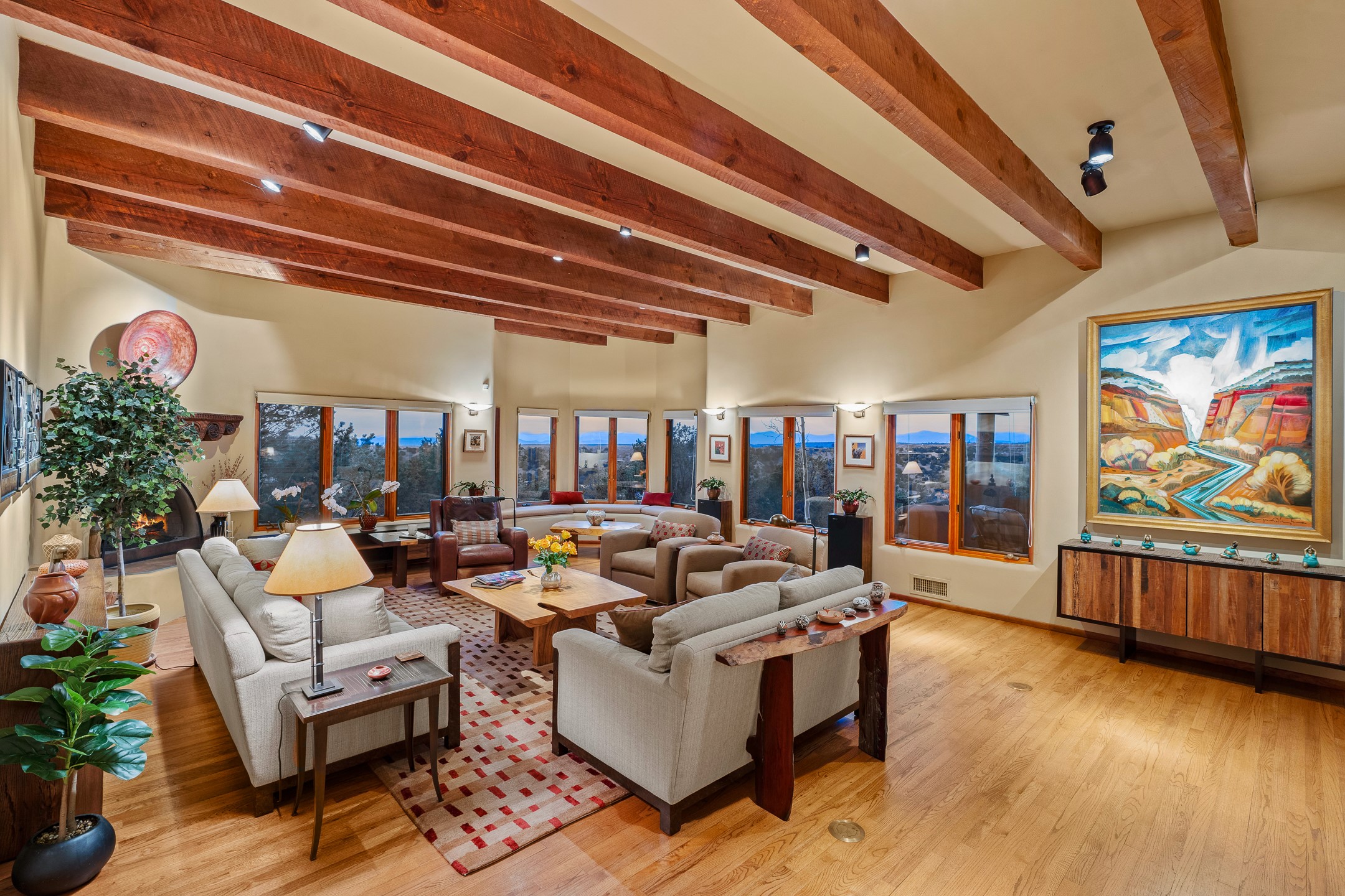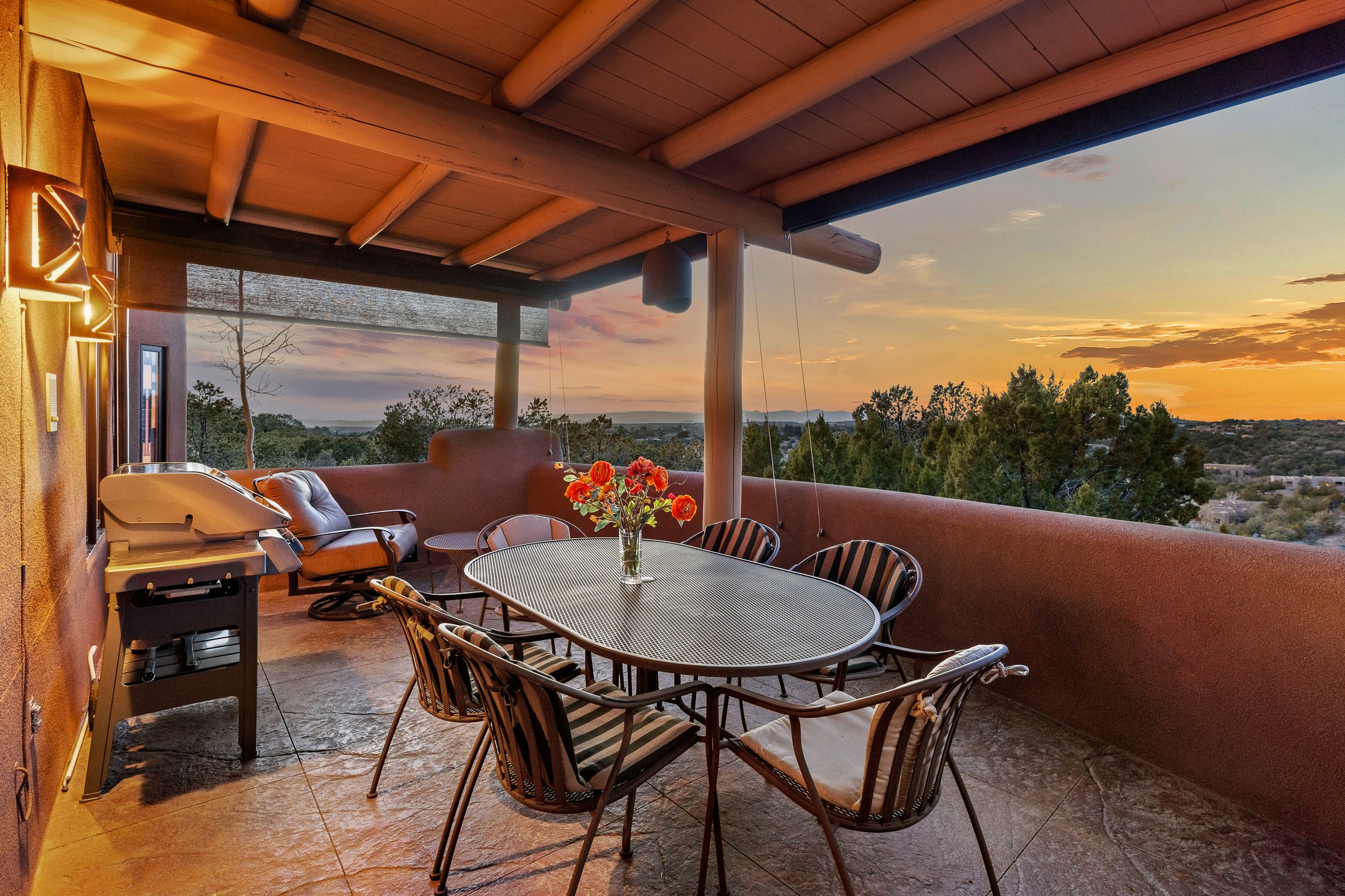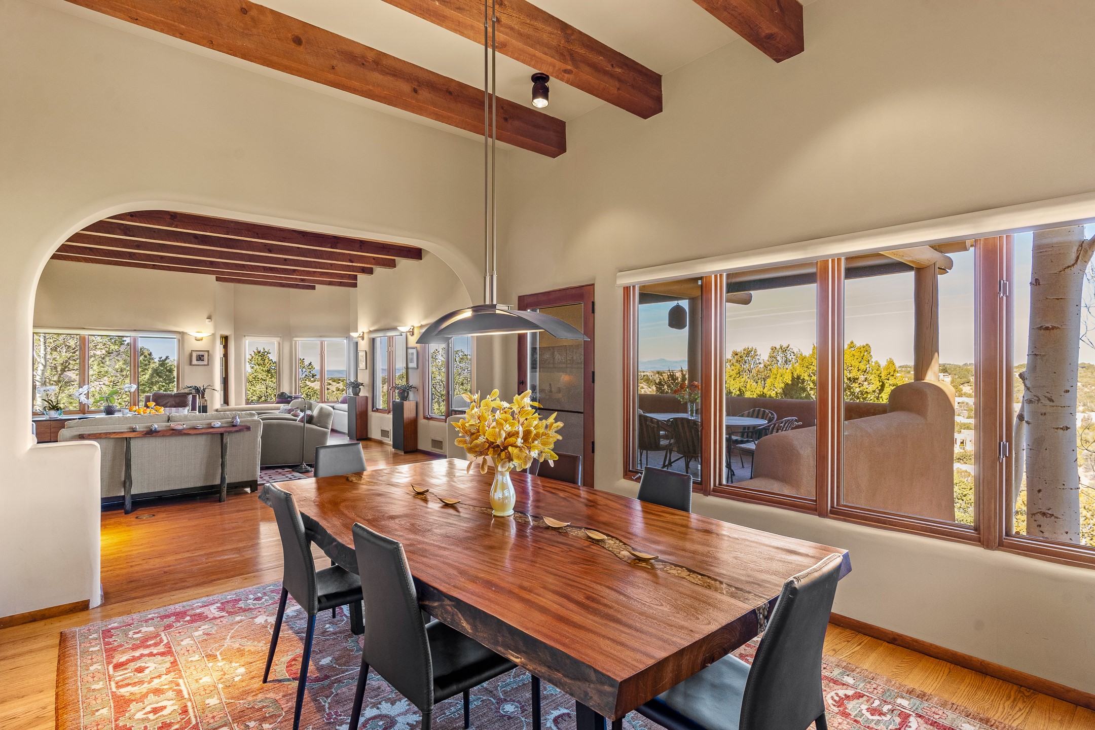 A view-filled Southwestern home on 1.2 acres in the desirable Northeast city limits and just minutes from The Plaza! This warm, single level residence offers four bedrooms, five bathrooms and is a view-filled downtown retreat. Upon arrival, an inviting entry arch, with a traditional bell, ushers you into a world of Southwestern sophistication. The foyer, adorned with high ceilings and wonderful natural light, sets the tone for a home that artfully blends timeless design with modern amenities. The heart of the home is an open-concept living/dining area that is enveloped by the panoramic views of the Jemez mountains. The formal living room features a beautiful gas fireplace and a charming banco designed for sunset views. The adjacent formal dining area seamlessly extends to a west-facing patio, perfect for dining under the Santa Fe skies. The kitchen boasts custom cherry cabinets, an eat-in island, and a cozy breakfast nook for casual family meals. A den provides additional space for a home office or flex room to suit your lifestyle needs. The thoughtfully designed layout includes two expansive bedroom suites--one of which is situated off a private hallway, offering a serene guest casita experience. The main bedroom hallway, with high ceilings and skylights, leads to the primary suite. This private retreat features dual walk-in closets, double vanities, a walk-in shower, and an indulgent soaking tub, creating a spa-like sanctuary. An additional guest bedroom, currently used as an office, includes an ensuite bathroom, while a third room--originally intended as a studio with a water stub-out--offers limitless potential as a creative space or guest room. The surprise of this property is the indoor aquatics room with a heated resistance pool, jacuzzi, sauna, and three-quarter bath. Lovingly maintained, 972 Indian Ridge Rd combines unparalleled views, a wonderful floor plan, and an unbeatable location--perfect for those seeking the ultimate Santa Fe luxury lifestyle.