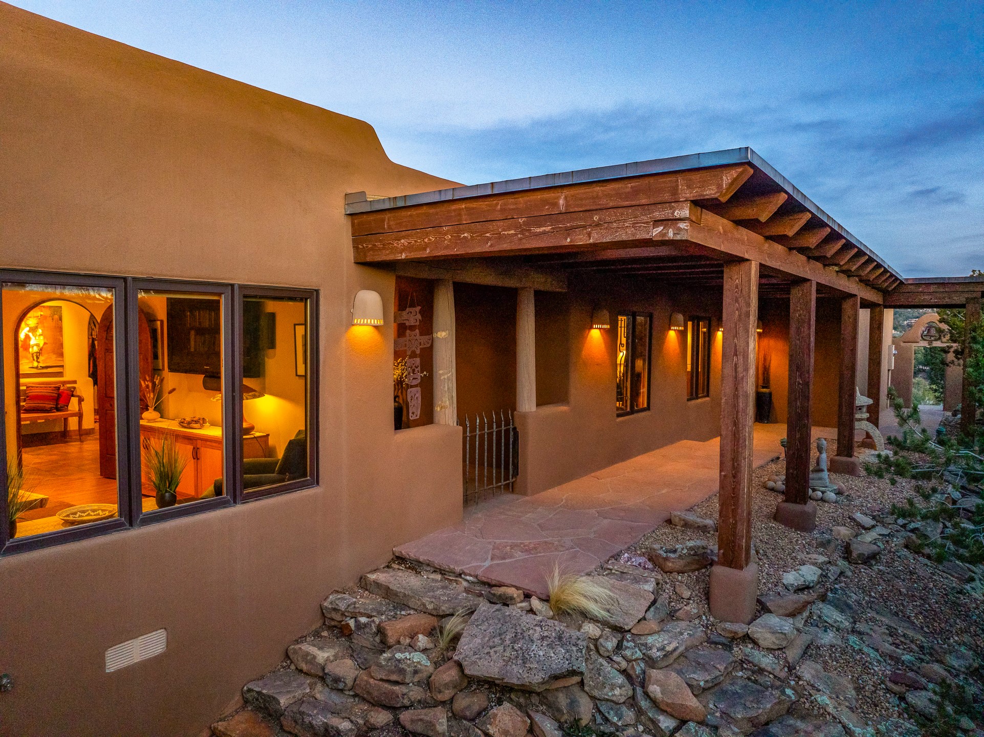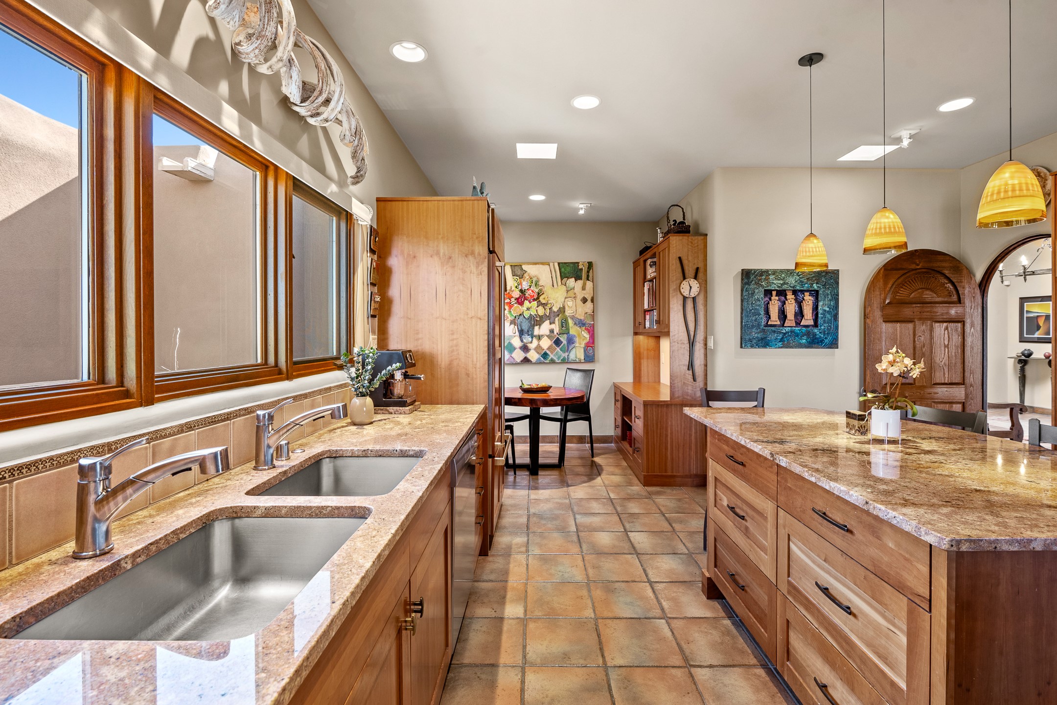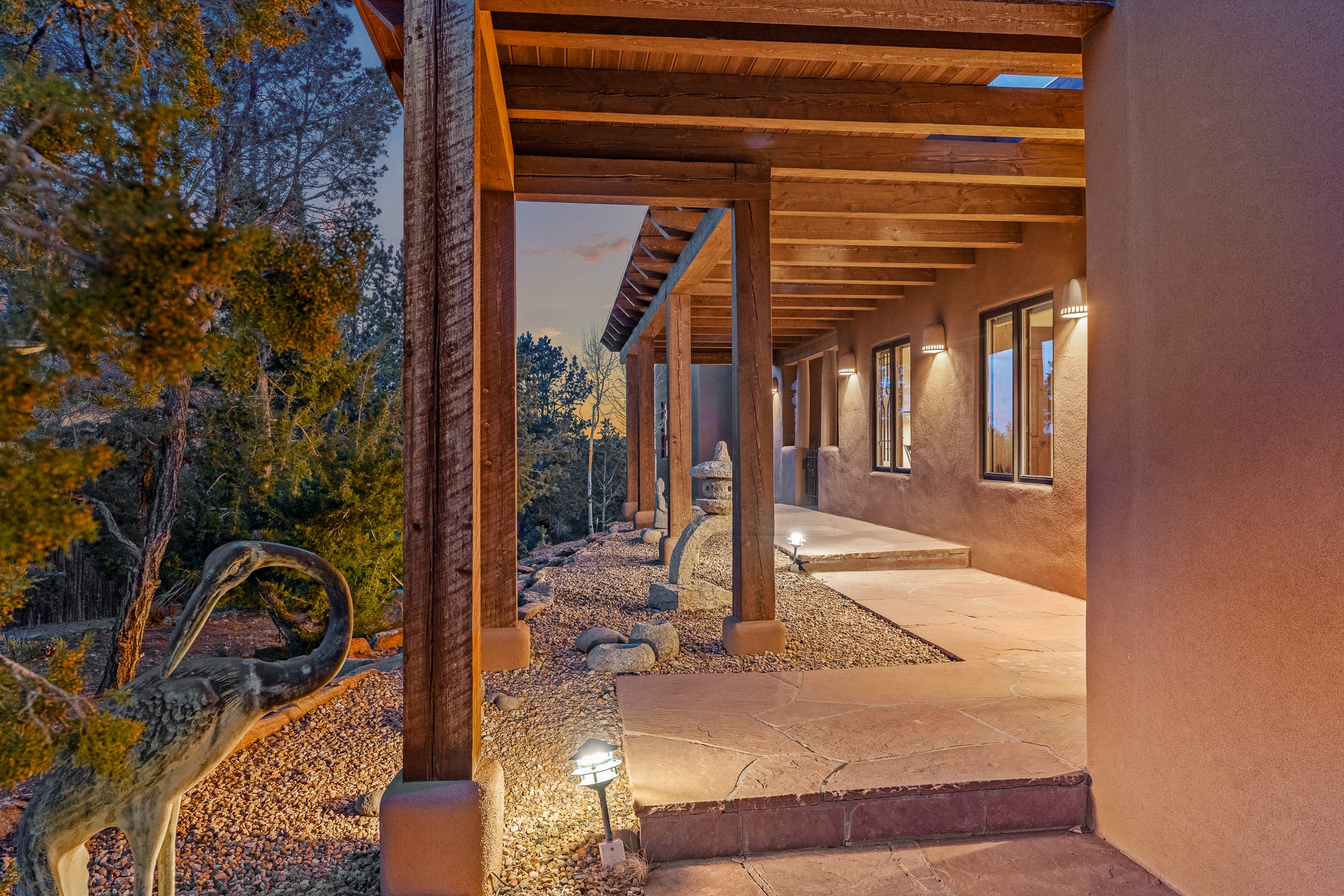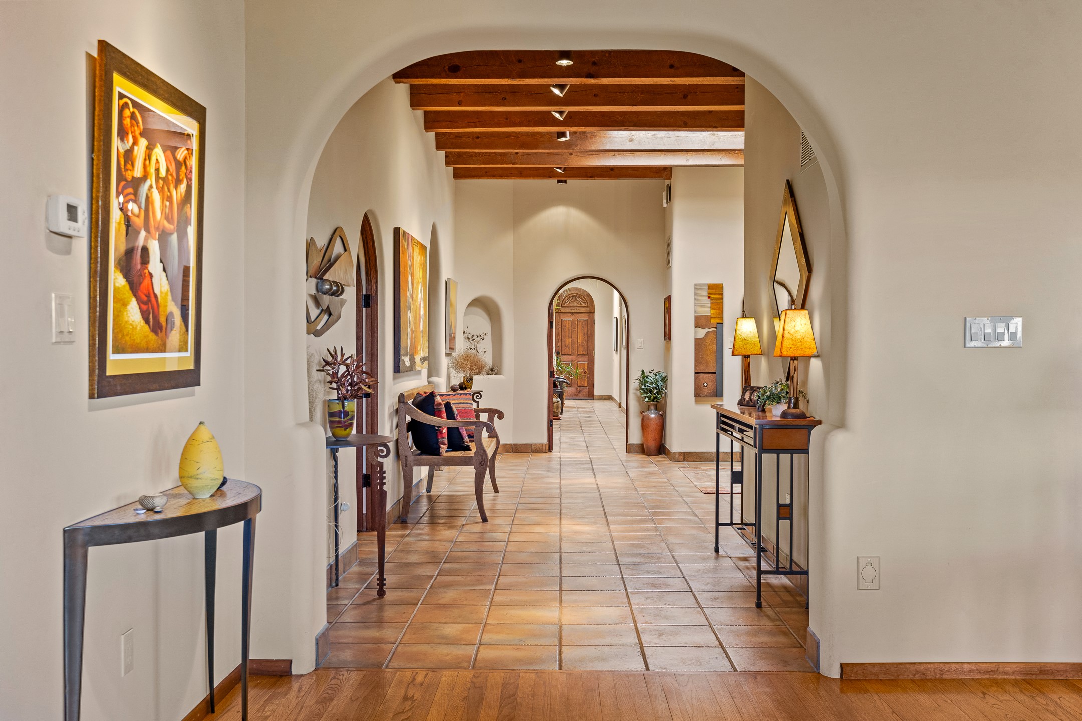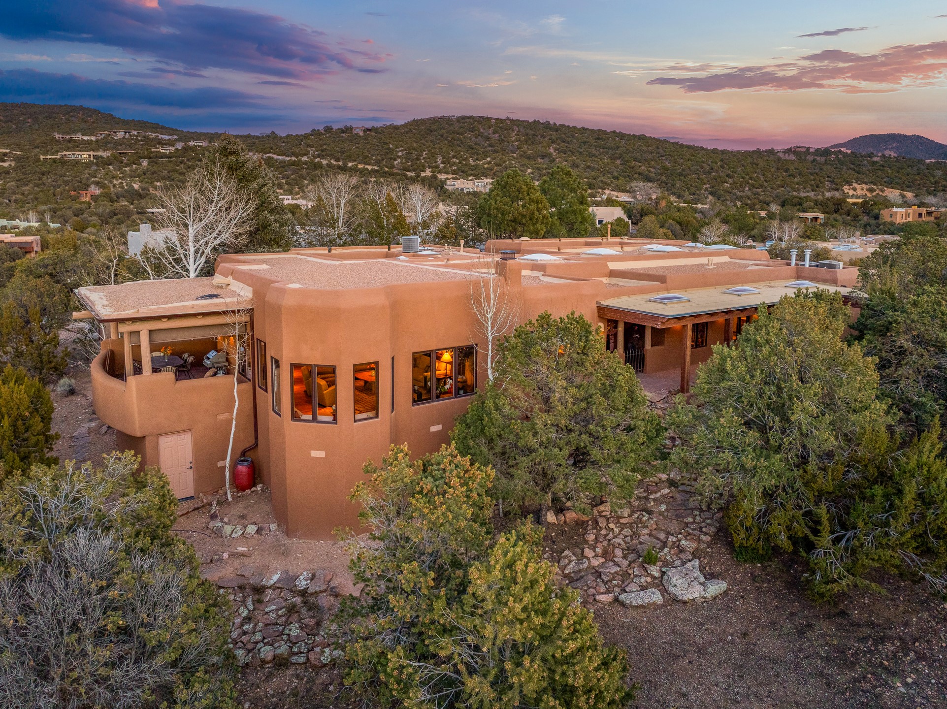 A view-filled Southwestern home on 1.2 acres in the desirable Northeast city limits and just minutes from The Plaza! This warm, single level residence offers four bedrooms, five bathrooms and is a view-filled downtown retreat. Upon arrival, an inviting entry arch, with a traditional bell, ushers you into a world of Southwestern sophistication. The foyer, adorned with high ceilings and wonderful natural light, sets the tone for a home that artfully blends timeless design with modern amenities. The heart of the home is an open-concept living/dining area that is enveloped by the panoramic views of the Jemez mountains. The formal living room features a beautiful gas fireplace and a charming banco designed for sunset views. The adjacent formal dining area seamlessly extends to a west-facing patio, perfect for dining under the Santa Fe skies. The kitchen boasts custom cherry cabinets, an eat-in island, and a cozy breakfast nook for casual family meals. A den provides additional space for a home office or flex room to suit your lifestyle needs. The thoughtfully designed layout includes two expansive bedroom suites--one of which is situated off a private hallway, offering a serene guest casita experience. The main bedroom hallway, with high ceilings and skylights, leads to the primary suite. This private retreat features dual walk-in closets, double vanities, a walk-in shower, and an indulgent soaking tub, creating a spa-like sanctuary. An additional guest bedroom, currently used as an office, includes an ensuite bathroom, while a third room--originally intended as a studio with a water stub-out--offers limitless potential as a creative space or guest room. The surprise of this property is the indoor aquatics room with a heated resistance pool, jacuzzi, sauna, and three-quarter bath. Lovingly maintained, 972 Indian Ridge Rd combines unparalleled views, a wonderful floor plan, and an unbeatable location--perfect for those seeking the ultimate Santa Fe luxury lifestyle.