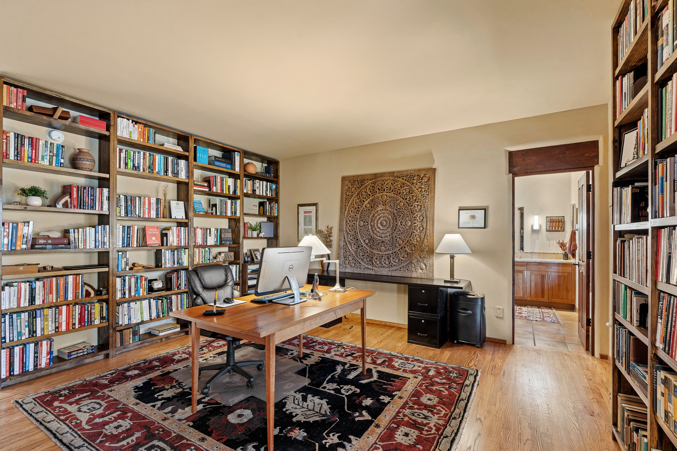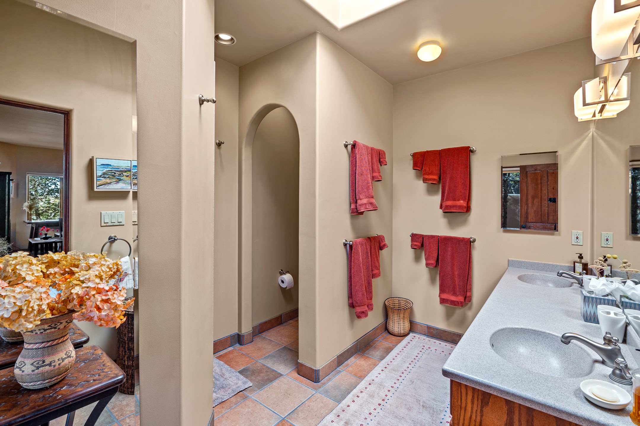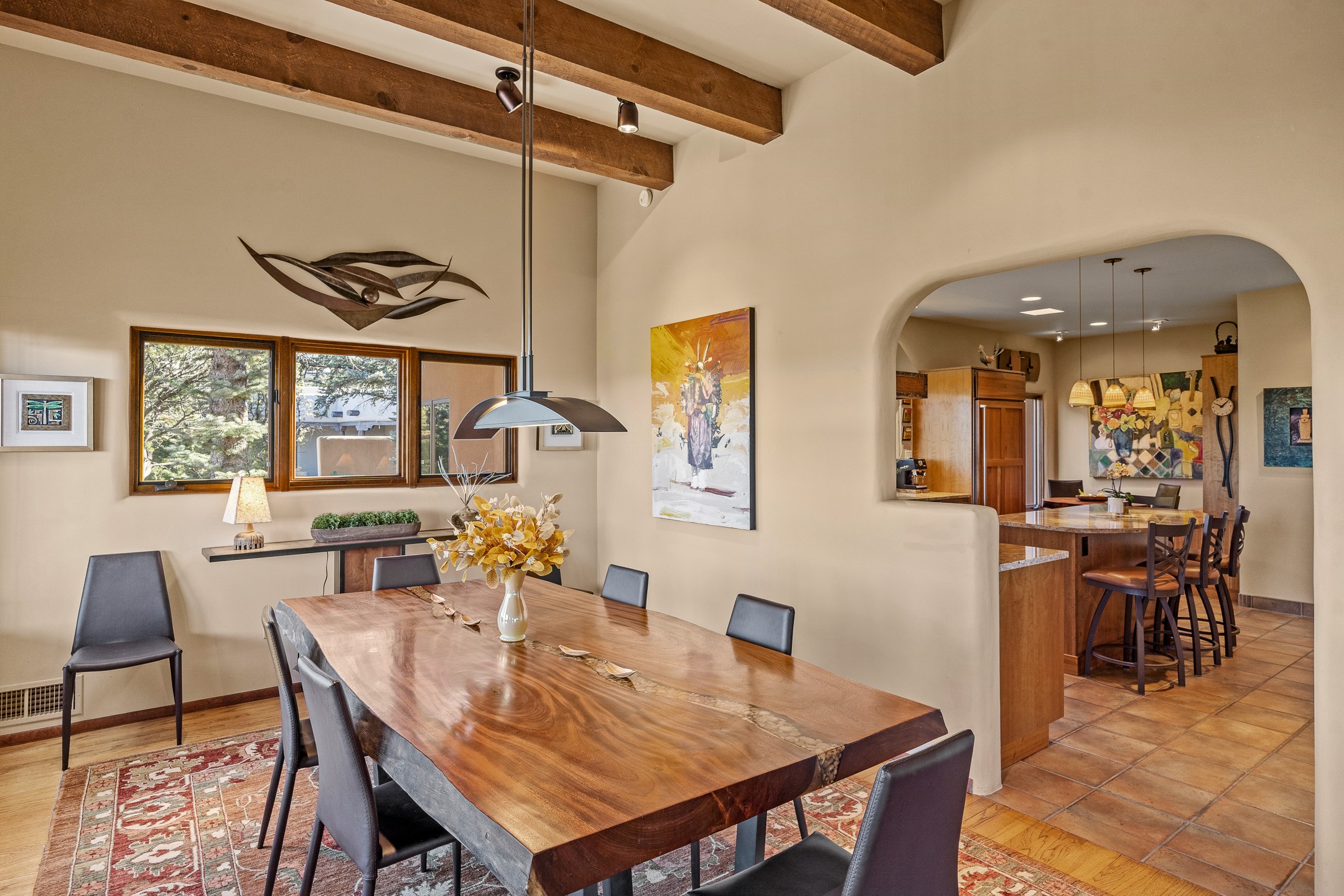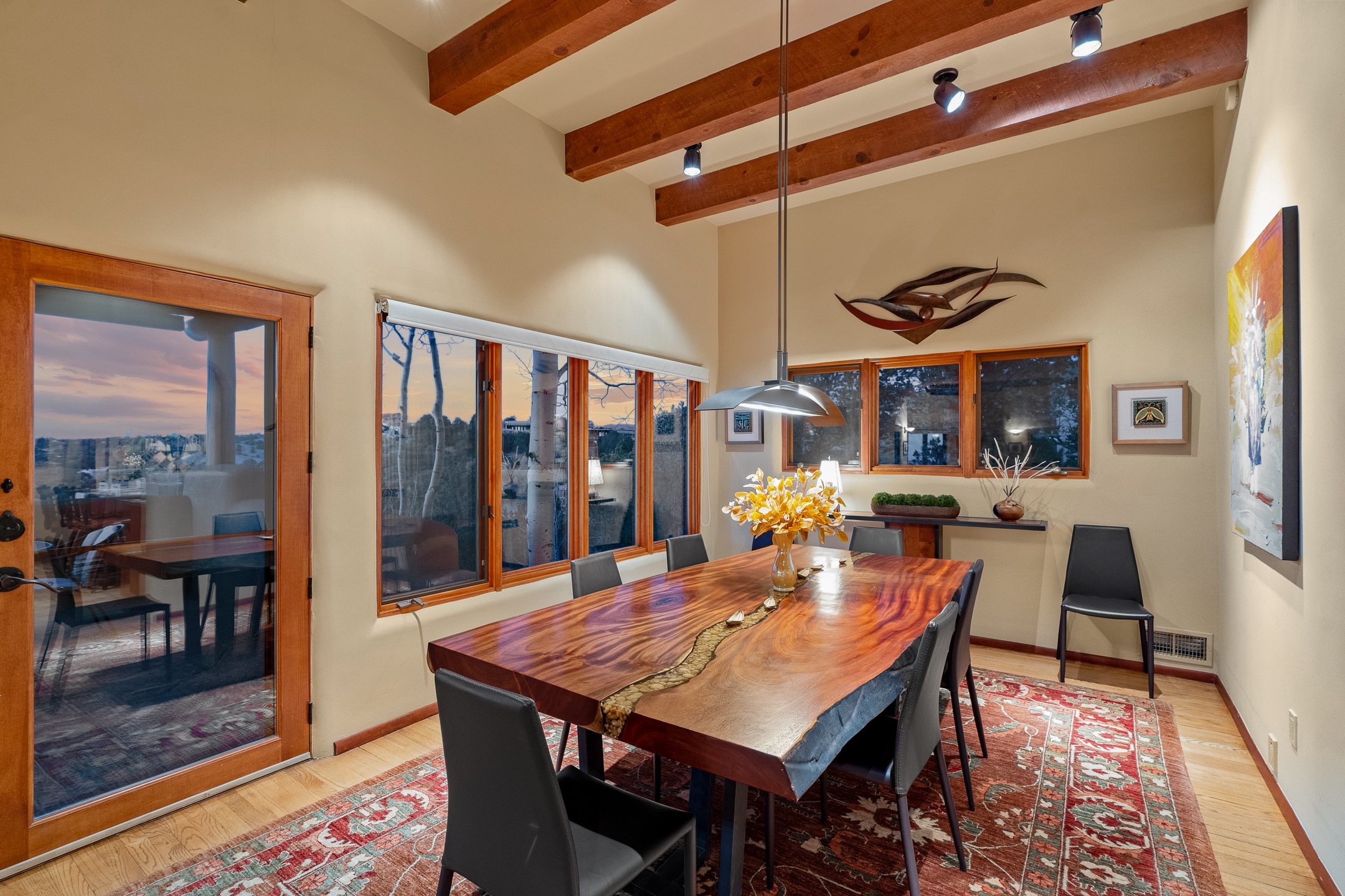A view-filled Southwestern home on 1.2 acres in the desirable Northeast city limits and just minutes from The Plaza! This warm, single level residence offers four bedrooms, five bathrooms and is a view-filled downtown retreat. Upon arrival, an inviting entry arch, with a traditional bell, ushers you into a world of Southwestern sophistication. The foyer, adorned with high ceilings and wonderful natural light, sets the tone for a home that artfully blends timeless design with modern amenities. The heart of the home is an open-concept living/dining area that is enveloped by the panoramic views of the Jemez mountains. The formal living room features a beautiful gas fireplace and a charming banco designed for sunset views. The adjacent formal dining area seamlessly extends to a west-facing patio, perfect for dining under the Santa Fe skies. The kitchen boasts custom cherry cabinets, an eat-in island, and a cozy breakfast nook for casual family meals. A den provides additional space for a home office or flex room to suit your lifestyle needs. The thoughtfully designed layout includes two expansive bedroom suites--one of which is situated off a private hallway, offering a serene guest casita experience. The main bedroom hallway, with high ceilings and skylights, leads to the primary suite. This private retreat features dual walk-in closets, double vanities, a walk-in shower, and an indulgent soaking tub, creating a spa-like sanctuary. An additional guest bedroom, currently used as an office, includes an ensuite bathroom, while a third room--originally intended as a studio with a water stub-out--offers limitless potential as a creative space or guest room. The surprise of this property is the indoor aquatics room with a heated resistance pool, jacuzzi, sauna, and three-quarter bath. Lovingly maintained, 972 Indian Ridge Rd combines unparalleled views, a wonderful floor plan, and an unbeatable location--perfect for those seeking the ultimate Santa Fe luxury lifestyle.