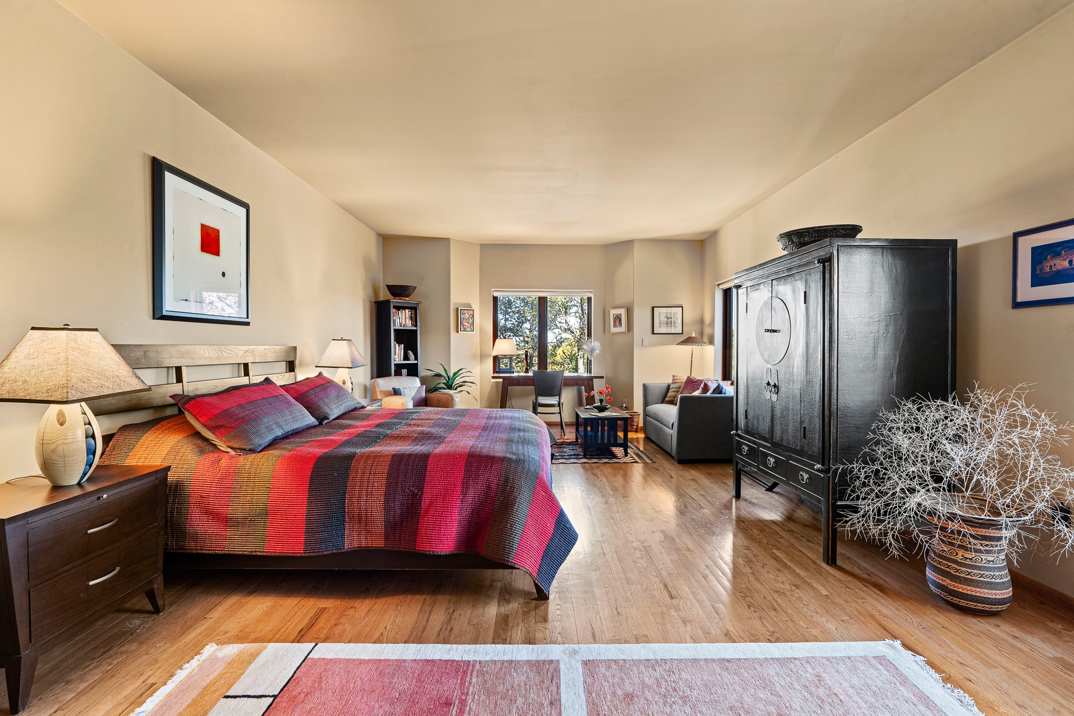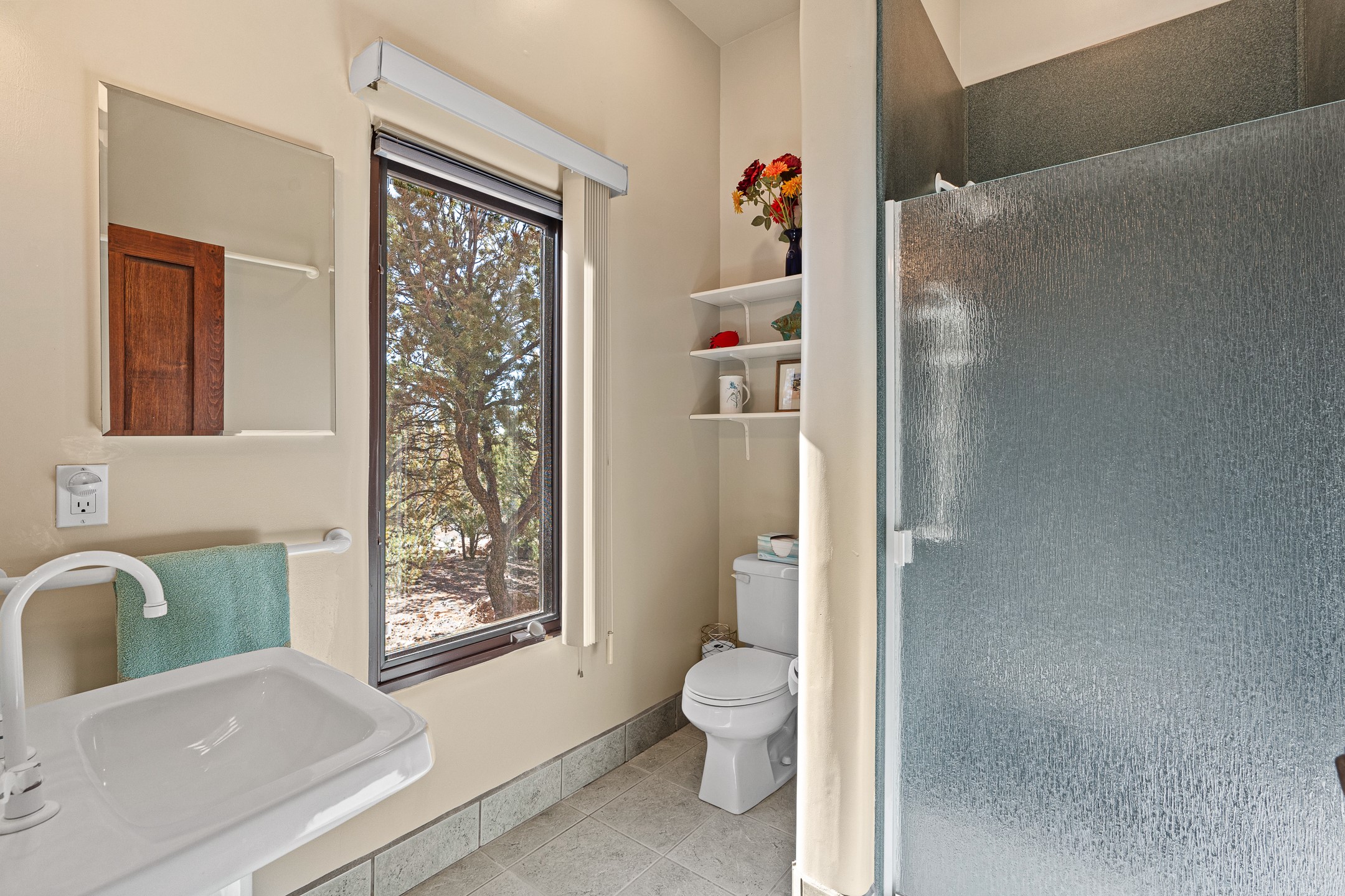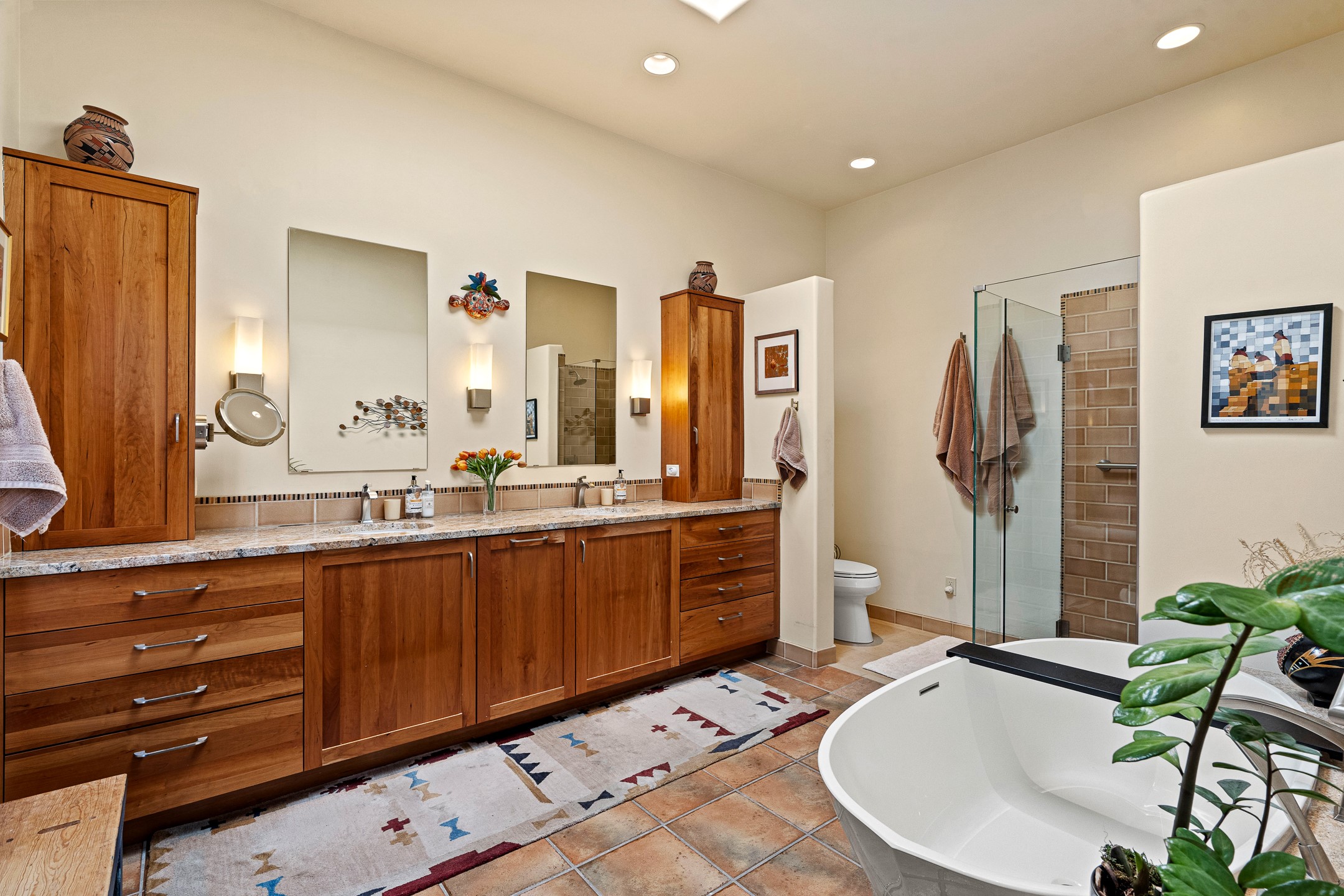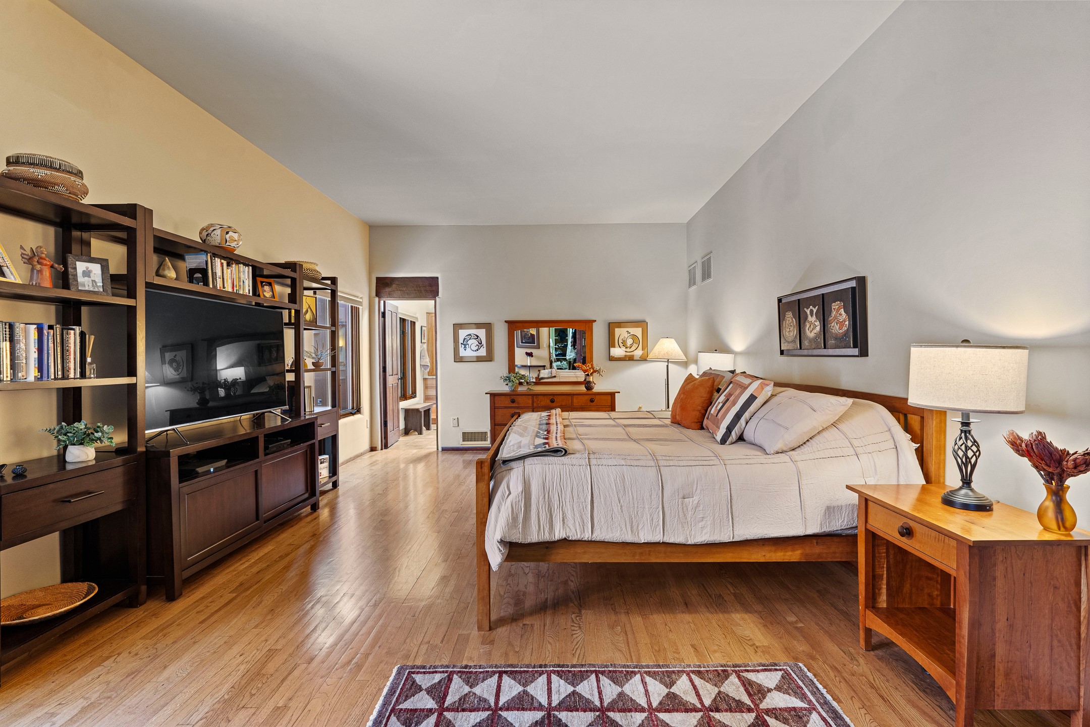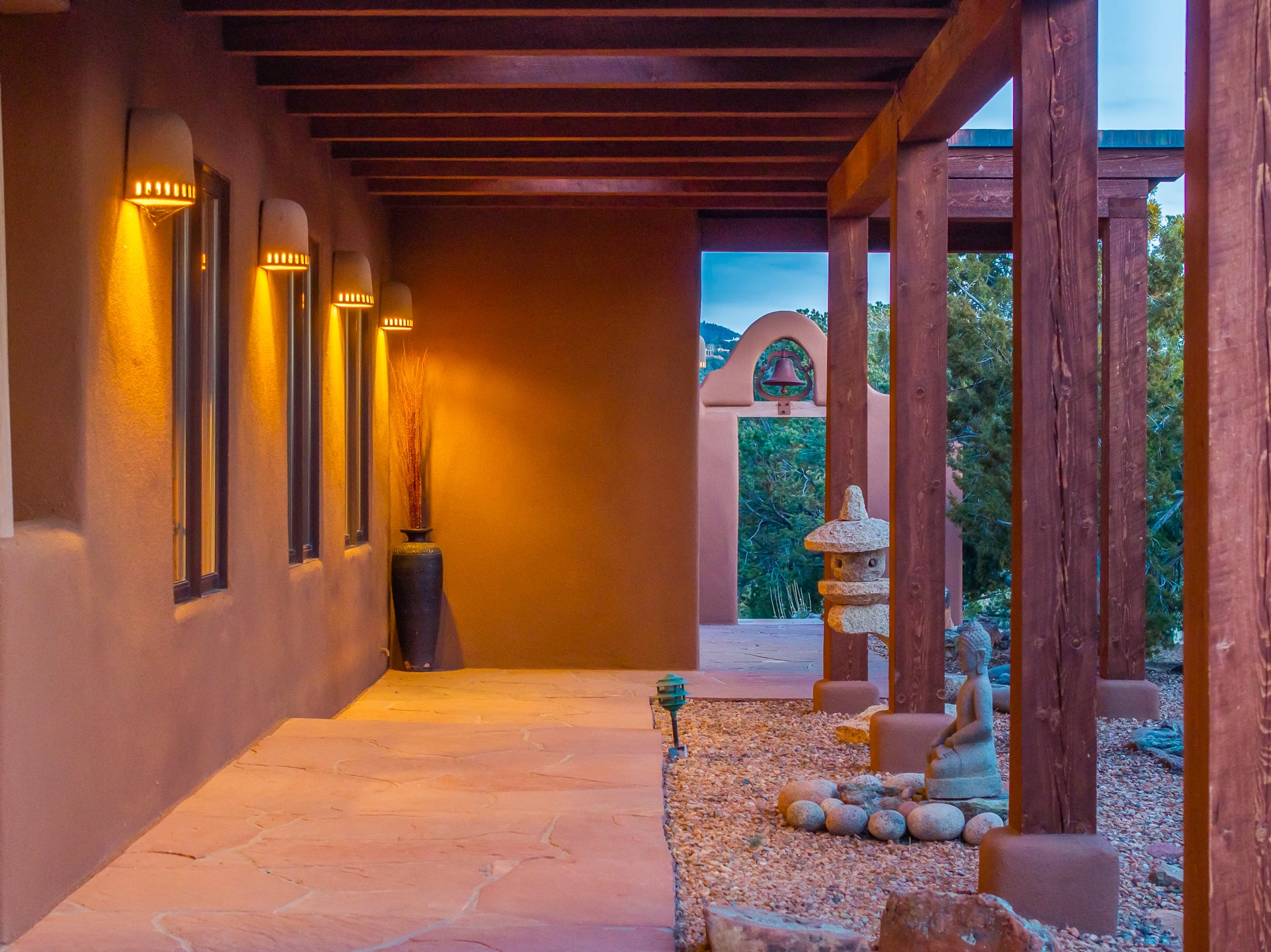 A view-filled Southwestern home on 1.2 acres in the desirable Northeast city limits and just minutes from The Plaza! This warm, single level residence offers four bedrooms, five bathrooms and is a view-filled downtown retreat. Upon arrival, an inviting entry arch, with a traditional bell, ushers you into a world of Southwestern sophistication. The foyer, adorned with high ceilings and wonderful natural light, sets the tone for a home that artfully blends timeless design with modern amenities. The heart of the home is an open-concept living/dining area that is enveloped by the panoramic views of the Jemez mountains. The formal living room features a beautiful gas fireplace and a charming banco designed for sunset views. The adjacent formal dining area seamlessly extends to a west-facing patio, perfect for dining under the Santa Fe skies. The kitchen boasts custom cherry cabinets, an eat-in island, and a cozy breakfast nook for casual family meals. A den provides additional space for a home office or flex room to suit your lifestyle needs. The thoughtfully designed layout includes two expansive bedroom suites--one of which is situated off a private hallway, offering a serene guest casita experience. The main bedroom hallway, with high ceilings and skylights, leads to the primary suite. This private retreat features dual walk-in closets, double vanities, a walk-in shower, and an indulgent soaking tub, creating a spa-like sanctuary. An additional guest bedroom, currently used as an office, includes an ensuite bathroom, while a third room--originally intended as a studio with a water stub-out--offers limitless potential as a creative space or guest room. The surprise of this property is the indoor aquatics room with a heated resistance pool, jacuzzi, sauna, and three-quarter bath. Lovingly maintained, 972 Indian Ridge Rd combines unparalleled views, a wonderful floor plan, and an unbeatable location--perfect for those seeking the ultimate Santa Fe luxury lifestyle.