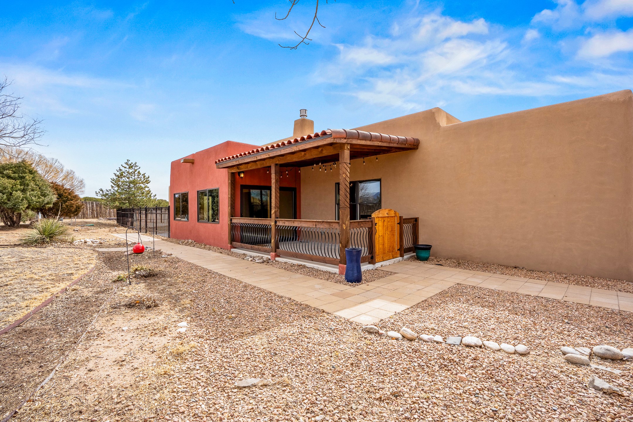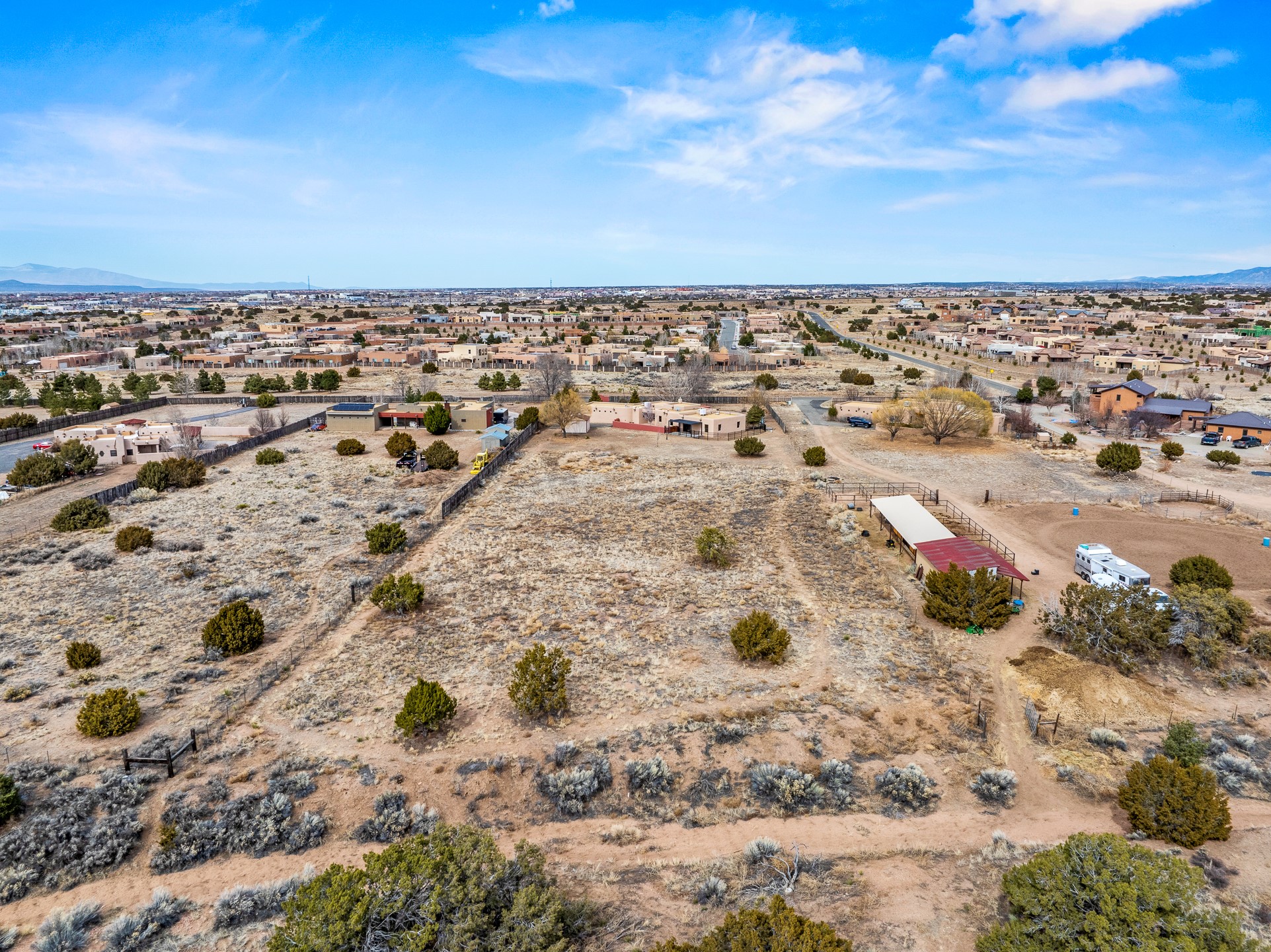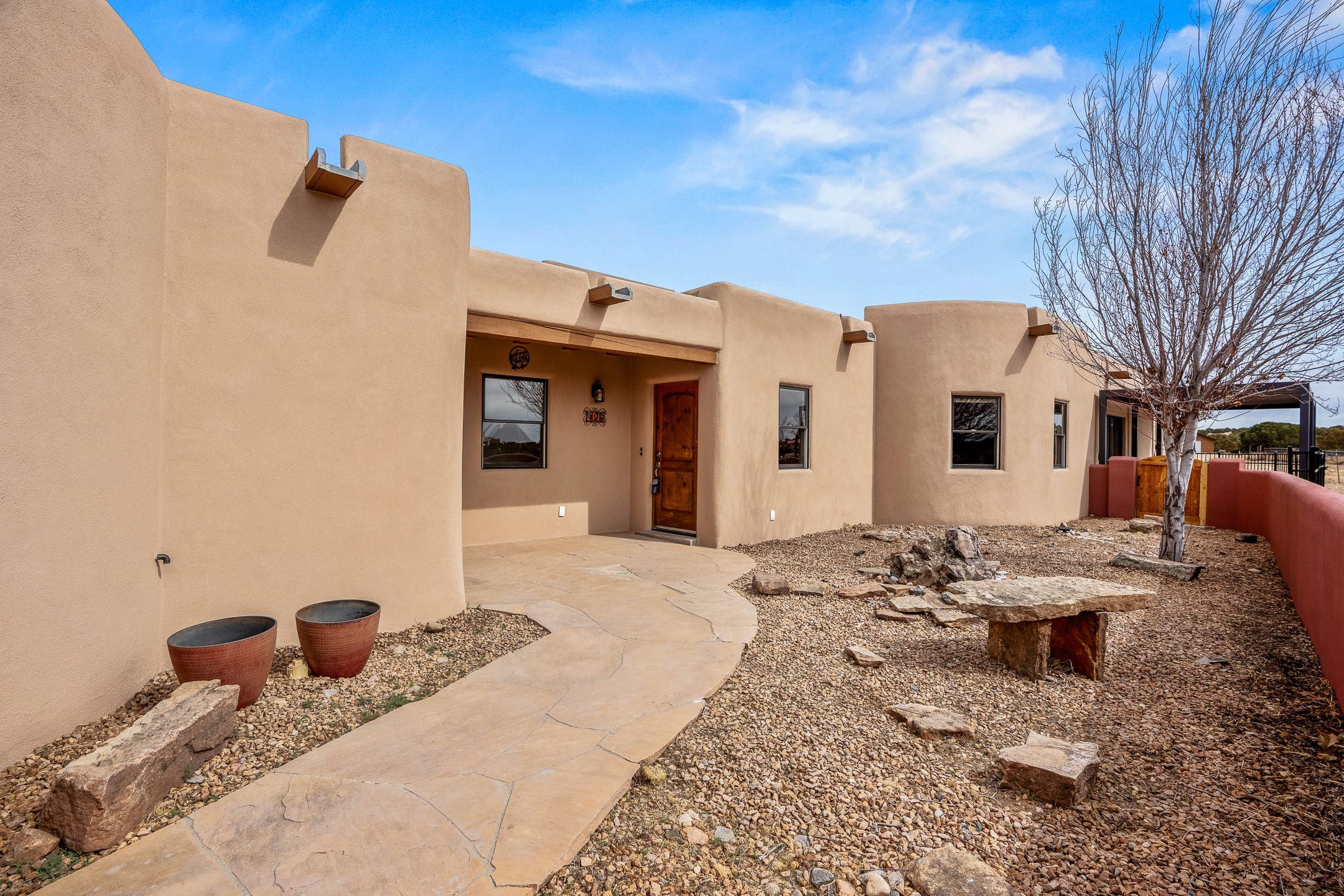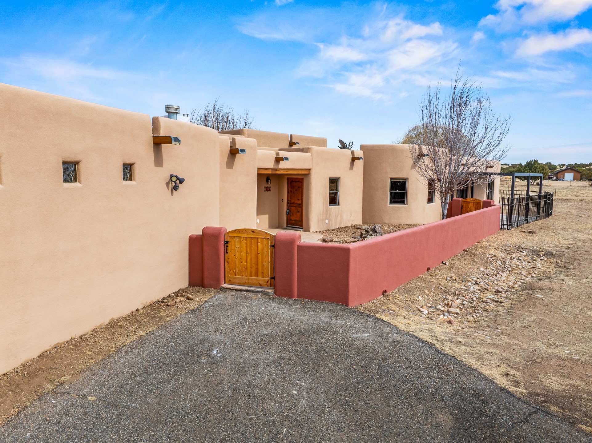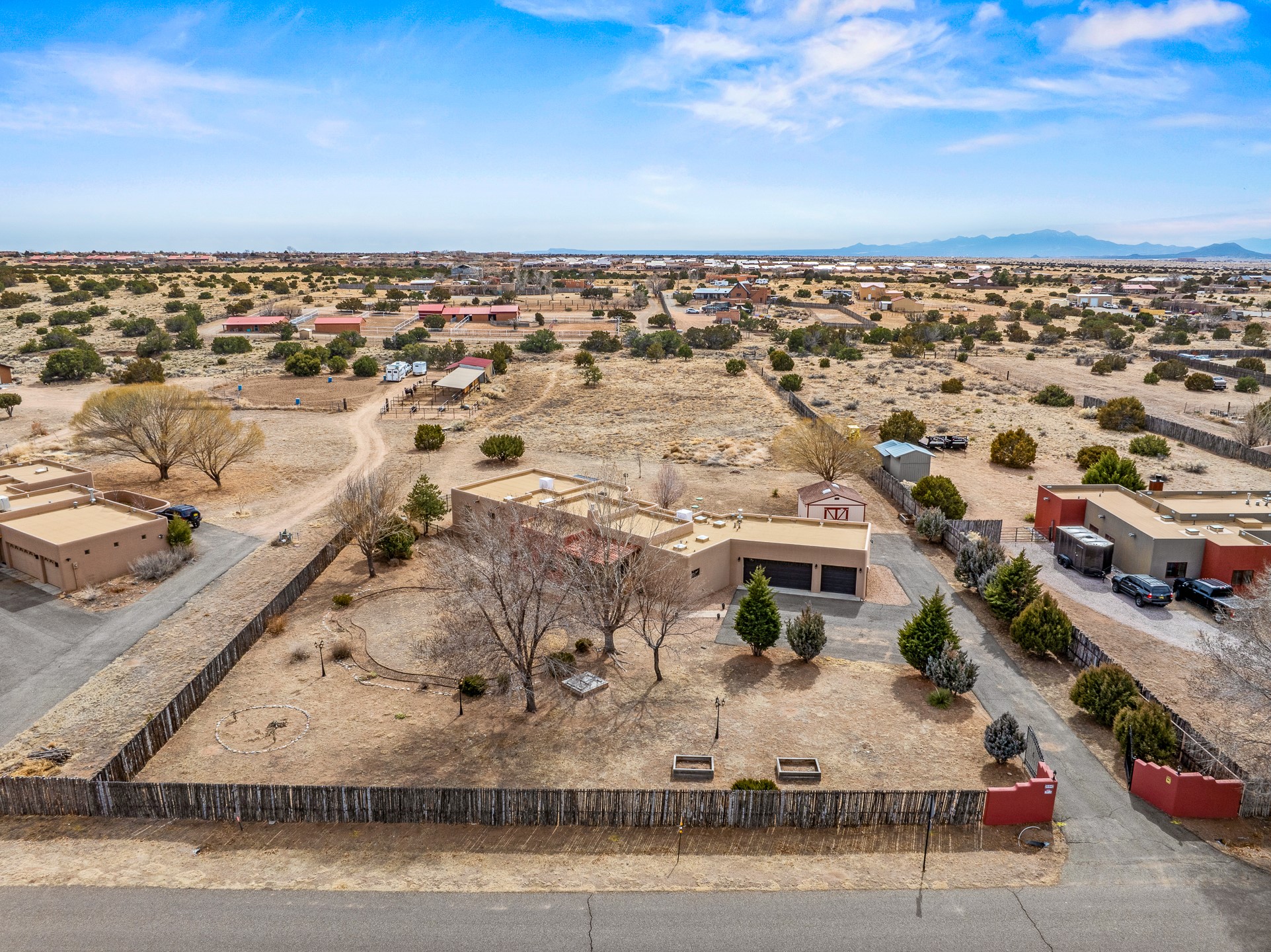 This beautiful single-level home boasts a spacious 2,727 +/- square foot split-bedroom floor plan with 4 bedrooms, a sunroom, 3 full baths, and a 3-car garage. 2025: home has been appx 80% re-stuccoed, & is situated on a fenced & gated 2.5-acre lot with breathtaking mountain views in all directions, offering a serene rural setting allowing horses, no HOA, just minutes from hospitals, restaurants, & grocery stores. The large kitchen is a chef's dream, featuring NEW MOSAIC TILE BACKSPLASH, abundant cabinetry & drawers for ample storage, granite countertops, an island/breakfast bar, pantry and stainless-steel appliances. Adjacent to the kitchen is the formal dining room with tiled accents and plaster finished wall/ceiling. The grand living room impresses with high ceilings, vigas, can lighting, and a REMODELED GAS FIREPLACE WITH MANTLE. From the living room, step into the NEW SUNROOM, which opens to a NEW COVERED PORCH perfect for relaxing & enjoying the views. The spacious owner's suite has NEW ENGINEERED WOOD FLOORING, walk-in closet with built-ins, vigas with tongue & groove ceiling and a ceiling fan. The ensuite bath has a NEW TUB, NEW LOVELY TILED SHOWER, AND NEW DOUBLE SINK VANITY. Additional bedrooms are thoughtfully designed with ample space & functionality. The hall bath has been updated with a NEW VANITY, while the laundry room, complete with plentiful cabinets and drawers, a skylight, and an NEWELY ADDED SINK, offers convenience and style. Many wonderful features and amenities include: Radiant heat-2 Evaporative cooling units-Tons of skylights-Wood doors-NEW PERGOLA-NEW 16X16 TUFF SHED (13K)-Plaster finish walls-Hunter Douglas blinds-Ceiling fans-NEW BRICK TILED ACCENT WALLS in hallway-Plenty of wall space for artwork-FRESHLY PAINTED INTERIOR (Almost every room)-Multiple covered enclosed patios, perfect for outdoor living, and entertaining. This property combines comfort and functionality with stunning views. Please read agent only remarks.