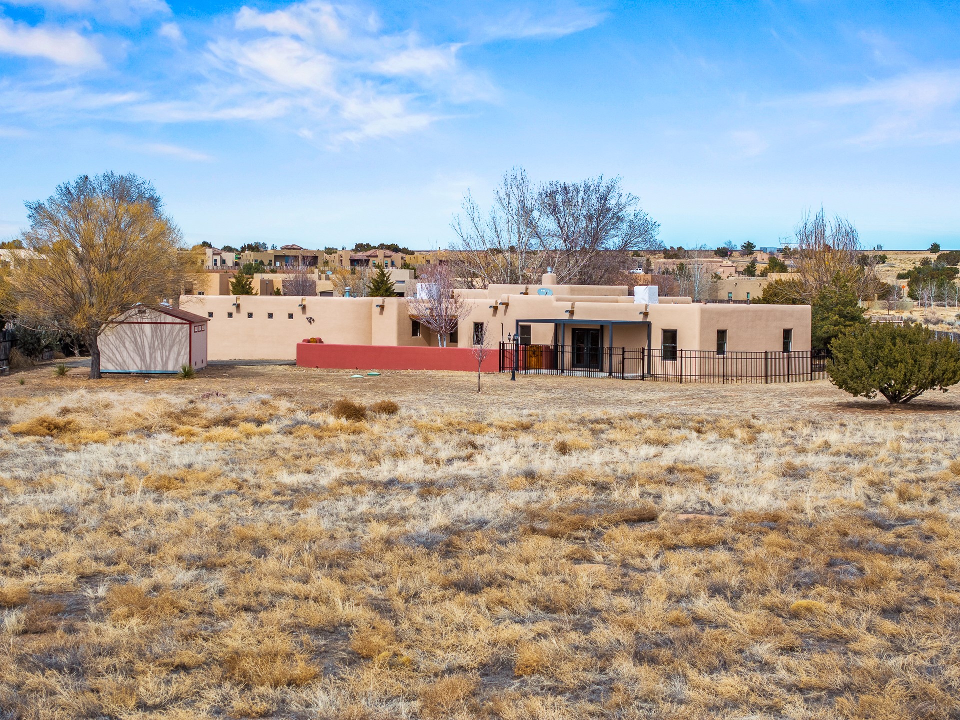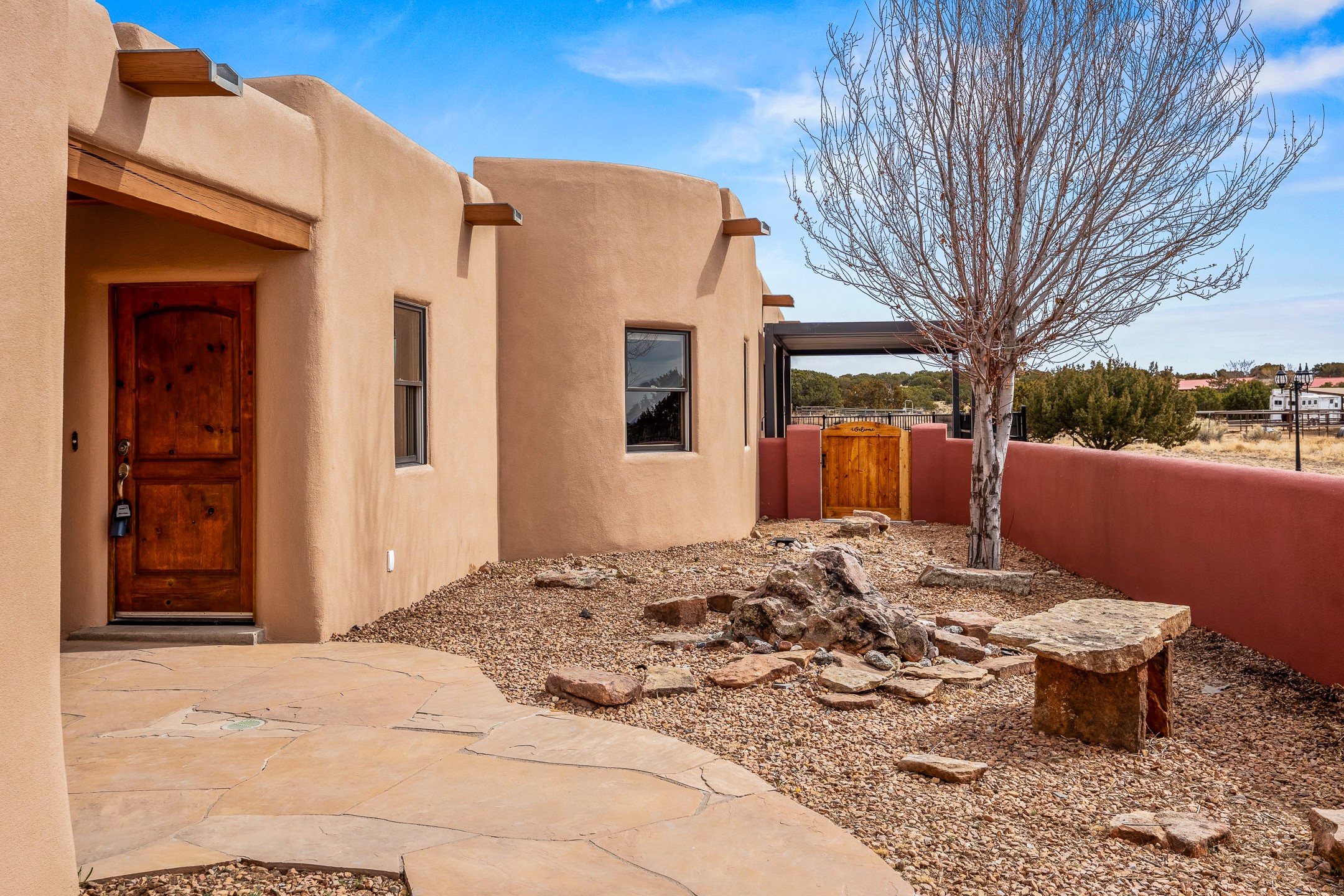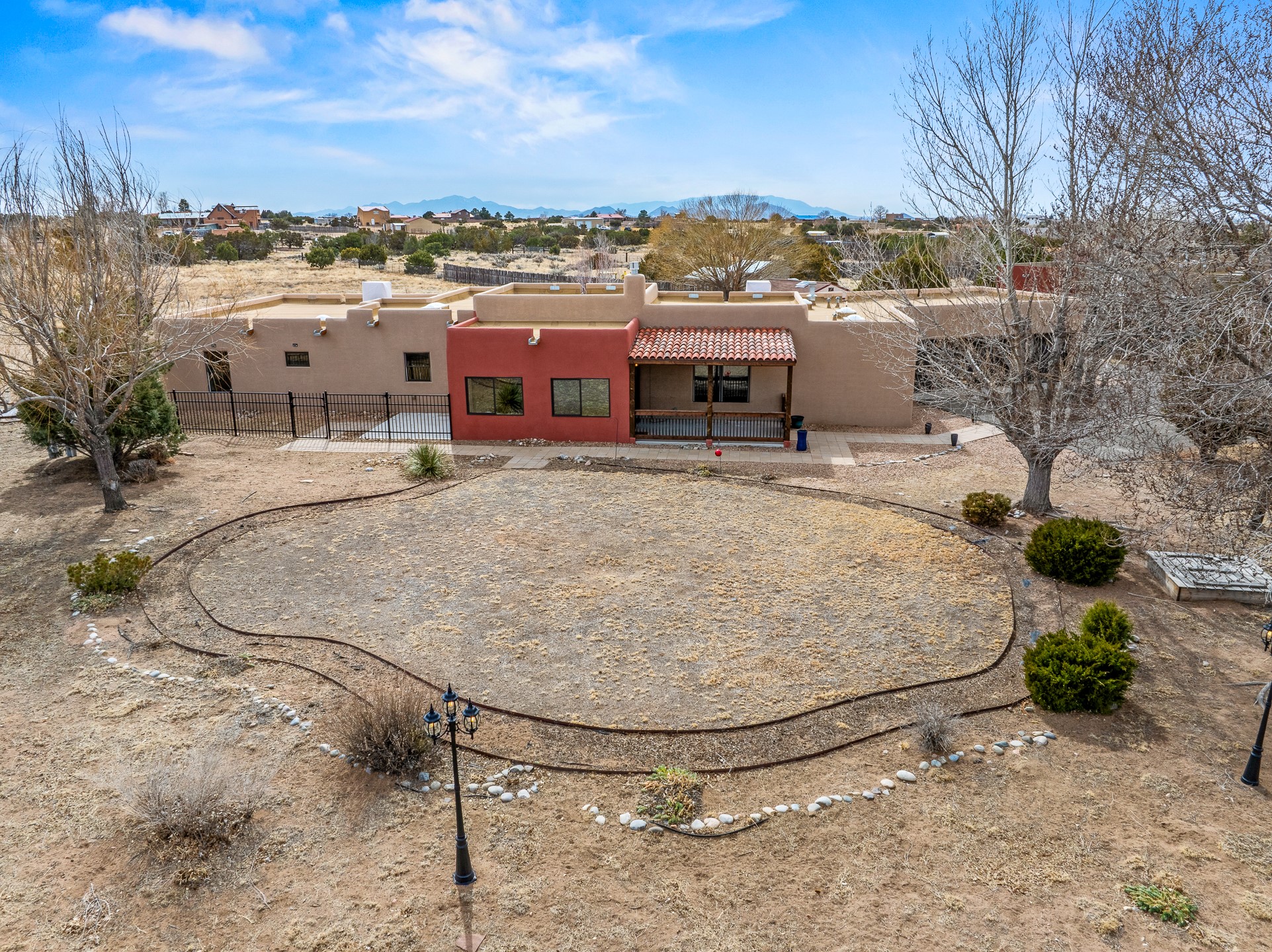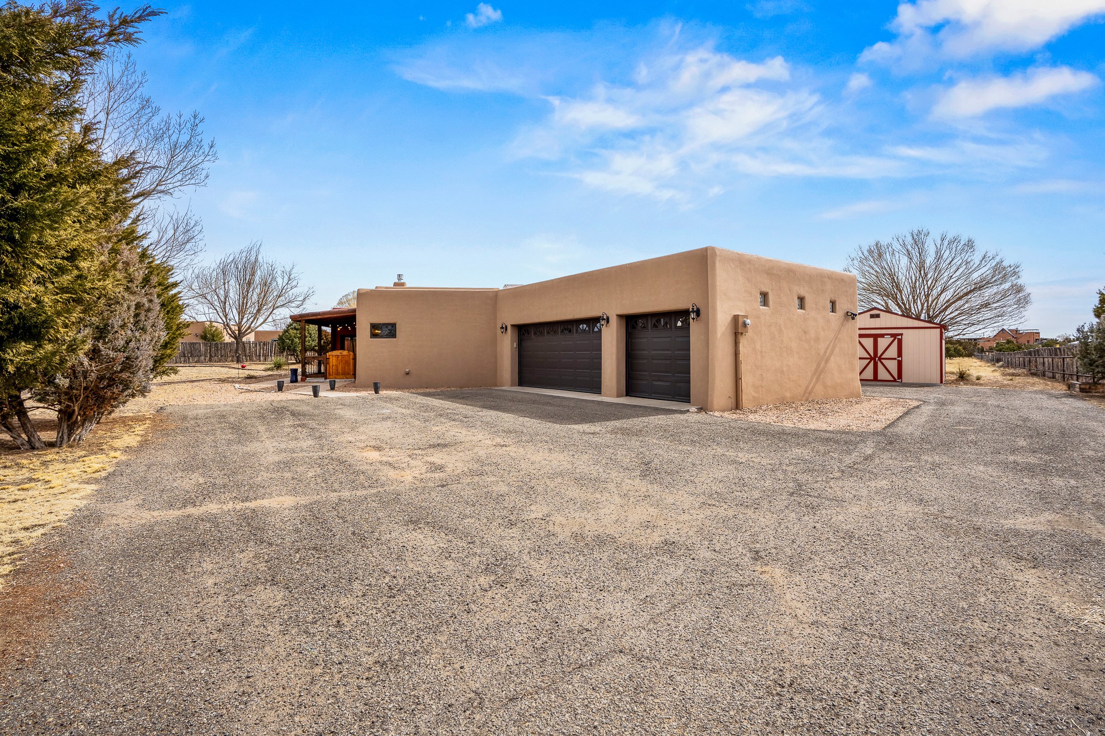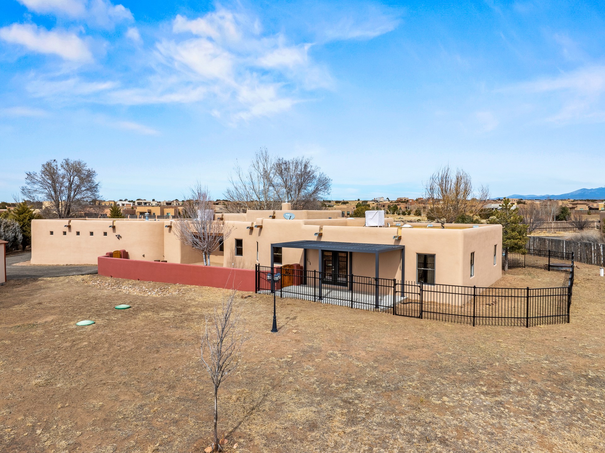This beautiful single-level home boasts a spacious 2,727 +/- square foot split-bedroom floor plan with 4 bedrooms, a sunroom, 3 full baths, and a 3-car garage. 2025: home has been appx 80% re-stuccoed, & is situated on a fenced & gated 2.5-acre lot with breathtaking mountain views in all directions, offering a serene rural setting allowing horses, no HOA, just minutes from hospitals, restaurants, & grocery stores. The large kitchen is a chef's dream, featuring NEW MOSAIC TILE BACKSPLASH, abundant cabinetry & drawers for ample storage, granite countertops, an island/breakfast bar, pantry and stainless-steel appliances. Adjacent to the kitchen is the formal dining room with tiled accents and plaster finished wall/ceiling. The grand living room impresses with high ceilings, vigas, can lighting, and a REMODELED GAS FIREPLACE WITH MANTLE. From the living room, step into the NEW SUNROOM, which opens to a NEW COVERED PORCH perfect for relaxing & enjoying the views. The spacious owner's suite has NEW ENGINEERED WOOD FLOORING, walk-in closet with built-ins, vigas with tongue & groove ceiling and a ceiling fan. The ensuite bath has a NEW TUB, NEW LOVELY TILED SHOWER, AND NEW DOUBLE SINK VANITY. Additional bedrooms are thoughtfully designed with ample space & functionality. The hall bath has been updated with a NEW VANITY, while the laundry room, complete with plentiful cabinets and drawers, a skylight, and an NEWELY ADDED SINK, offers convenience and style. Many wonderful features and amenities include: Radiant heat-2 Evaporative cooling units-Tons of skylights-Wood doors-NEW PERGOLA-NEW 16X16 TUFF SHED (13K)-Plaster finish walls-Hunter Douglas blinds-Ceiling fans-NEW BRICK TILED ACCENT WALLS in hallway-Plenty of wall space for artwork-FRESHLY PAINTED INTERIOR (Almost every room)-Multiple covered enclosed patios, perfect for outdoor living, and entertaining. This property combines comfort and functionality with stunning views. Please read agent only remarks.