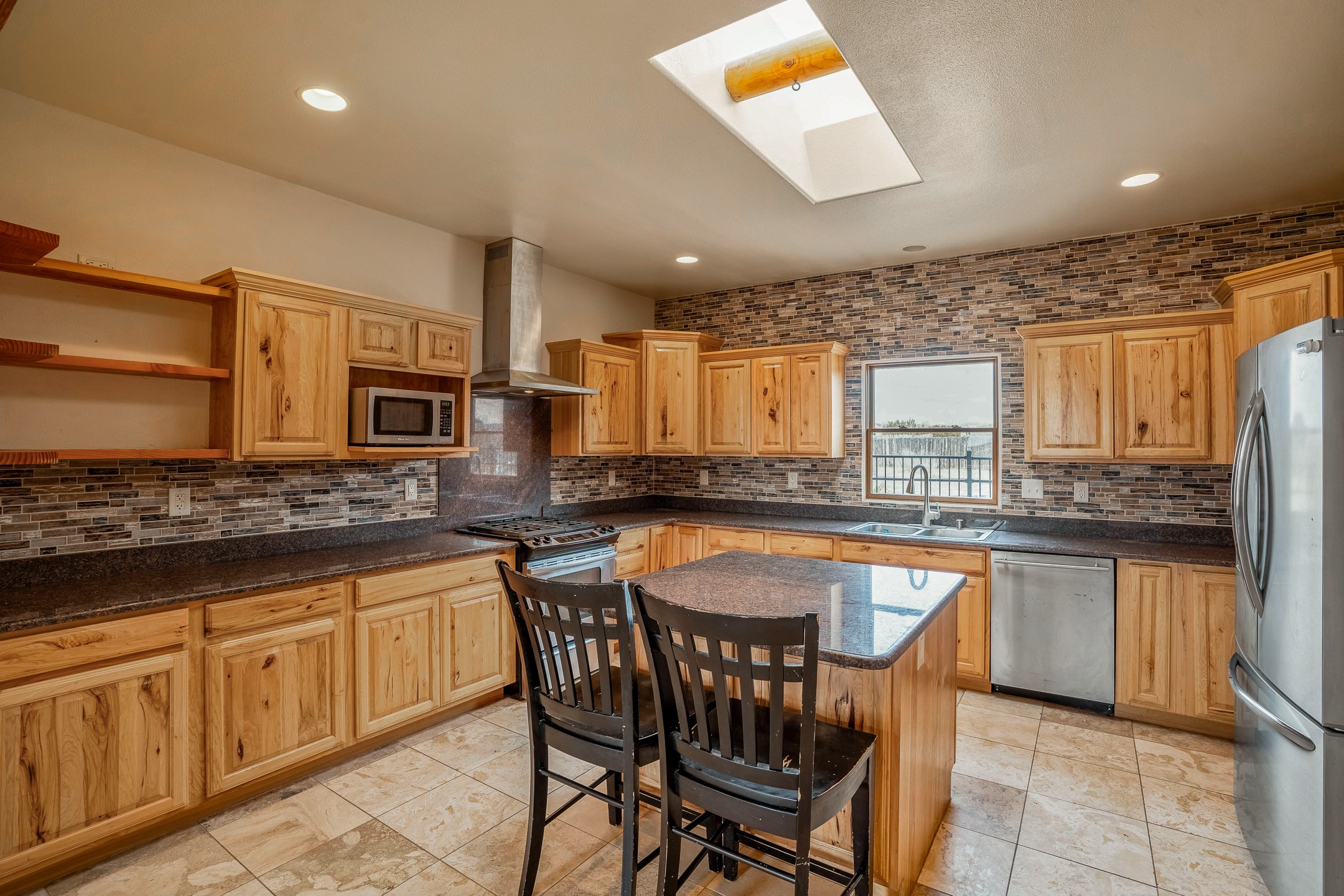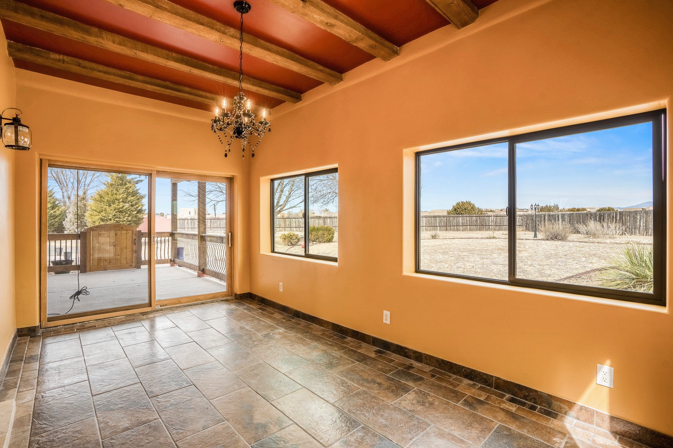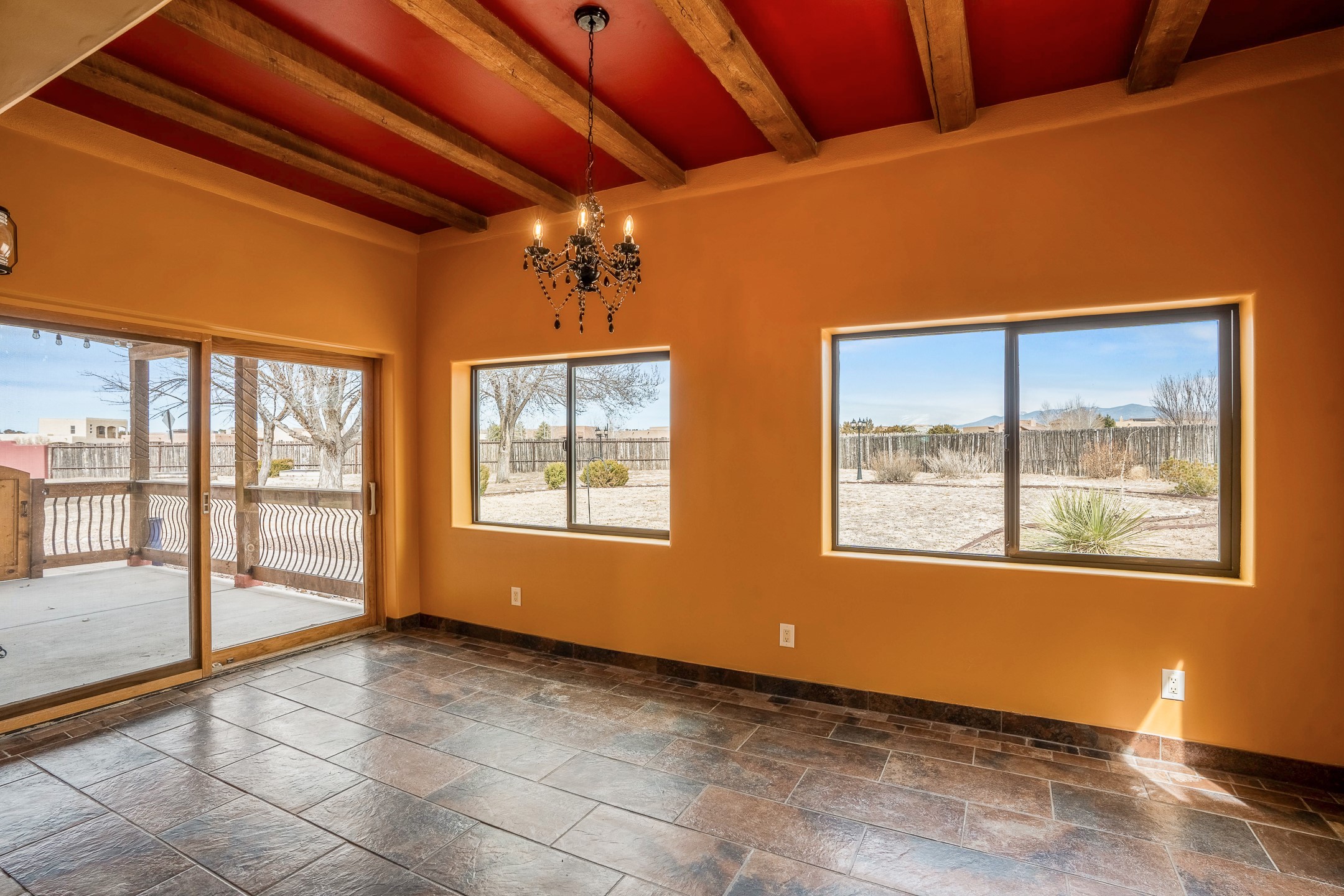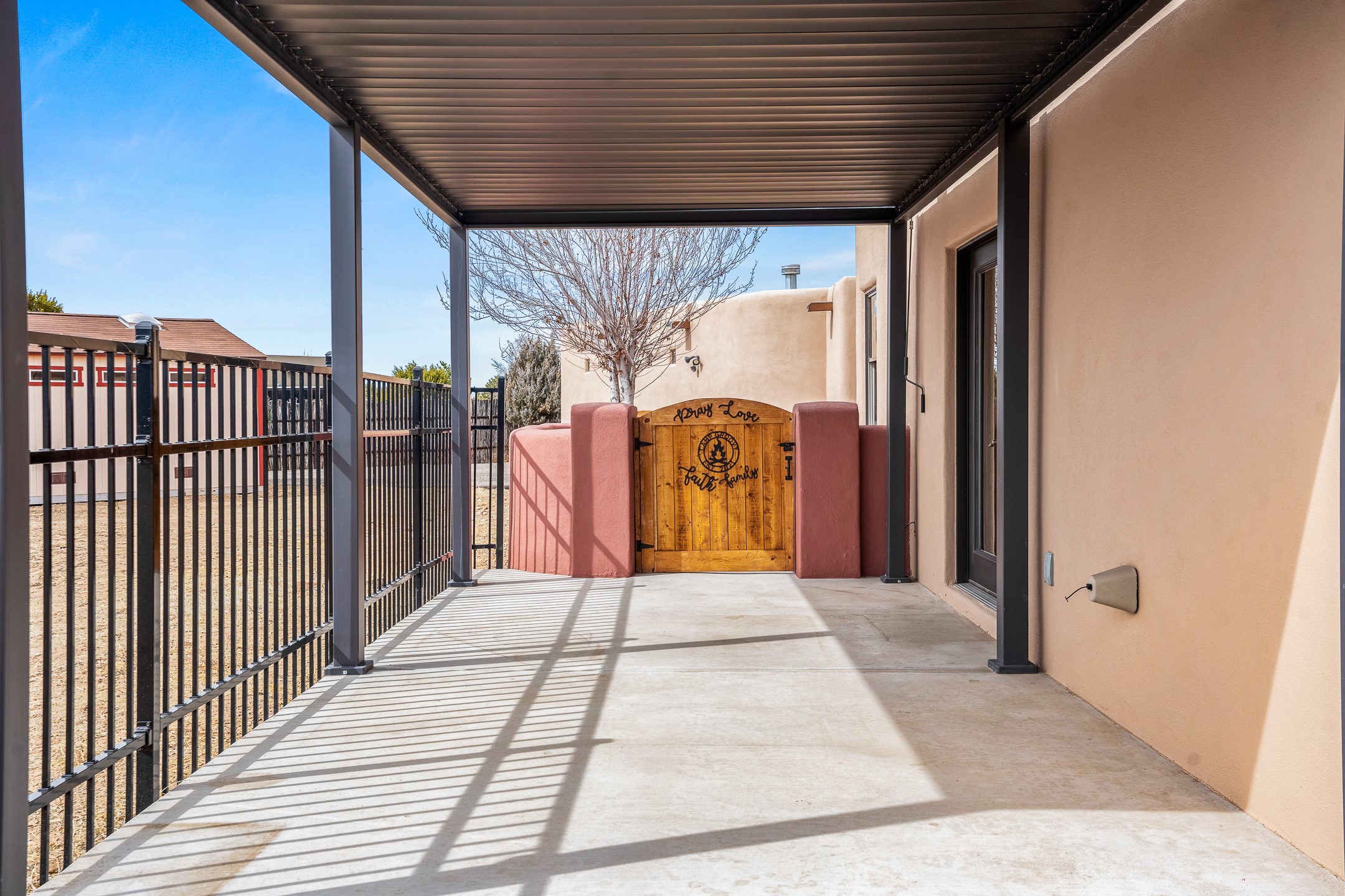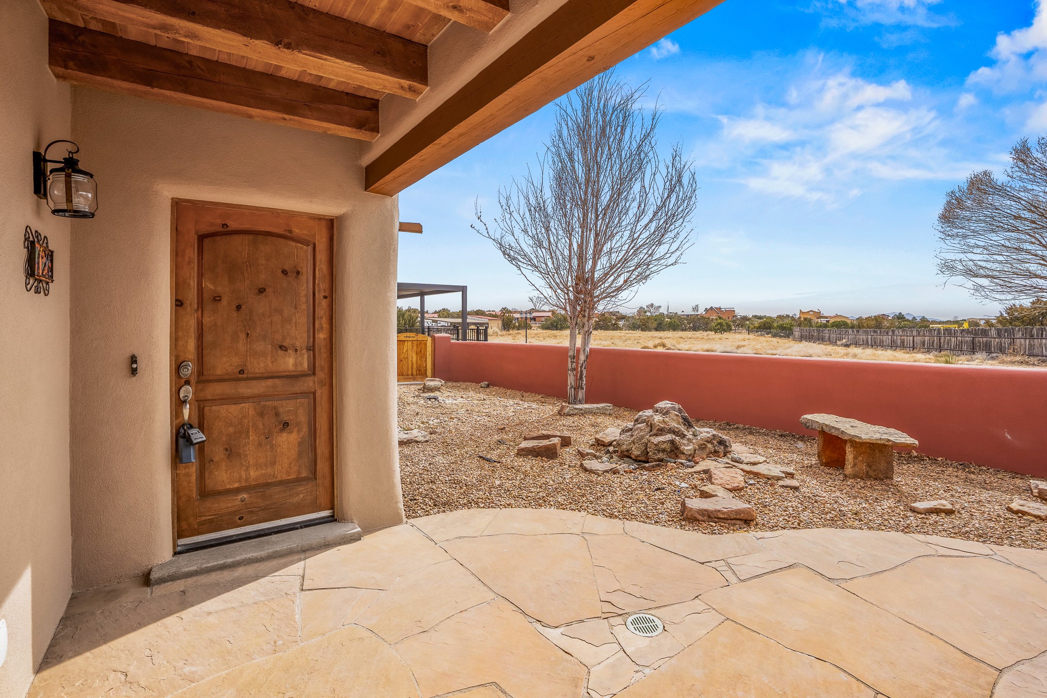 This beautiful single-level home boasts a spacious 2,727 +/- square foot split-bedroom floor plan with 4 bedrooms, a sunroom, 3 full baths, and a 3-car garage. 2025: home has been appx 80% re-stuccoed, & is situated on a fenced & gated 2.5-acre lot with breathtaking mountain views in all directions, offering a serene rural setting allowing horses, no HOA, just minutes from hospitals, restaurants, & grocery stores. The large kitchen is a chef's dream, featuring NEW MOSAIC TILE BACKSPLASH, abundant cabinetry & drawers for ample storage, granite countertops, an island/breakfast bar, pantry and stainless-steel appliances. Adjacent to the kitchen is the formal dining room with tiled accents and plaster finished wall/ceiling. The grand living room impresses with high ceilings, vigas, can lighting, and a REMODELED GAS FIREPLACE WITH MANTLE. From the living room, step into the NEW SUNROOM, which opens to a NEW COVERED PORCH perfect for relaxing & enjoying the views. The spacious owner's suite has NEW ENGINEERED WOOD FLOORING, walk-in closet with built-ins, vigas with tongue & groove ceiling and a ceiling fan. The ensuite bath has a NEW TUB, NEW LOVELY TILED SHOWER, AND NEW DOUBLE SINK VANITY. Additional bedrooms are thoughtfully designed with ample space & functionality. The hall bath has been updated with a NEW VANITY, while the laundry room, complete with plentiful cabinets and drawers, a skylight, and an NEWELY ADDED SINK, offers convenience and style. Many wonderful features and amenities include: Radiant heat-2 Evaporative cooling units-Tons of skylights-Wood doors-NEW PERGOLA-NEW 16X16 TUFF SHED (13K)-Plaster finish walls-Hunter Douglas blinds-Ceiling fans-NEW BRICK TILED ACCENT WALLS in hallway-Plenty of wall space for artwork-FRESHLY PAINTED INTERIOR (Almost every room)-Multiple covered enclosed patios, perfect for outdoor living, and entertaining. This property combines comfort and functionality with stunning views. Please read agent only remarks.