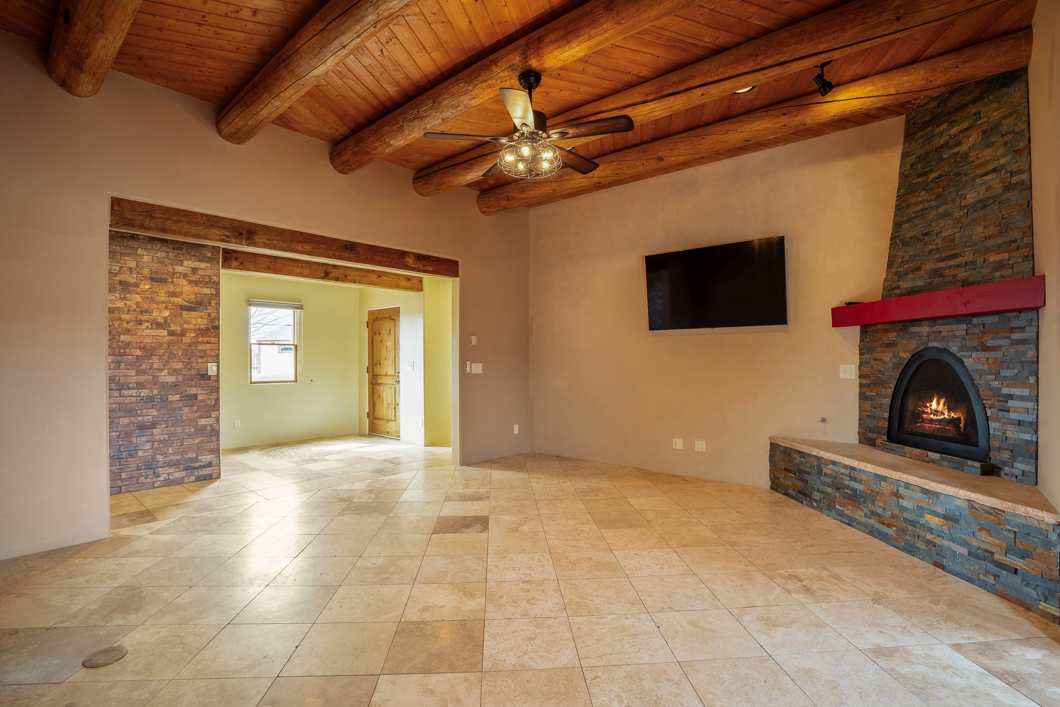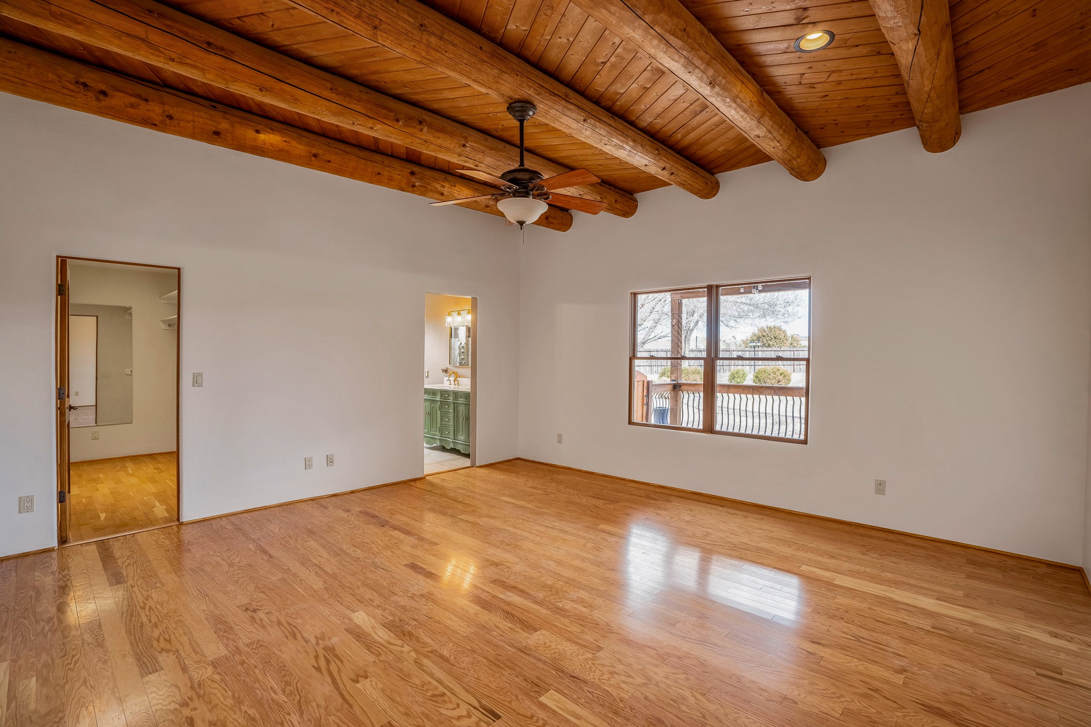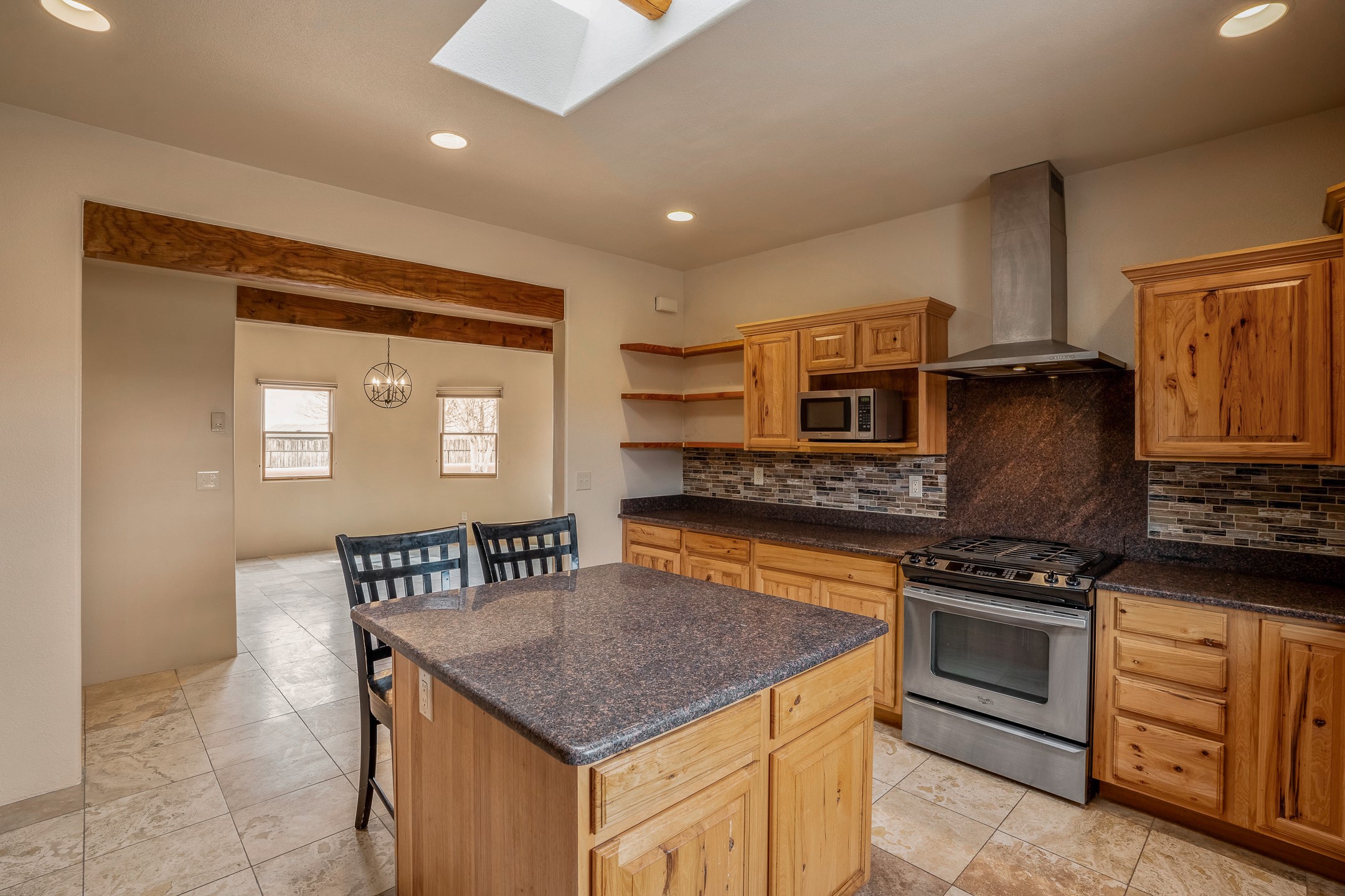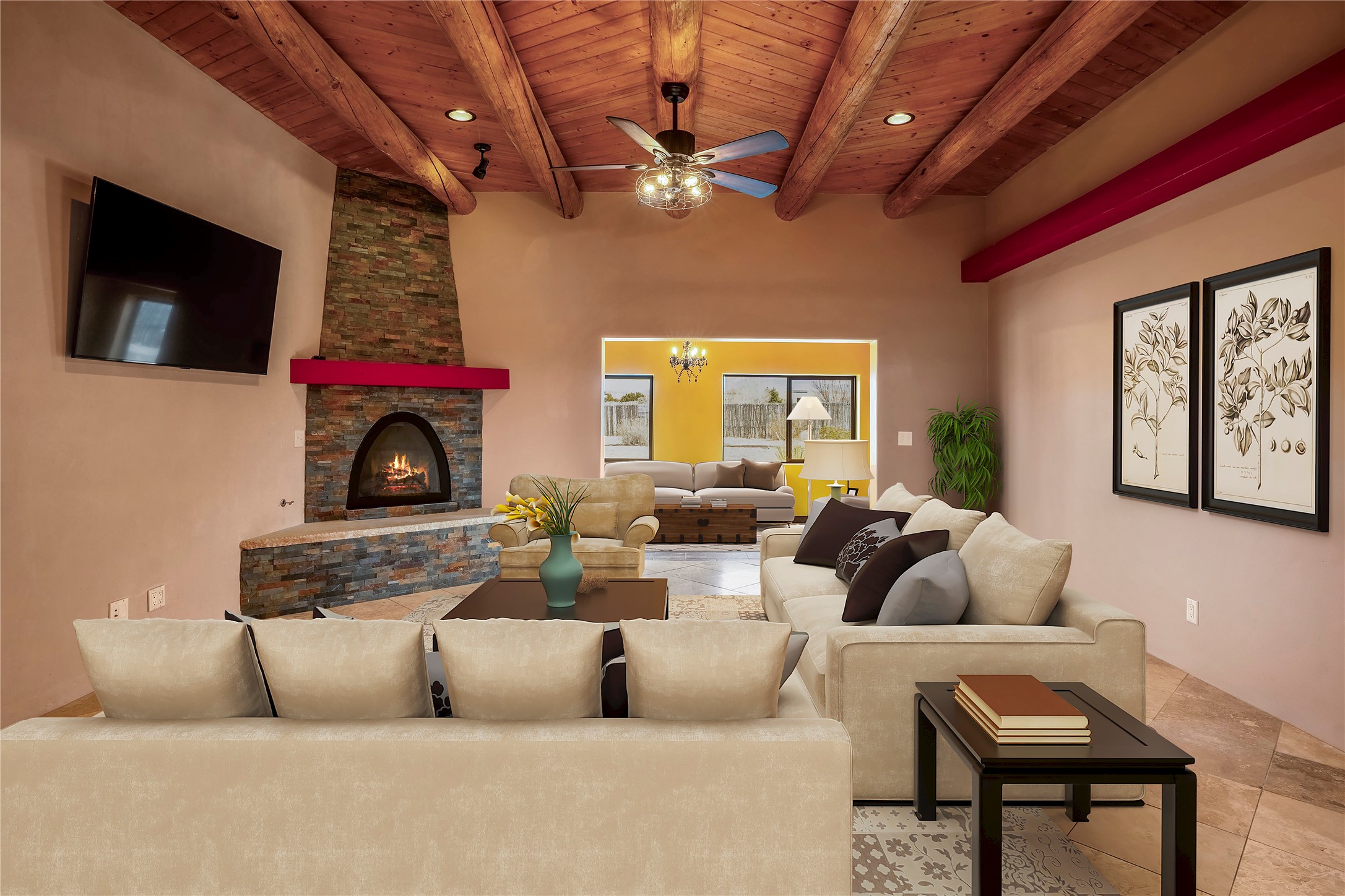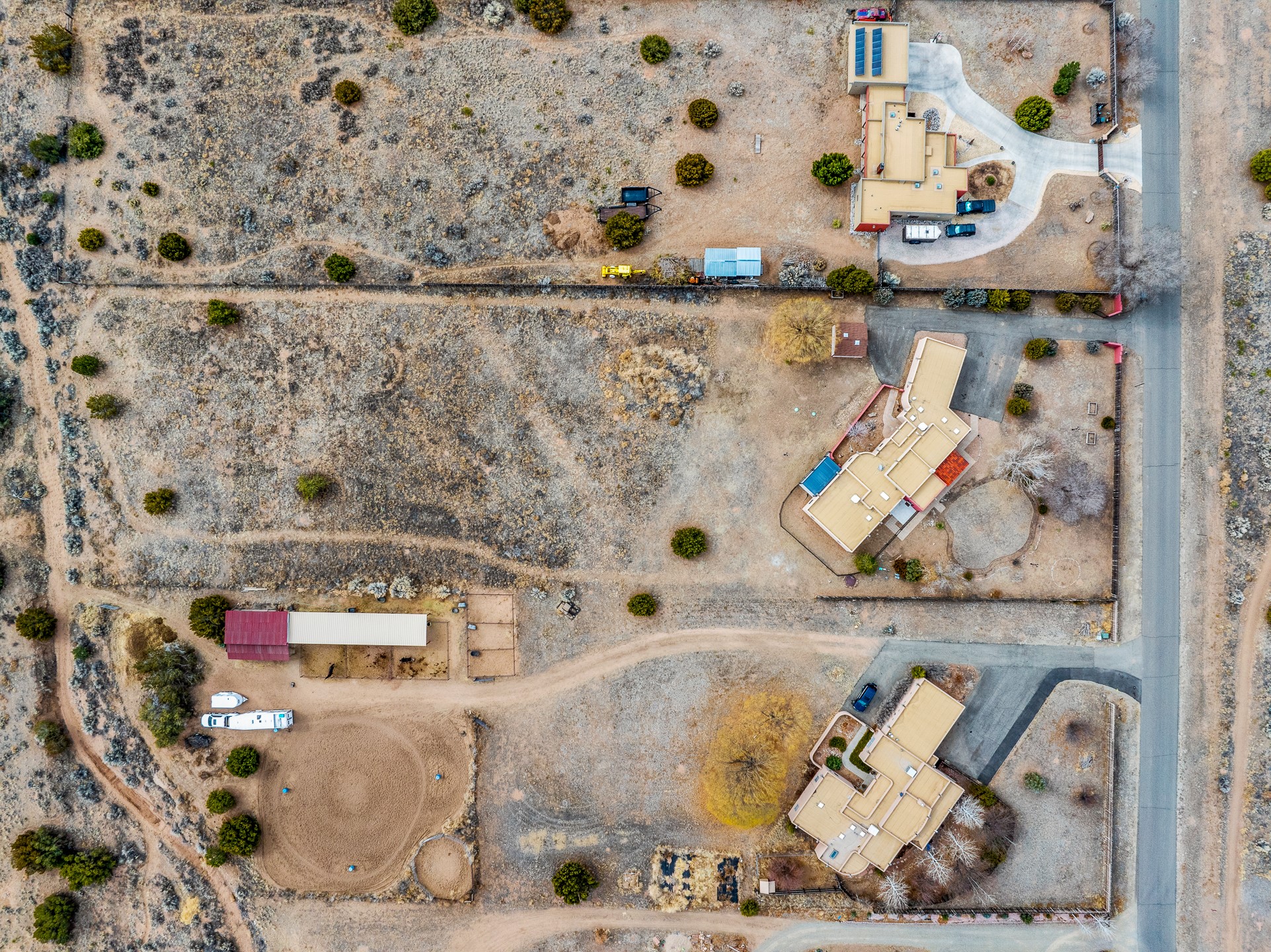This beautiful single-level home boasts a spacious 2,727 +/- square foot split-bedroom floor plan with 4 bedrooms, a sunroom, 3 full baths, and a 3-car garage. 2025: home has been appx 80% re-stuccoed, & is situated on a fenced & gated 2.5-acre lot with breathtaking mountain views in all directions, offering a serene rural setting allowing horses, no HOA, just minutes from hospitals, restaurants, & grocery stores. The large kitchen is a chef's dream, featuring NEW MOSAIC TILE BACKSPLASH, abundant cabinetry & drawers for ample storage, granite countertops, an island/breakfast bar, pantry and stainless-steel appliances. Adjacent to the kitchen is the formal dining room with tiled accents and plaster finished wall/ceiling. The grand living room impresses with high ceilings, vigas, can lighting, and a REMODELED GAS FIREPLACE WITH MANTLE. From the living room, step into the NEW SUNROOM, which opens to a NEW COVERED PORCH perfect for relaxing & enjoying the views. The spacious owner's suite has NEW ENGINEERED WOOD FLOORING, walk-in closet with built-ins, vigas with tongue & groove ceiling and a ceiling fan. The ensuite bath has a NEW TUB, NEW LOVELY TILED SHOWER, AND NEW DOUBLE SINK VANITY. Additional bedrooms are thoughtfully designed with ample space & functionality. The hall bath has been updated with a NEW VANITY, while the laundry room, complete with plentiful cabinets and drawers, a skylight, and an NEWELY ADDED SINK, offers convenience and style. Many wonderful features and amenities include: Radiant heat-2 Evaporative cooling units-Tons of skylights-Wood doors-NEW PERGOLA-NEW 16X16 TUFF SHED (13K)-Plaster finish walls-Hunter Douglas blinds-Ceiling fans-NEW BRICK TILED ACCENT WALLS in hallway-Plenty of wall space for artwork-FRESHLY PAINTED INTERIOR (Almost every room)-Multiple covered enclosed patios, perfect for outdoor living, and entertaining. This property combines comfort and functionality with stunning views. Please read agent only remarks.