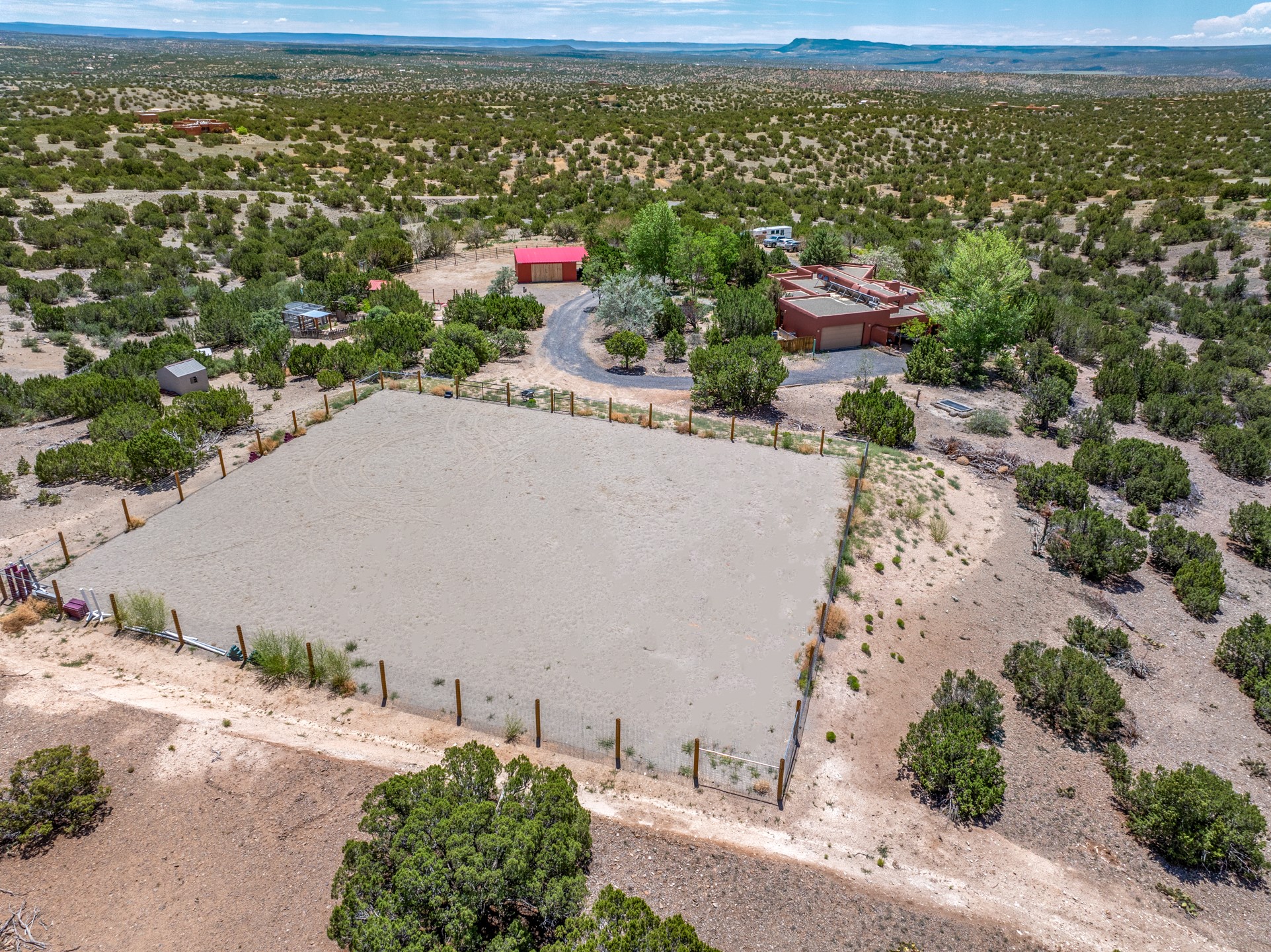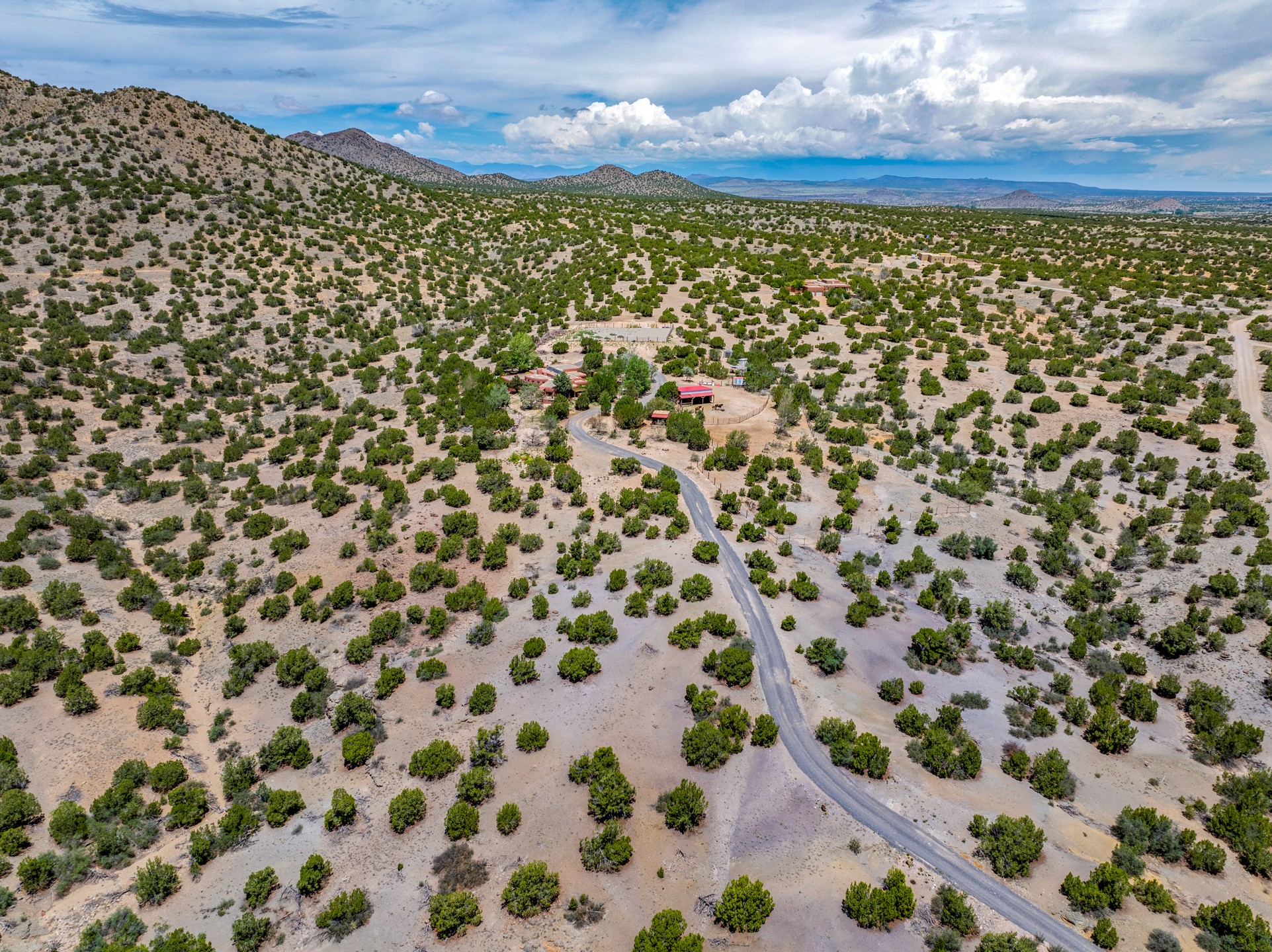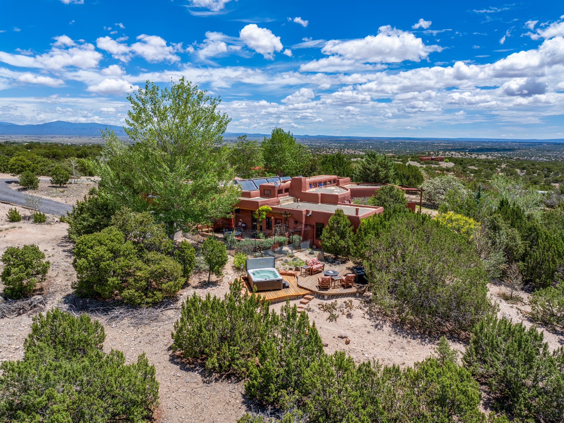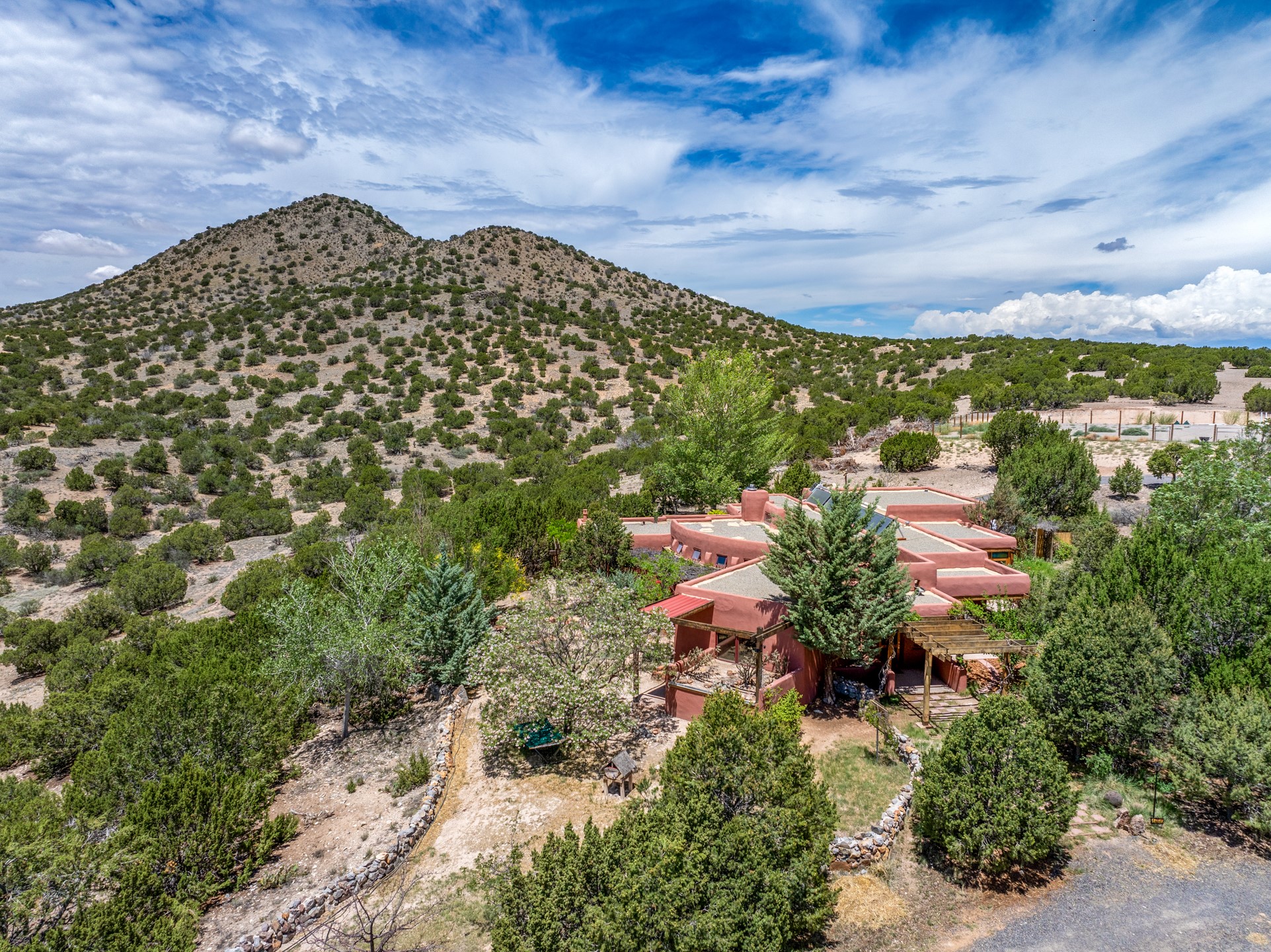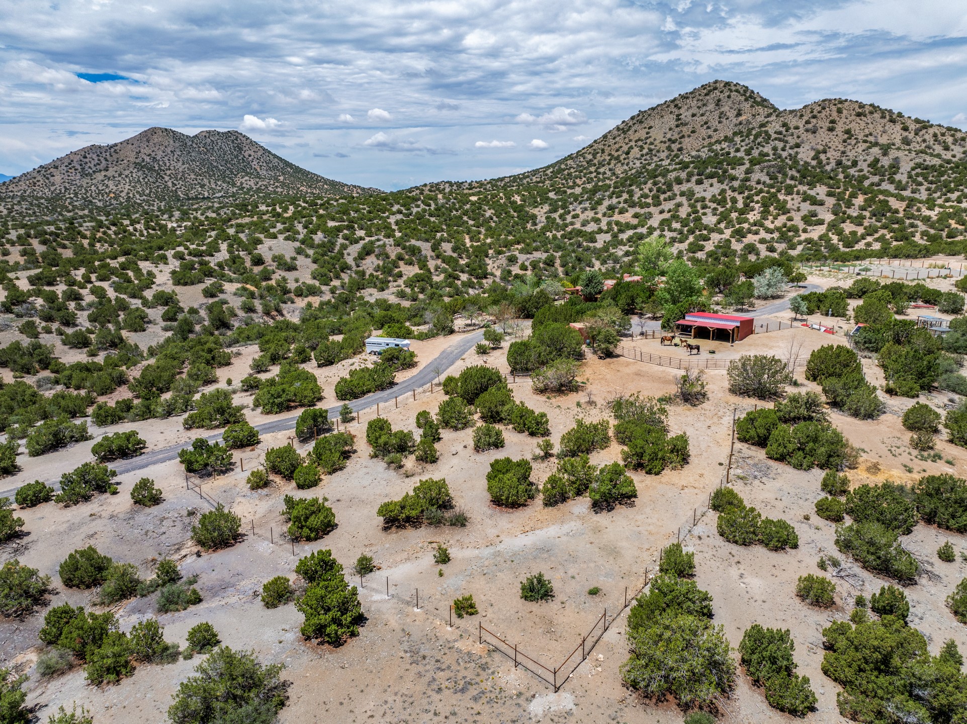 Located on 13.5 VIEW acres one can ride for miles with direct access to BLM land and the Cerrillos Hills. Complete with a beautifully updated barn and tack room, newly built arena and extensive paddock, private well with 3 ac ft of water use. The one of a kind adobe residence is beautifully designed with soft corners, hand-troweled plaster walls, 2 kiva fps, bamboo cabinets and doors, Viatera quartz counters, high ceilings, clearstory windows and more-Come See!