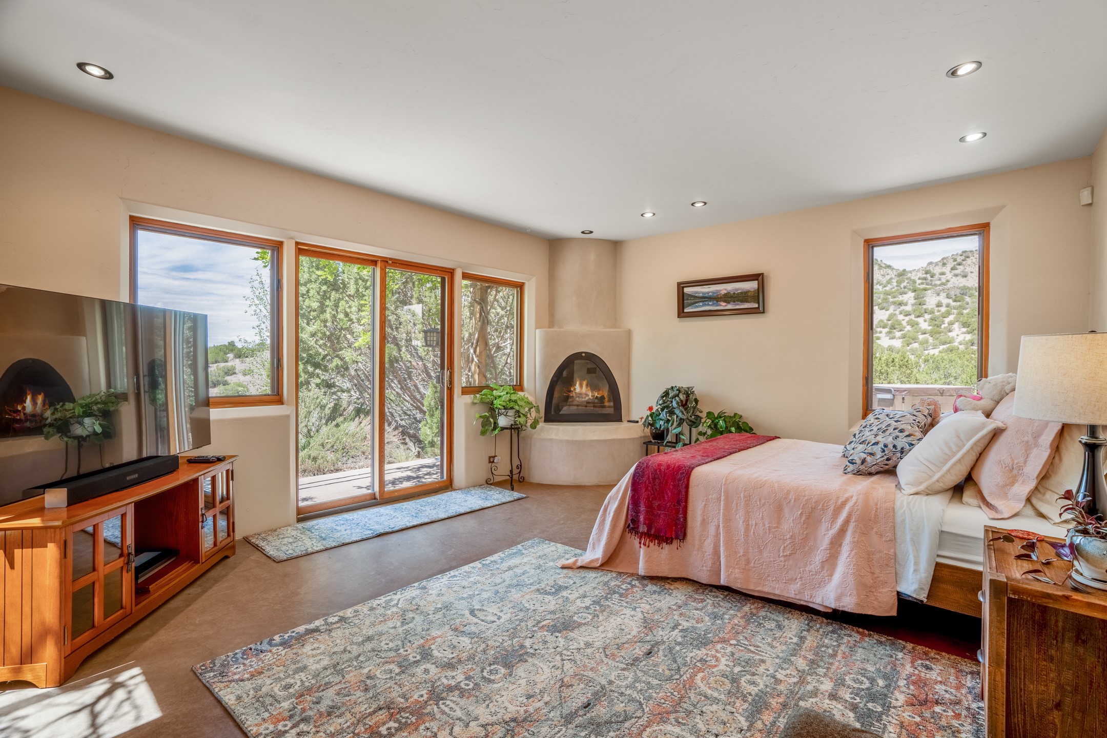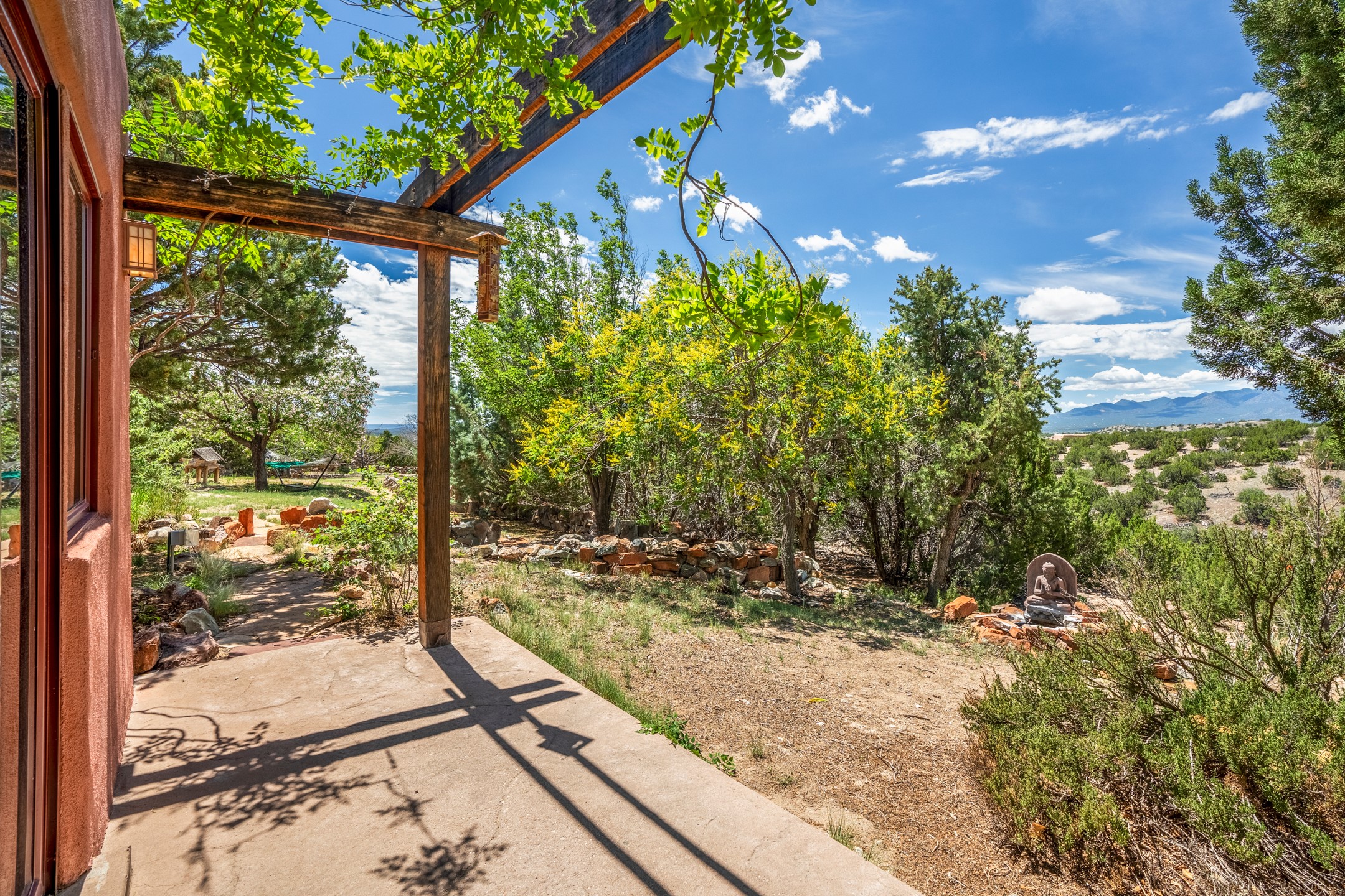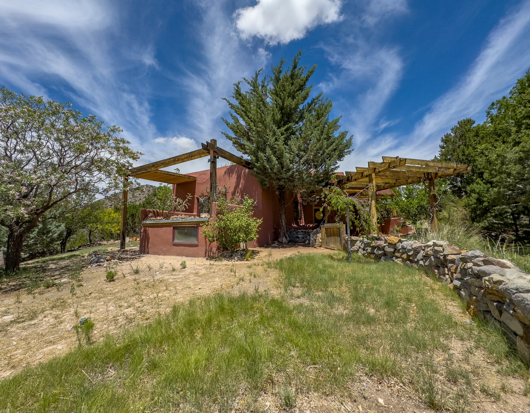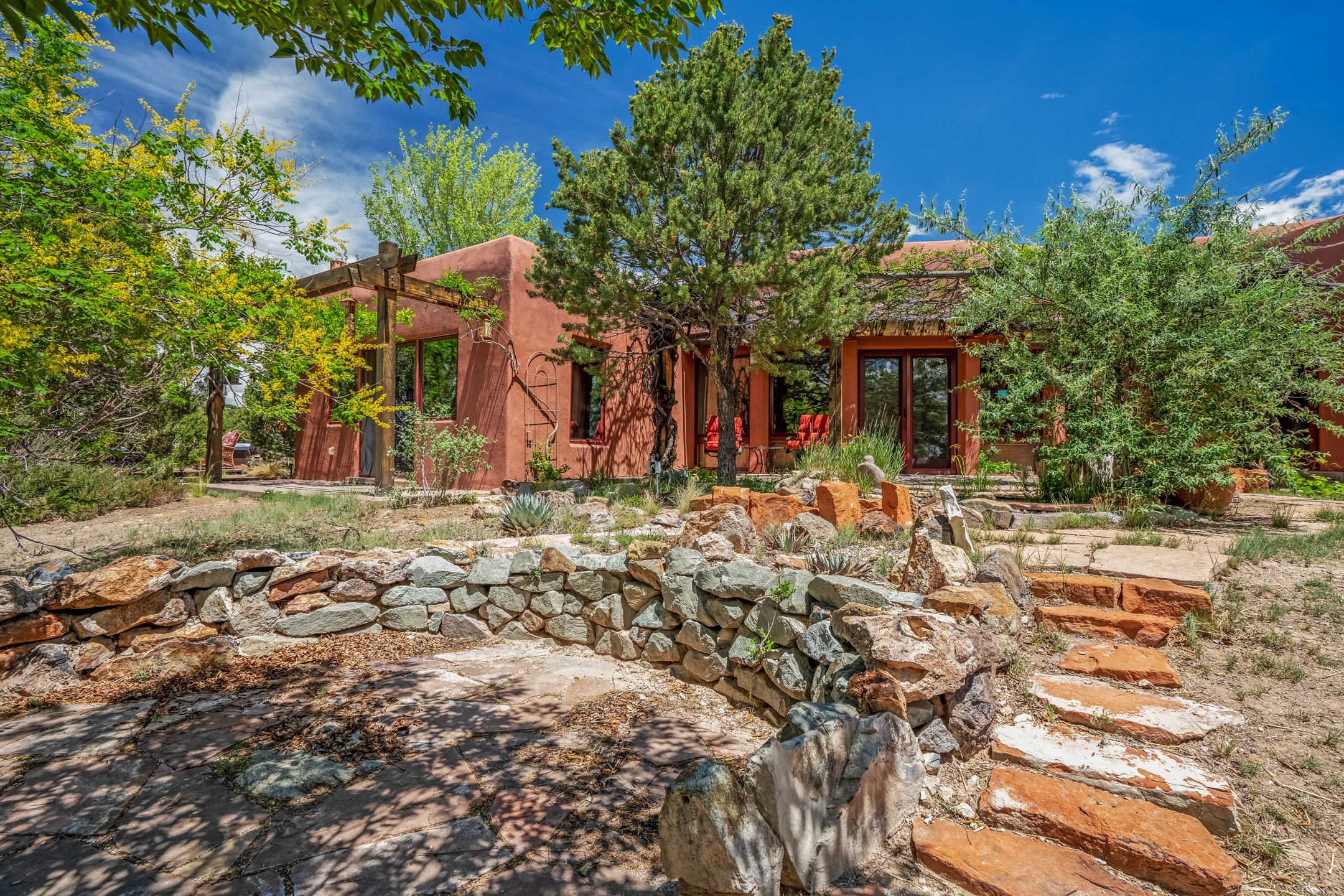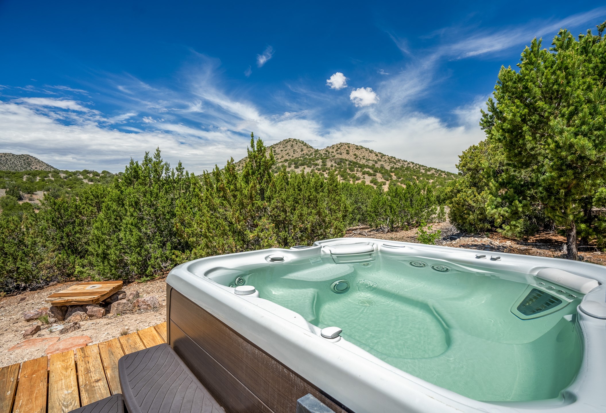 Located on 13.5 VIEW acres one can ride for miles with direct access to BLM land and the Cerrillos Hills. Complete with a beautifully updated barn and tack room, newly built arena and extensive paddock, private well with 3 ac ft of water use. The one of a kind adobe residence is beautifully designed with soft corners, hand-troweled plaster walls, 2 kiva fps, bamboo cabinets and doors, Viatera quartz counters, high ceilings, clearstory windows and more-Come See!
