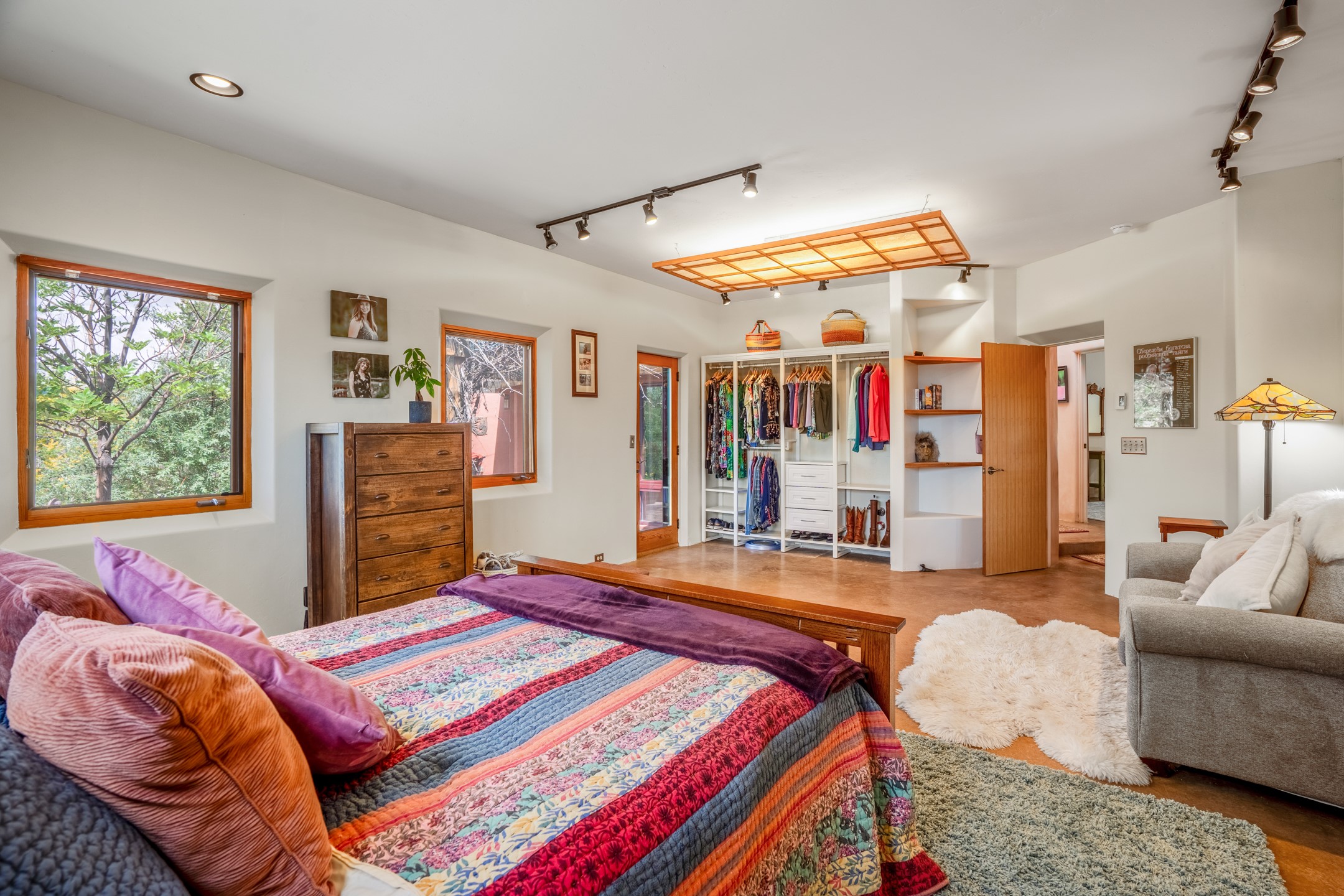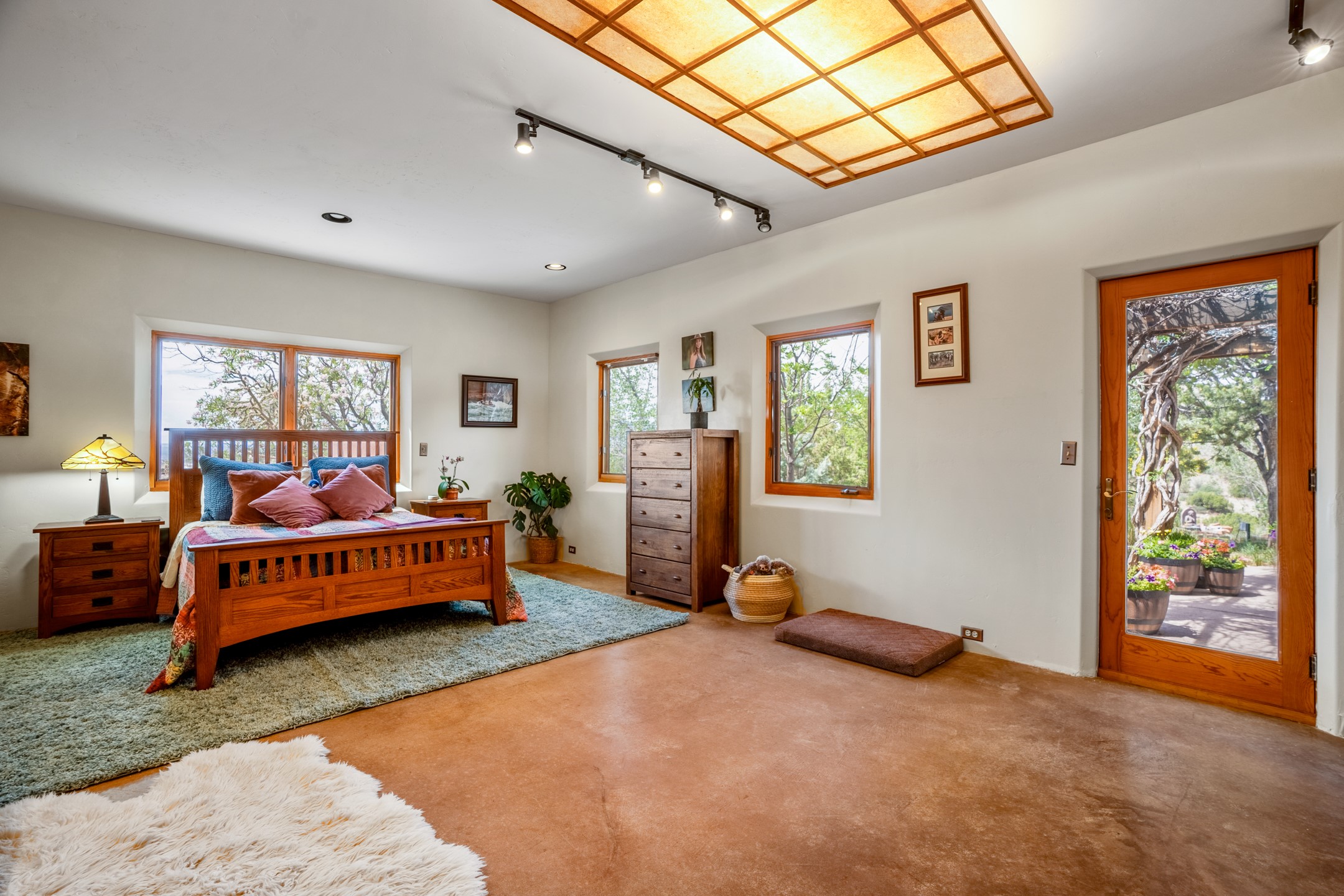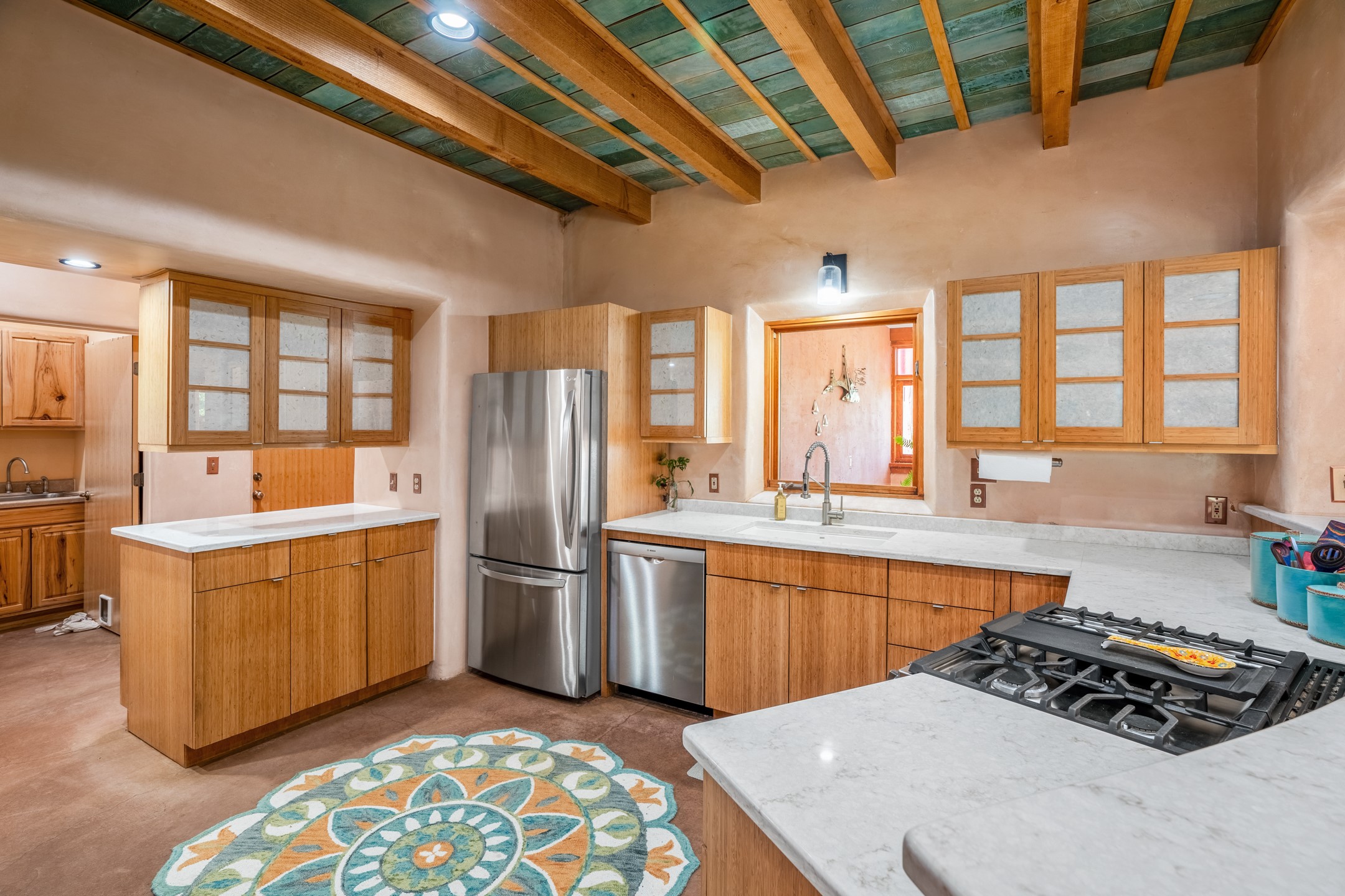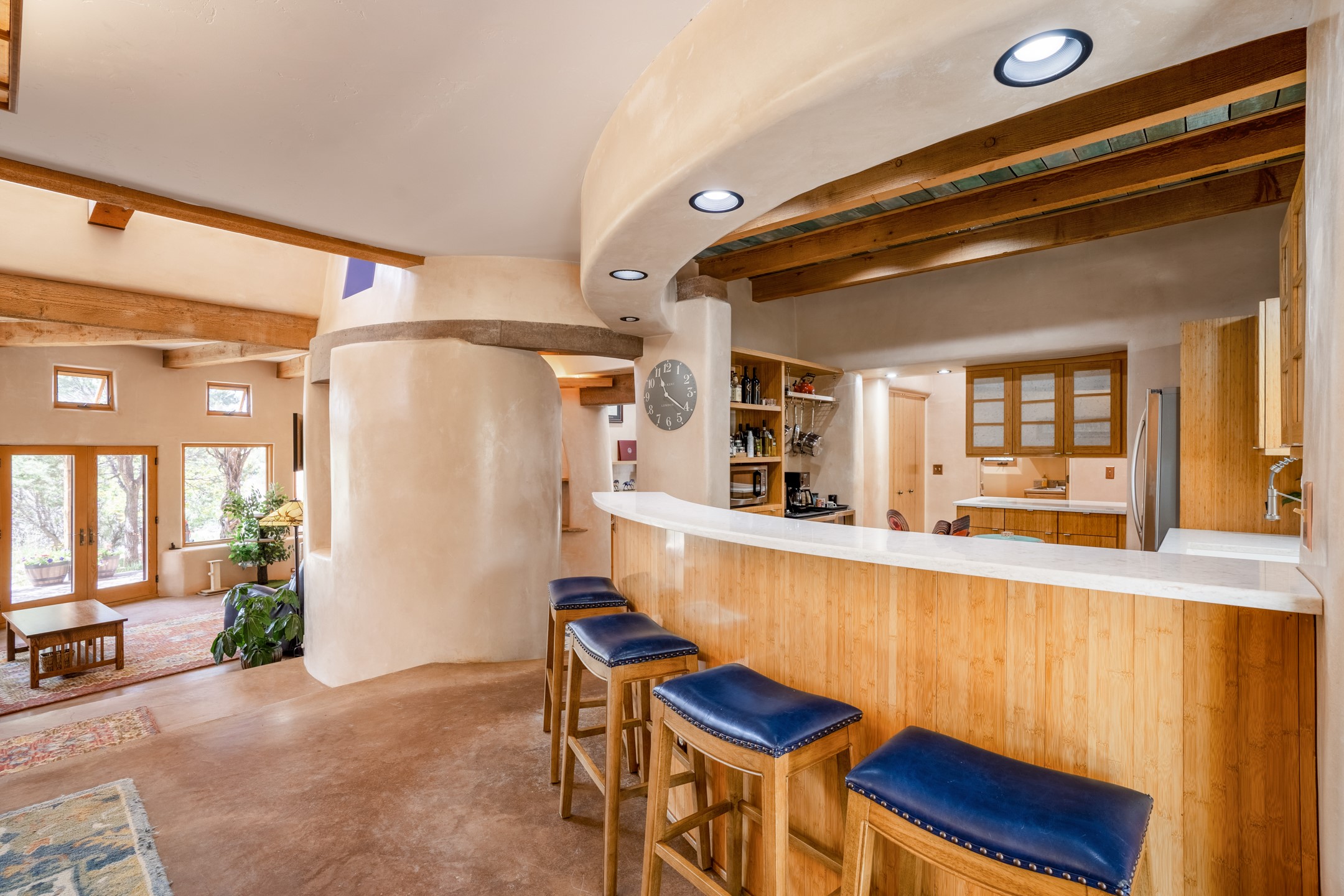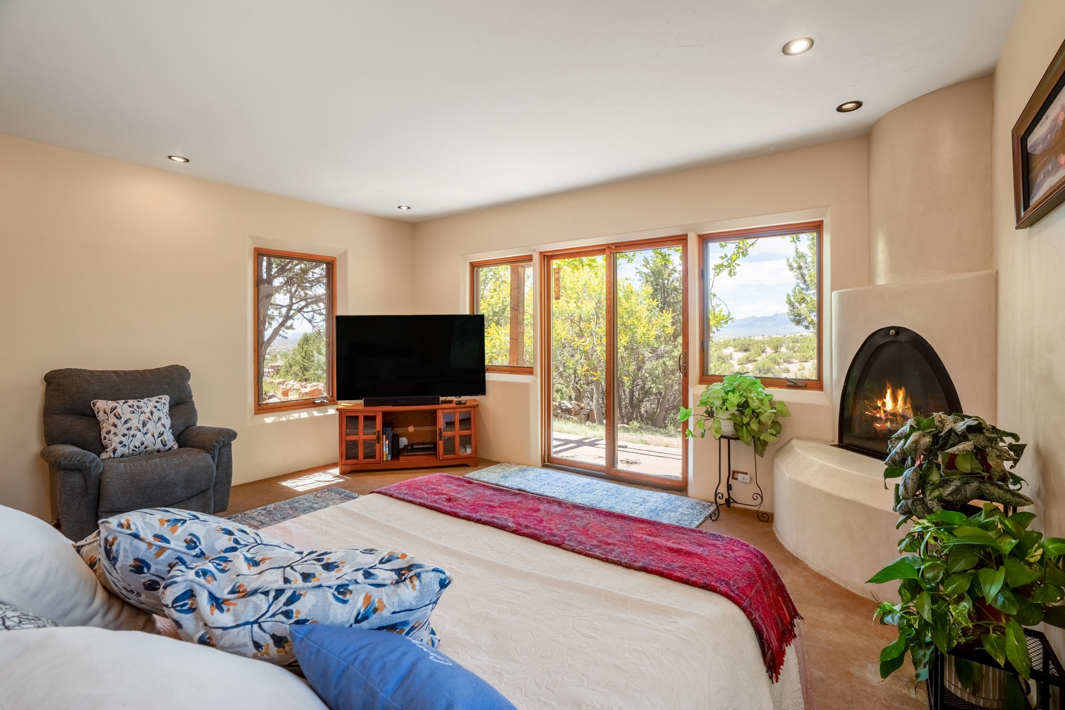 Located on 13.5 VIEW acres one can ride for miles with direct access to BLM land and the Cerrillos Hills. Complete with a beautifully updated barn and tack room, newly built arena and extensive paddock, private well with 3 ac ft of water use. The one of a kind adobe residence is beautifully designed with soft corners, hand-troweled plaster walls, 2 kiva fps, bamboo cabinets and doors, Viatera quartz counters, high ceilings, clearstory windows and more-Come See!