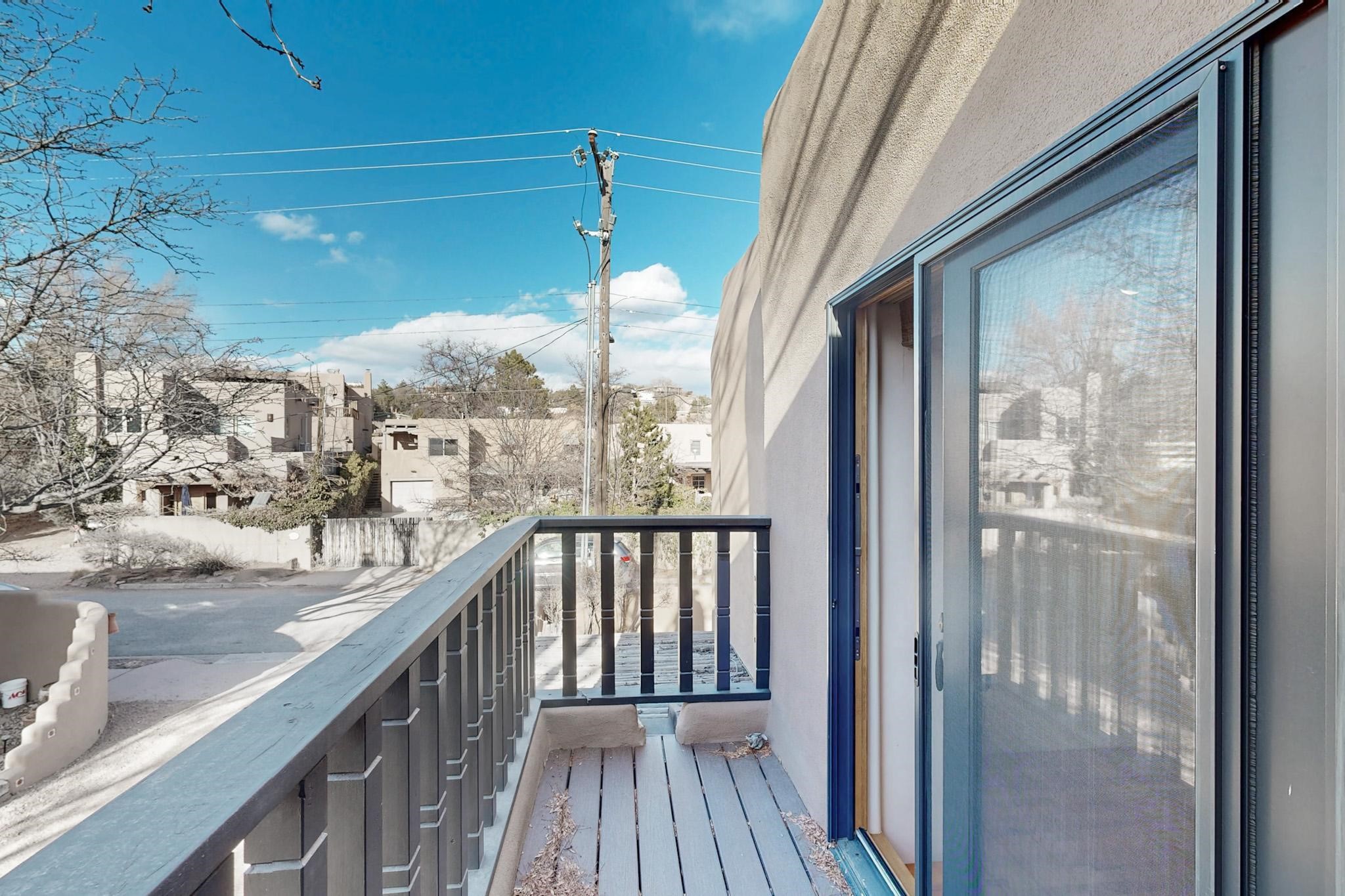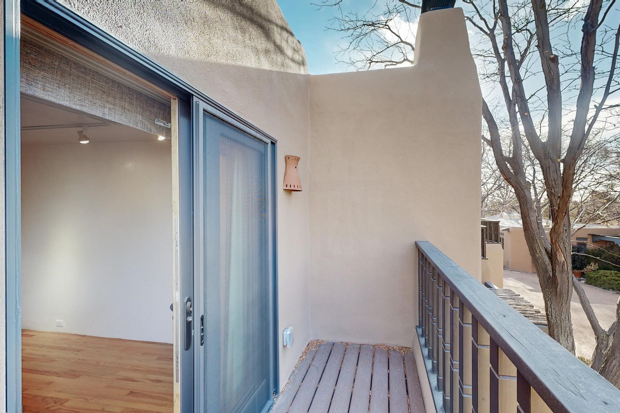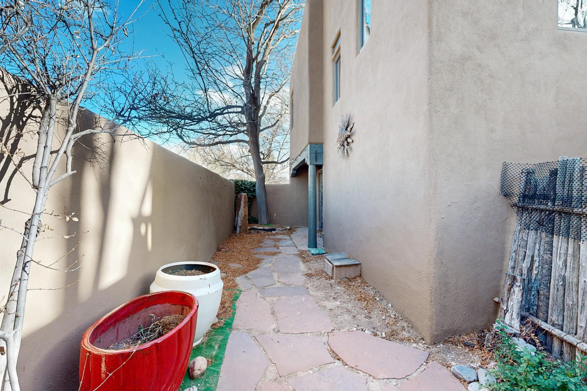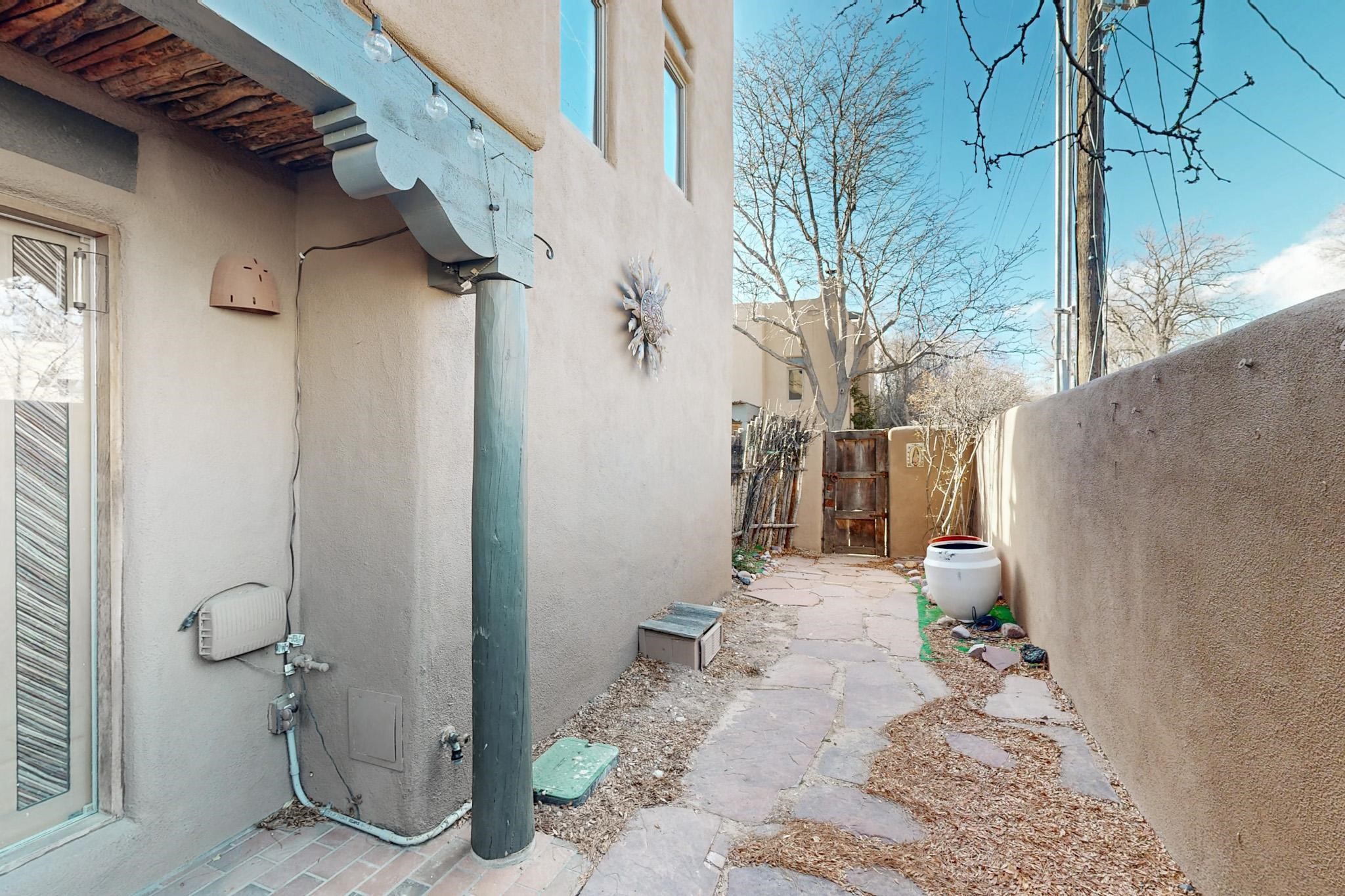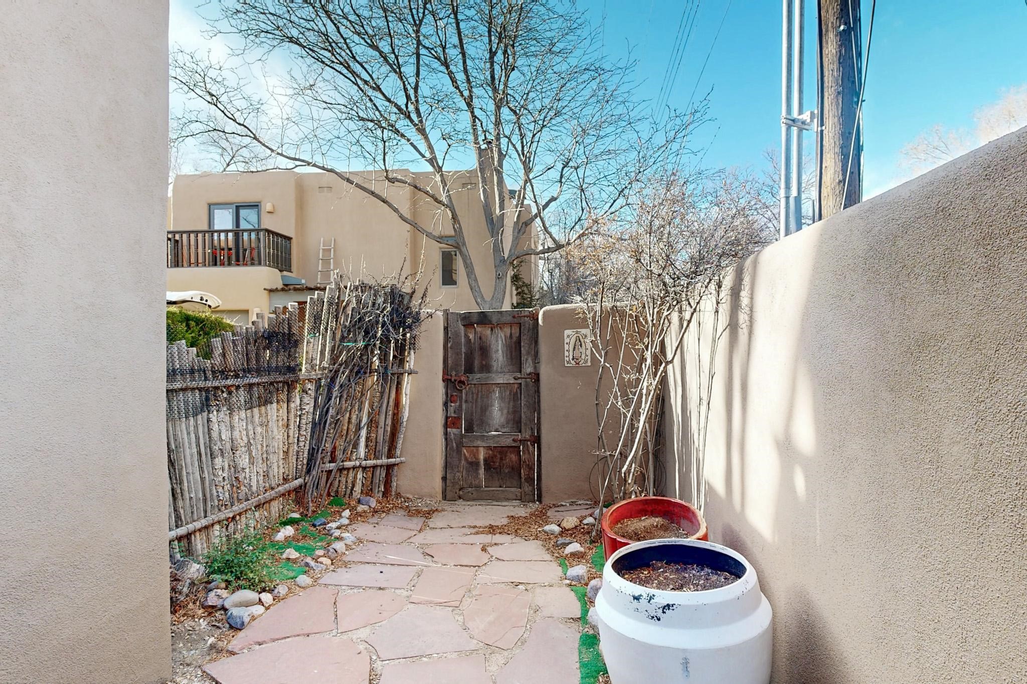 This beautiful two-story condo features an open-concept first floor with travertine tile, a living room with an electric fireplace, a dining area, and a kitchen with granite countertops, stainless steel appliances, and hidden appliance storage. A full bathroom is located behind the kitchen. Upstairs, there are two bedrooms and two bathrooms, including an owner's suite with a traditional kiva fireplace and shutters opening to the living area. The second bedroom has wood flooring and access to a portal space. Custom details throughout include decorative tile, Nichos, plaster walls, and custom hardware.Situated on an historic street, the condo offers a courtyard off the dining room with space for outdoor dining and a rock water feature. It provides a rural feel in an urban setting, within walking distance of the historic plaza and DeVargas Market Center. This unit includes two extra parking passes for parking around the corner in the complex. The owners are offering a $10,000 credit towards closing costs and flooring.