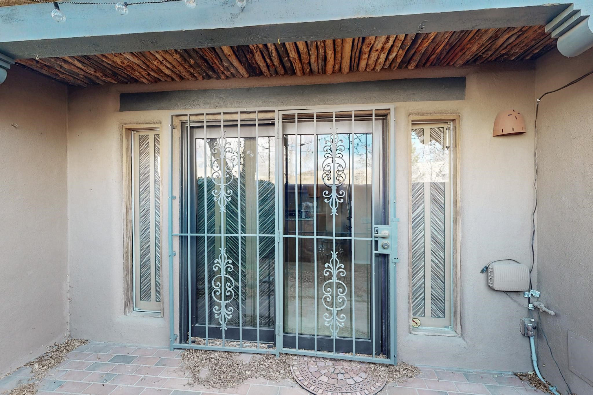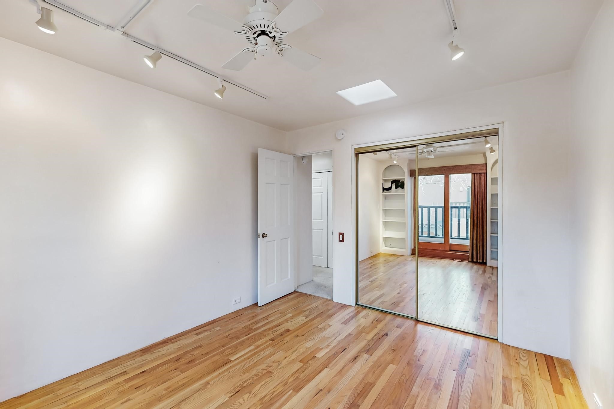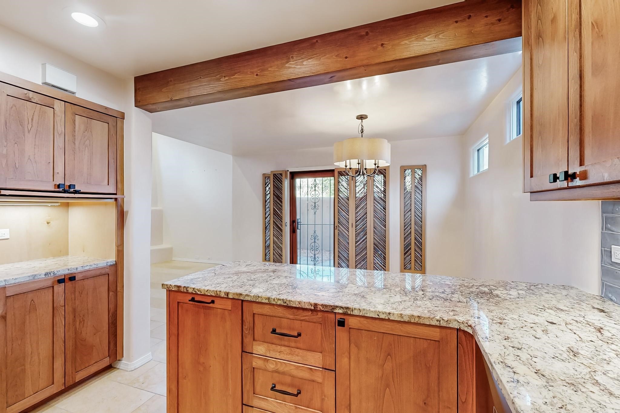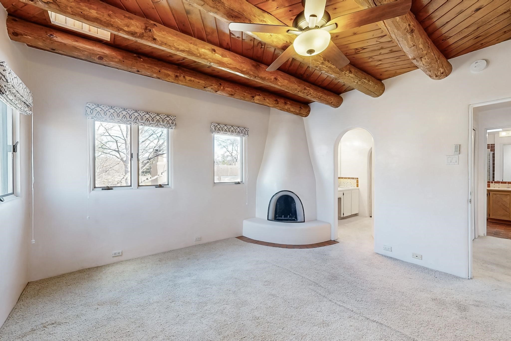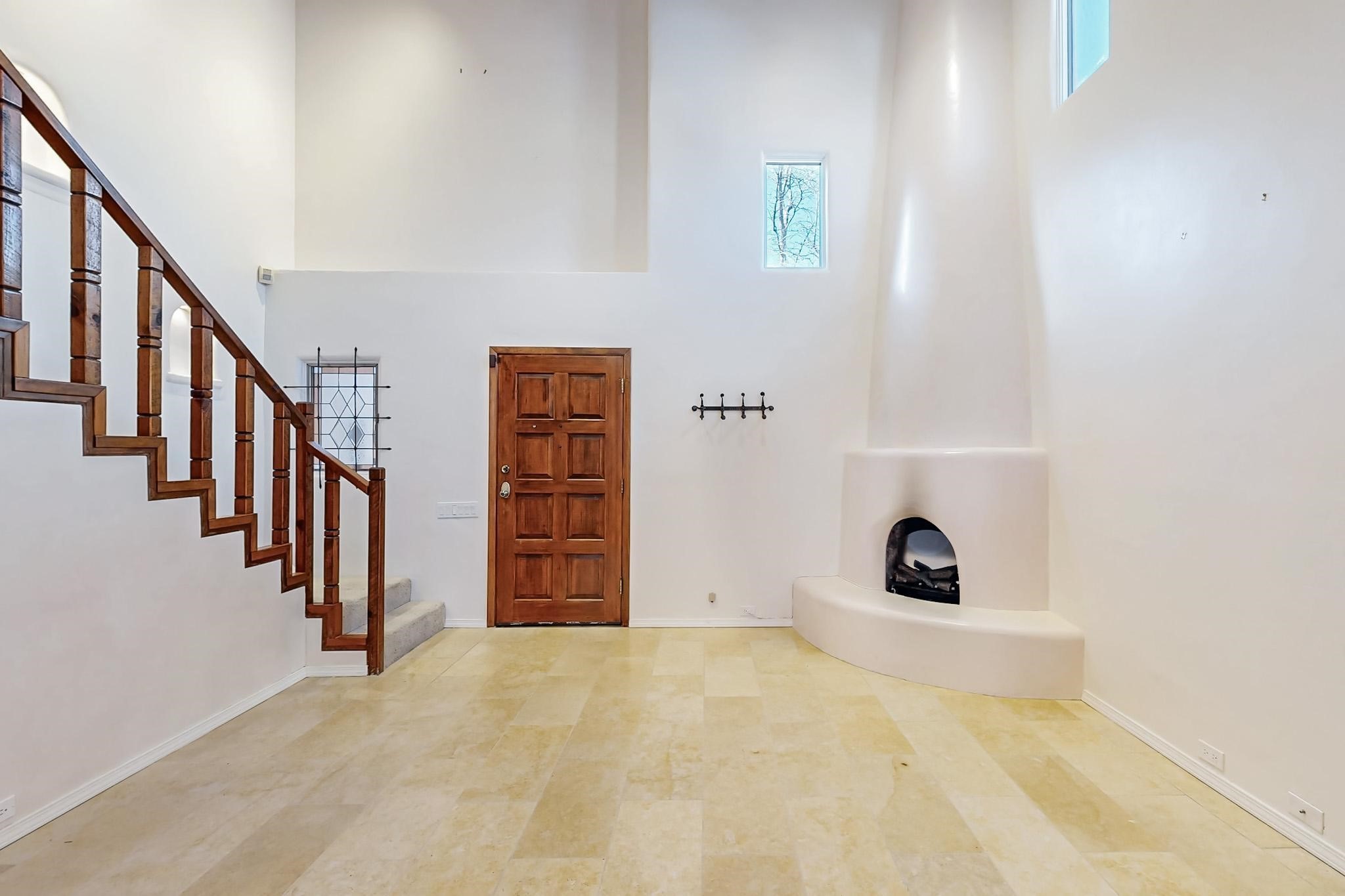 This beautiful two-story condo features an open-concept first floor with travertine tile, a living room with an electric fireplace, a dining area, and a kitchen with granite countertops, stainless steel appliances, and hidden appliance storage. A full bathroom is located behind the kitchen. Upstairs, there are two bedrooms and two bathrooms, including an owner's suite with a traditional kiva fireplace and shutters opening to the living area. The second bedroom has wood flooring and access to a portal space. Custom details throughout include decorative tile, Nichos, plaster walls, and custom hardware.Situated on an historic street, the condo offers a courtyard off the dining room with space for outdoor dining and a rock water feature. It provides a rural feel in an urban setting, within walking distance of the historic plaza and DeVargas Market Center. This unit includes two extra parking passes for parking around the corner in the complex. The owners are offering a $10,000 credit towards closing costs and flooring.