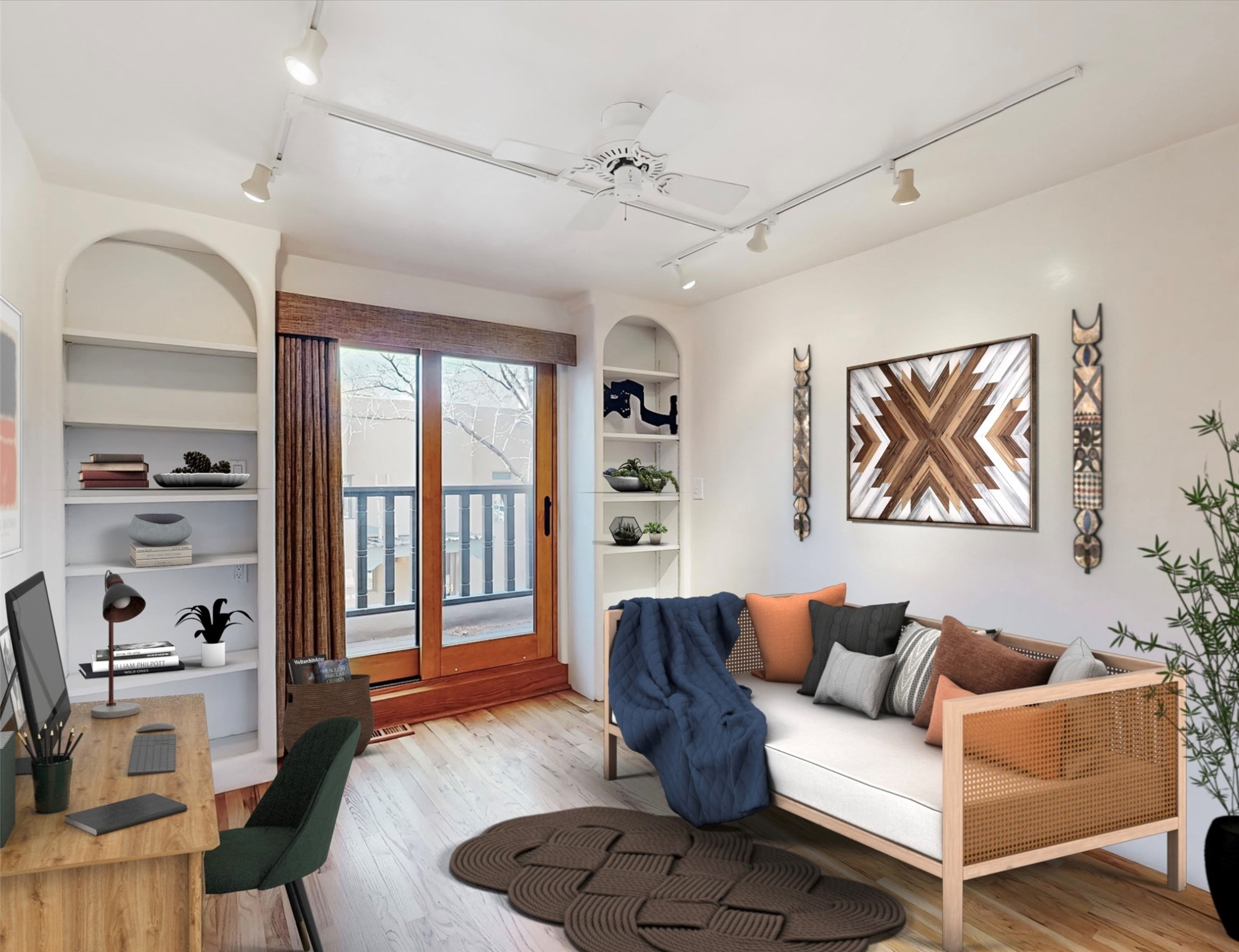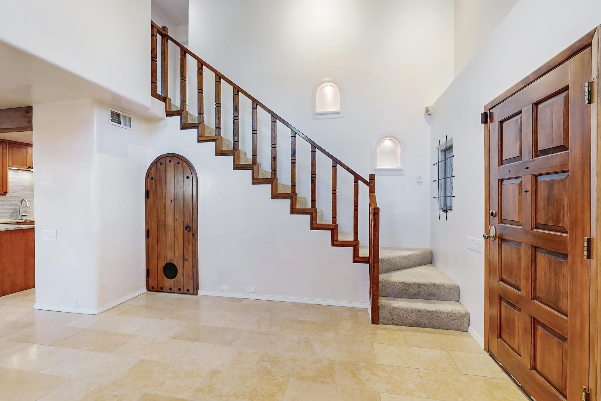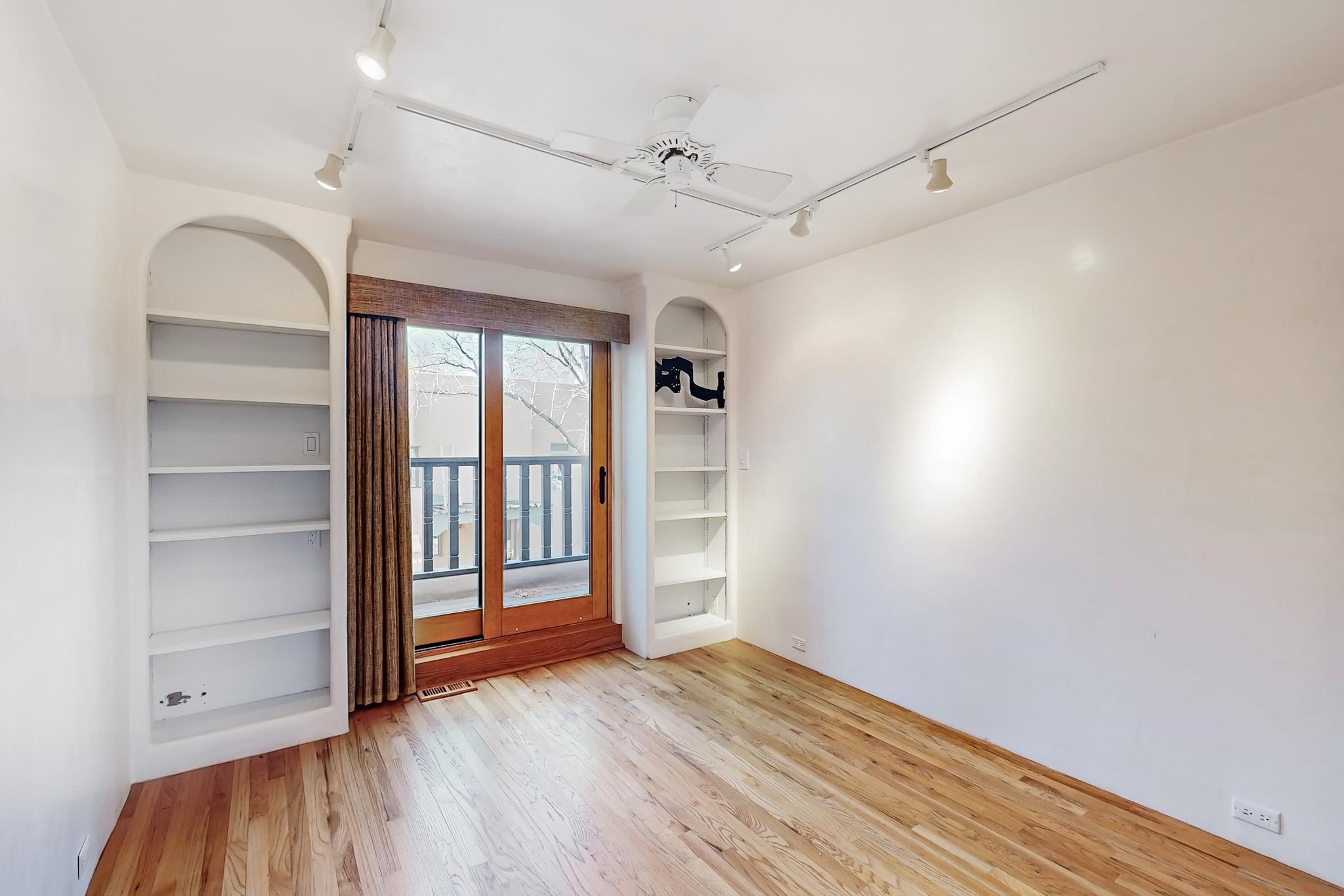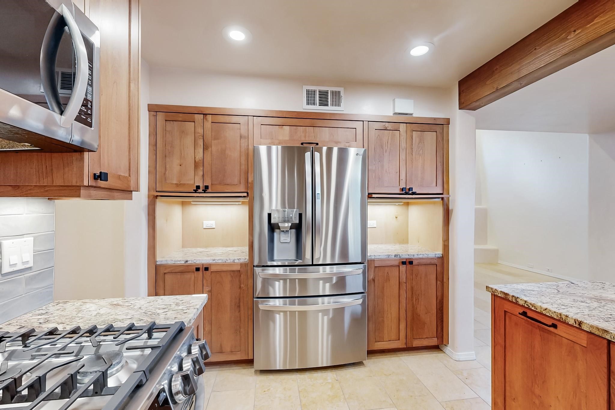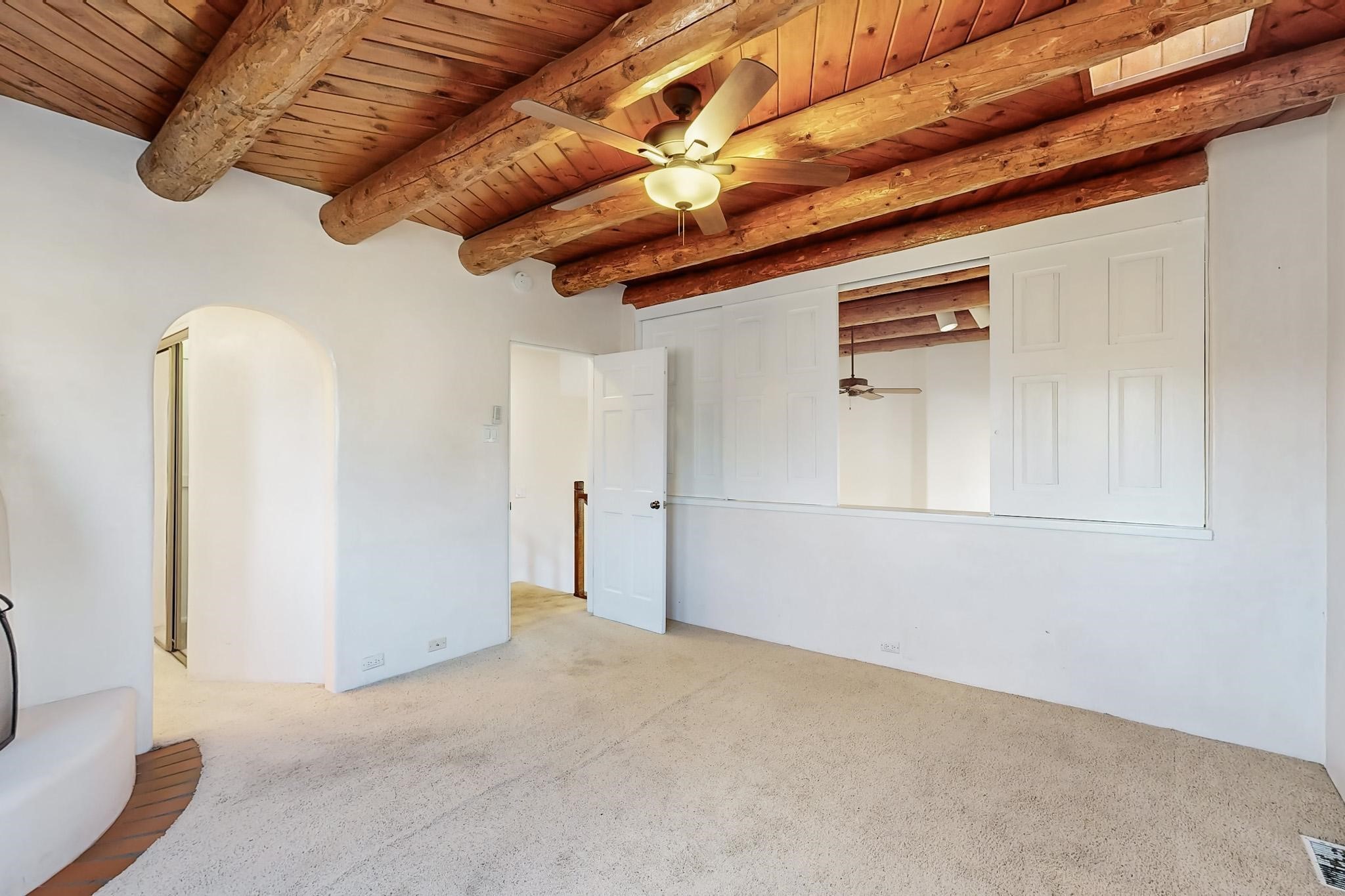 This beautiful two-story condo features an open-concept first floor with travertine tile, a living room with an electric fireplace, a dining area, and a kitchen with granite countertops, stainless steel appliances, and hidden appliance storage. A full bathroom is located behind the kitchen. Upstairs, there are two bedrooms and two bathrooms, including an owner's suite with a traditional kiva fireplace and shutters opening to the living area. The second bedroom has wood flooring and access to a portal space. Custom details throughout include decorative tile, Nichos, plaster walls, and custom hardware.Situated on an historic street, the condo offers a courtyard off the dining room with space for outdoor dining and a rock water feature. It provides a rural feel in an urban setting, within walking distance of the historic plaza and DeVargas Market Center. This unit includes two extra parking passes for parking around the corner in the complex. The owners are offering a $10,000 credit towards closing costs and flooring.