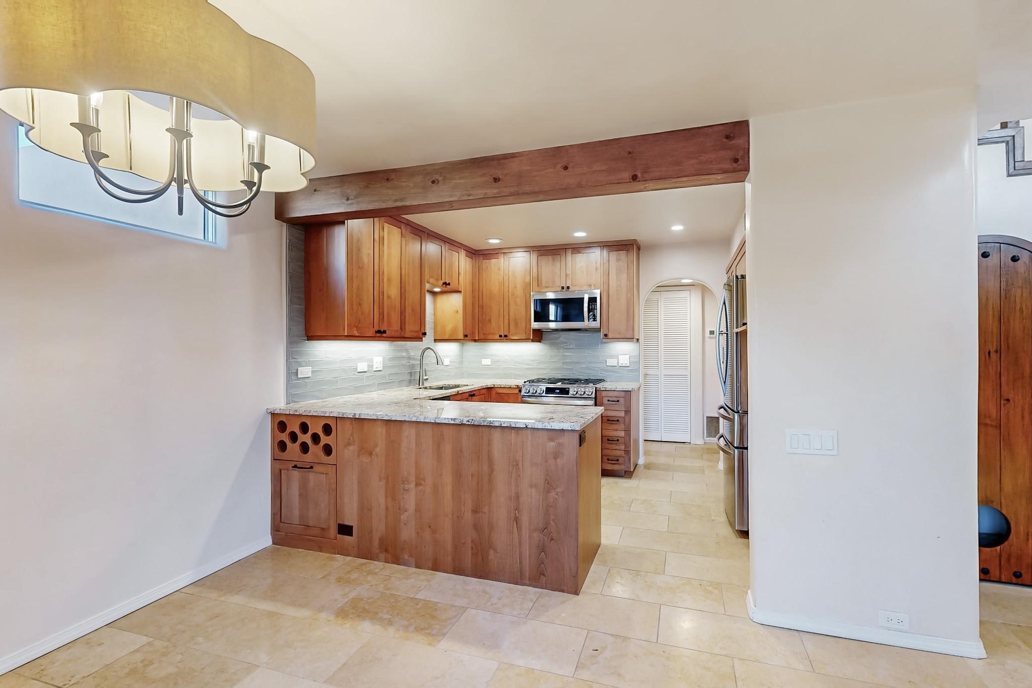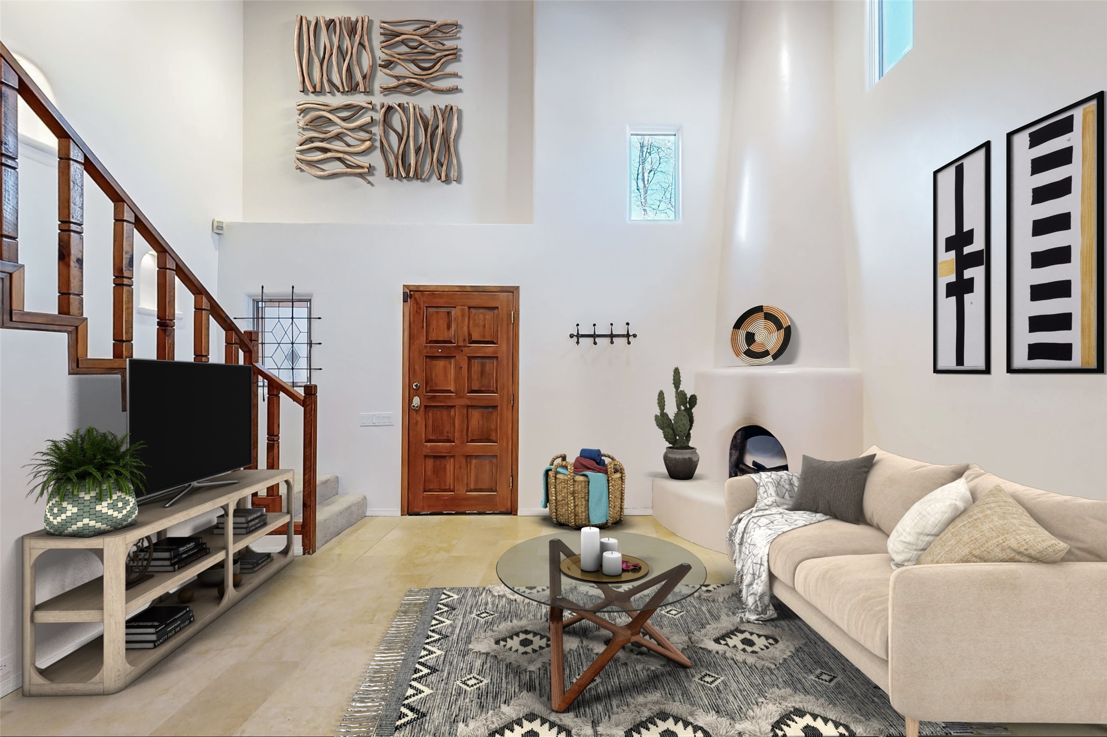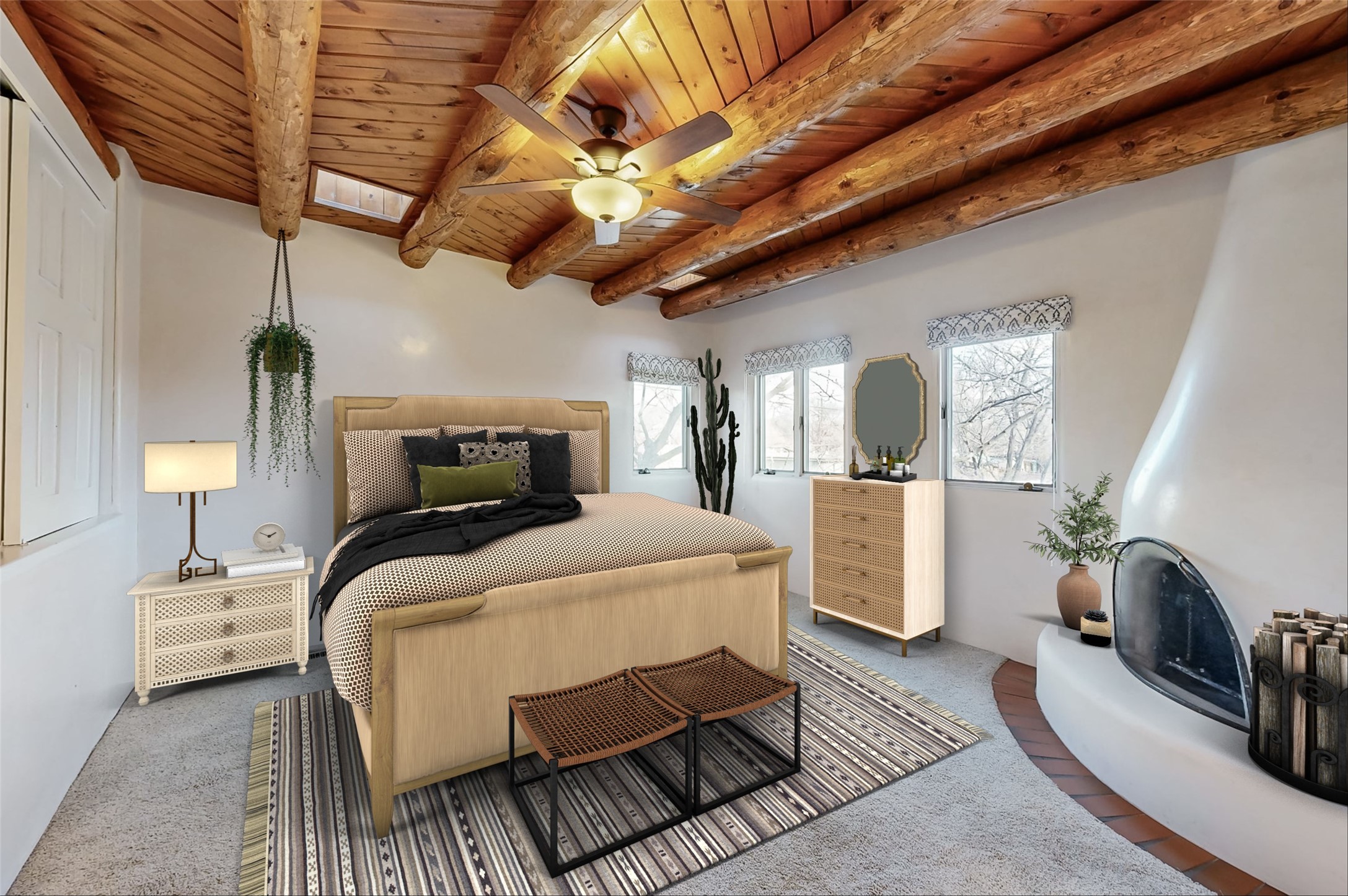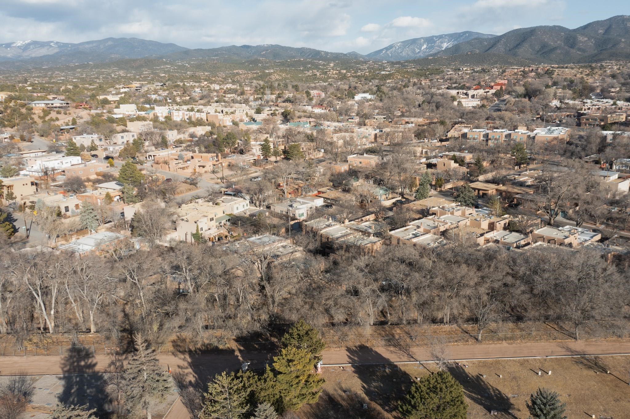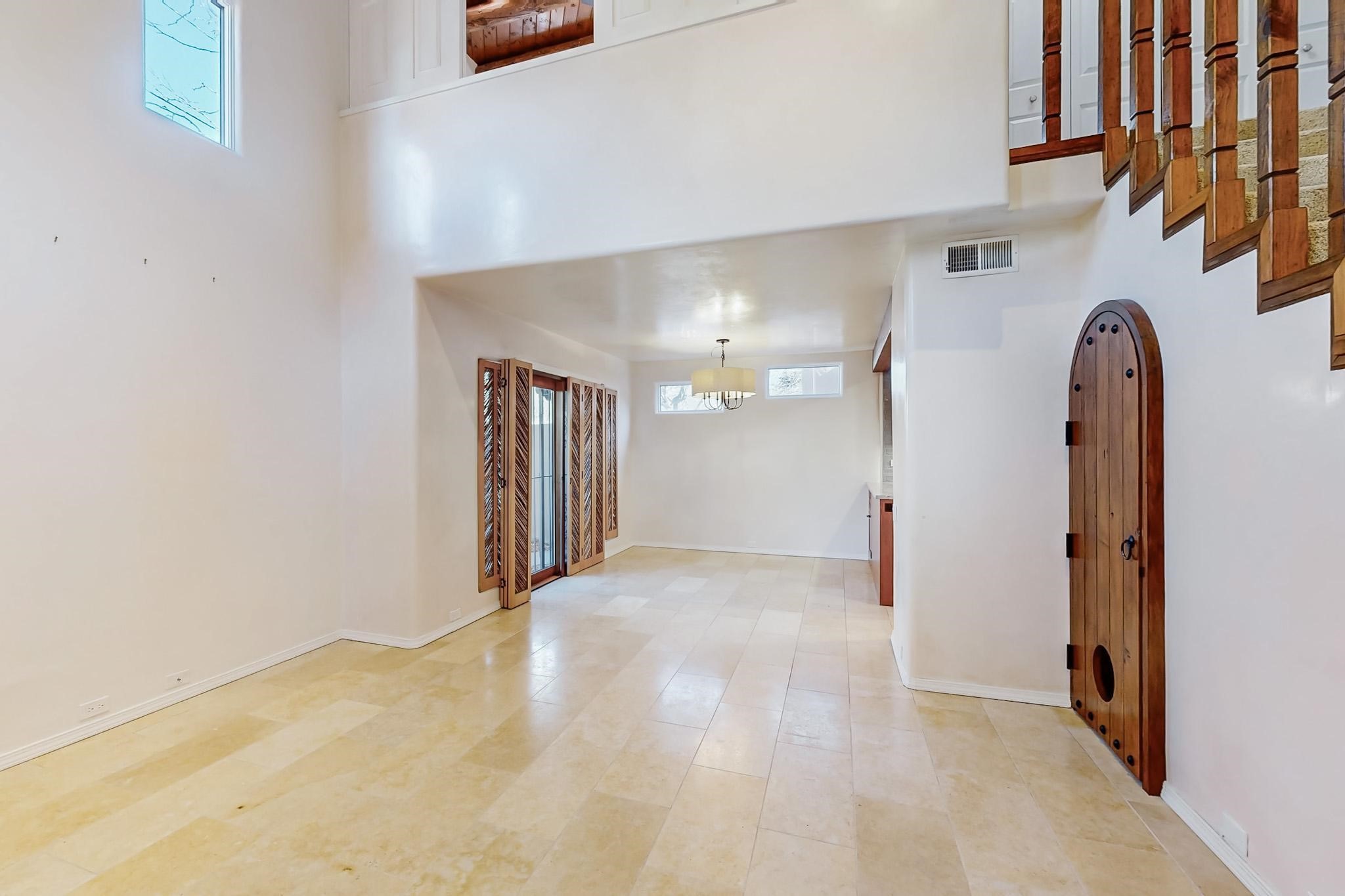 This beautiful two-story condo features an open-concept first floor with travertine tile, a living room with an electric fireplace, a dining area, and a kitchen with granite countertops, stainless steel appliances, and hidden appliance storage. A full bathroom is located behind the kitchen. Upstairs, there are two bedrooms and two bathrooms, including an owner's suite with a traditional kiva fireplace and shutters opening to the living area. The second bedroom has wood flooring and access to a portal space. Custom details throughout include decorative tile, Nichos, plaster walls, and custom hardware.Situated on an historic street, the condo offers a courtyard off the dining room with space for outdoor dining and a rock water feature. It provides a rural feel in an urban setting, within walking distance of the historic plaza and DeVargas Market Center. This unit includes two extra parking passes for parking around the corner in the complex. The owners are offering a $10,000 credit towards closing costs and flooring.